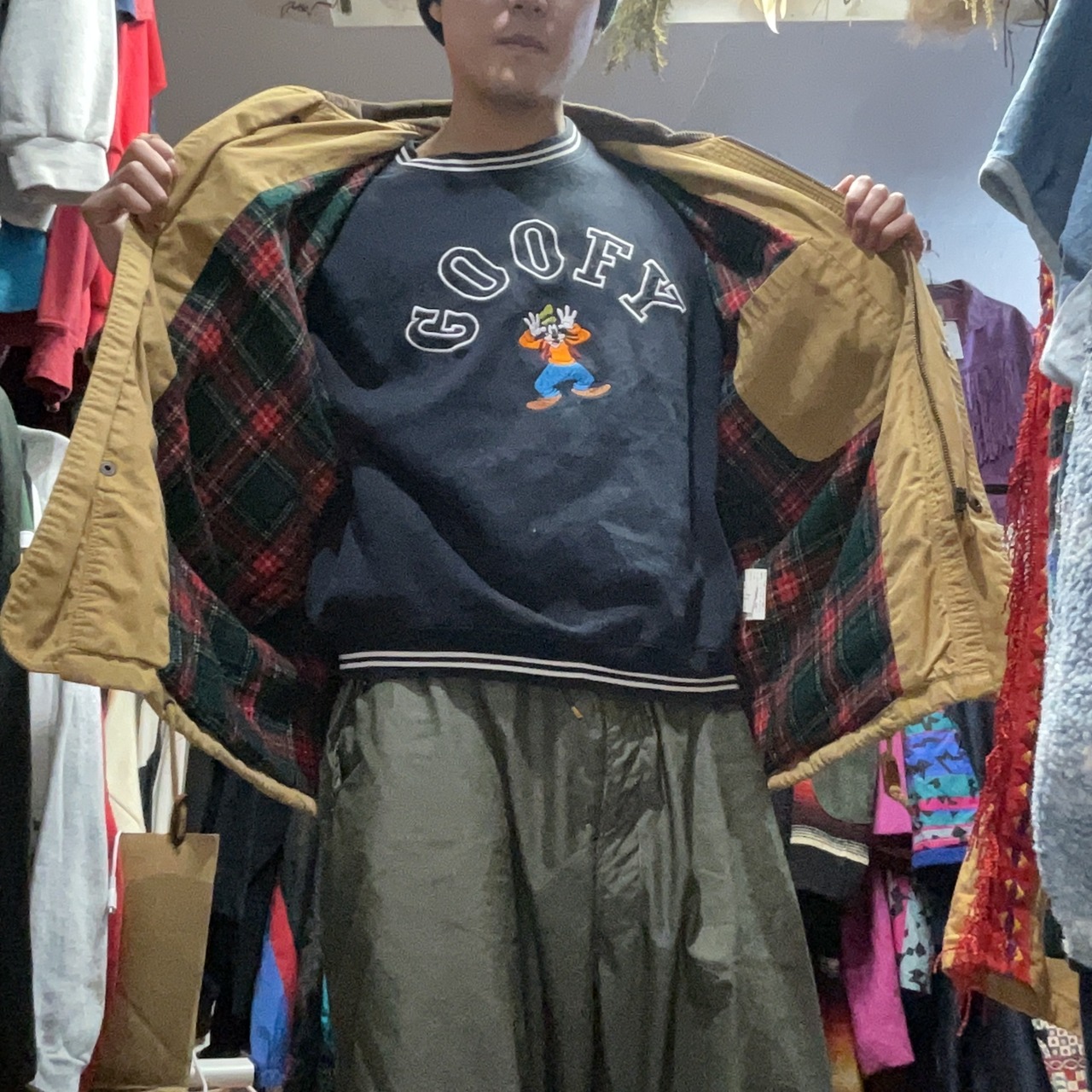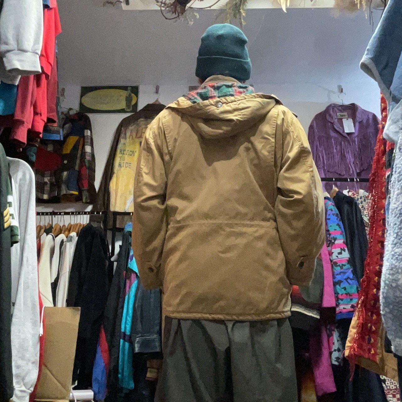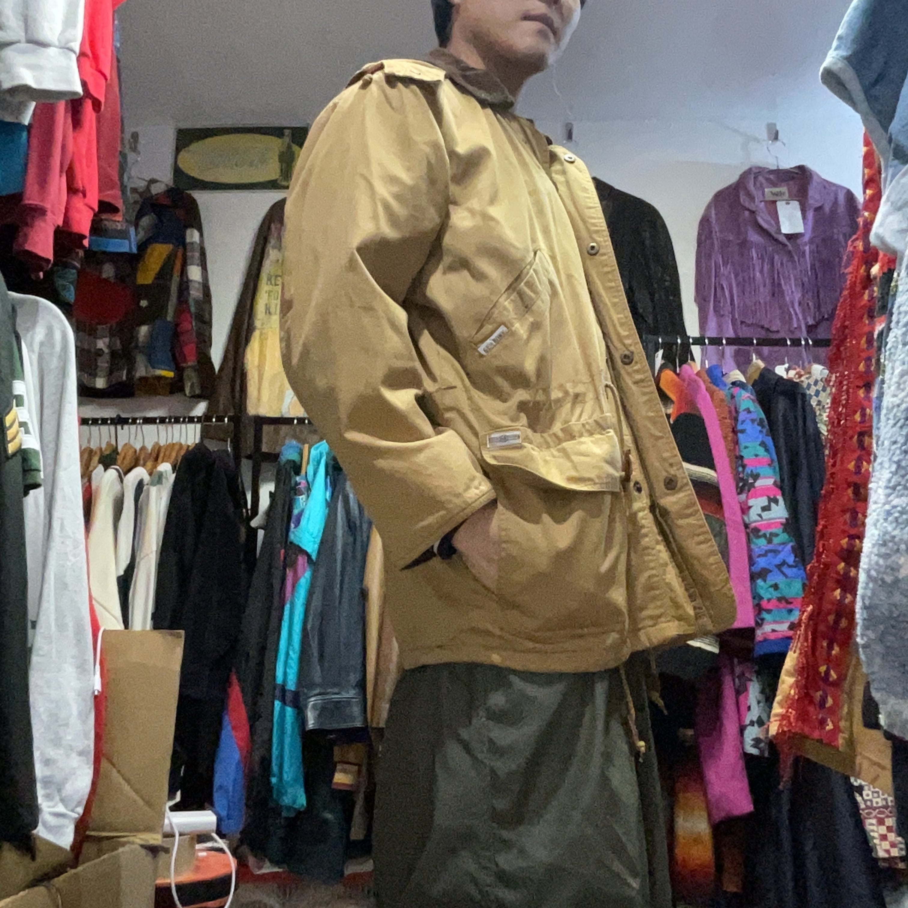 渋いベージュのボディに、コーデュロイ襟&タータンチェックのブランケットライナーが映える、90sムード満点のハンティング/フィールドジャケット。