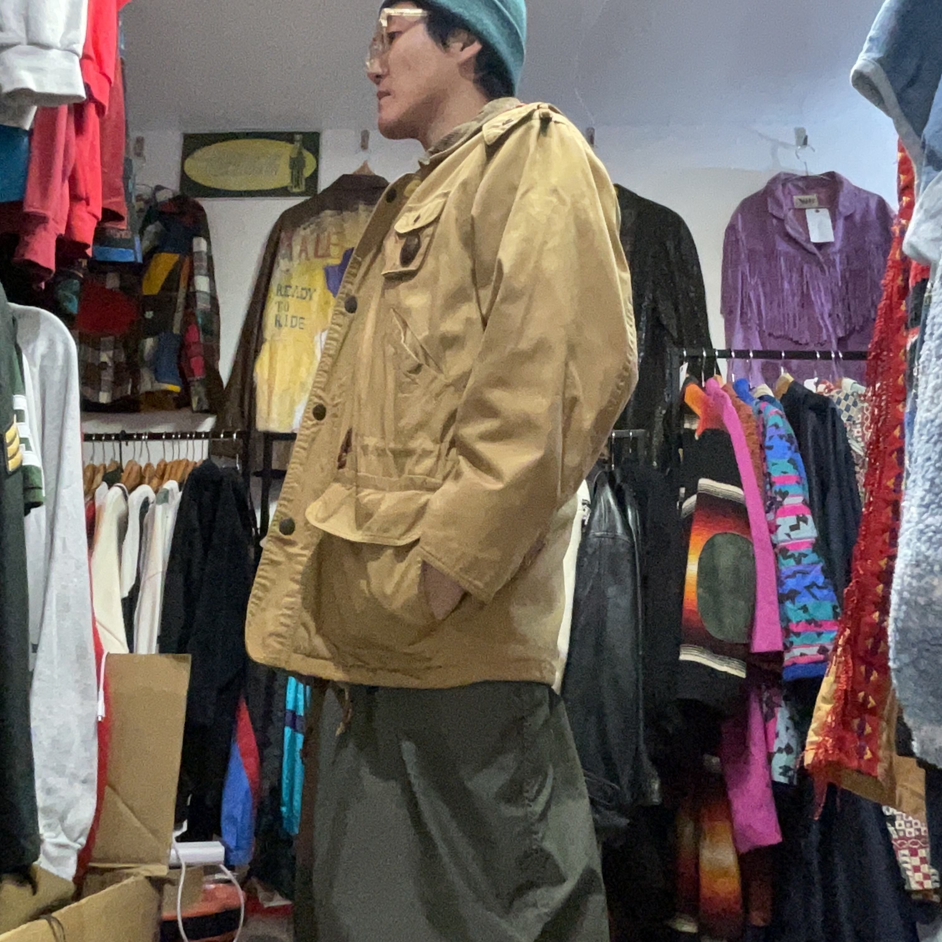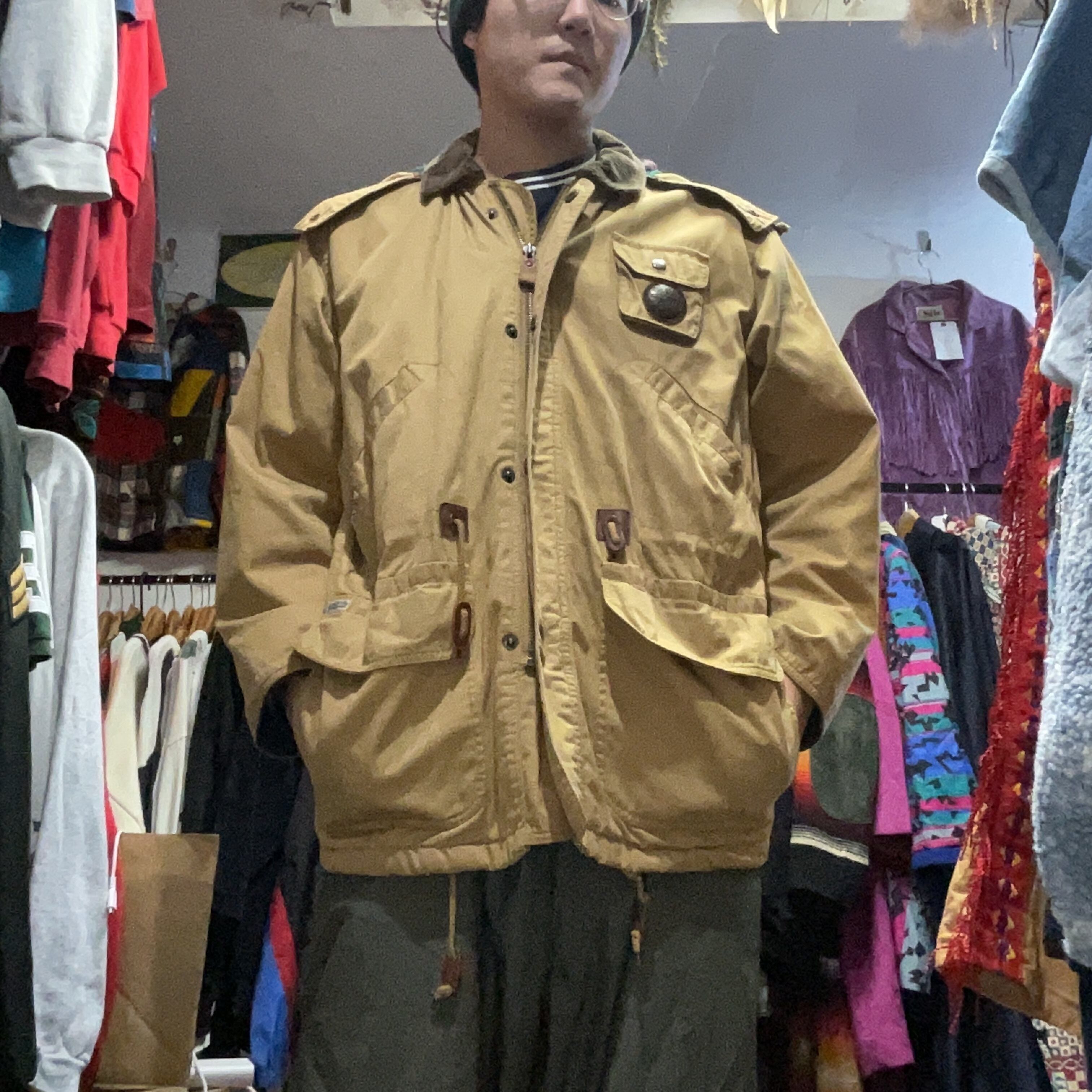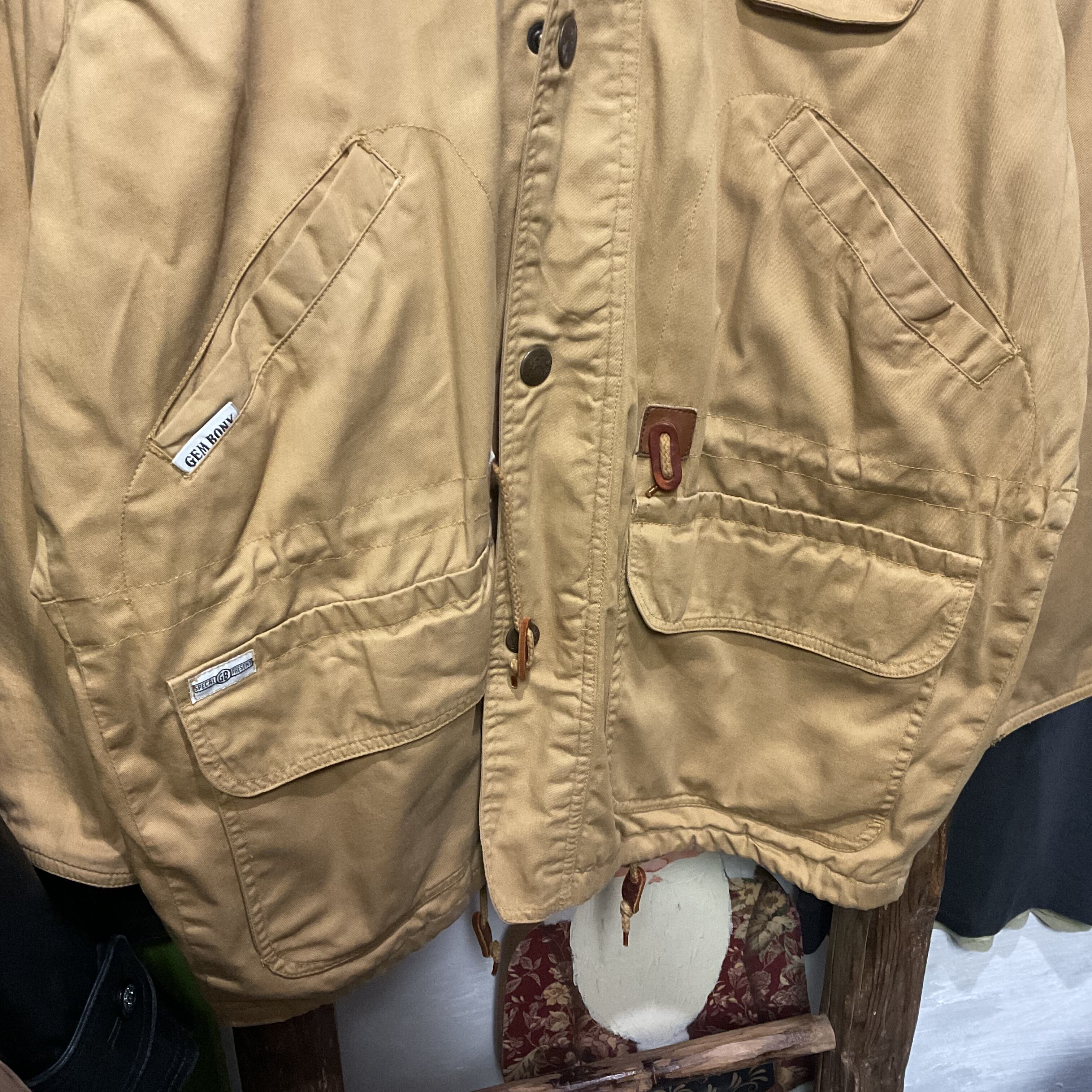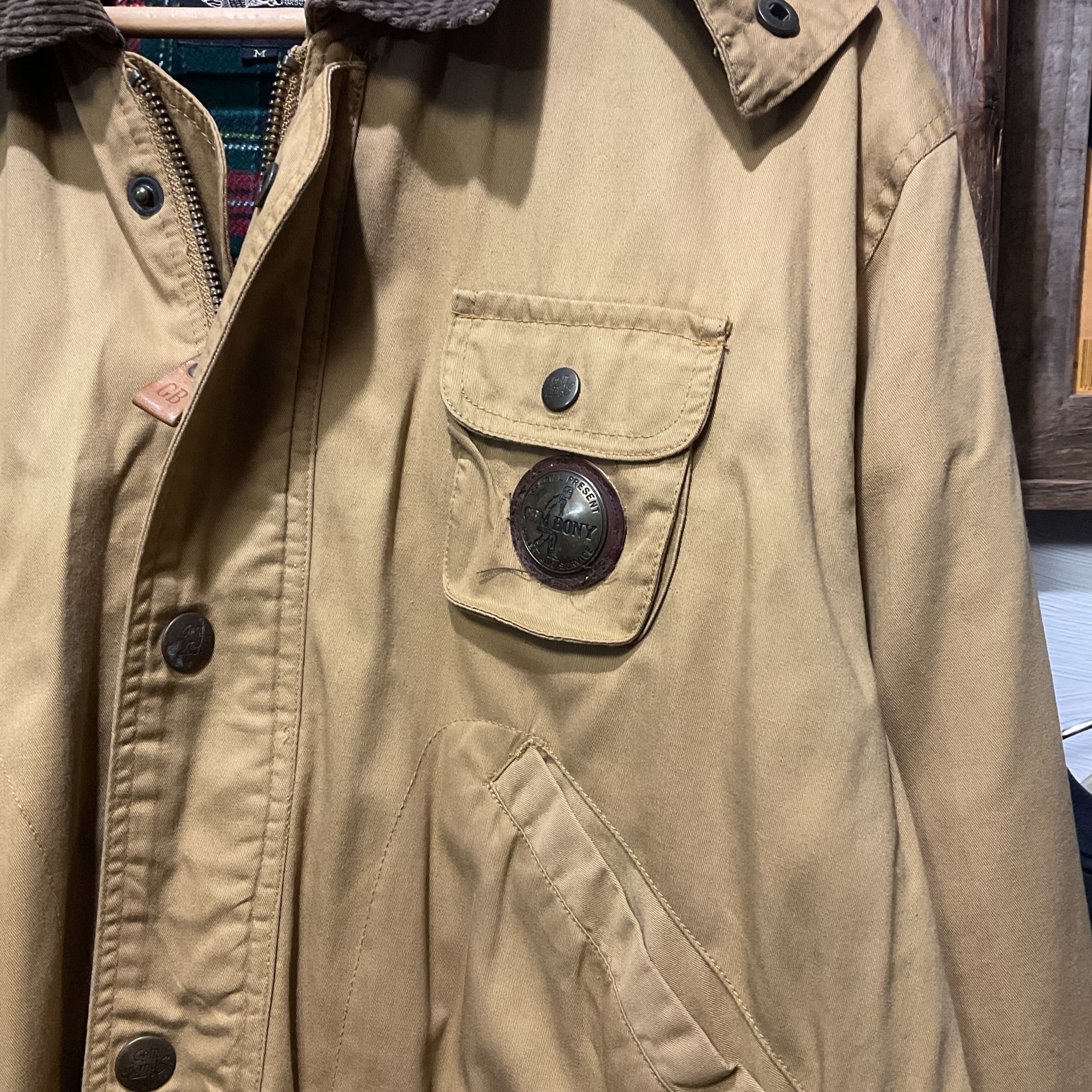 フロントはジップ+スナップの防風仕様で、胸ポケット・大きめのフラップポケットなど収納力もしっかり。ジッパープルの**“GB”レザーや、胸ポケットのメダル風パーツ**など、当時らしい“作り込み”。