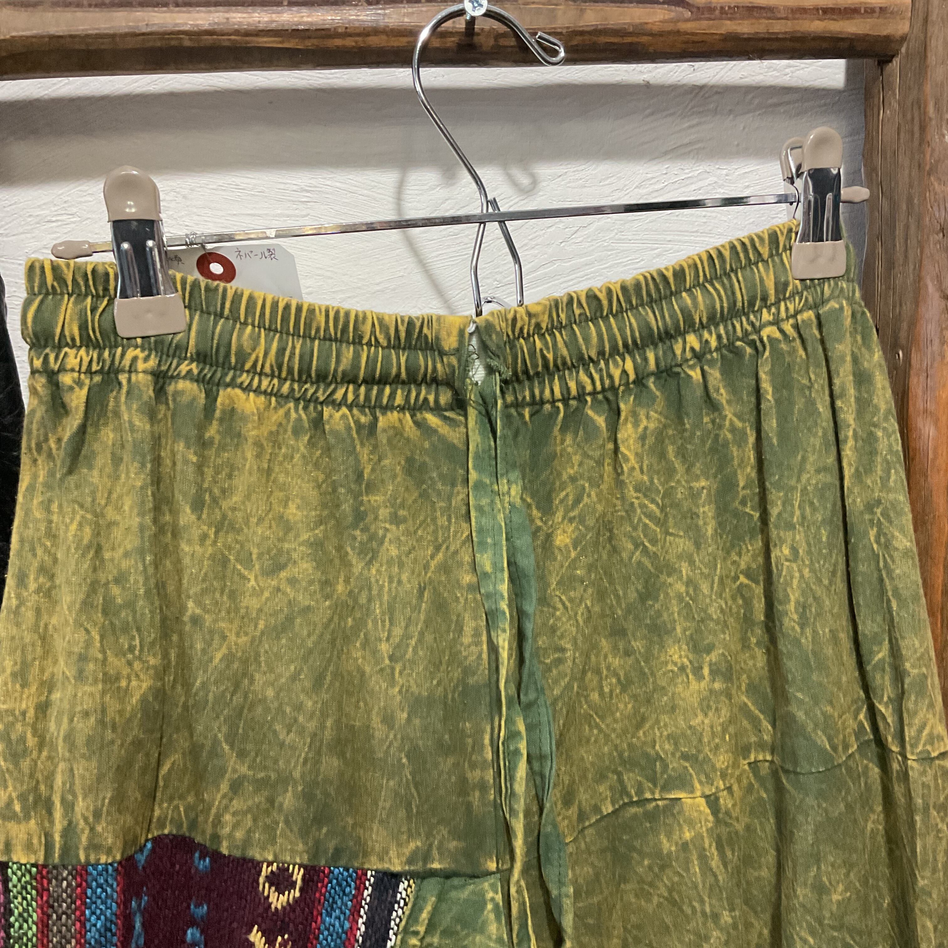 ネパール製SPTの、ストーンウォッシュのオリーブグリーンをベースに、織り柄パッチワークを大胆に切り替えたイージーワイドパンツ。
