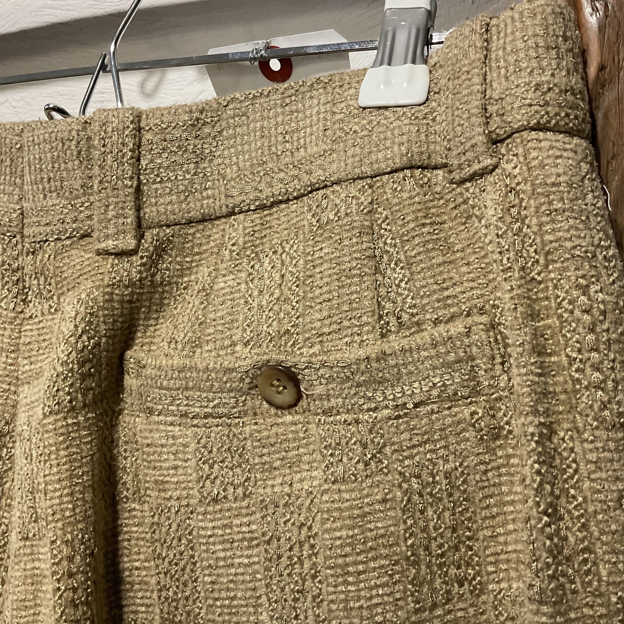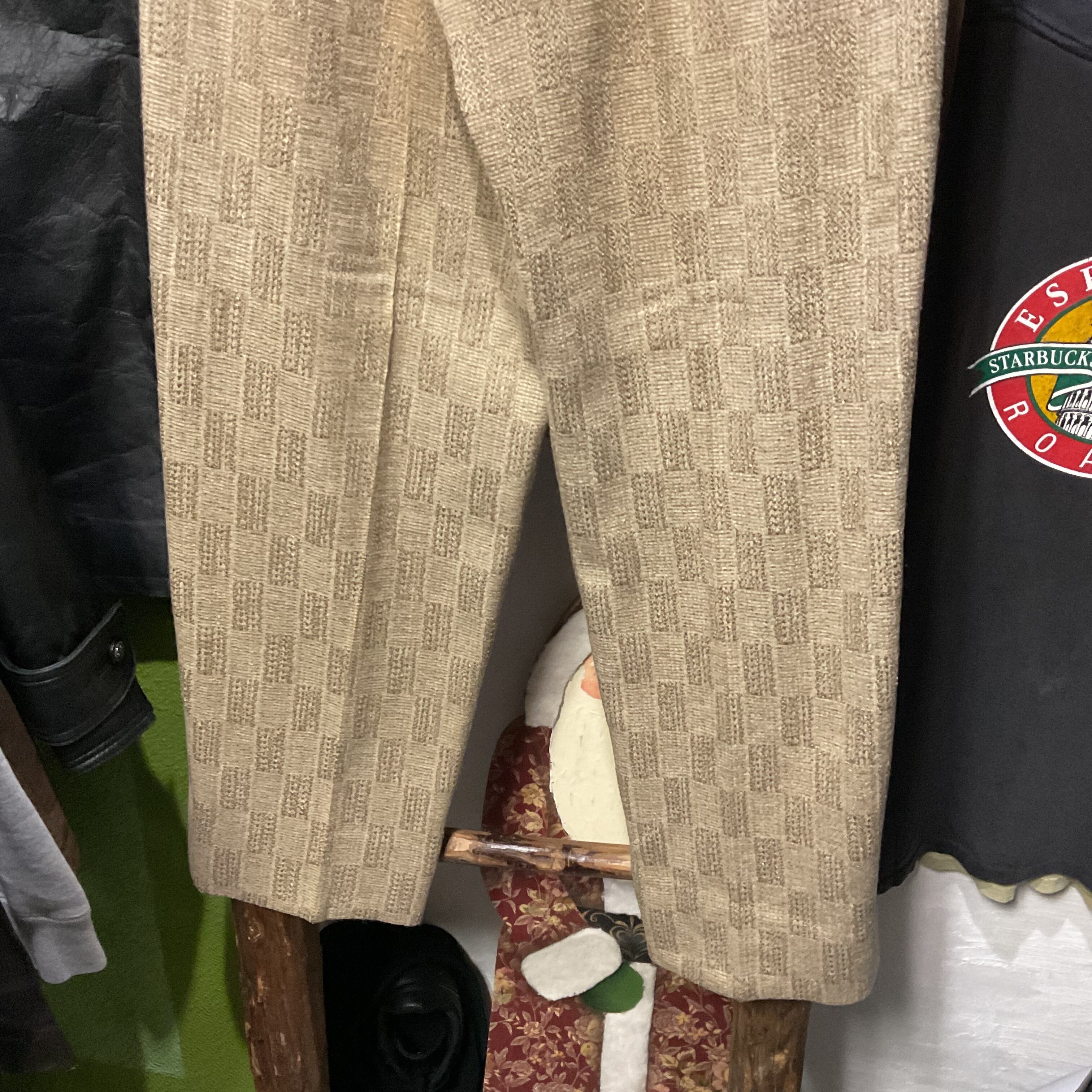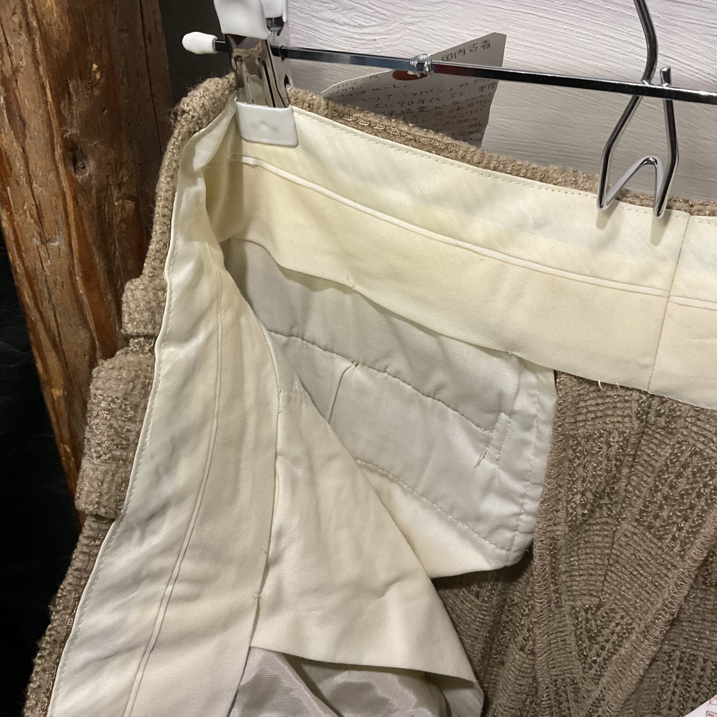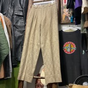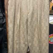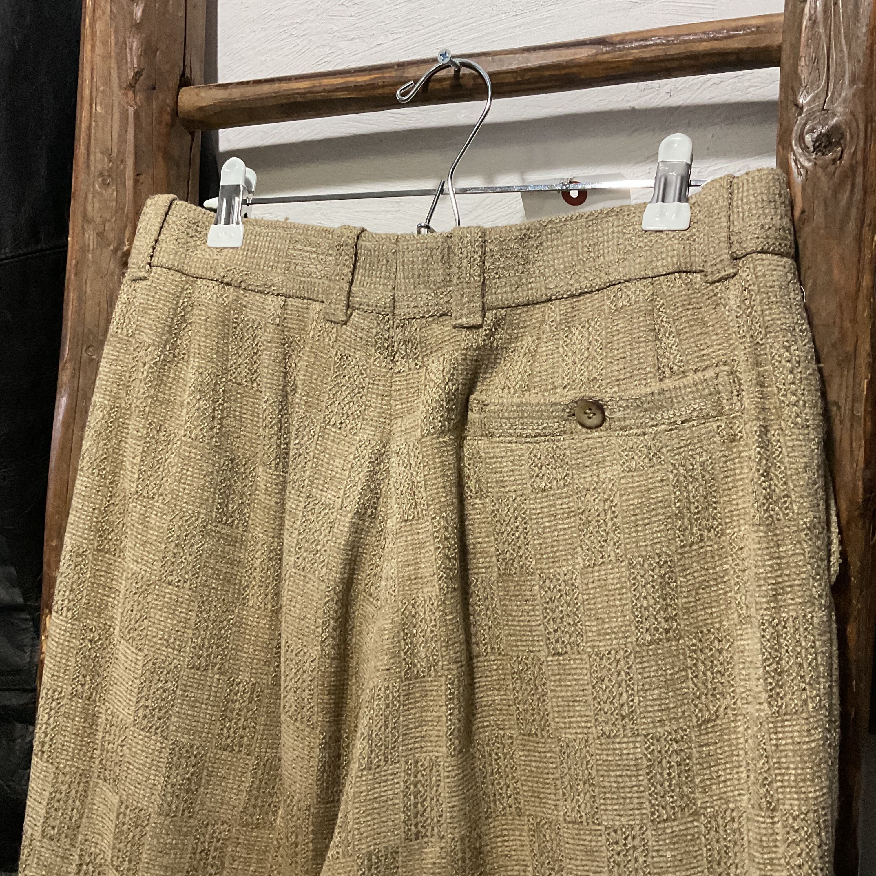 ベージュ〜グレージュの中間色に、幾何学っぽい織り柄が入った ツイード調ジャガードスラックス。プリントじゃなく織りで柄を出してるから、近くで見ると陰影と凹凸が出て表情が深い1本。