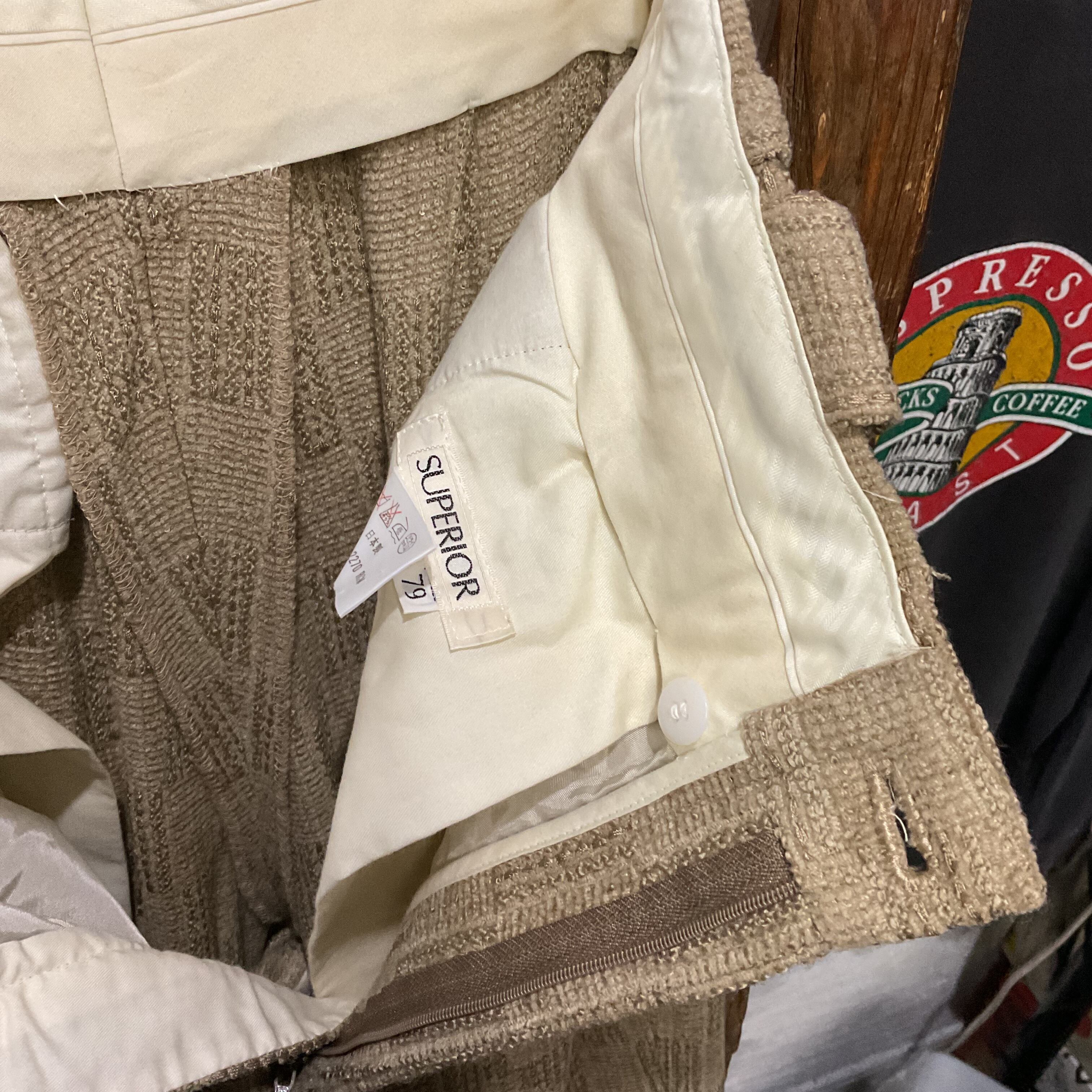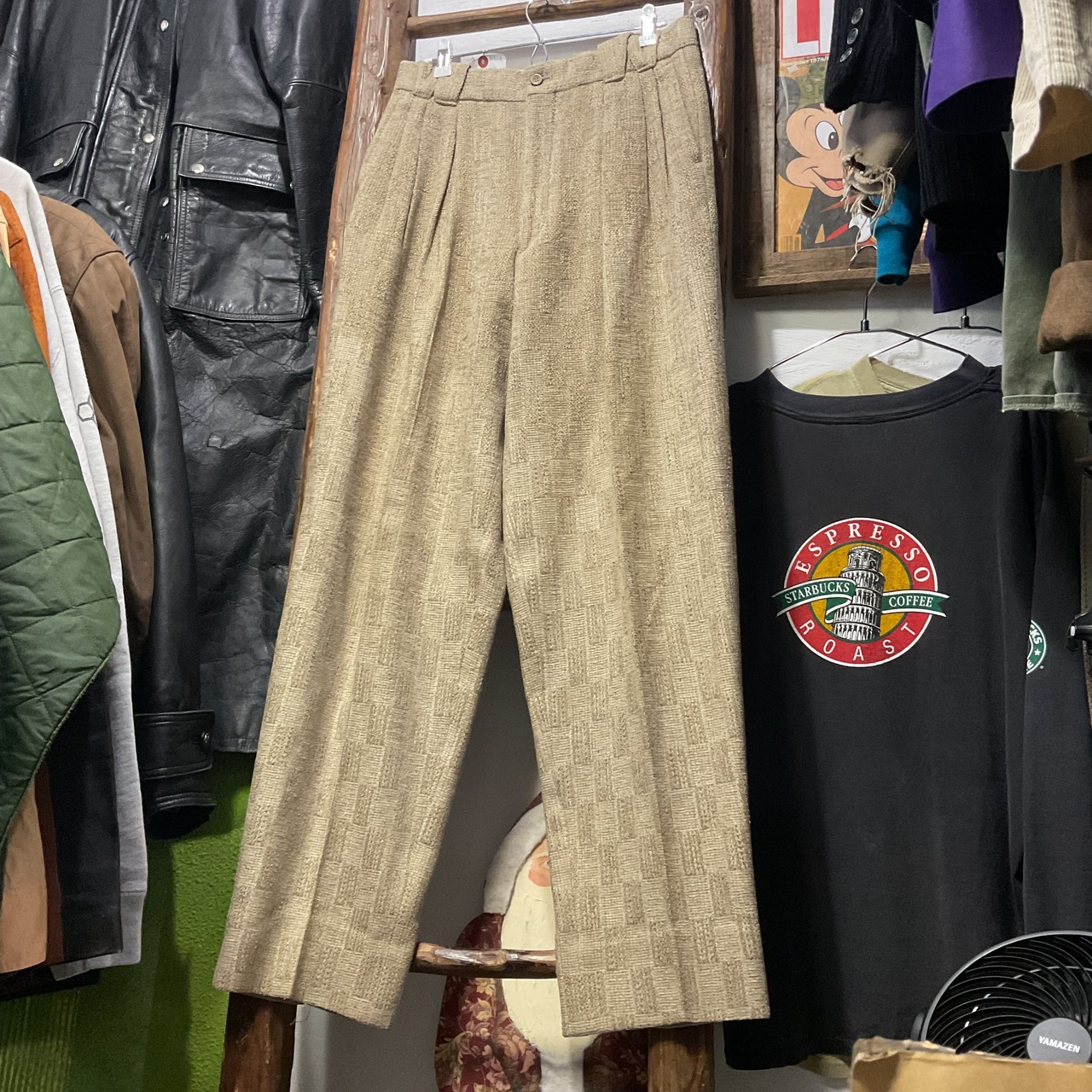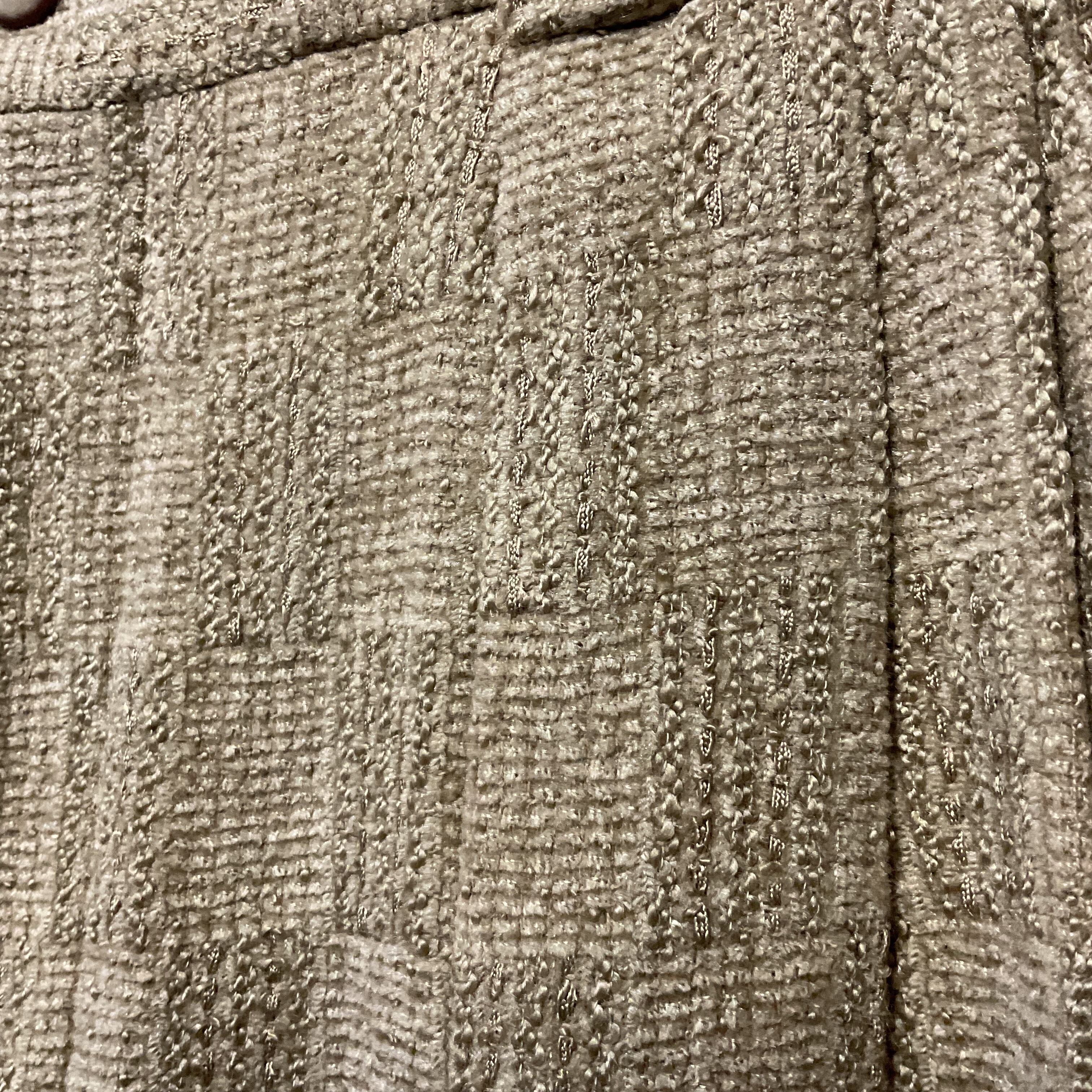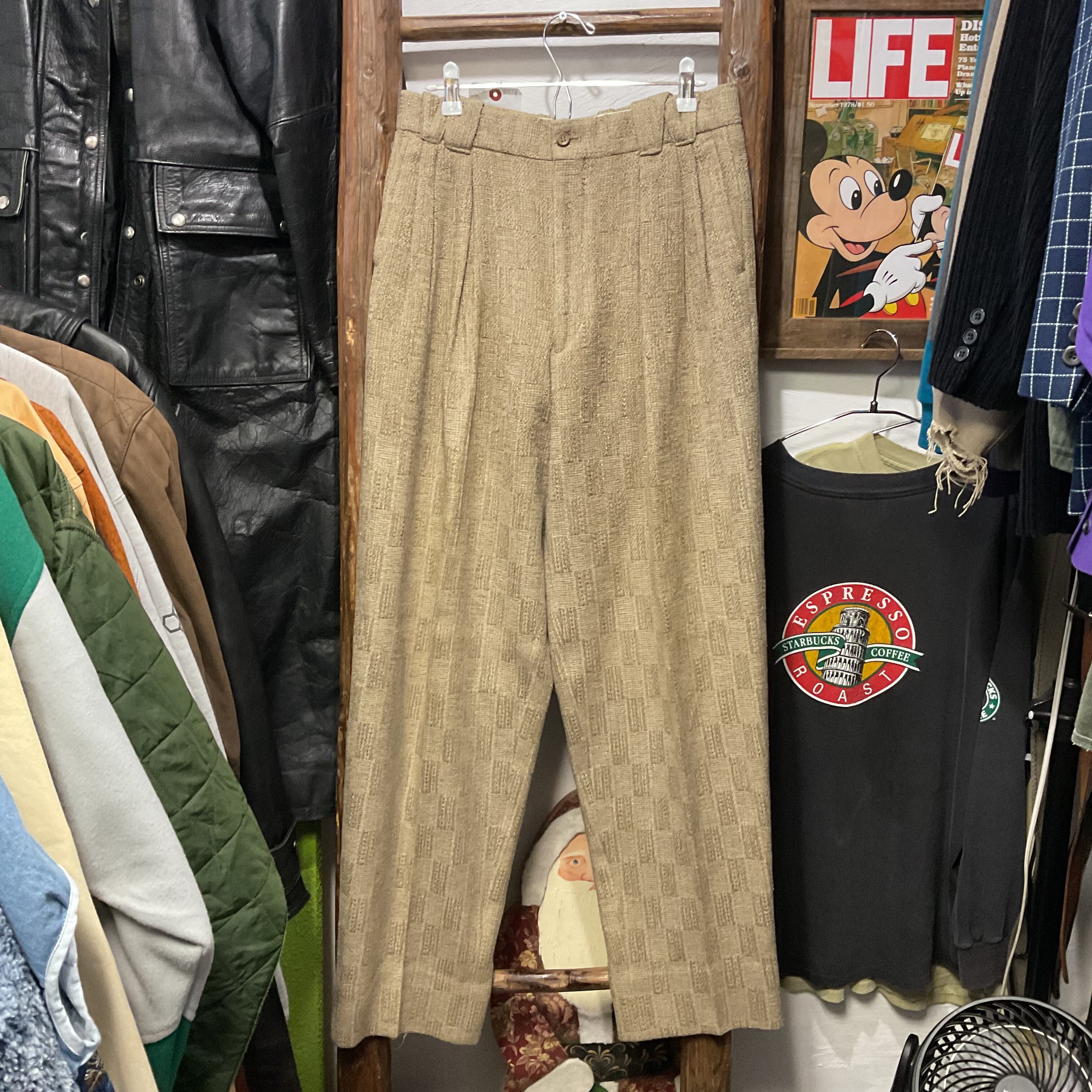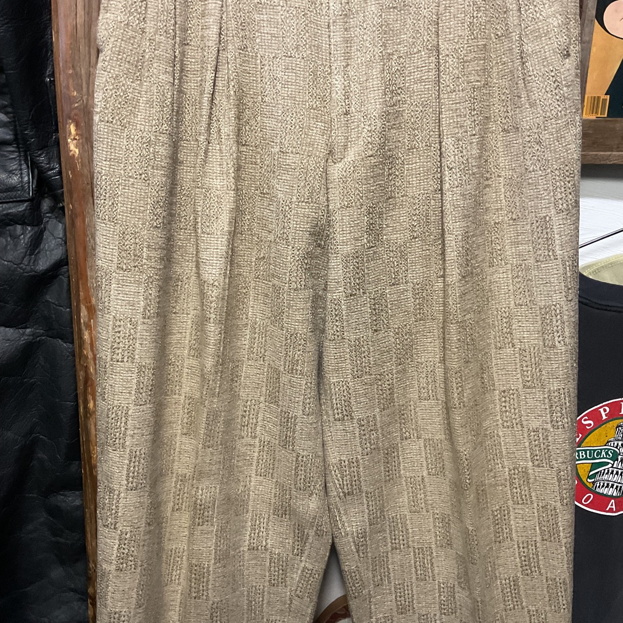 ベージュ〜グレージュの中間色に、幾何学っぽい織り柄が入った ツイード調ジャガードスラックス。プリントじゃなく織りで柄を出してるから、近くで見ると陰影と凹凸が出て表情が深い1本。