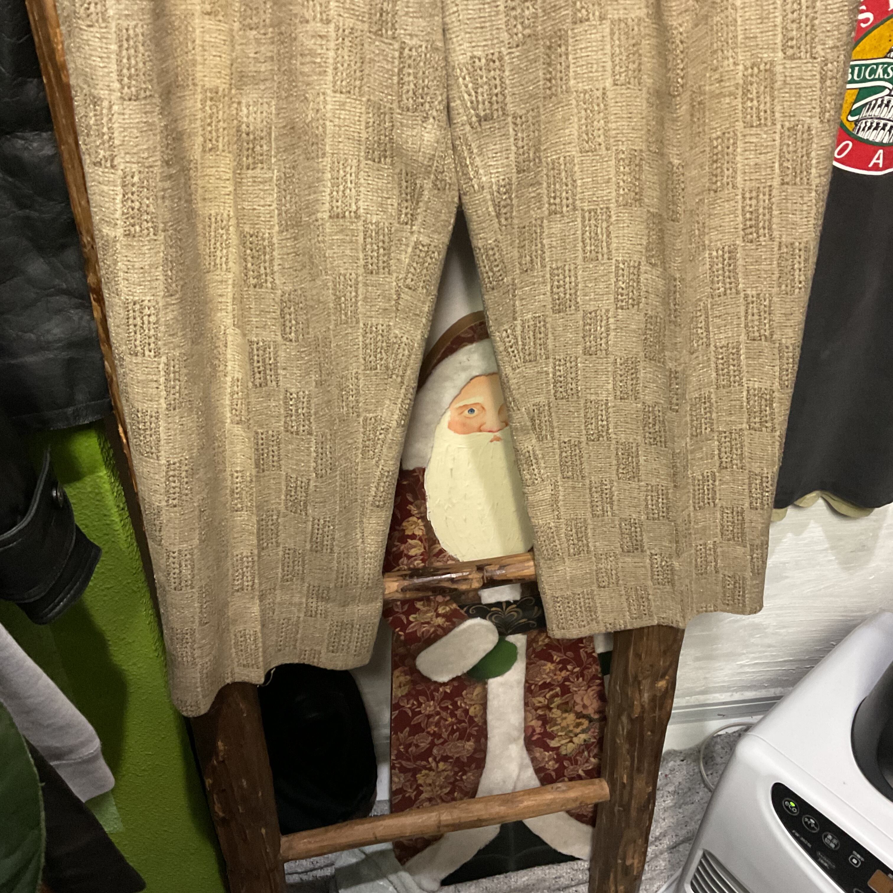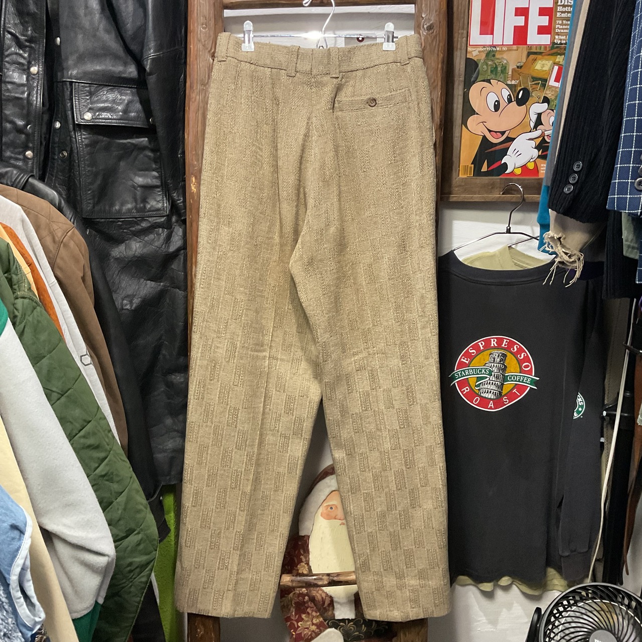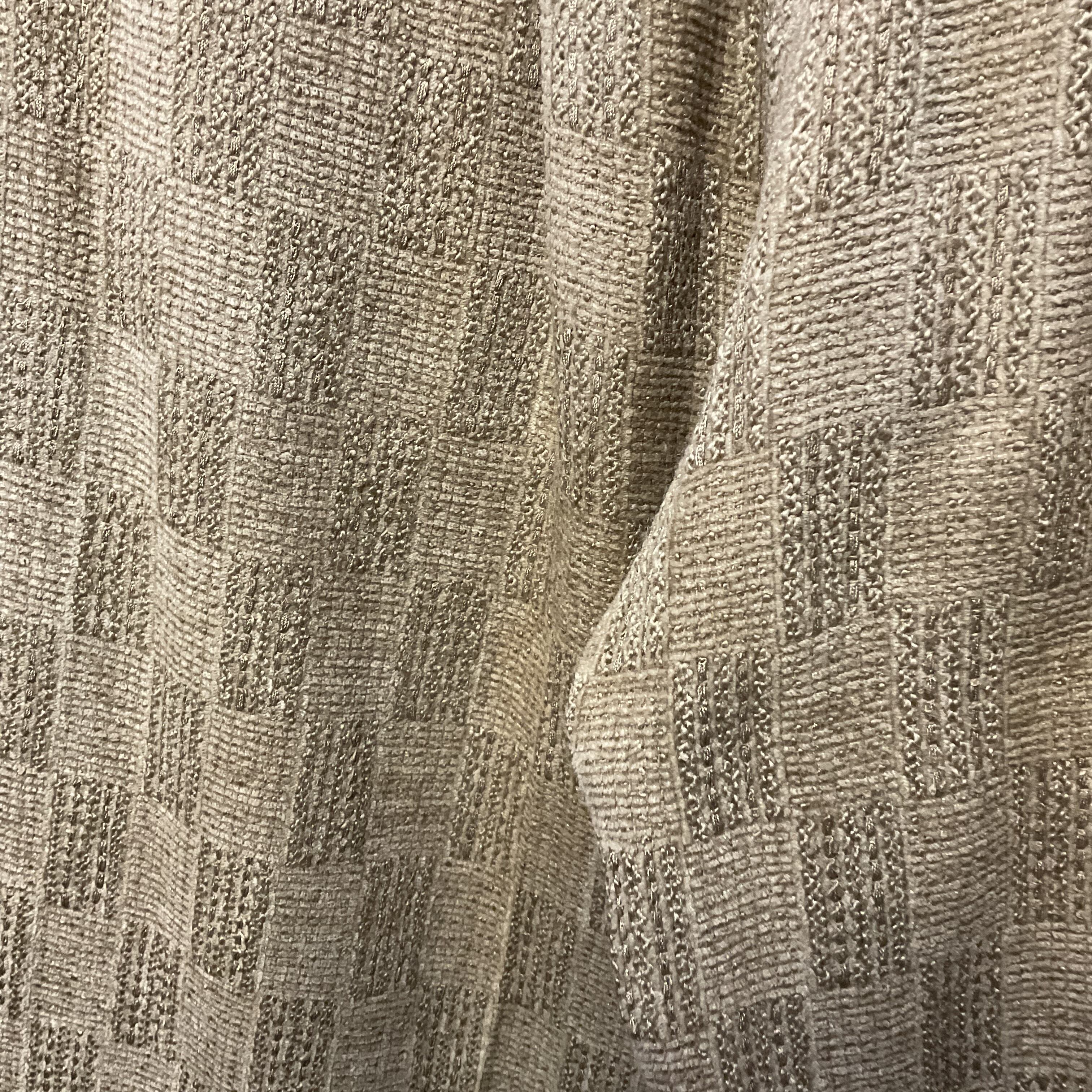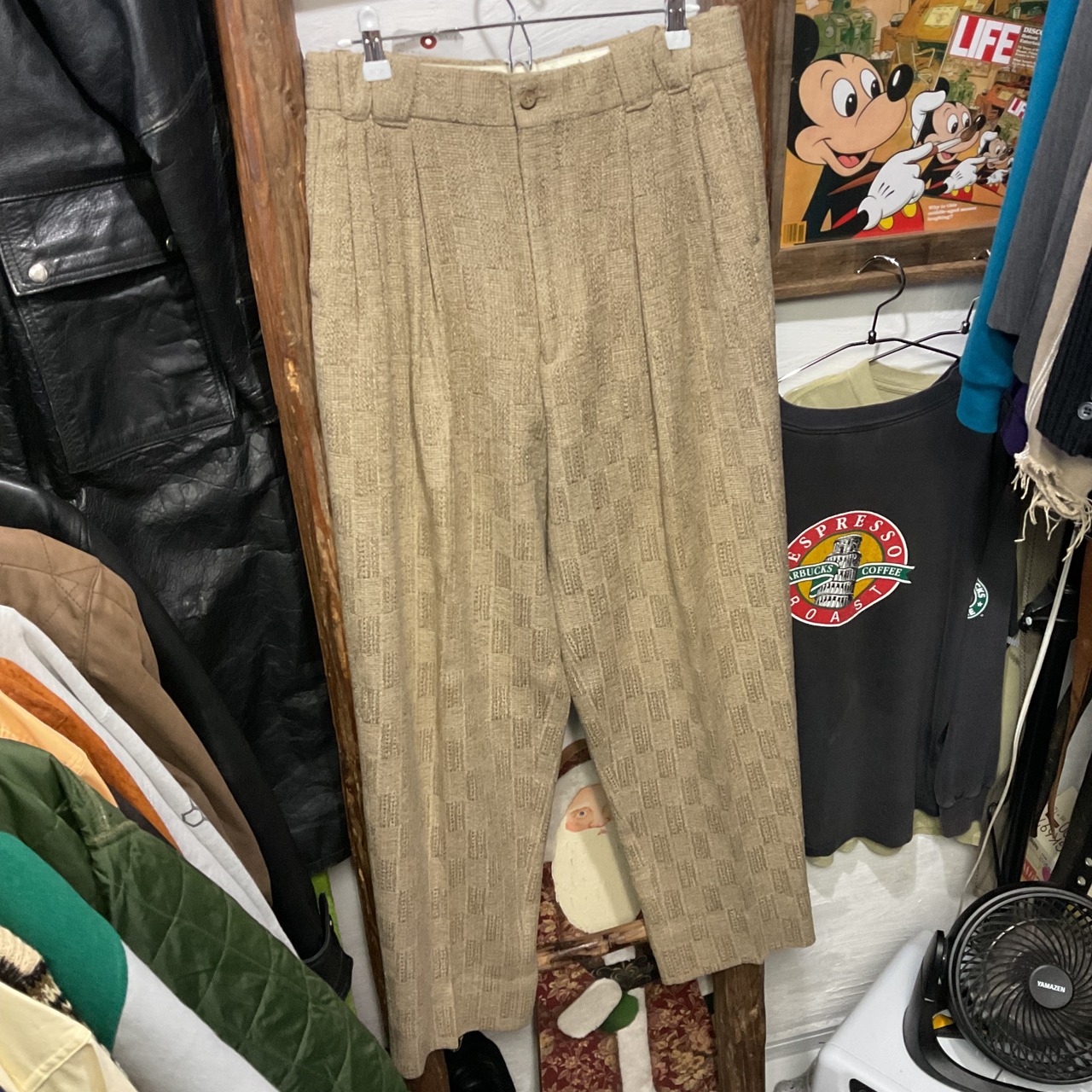 ベージュ〜グレージュの中間色に、幾何学っぽい織り柄が入った ツイード調ジャガードスラックス。プリントじゃなく織りで柄を出してるから、近くで見ると陰影と凹凸が出て表情が深い1本。