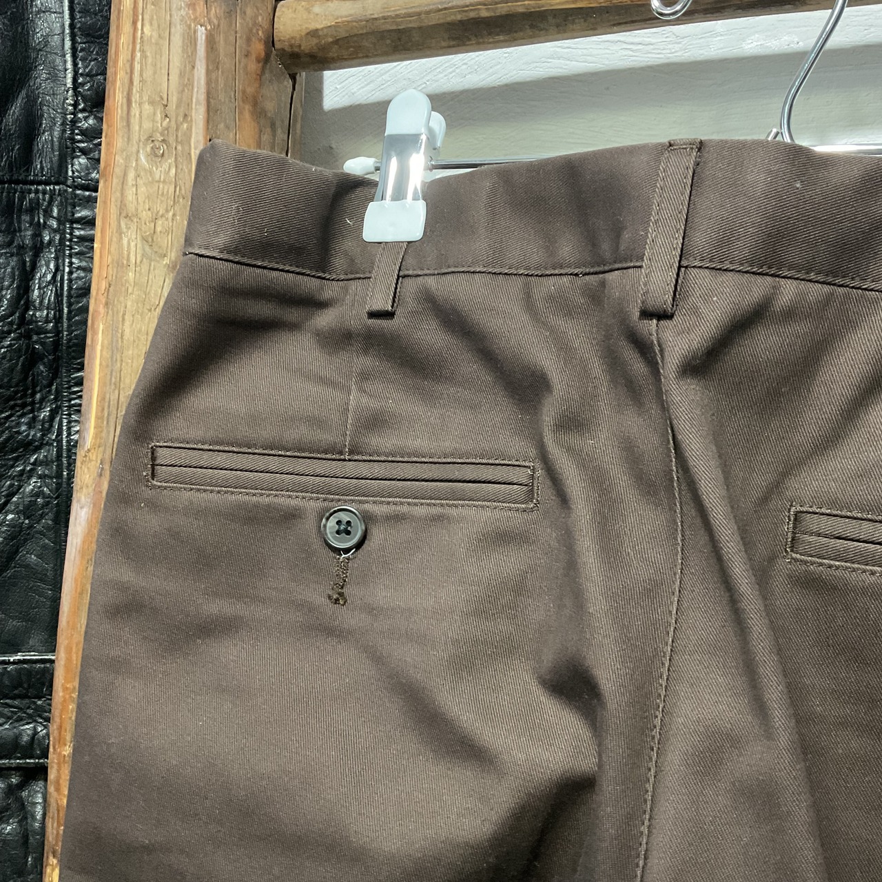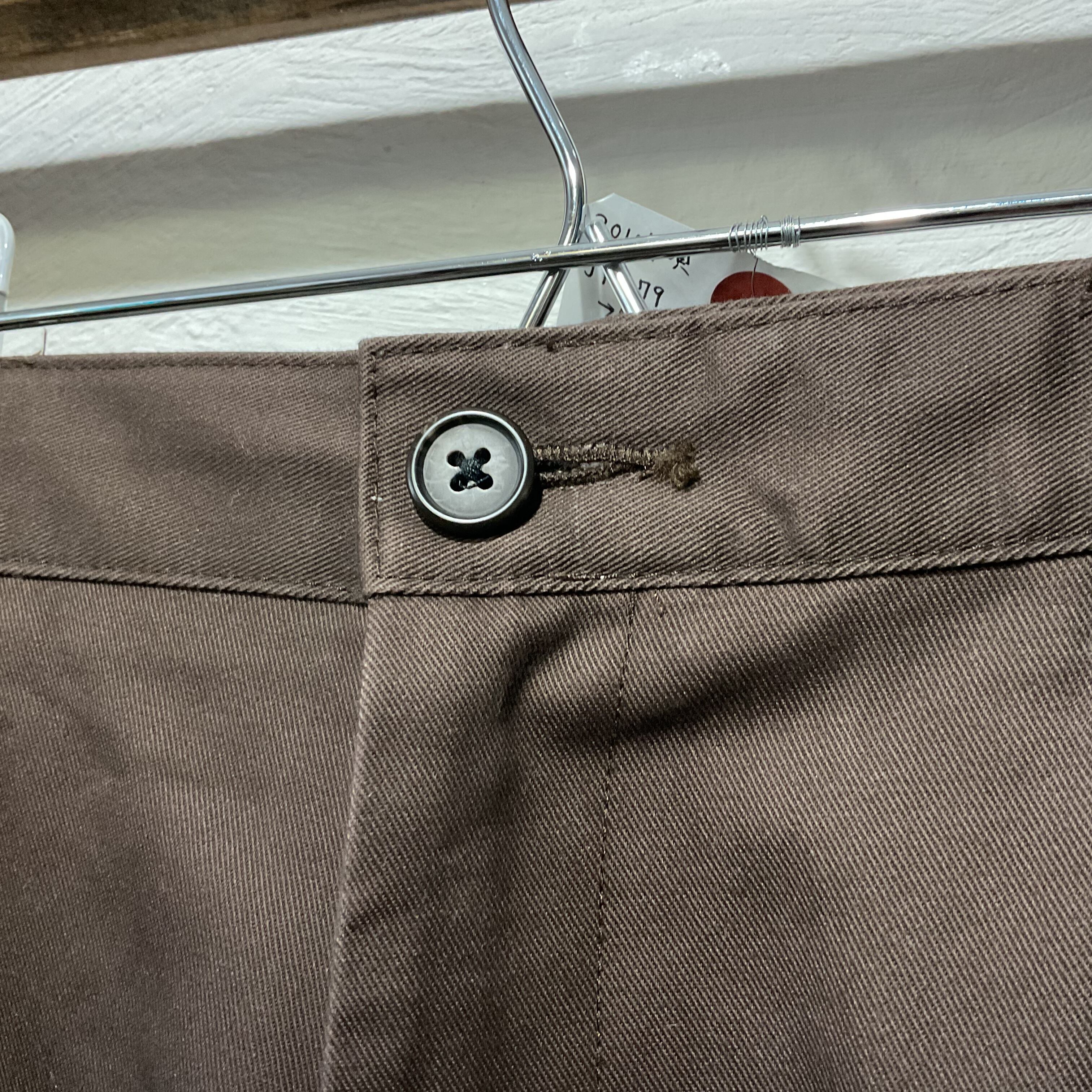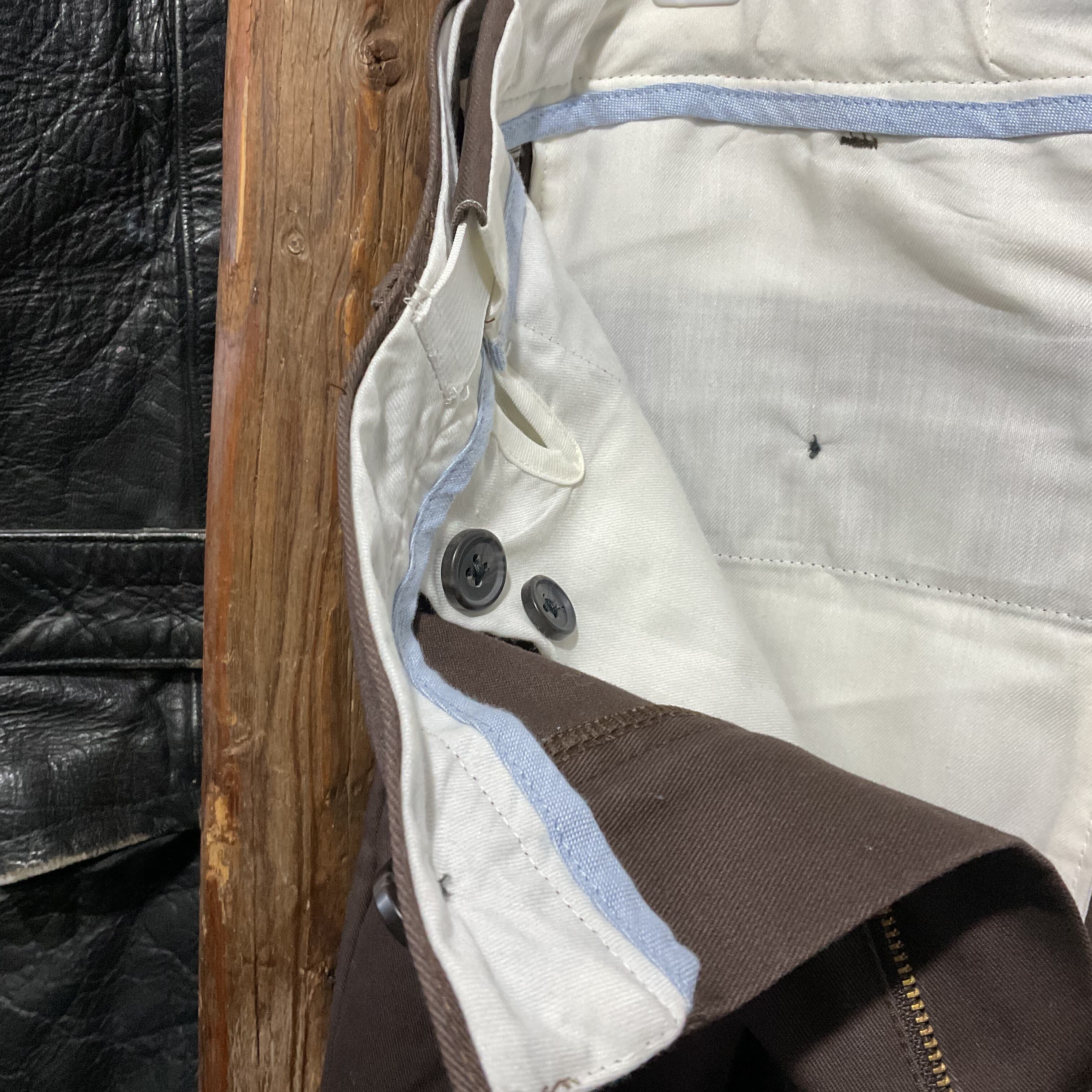 ツイル(チノ系)らしい程よいハリがありつつ、履き込むほどに柔らかく馴染むタイプ。フロントはジップ仕様で、ポケットはスラッシュ+後ろは玉縁のスラックス寄りディテールだから、Tシャツ1枚でも“ラフすぎない”バランス。
