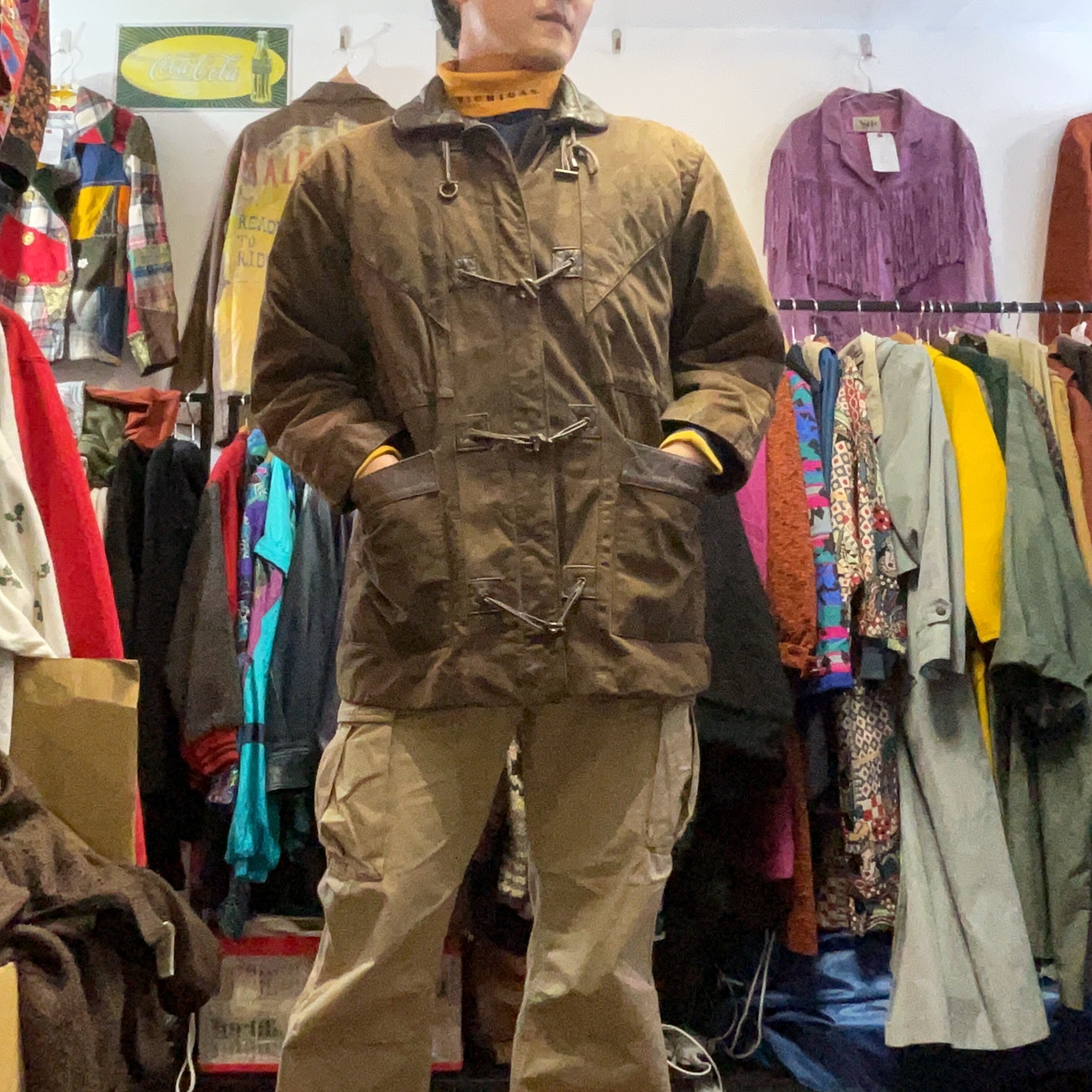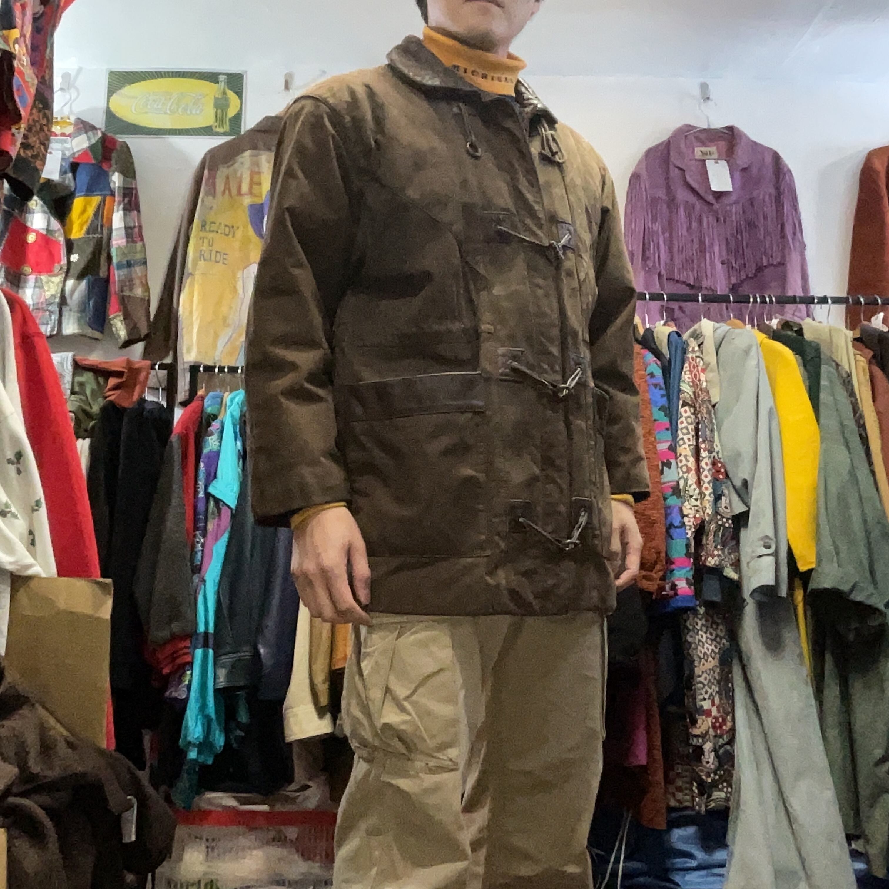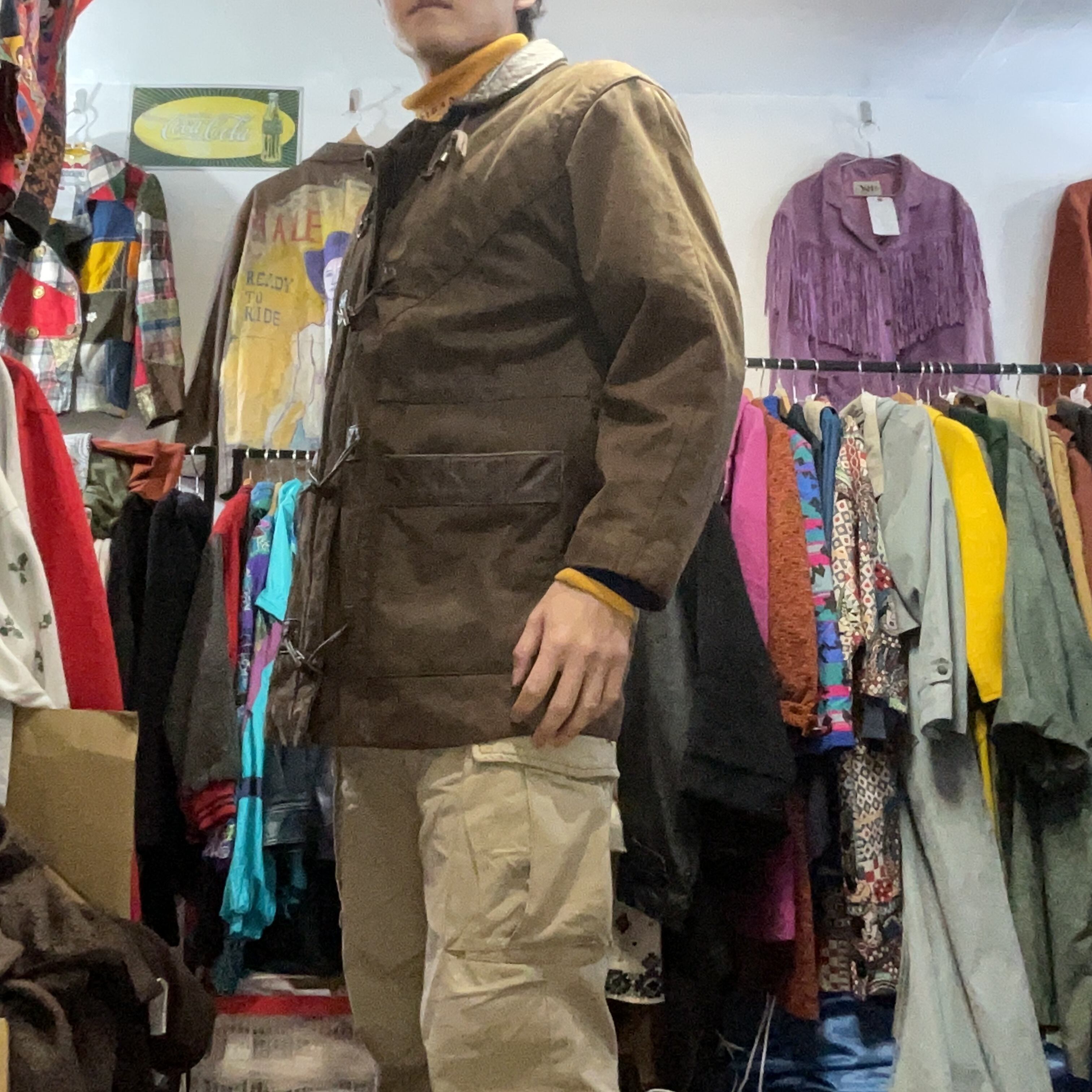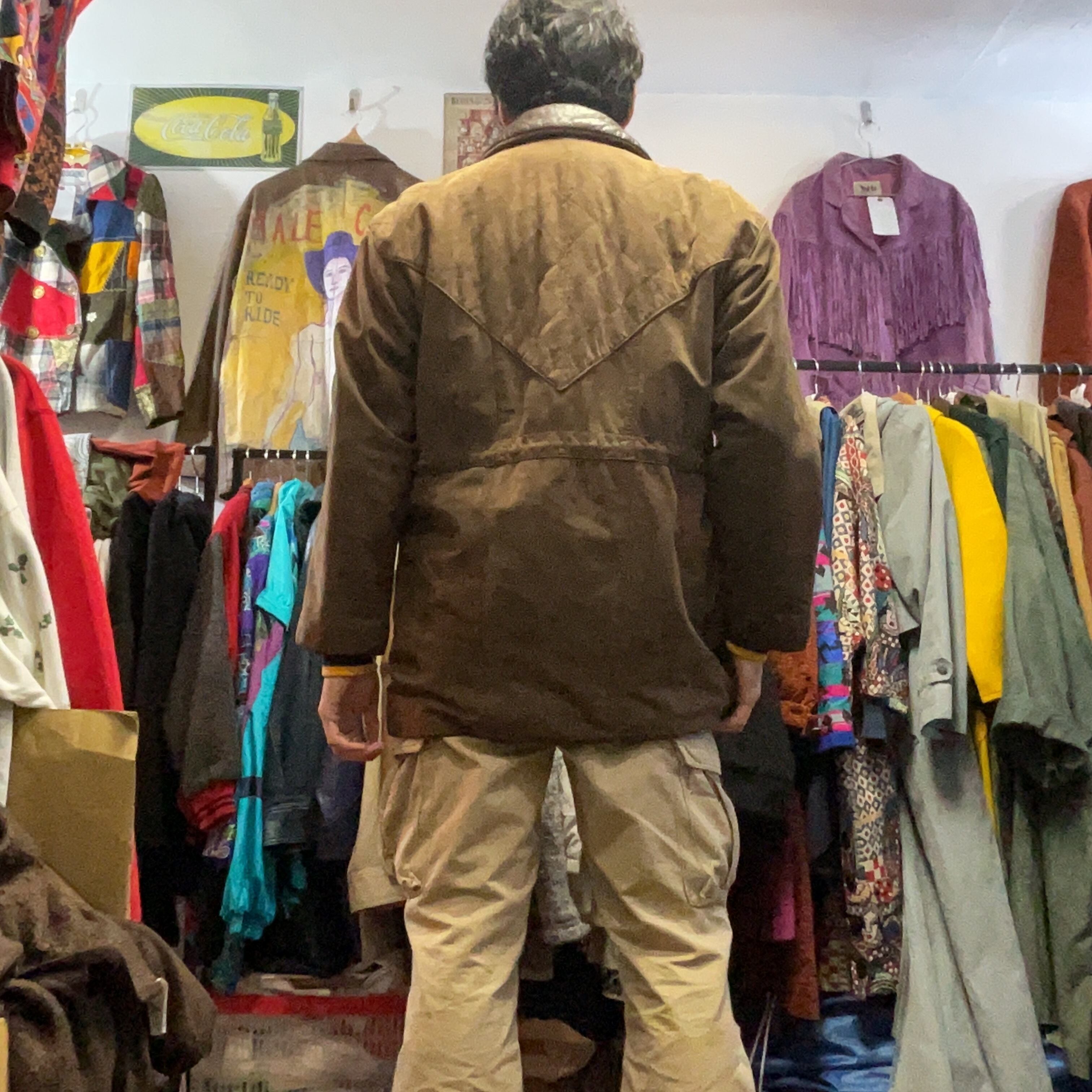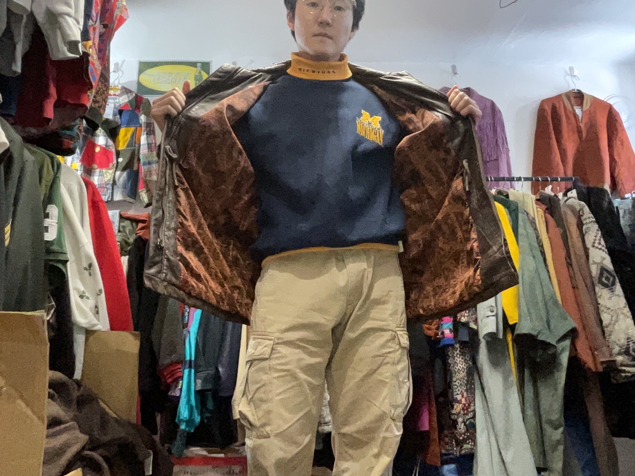 裏地はオレンジ〜ブラウン系の総柄サテンで、脱いだ時にギャップが出るのも古着らしくて最高。革アウターは重く見えがちですが、この裏地のおかげで“抜け感”が出る。