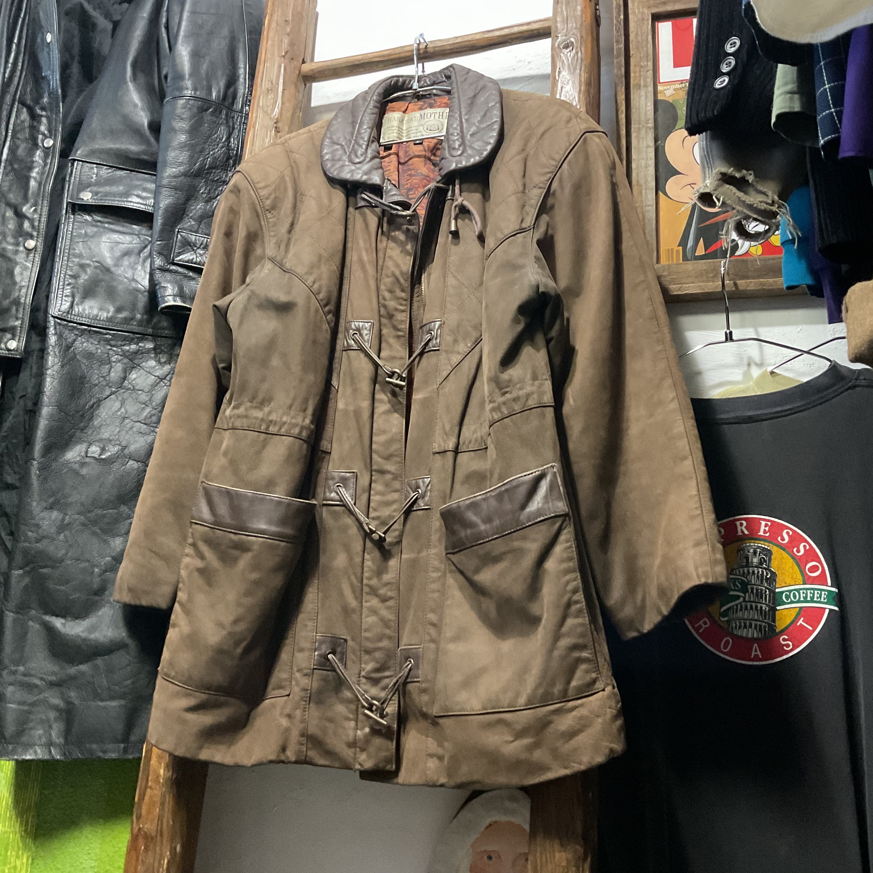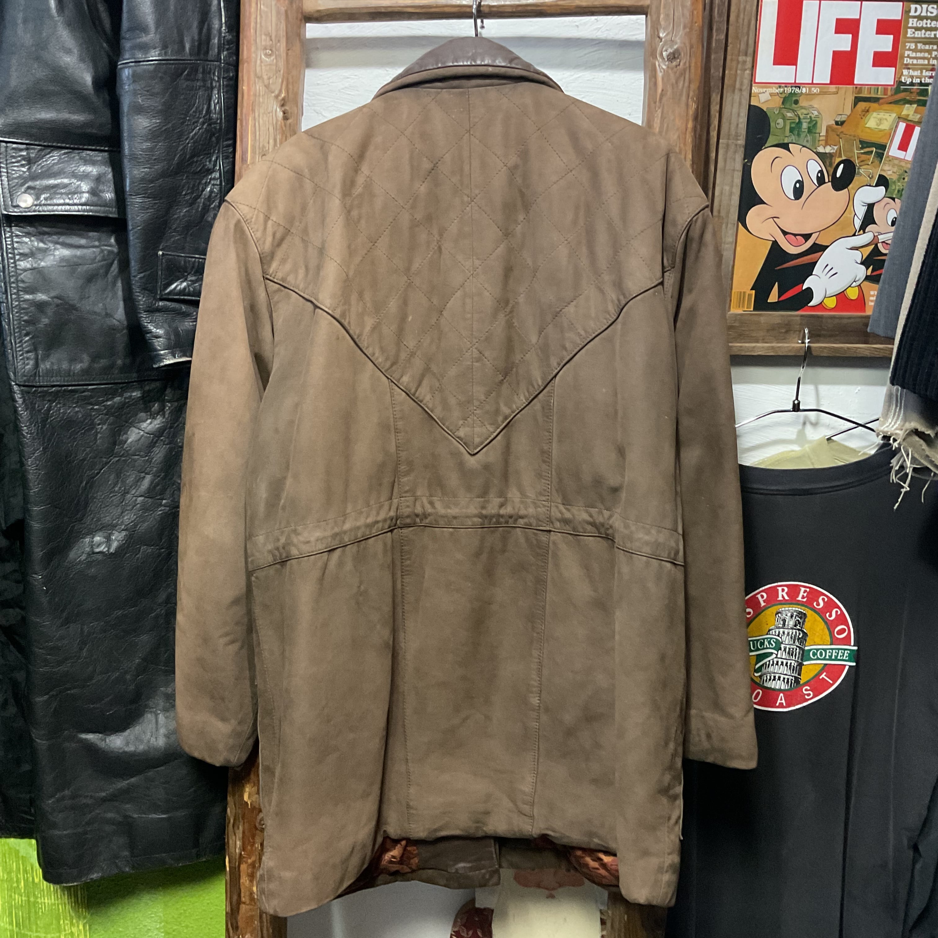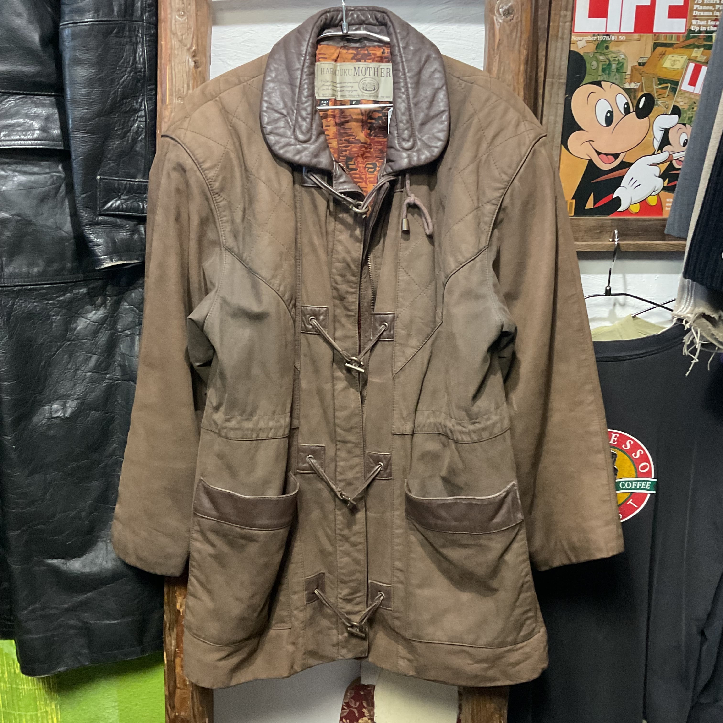 くすんだブラウン〜グレージュ系の色味が渋い、カウレザー(牛革)のロングアウター。表面はツヤツヤの新品革ではなく、少しマットで“育った”質感。これが逆に武骨すぎず、大人っぽい印象。