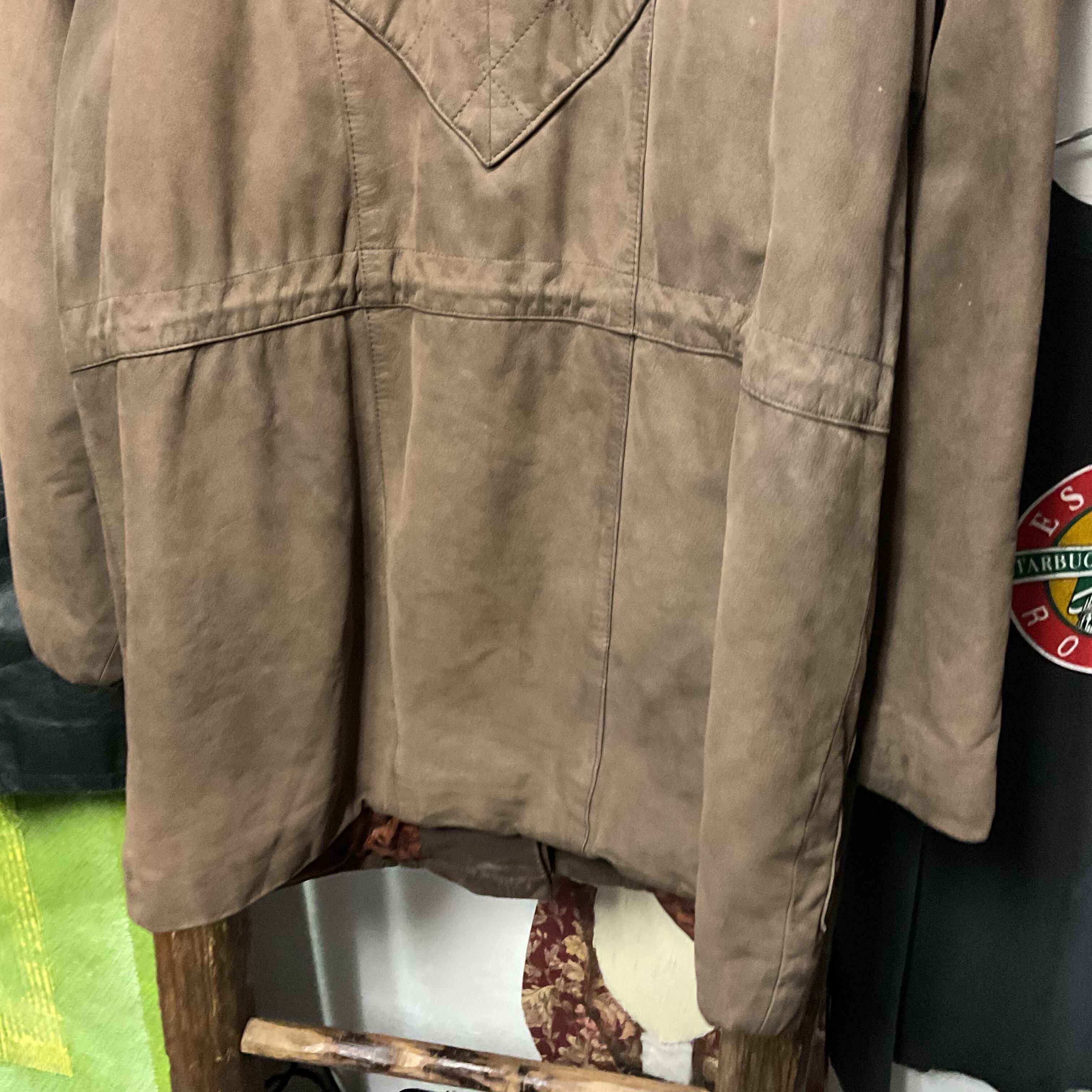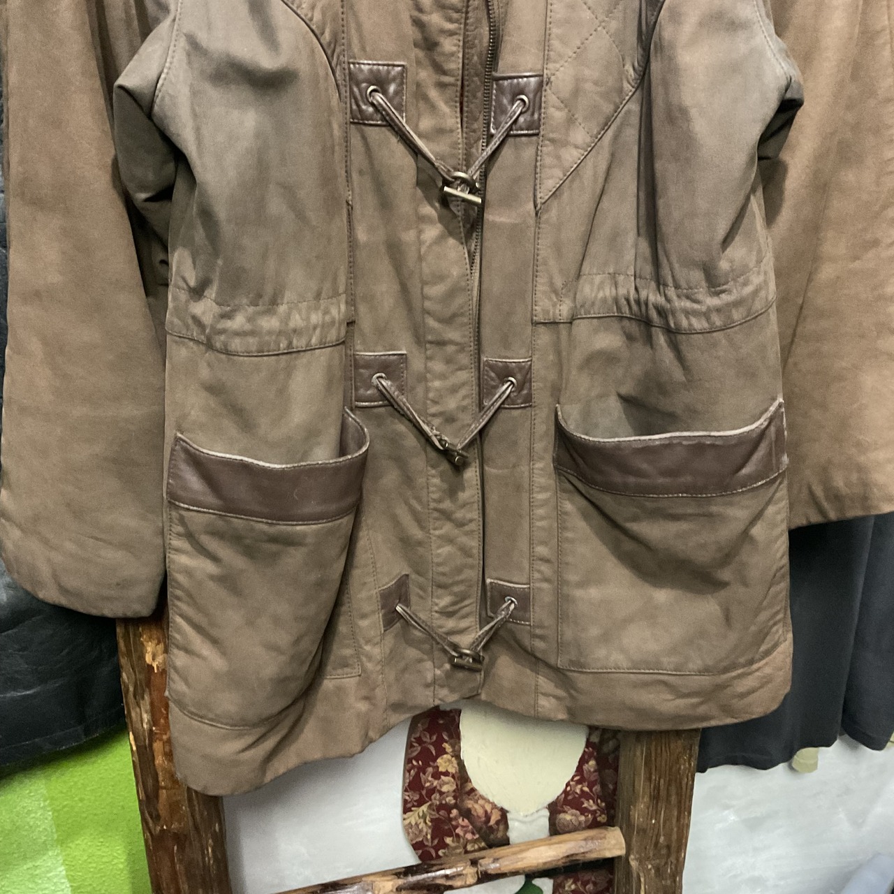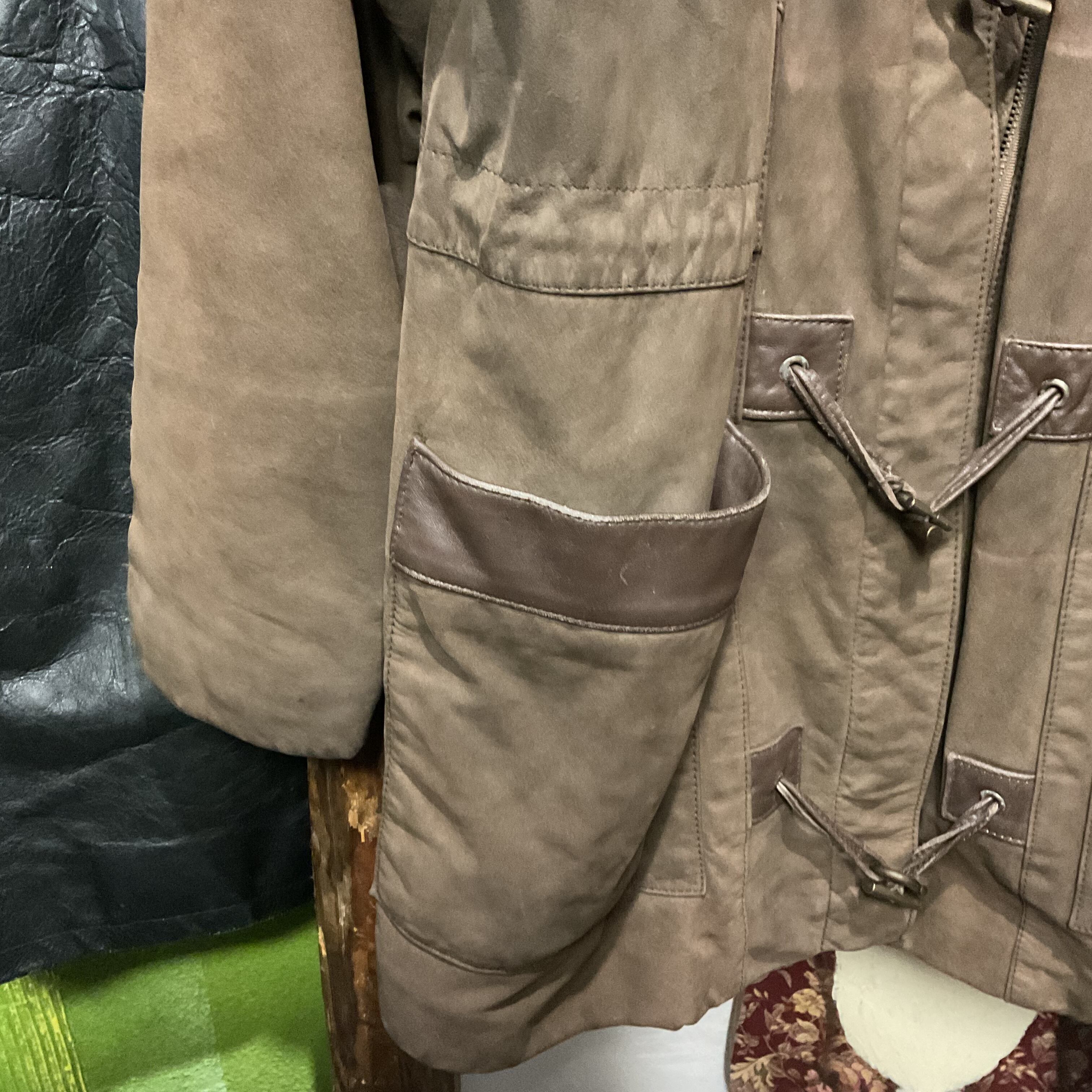 くすんだブラウン〜グレージュ系の色味が渋い、カウレザー(牛革)のロングアウター。表面はツヤツヤの新品革ではなく、少しマットで“育った”質感。これが逆に武骨すぎず、大人っぽい印象。