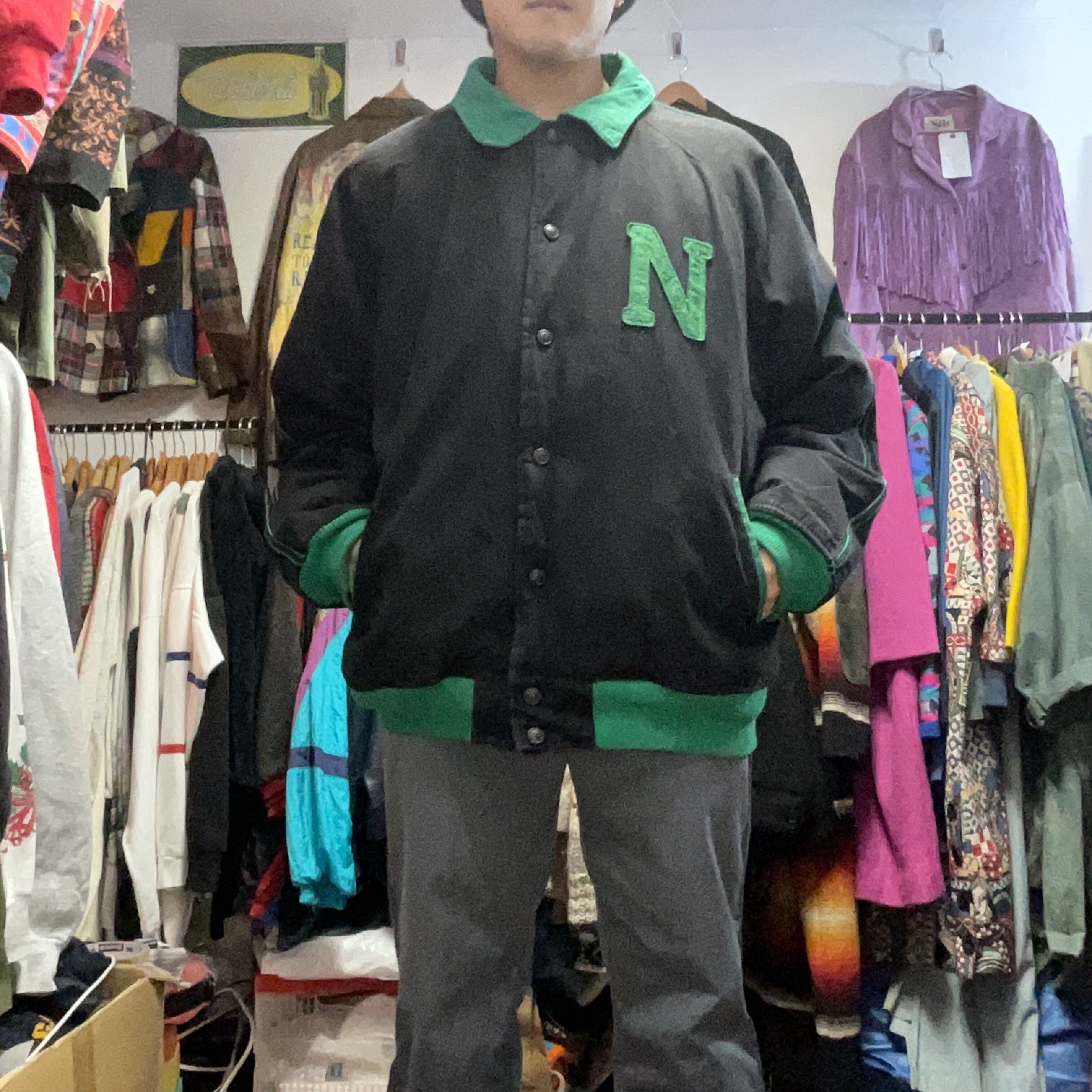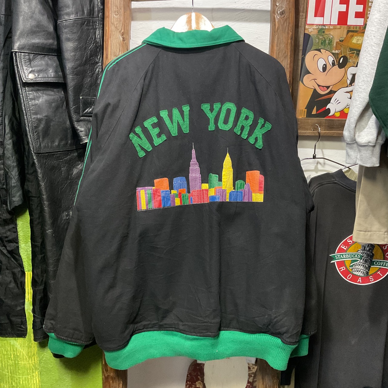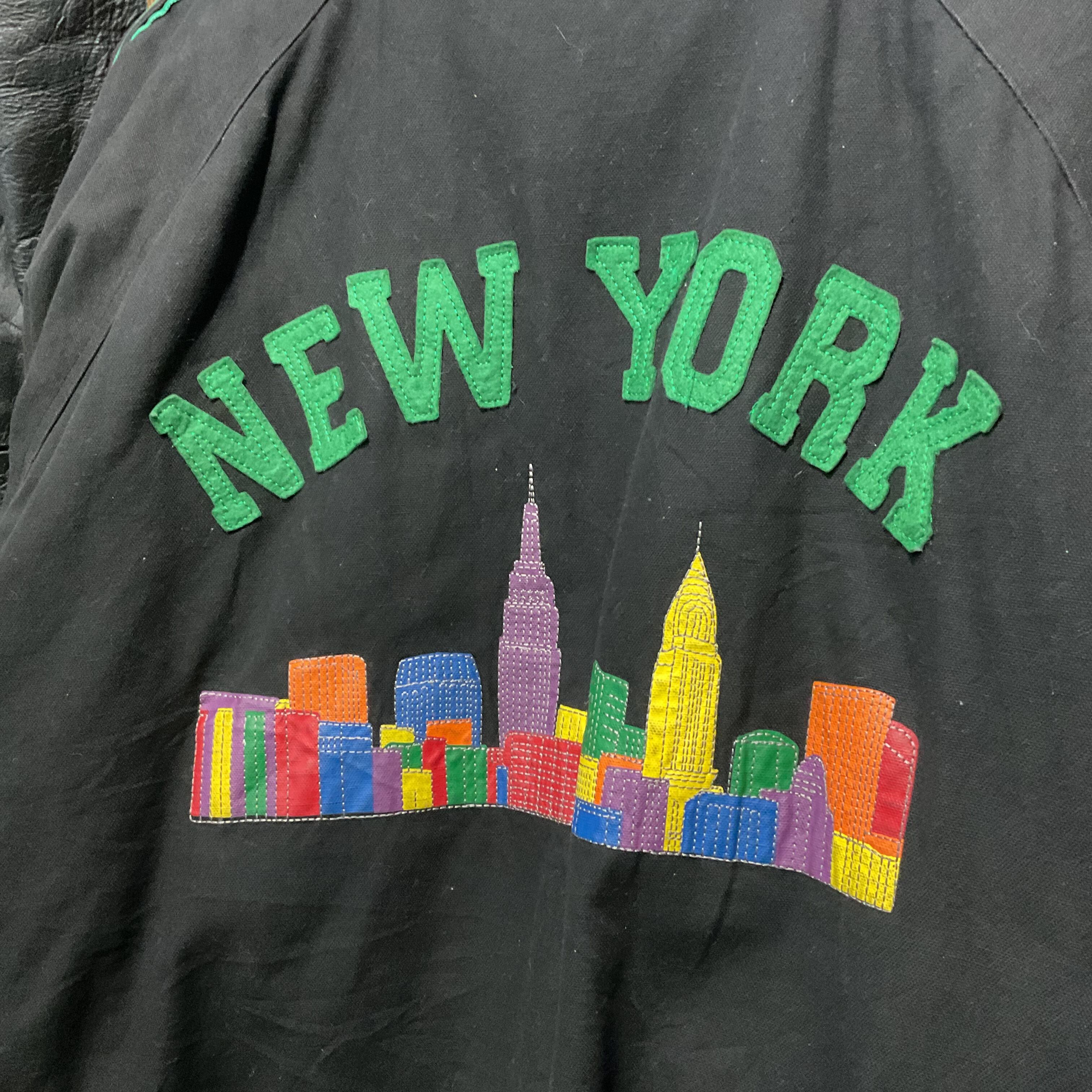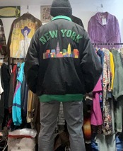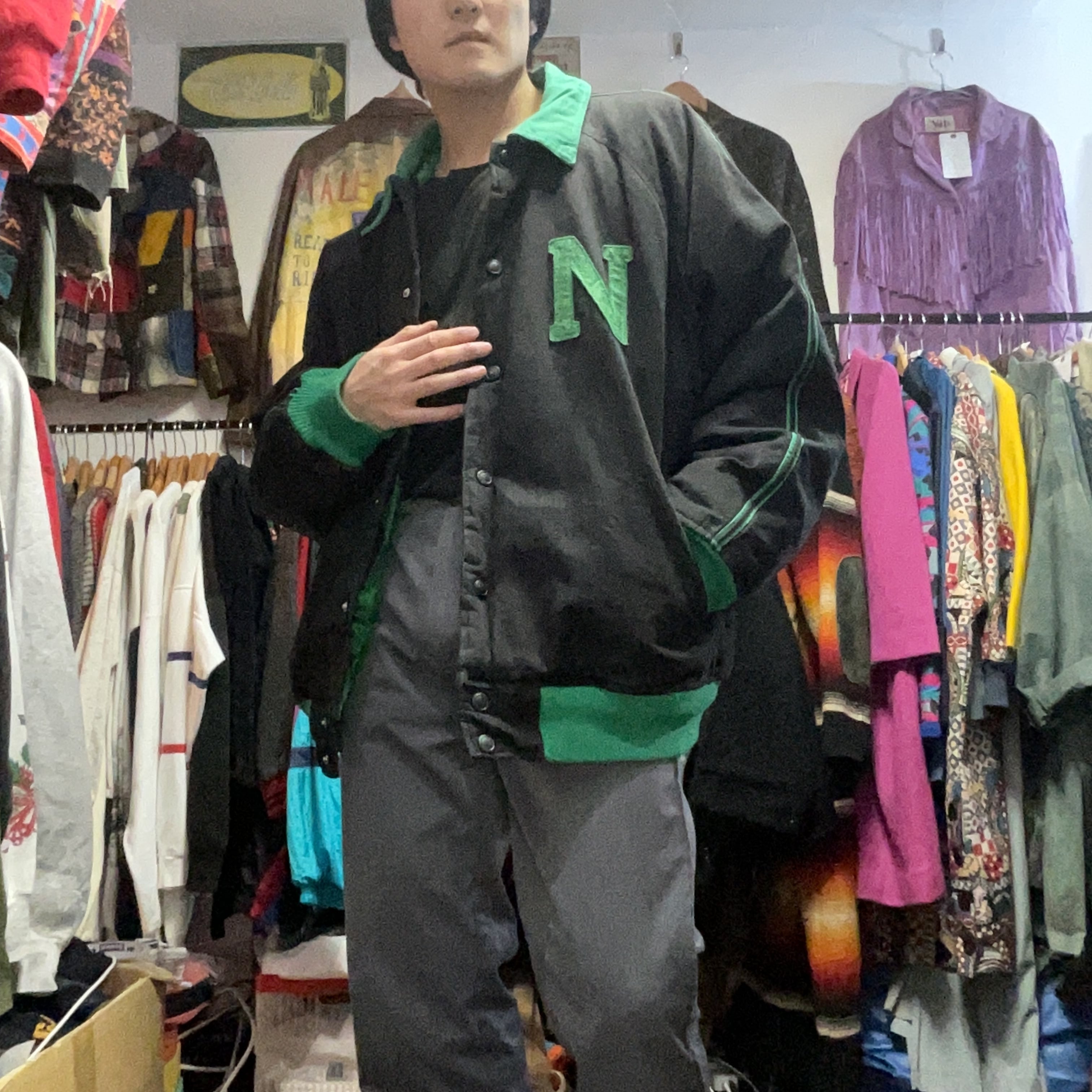 ブラックボディに、襟・袖口・裾をビビッドなグリーンで切り替えた、配色の効いたナイロン系スタジャン。フロントには存在感のあるサガラ(フェルト)ワッペン “N”、バックには"NEW YORK” のアーチロゴ+カラフルなスカイライン刺繍が入り、90s〜Y2Kの空気感。