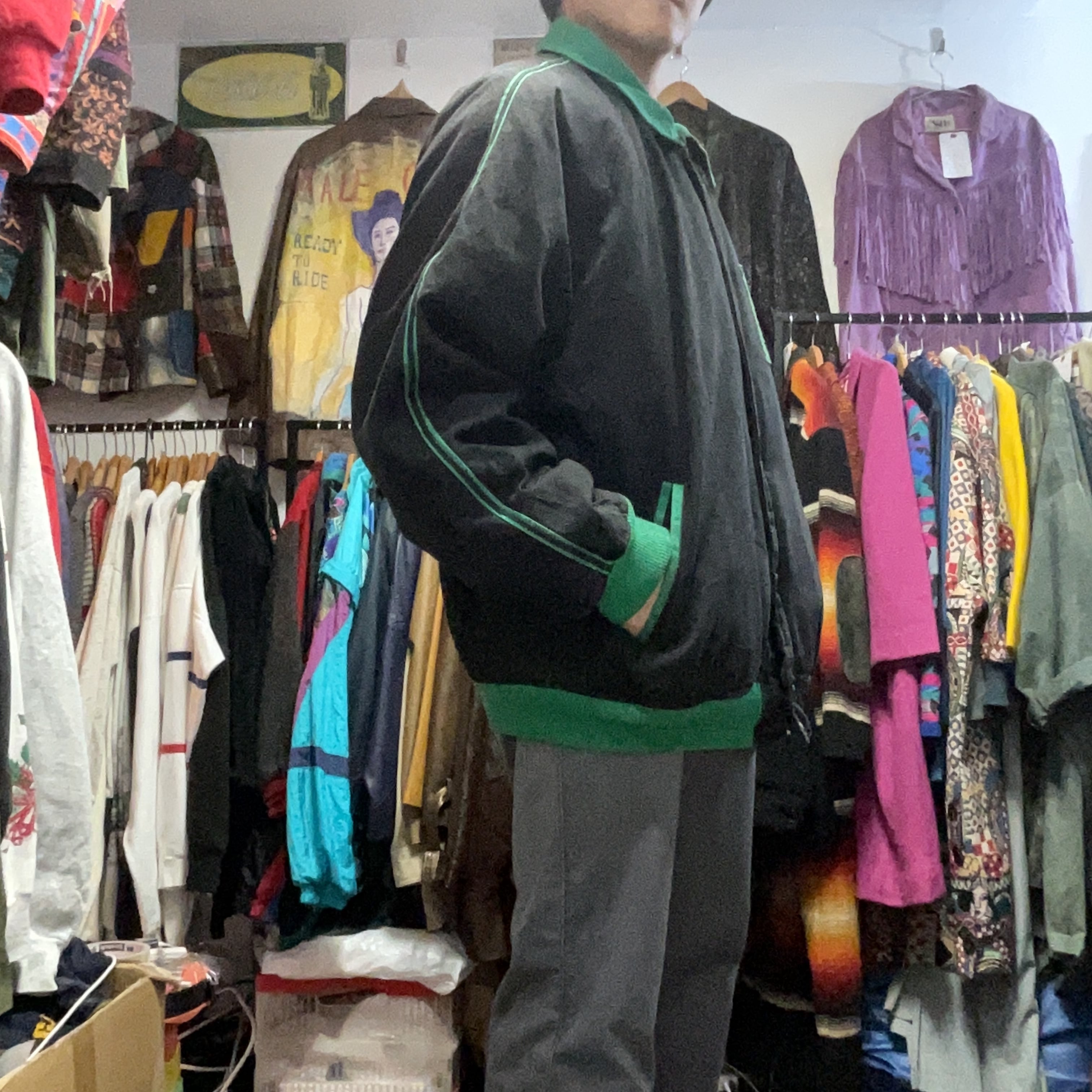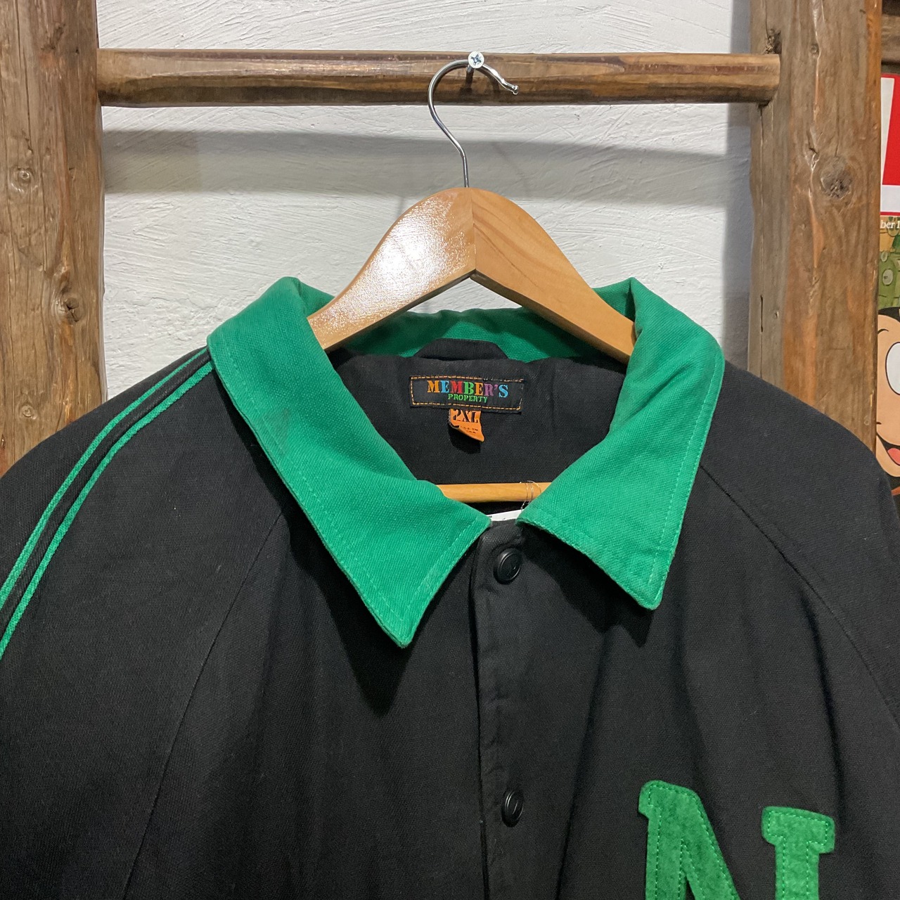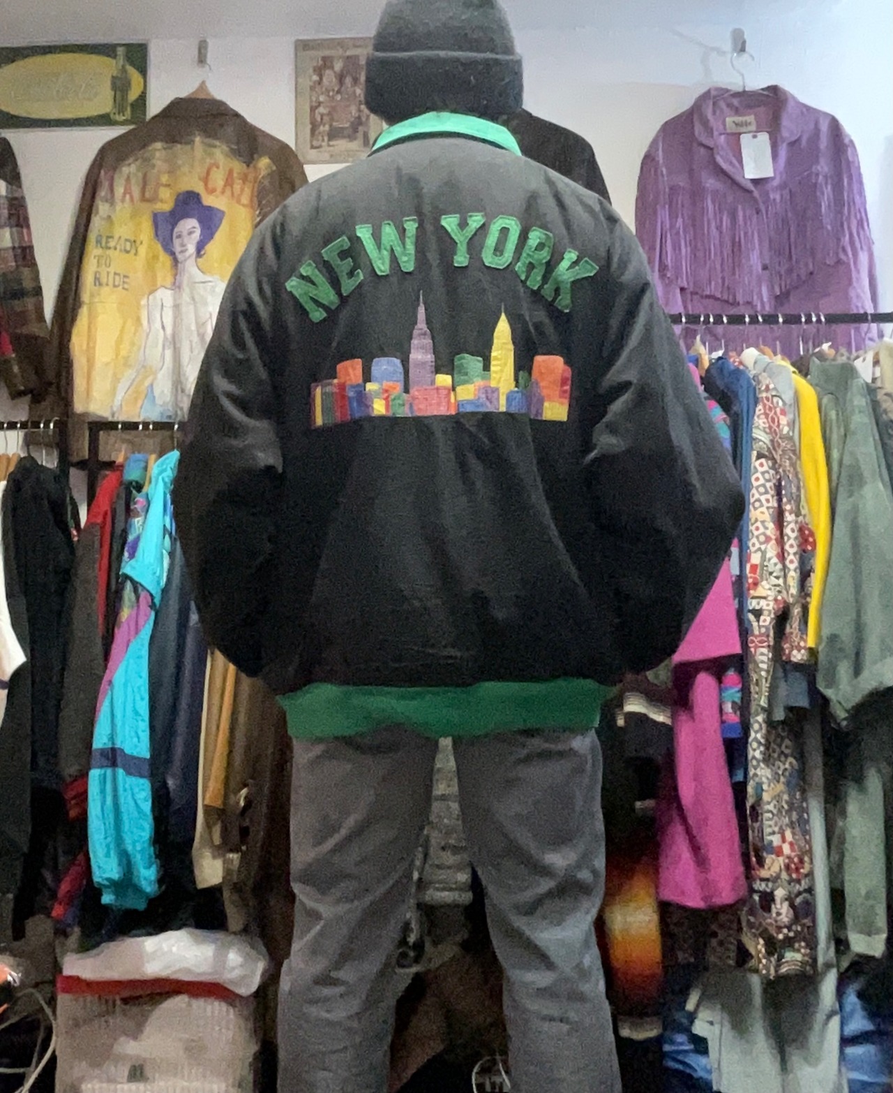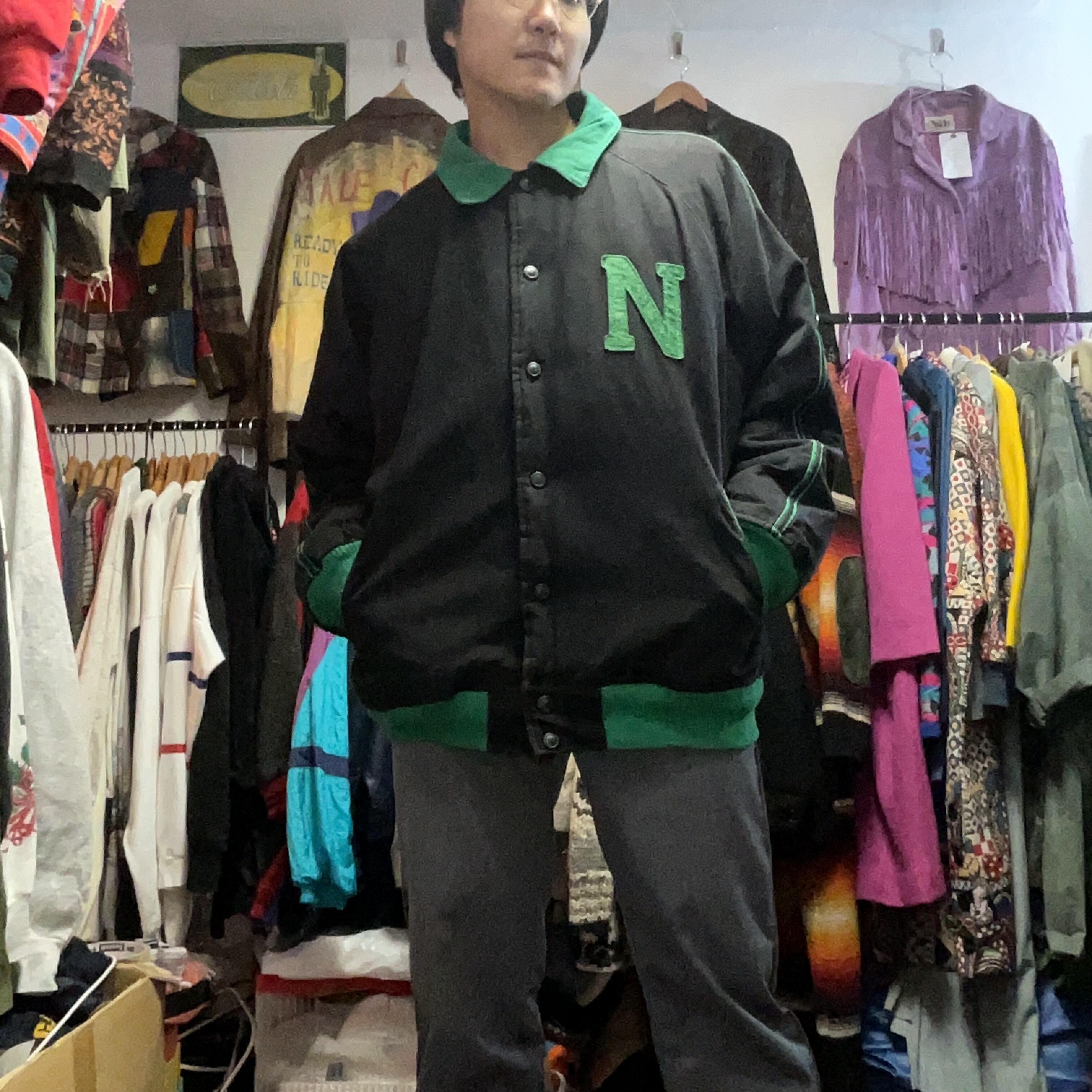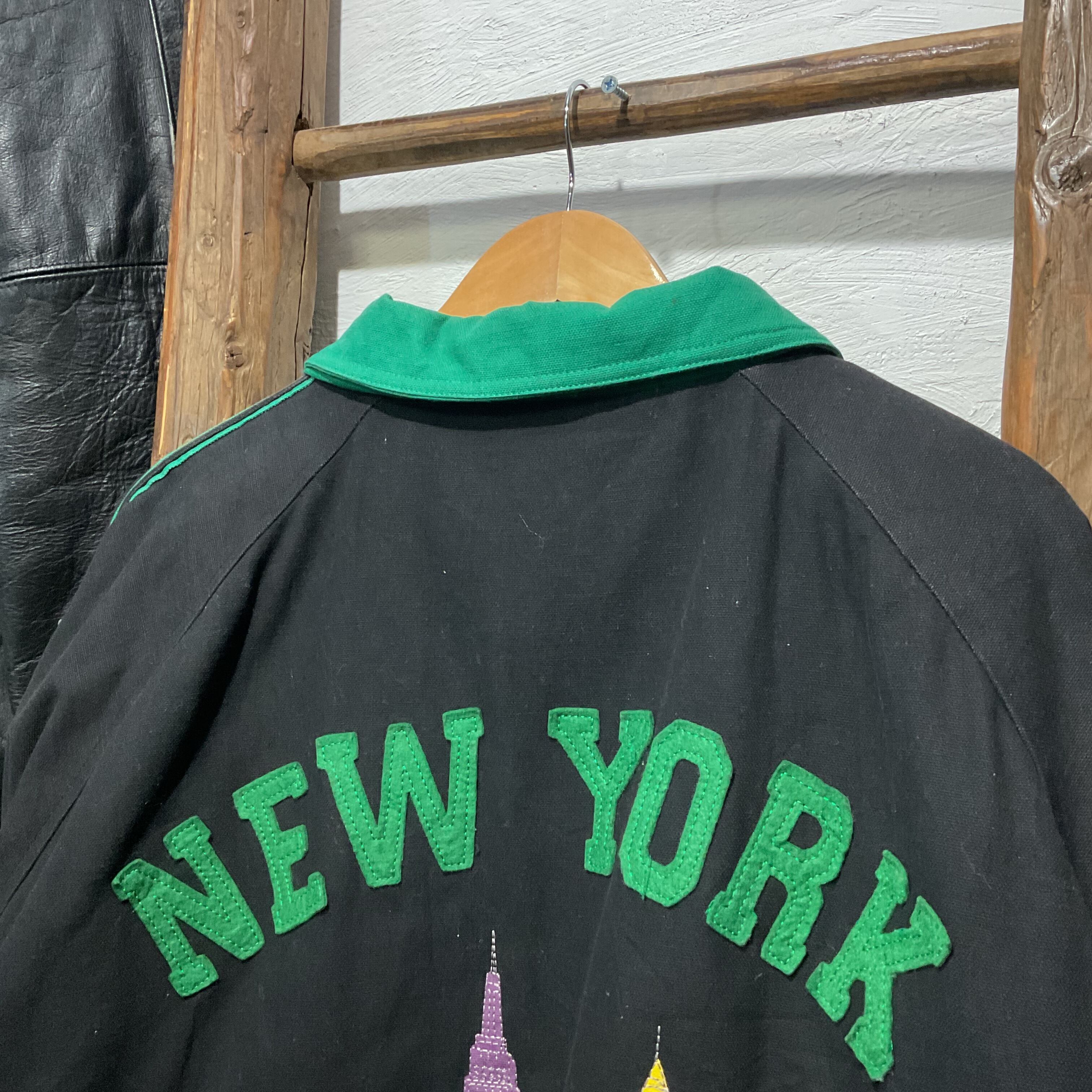 ブラックボディに、襟・袖口・裾をビビッドなグリーンで切り替えた、配色の効いたナイロン系スタジャン。フロントには存在感のあるサガラ(フェルト)ワッペン “N”、バックには"NEW YORK” のアーチロゴ+カラフルなスカイライン刺繍が入り、90s〜Y2Kの空気感。