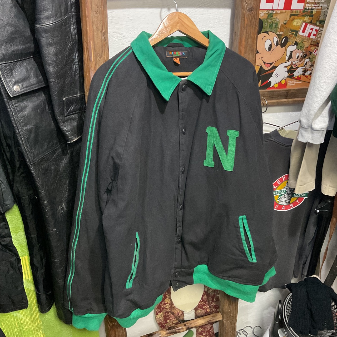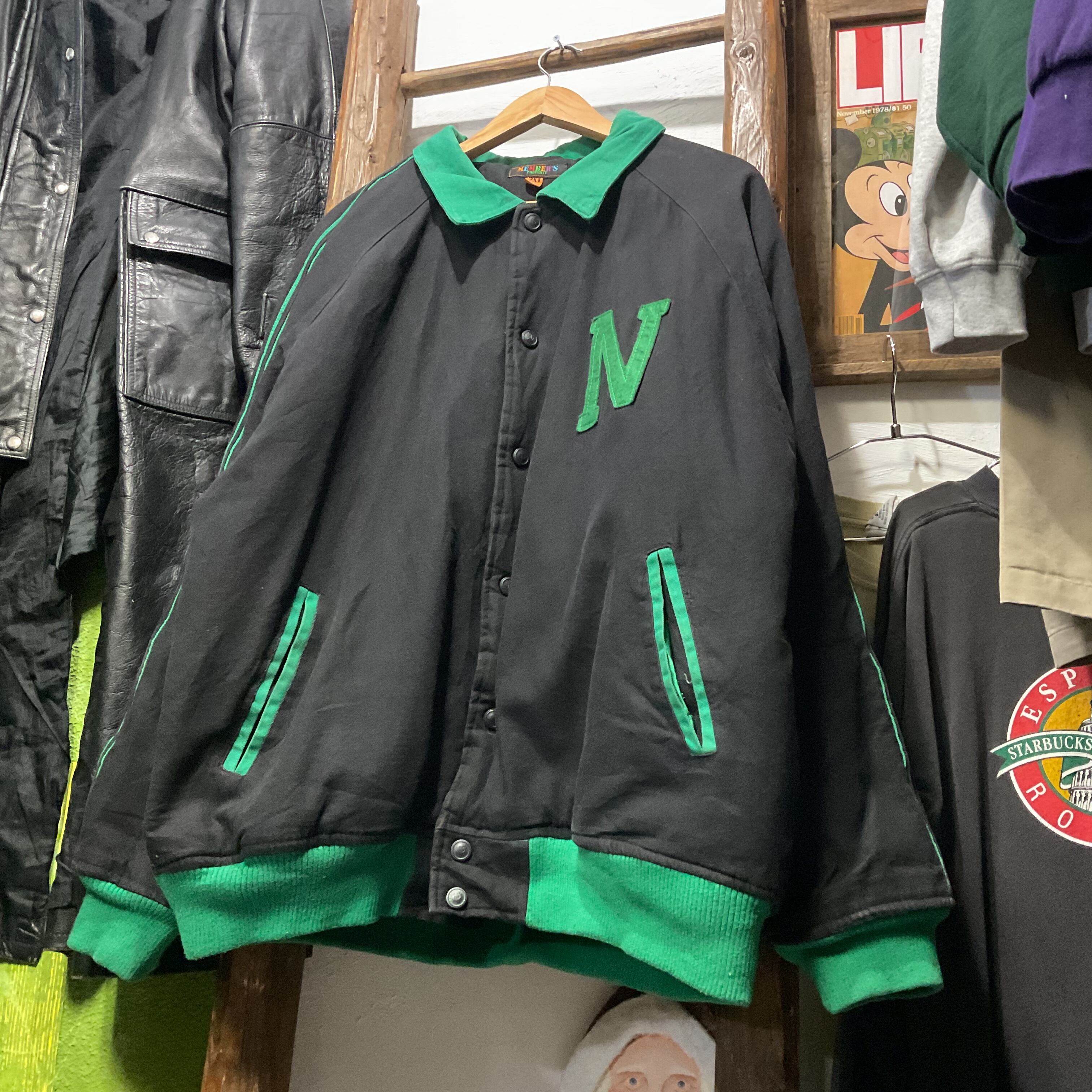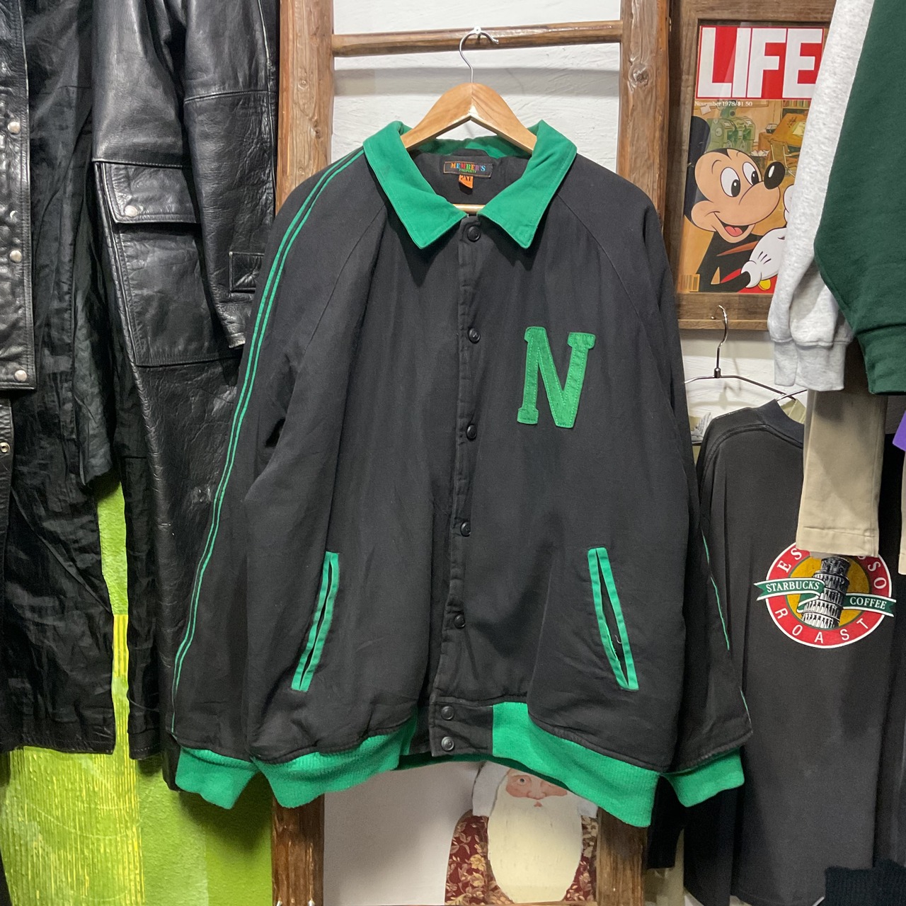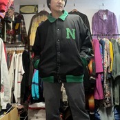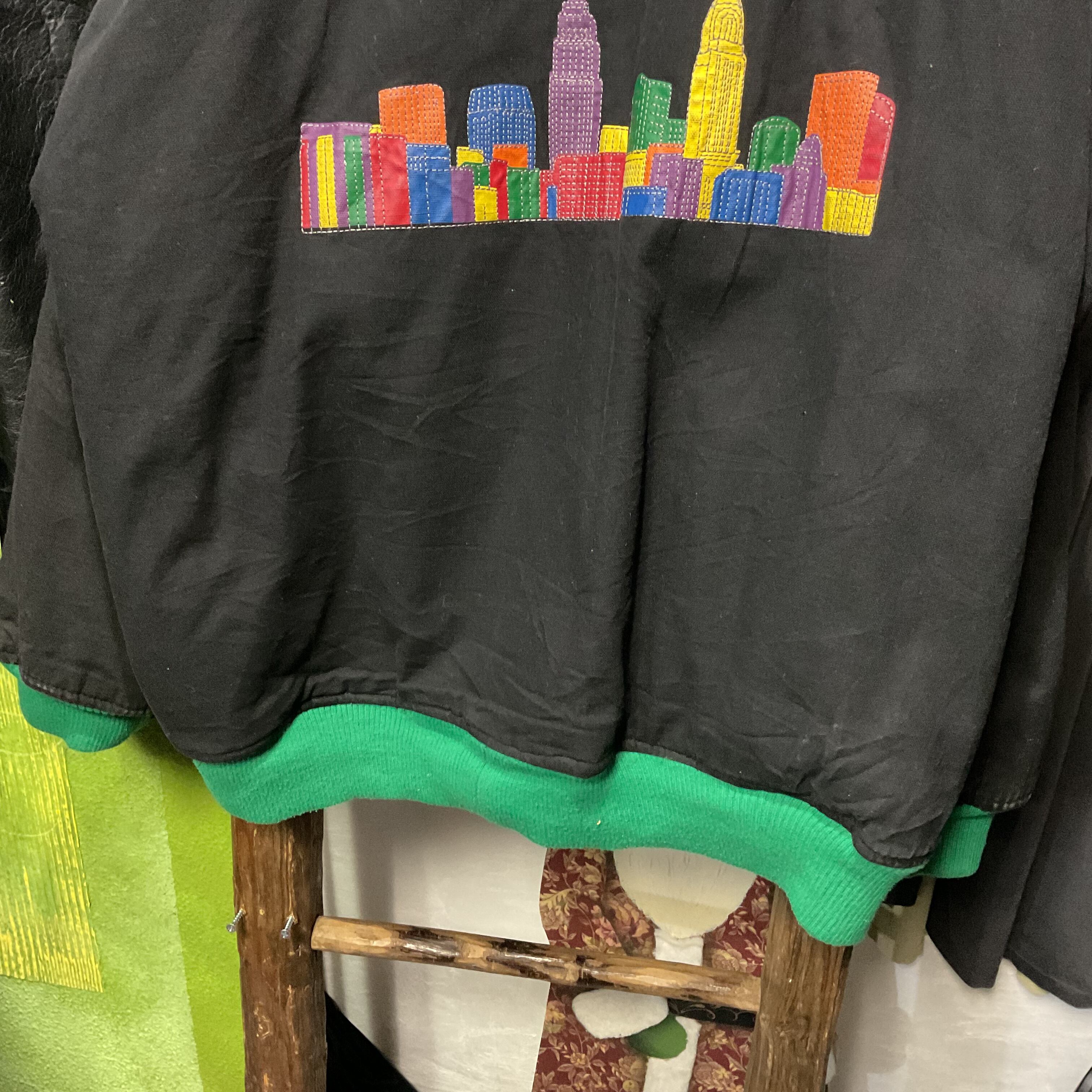 ブラックボディに、襟・袖口・裾をビビッドなグリーンで切り替えた、配色の効いたナイロン系スタジャン。フロントには存在感のあるサガラ(フェルト)ワッペン “N”、バックには"NEW YORK” のアーチロゴ+カラフルなスカイライン刺繍が入り、90s〜Y2Kの空気感。