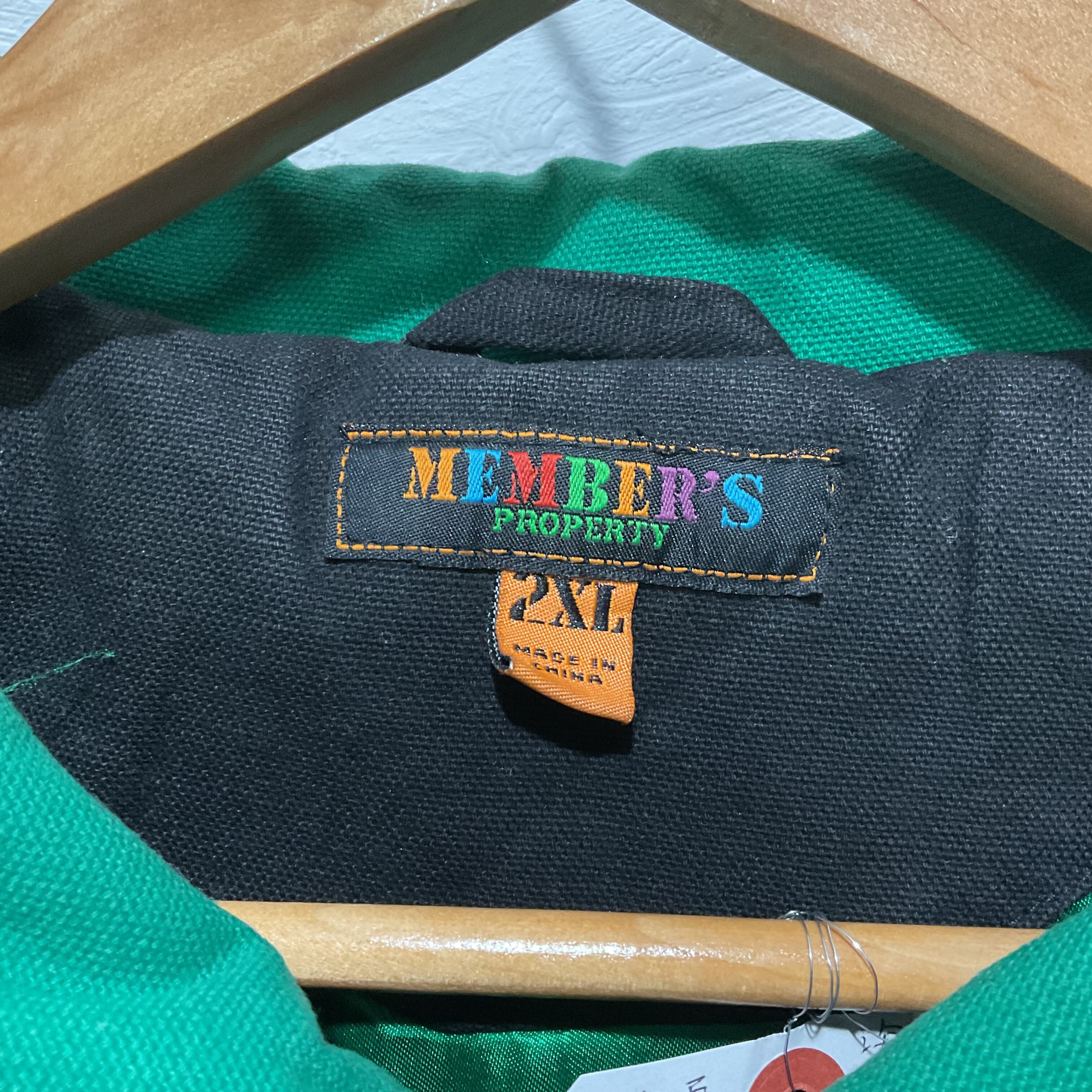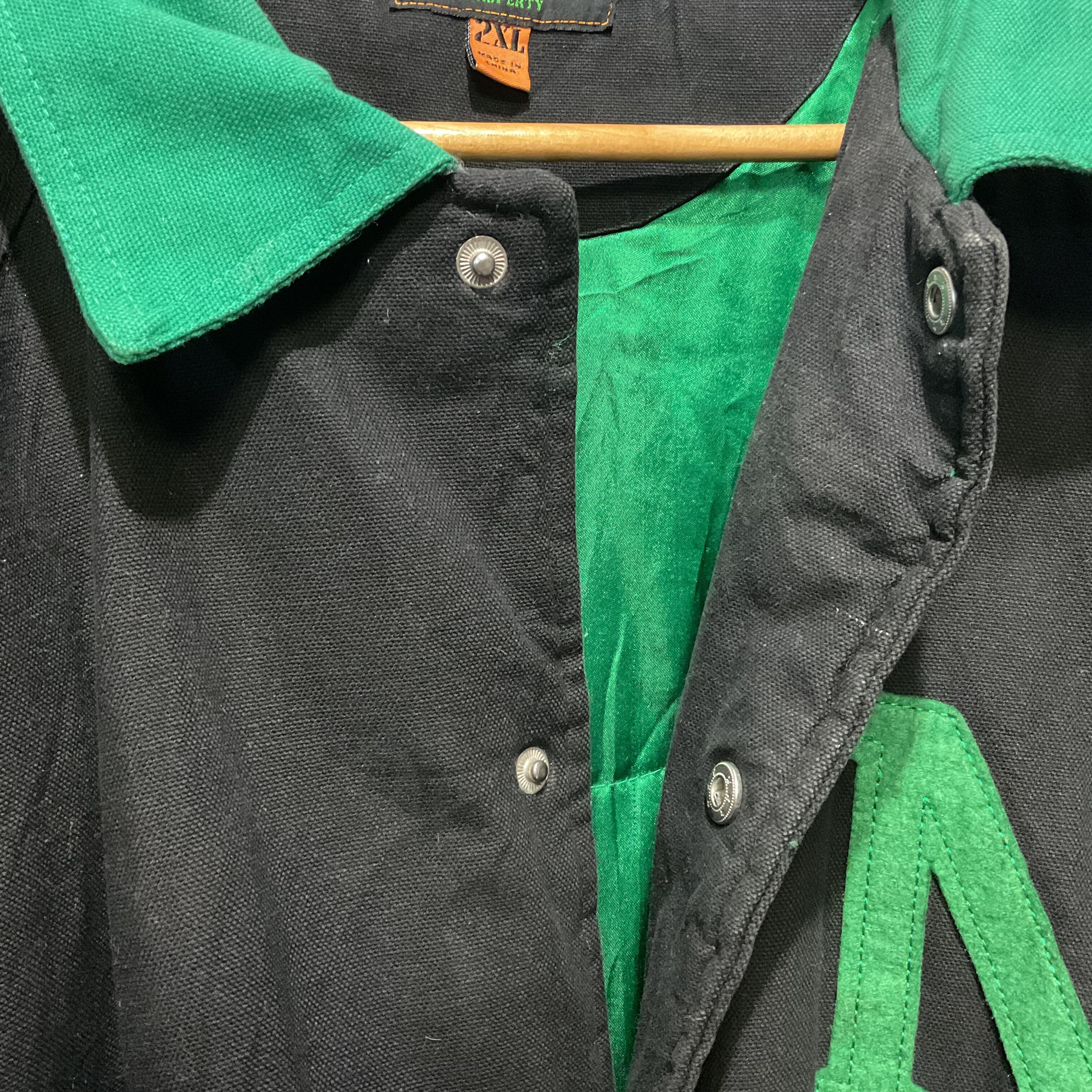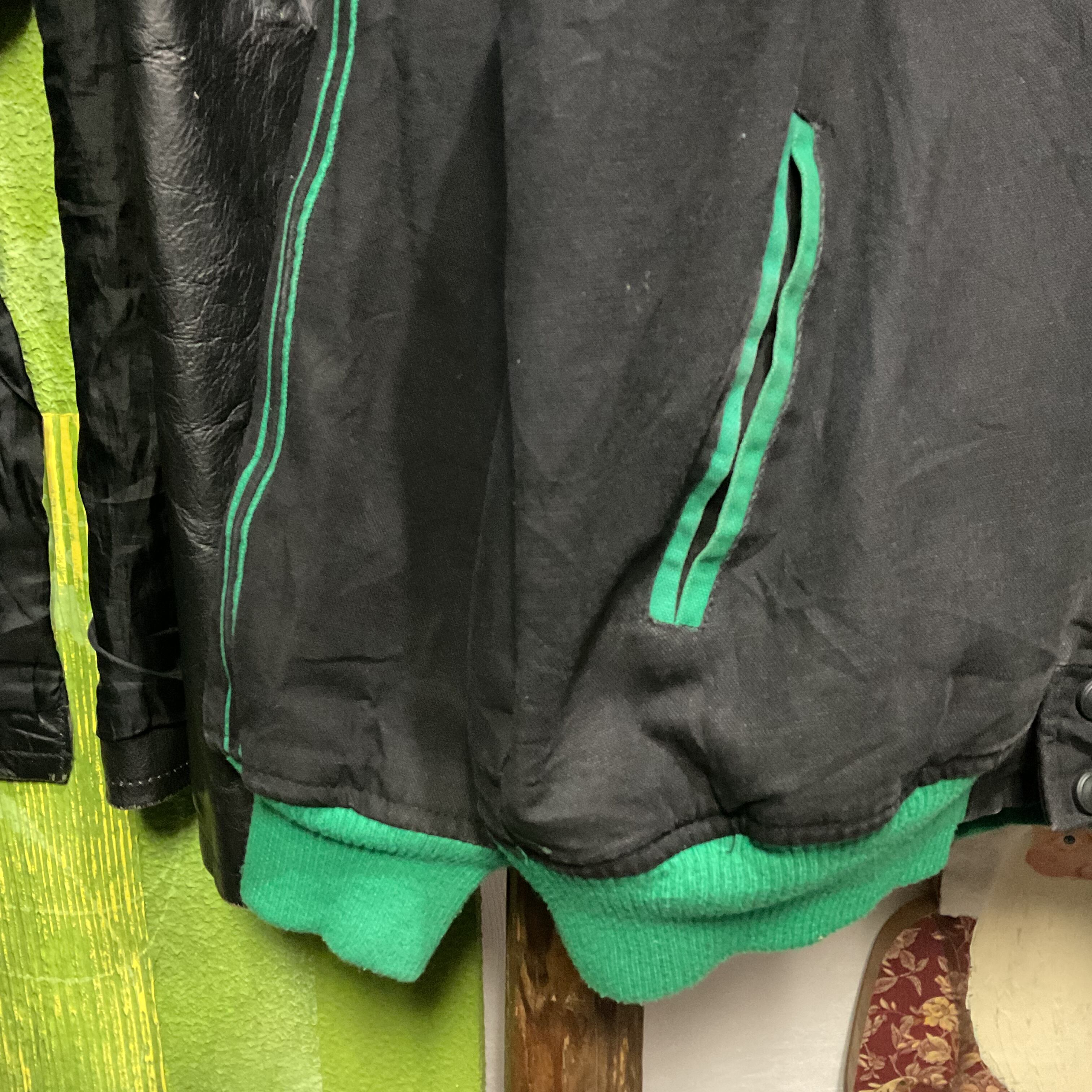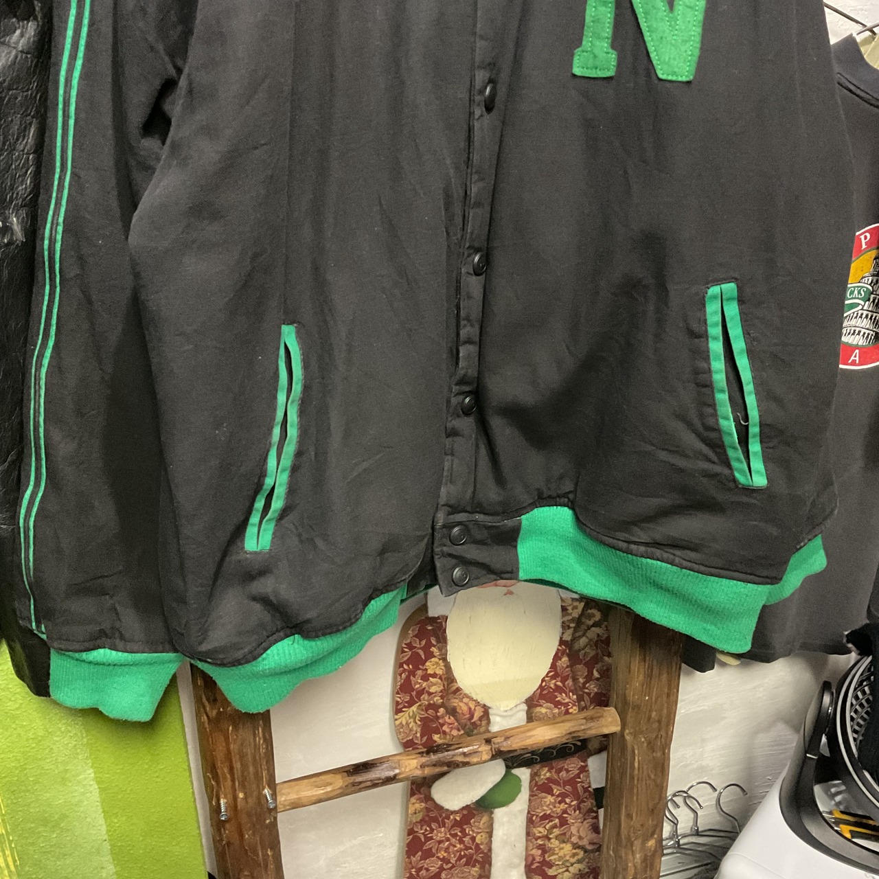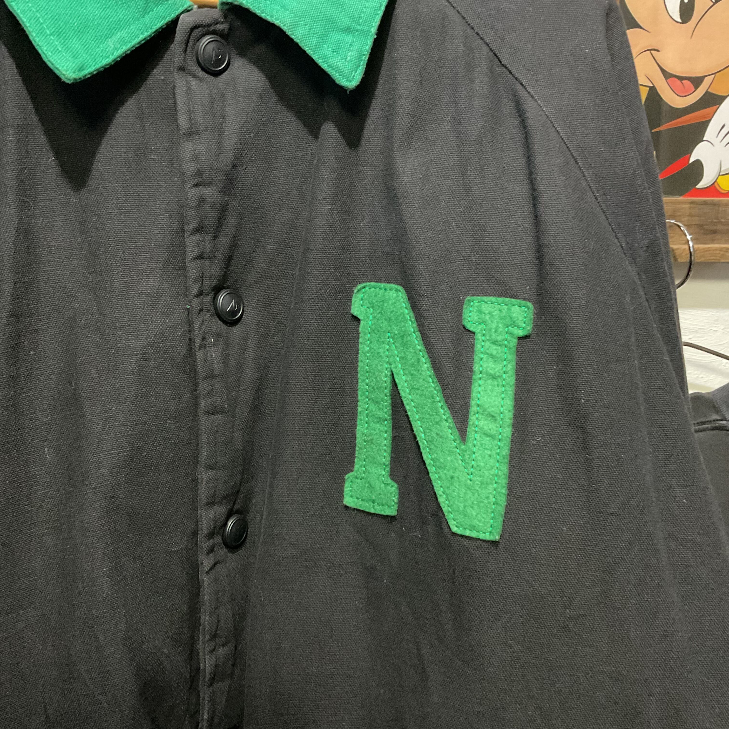 ブラックボディに、襟・袖口・裾をビビッドなグリーンで切り替えた、配色の効いたナイロン系スタジャン。フロントには存在感のあるサガラ(フェルト)ワッペン “N”、バックには"NEW YORK” のアーチロゴ+カラフルなスカイライン刺繍が入り、90s〜Y2Kの空気感。