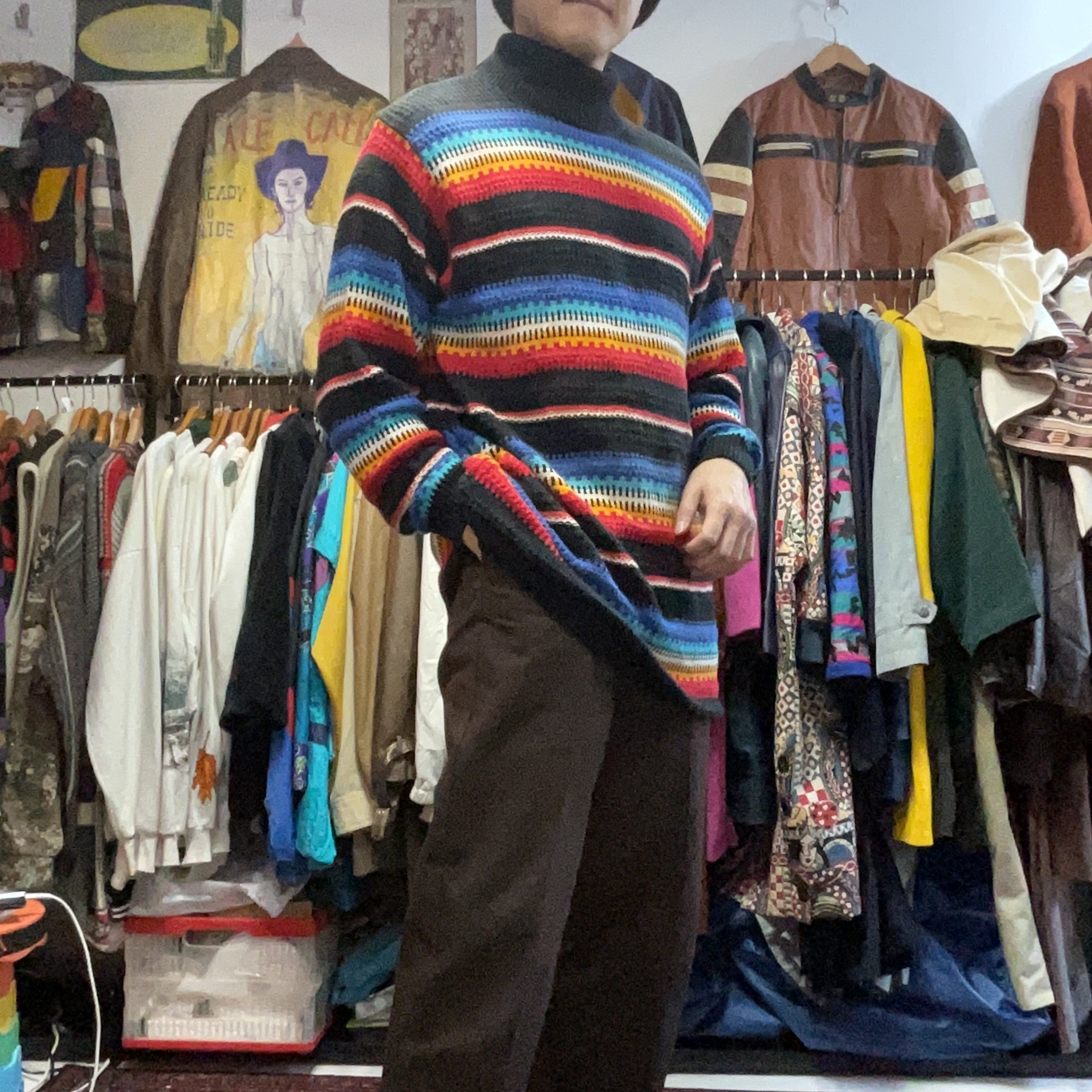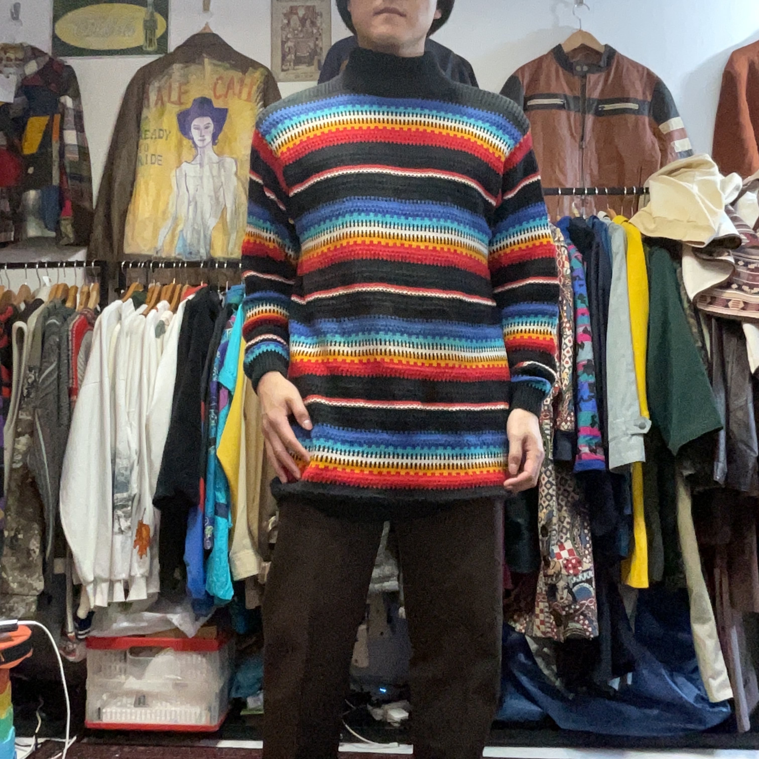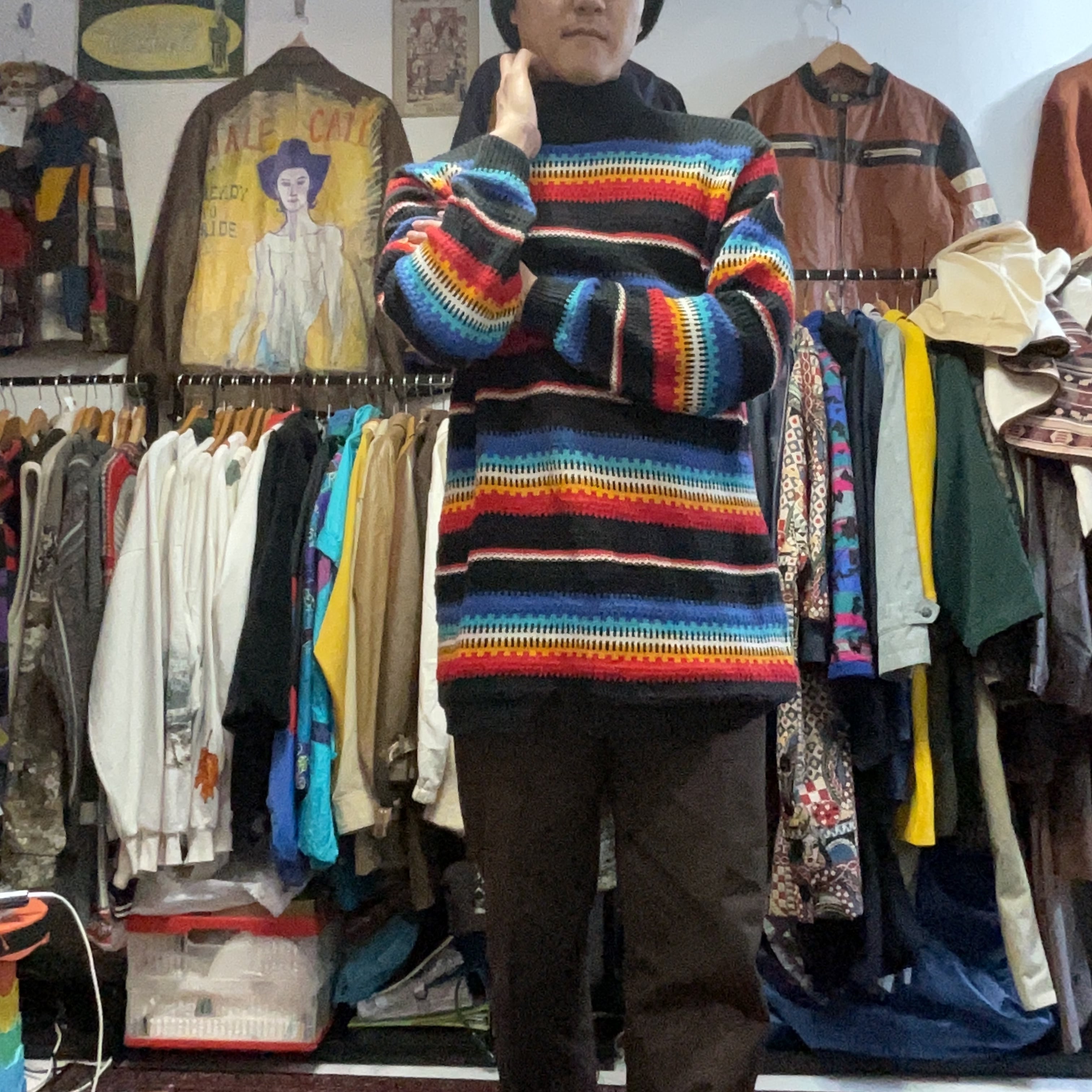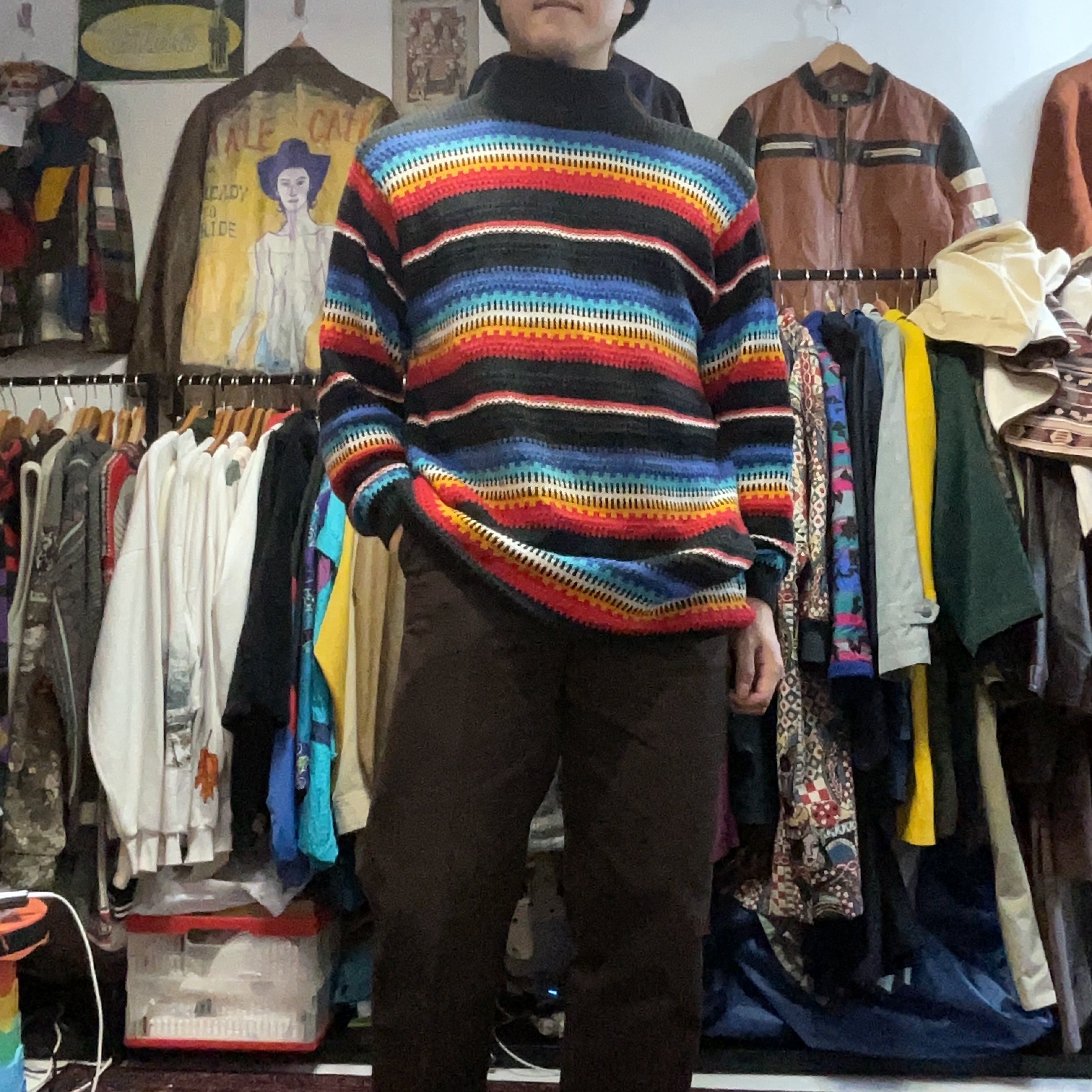 ブラックをベースに、ブルー〜ターコイズ、ホワイト、イエロー、レッドが波打つように入ったマルチボーダーのモックネックニット。配色は派手なのに、ベースが黒だから落ち着きがあって、1枚で主役になりつつ合わせやすいのが強み。