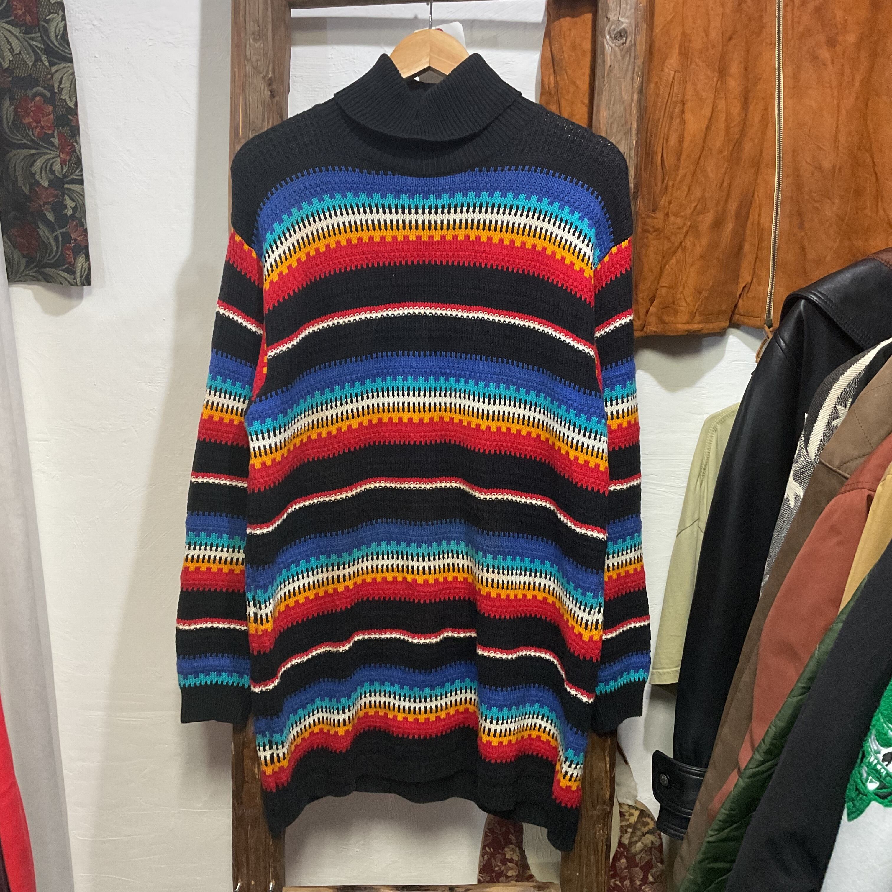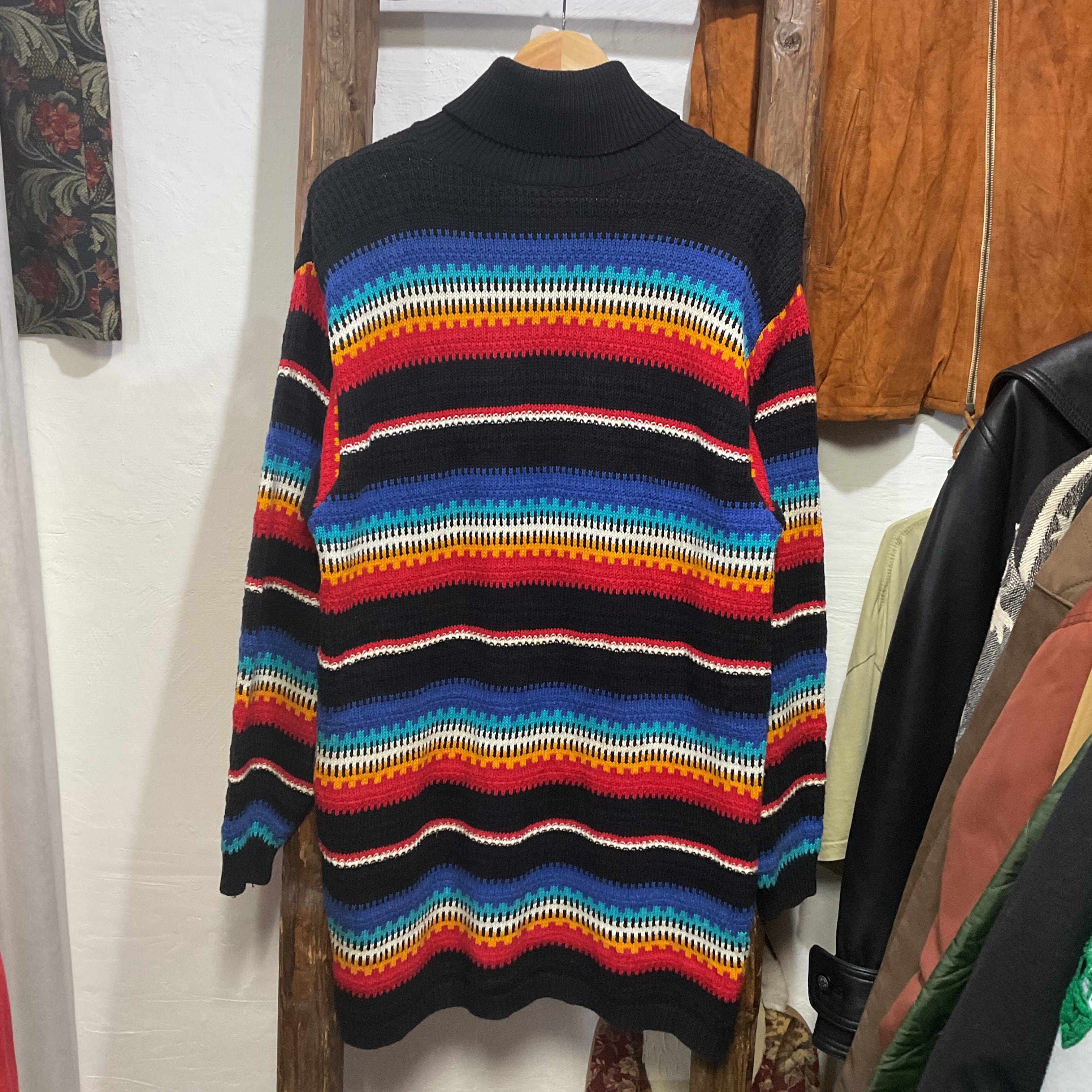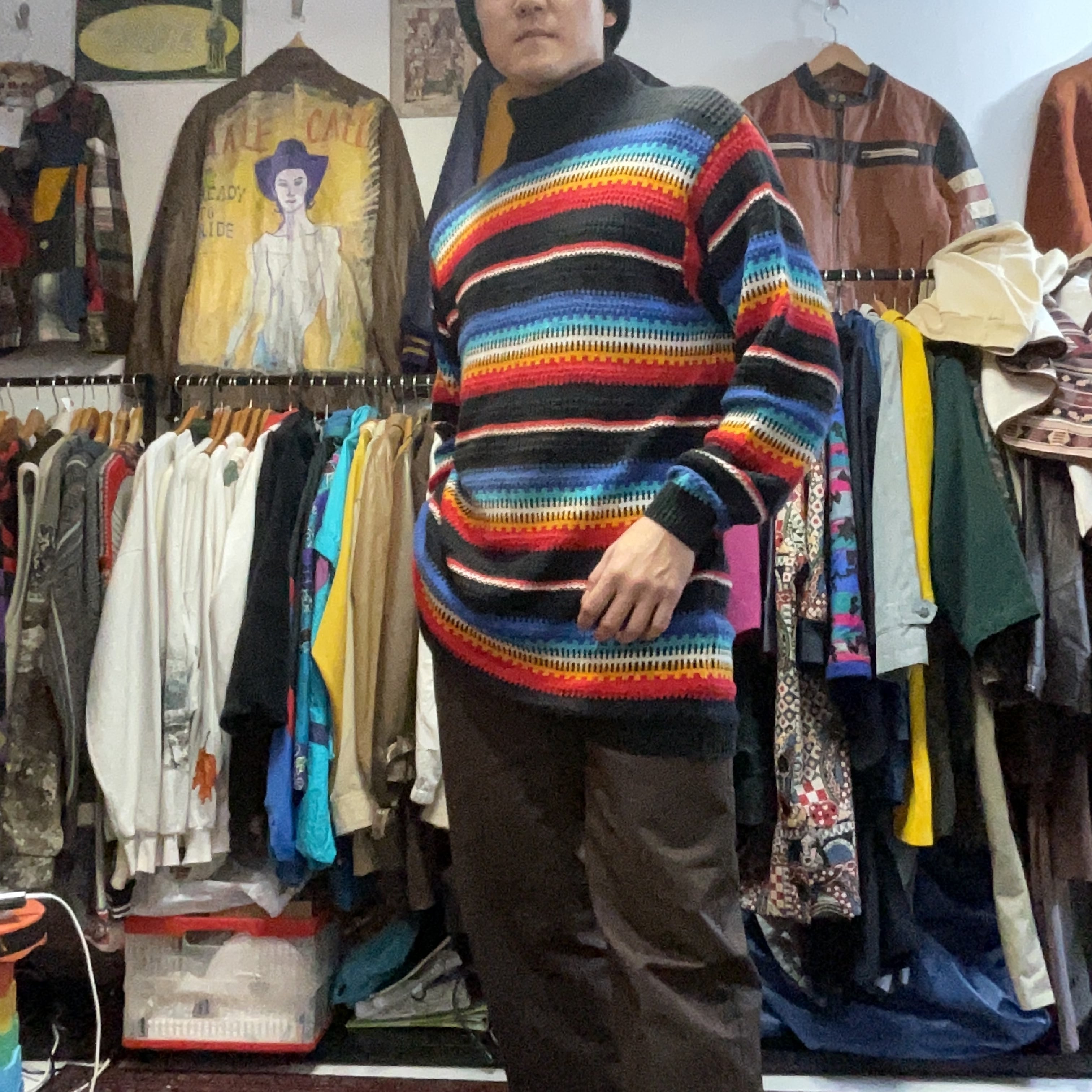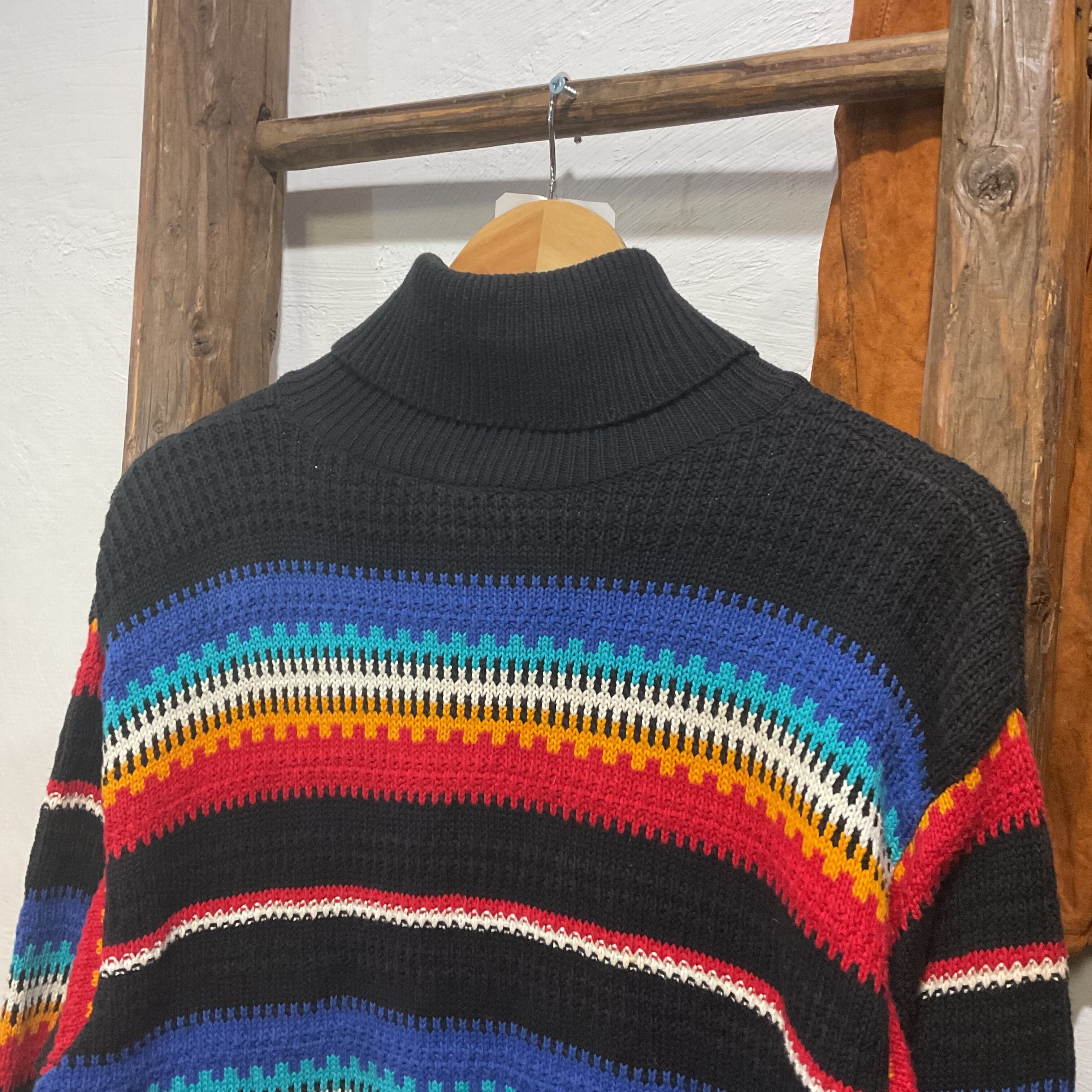 ブラックをベースに、ブルー〜ターコイズ、ホワイト、イエロー、レッドが波打つように入ったマルチボーダーのモックネックニット。配色は派手なのに、ベースが黒だから落ち着きがあって、1枚で主役になりつつ合わせやすいのが強み。