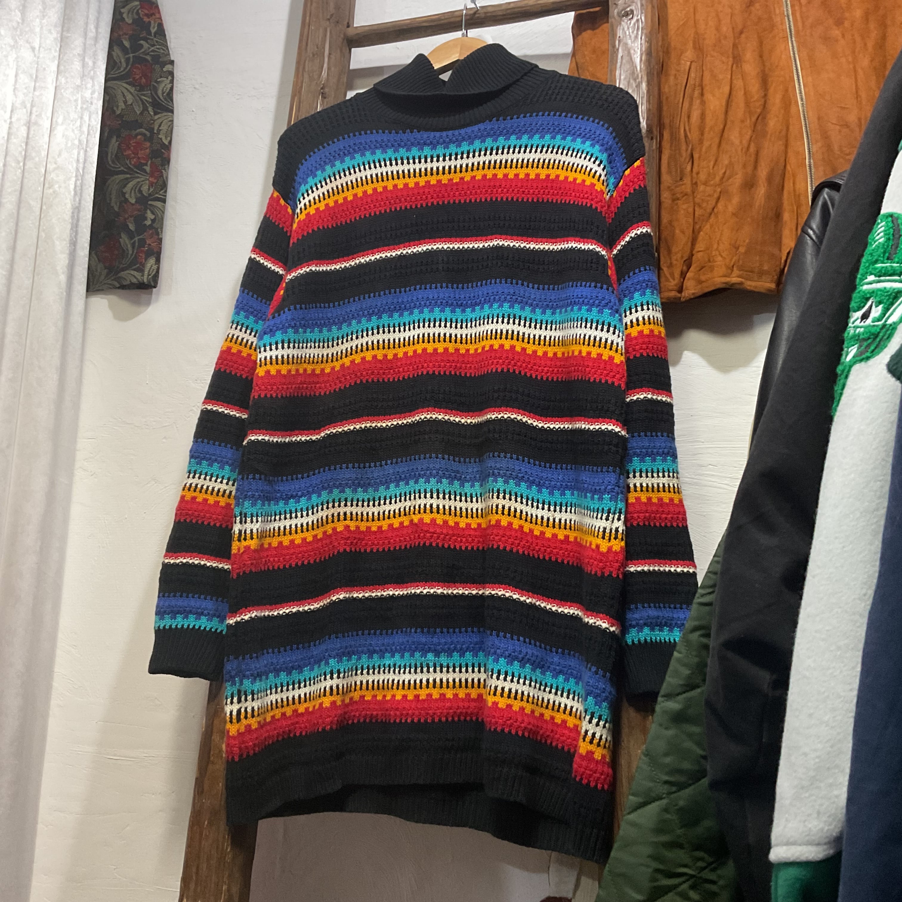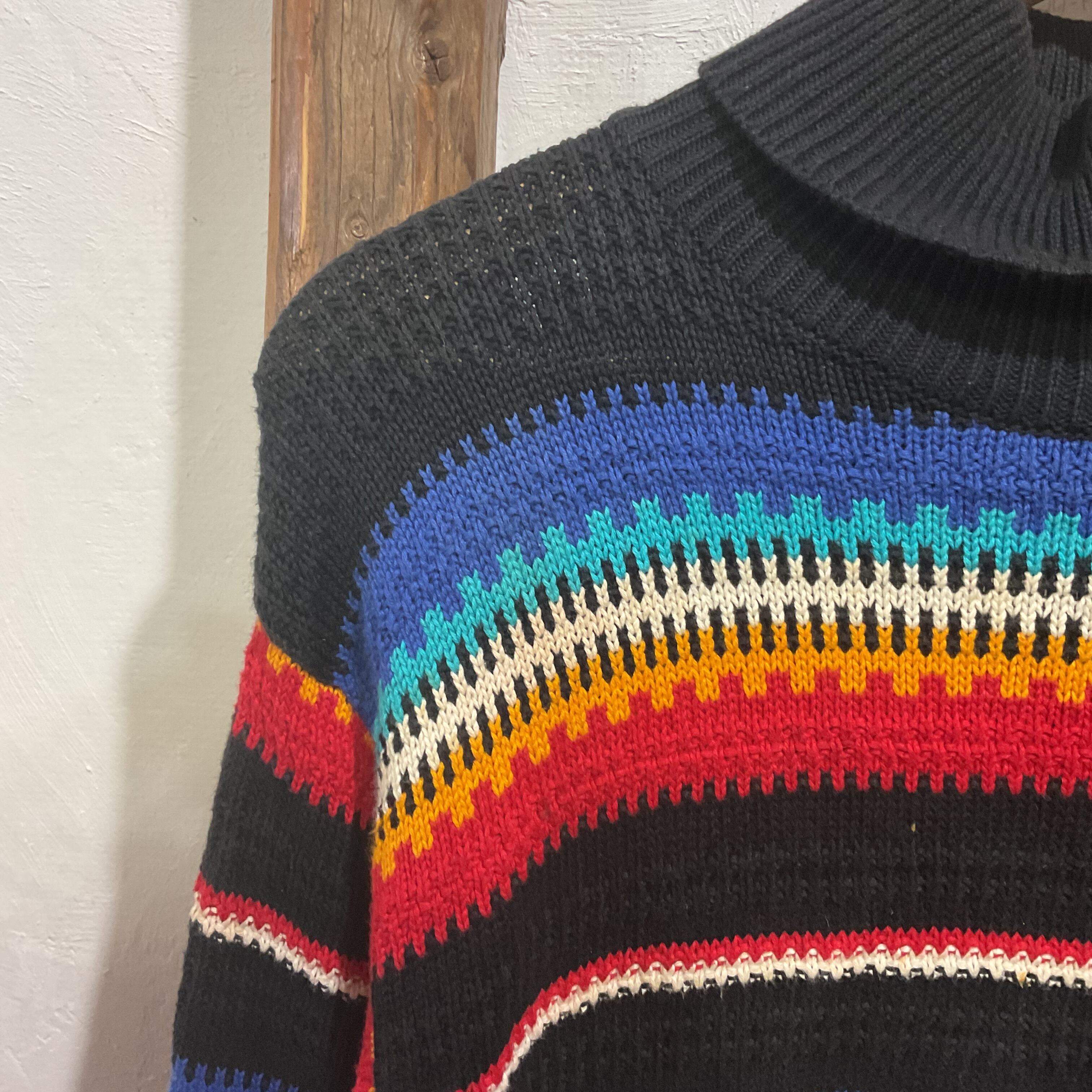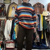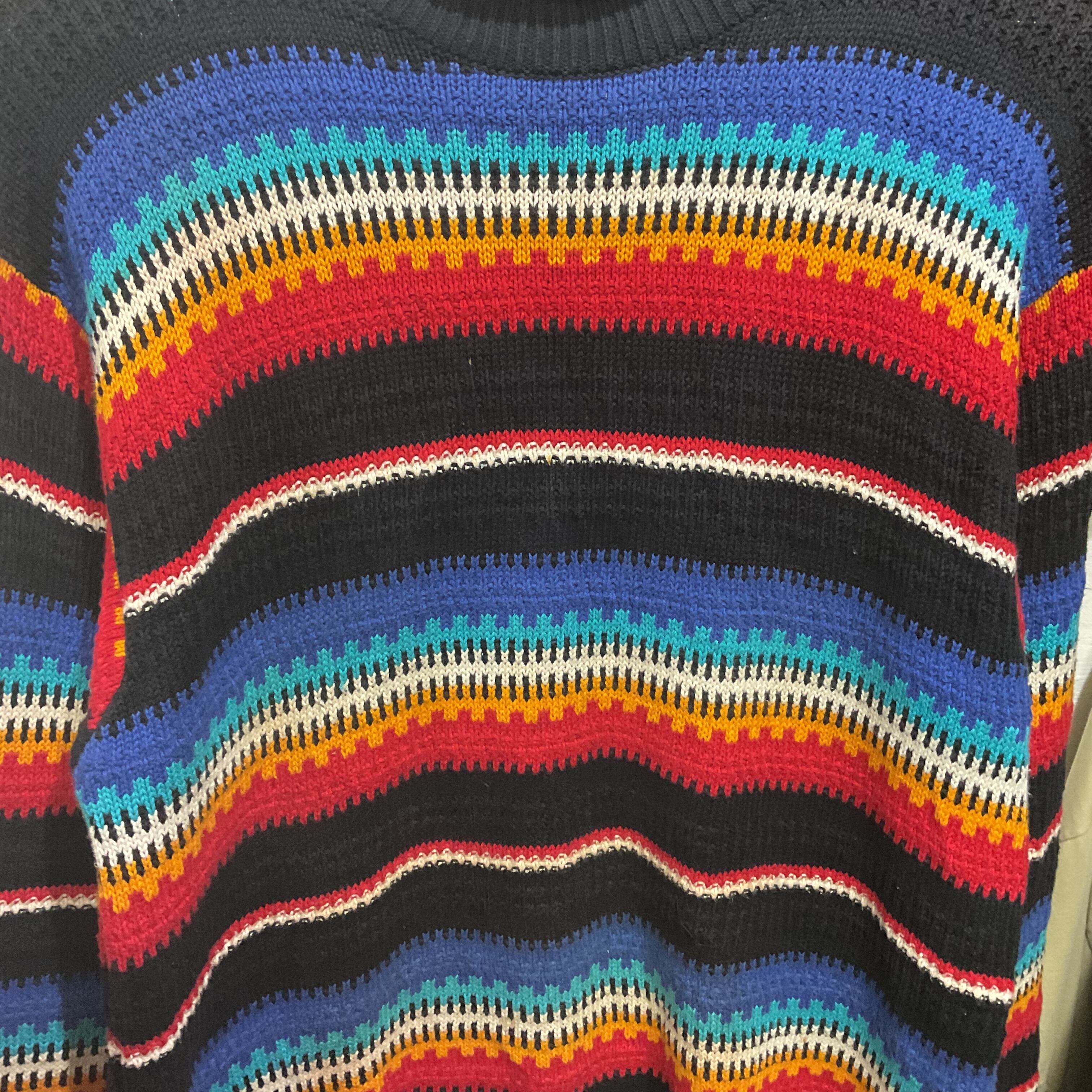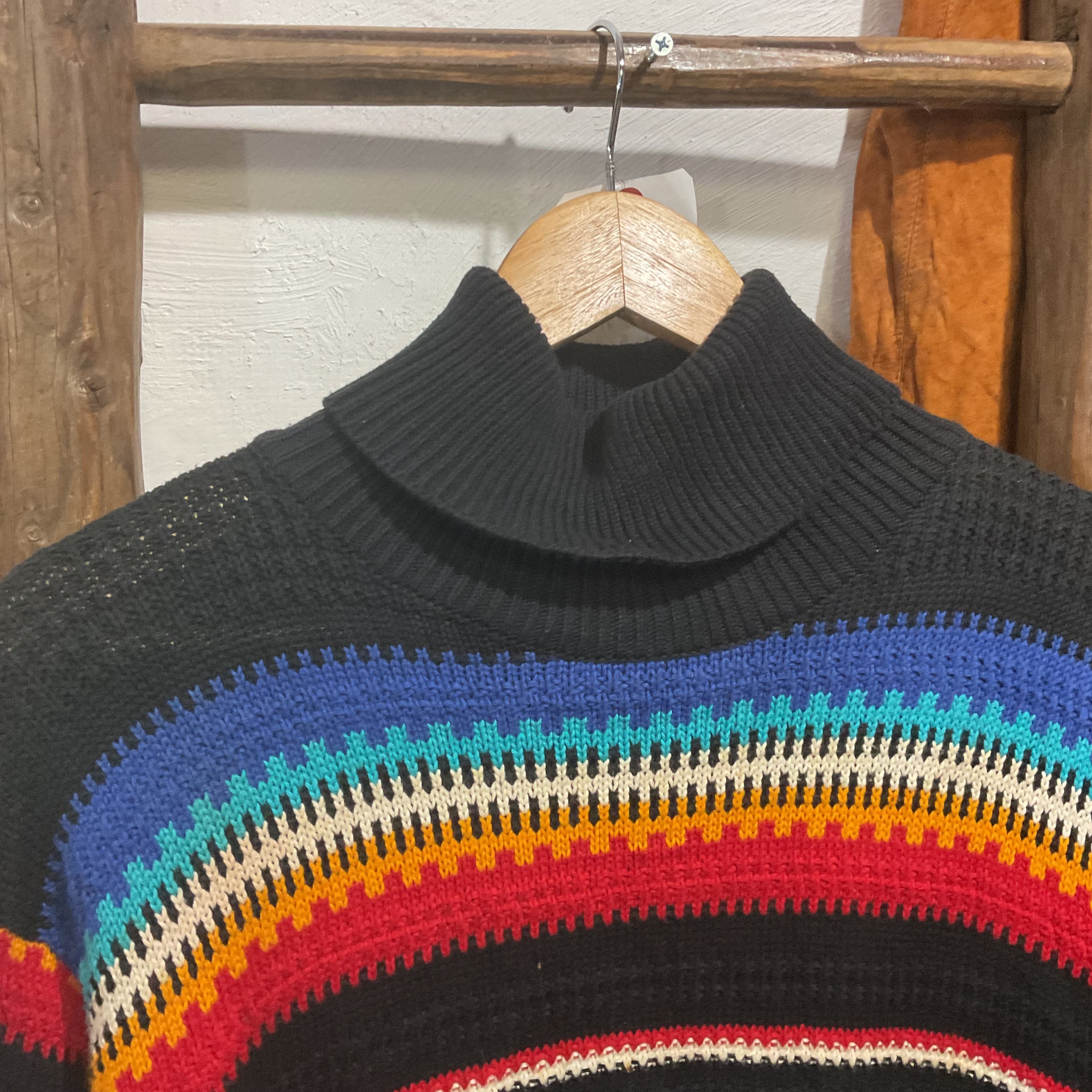 ブラックをベースに、ブルー〜ターコイズ、ホワイト、イエロー、レッドが波打つように入ったマルチボーダーのモックネックニット。配色は派手なのに、ベースが黒だから落ち着きがあって、1枚で主役になりつつ合わせやすいのが強み。