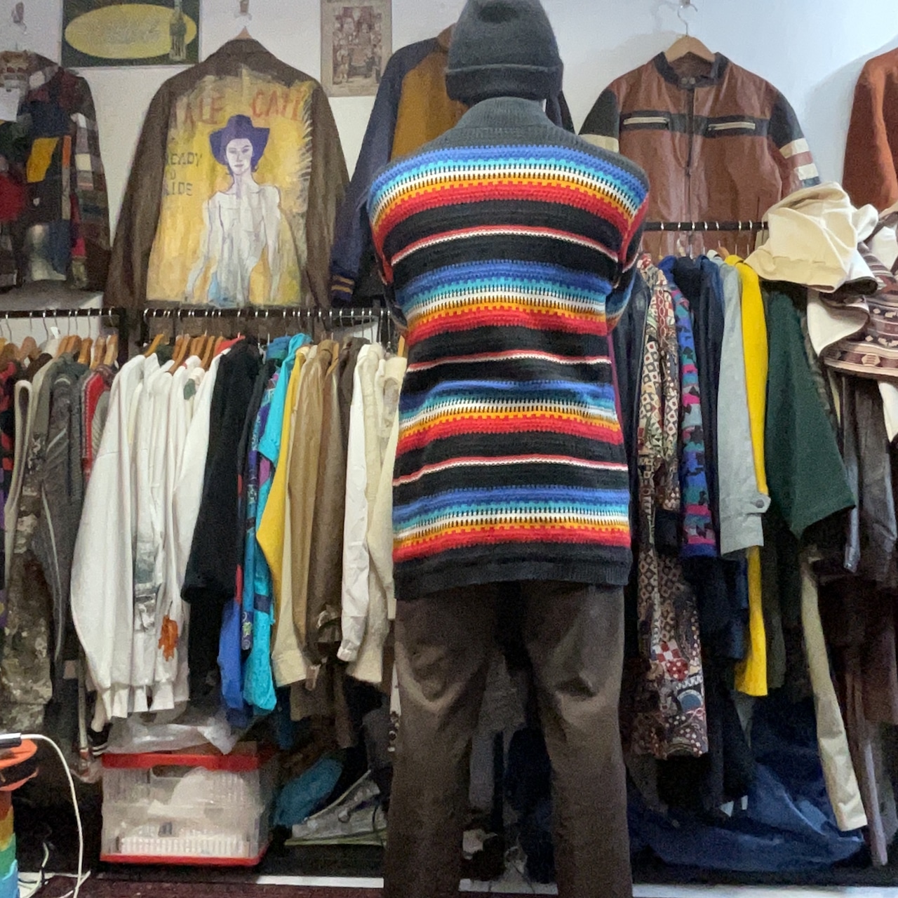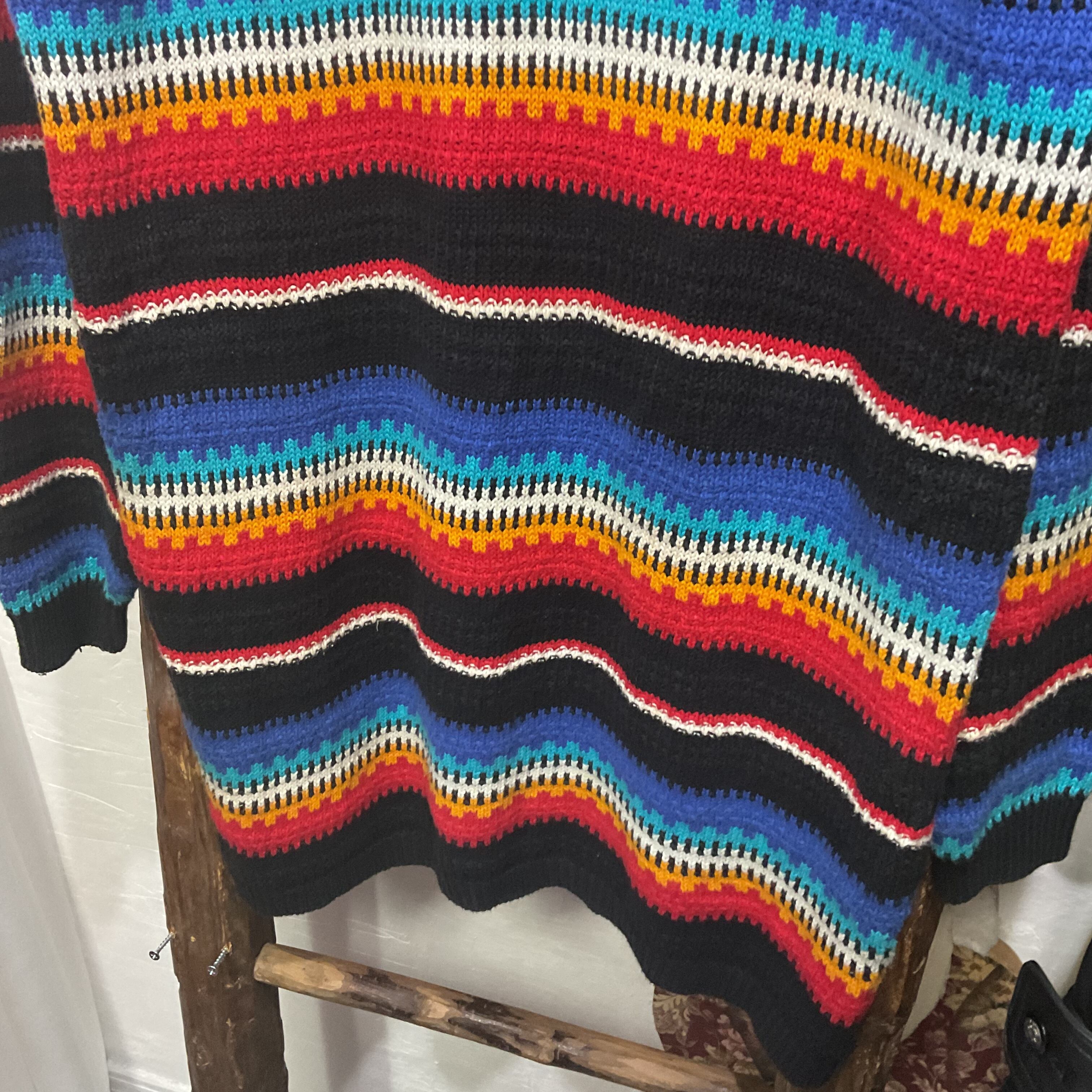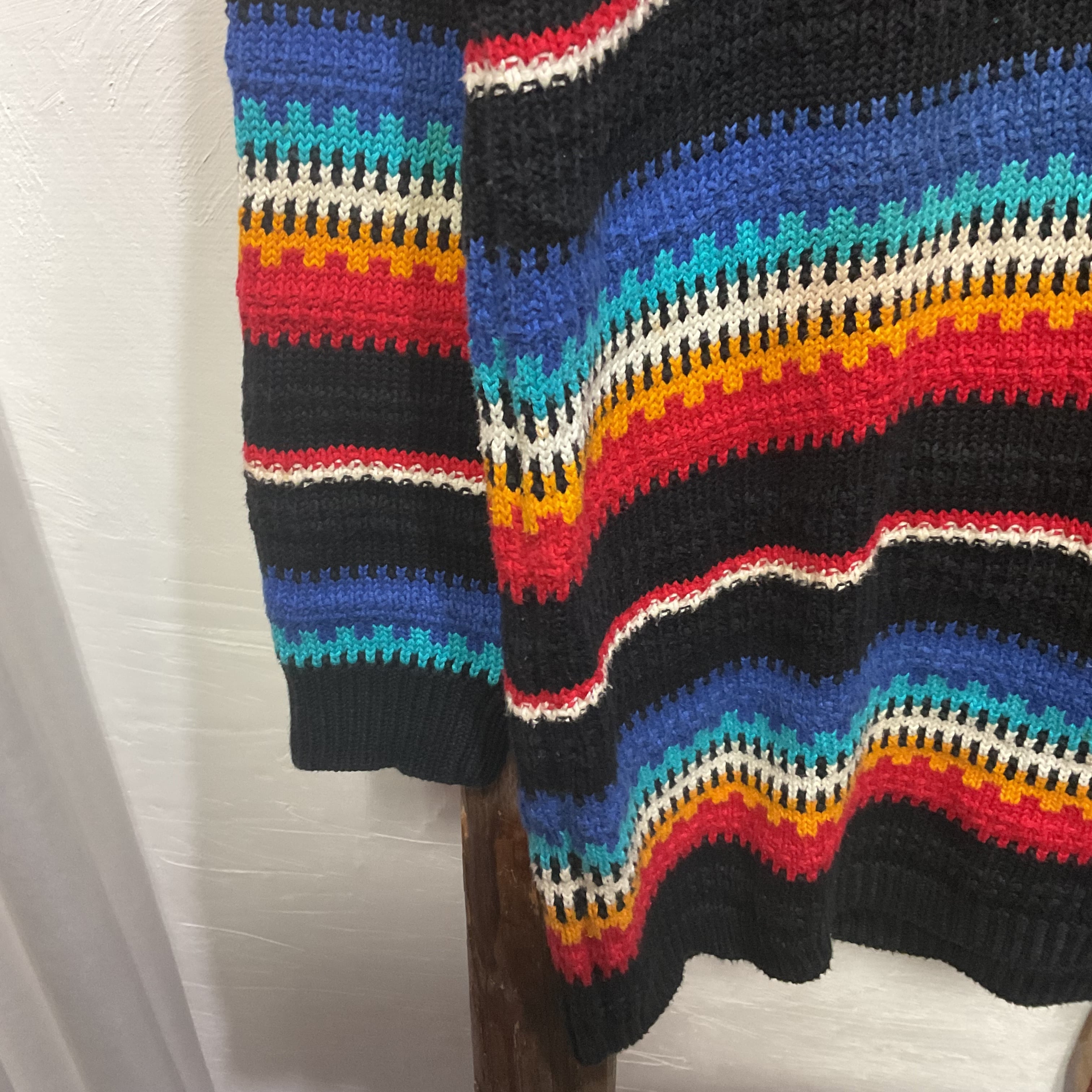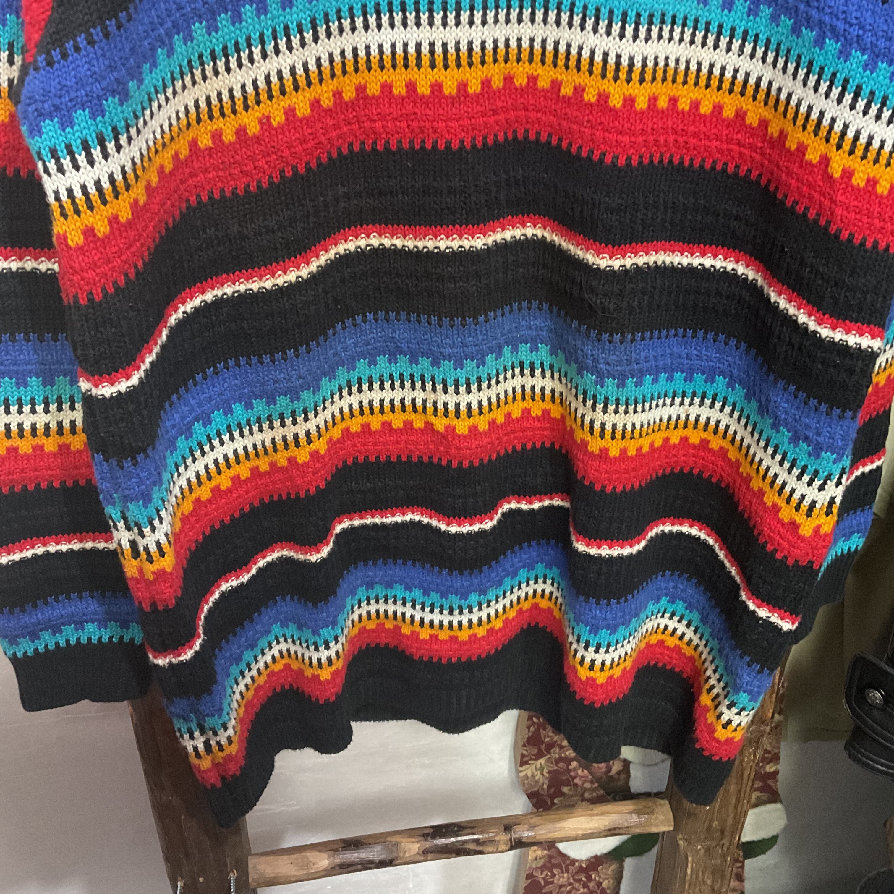 ブラックをベースに、ブルー〜ターコイズ、ホワイト、イエロー、レッドが波打つように入ったマルチボーダーのモックネックニット。配色は派手なのに、ベースが黒だから落ち着きがあって、1枚で主役になりつつ合わせやすいのが強み。