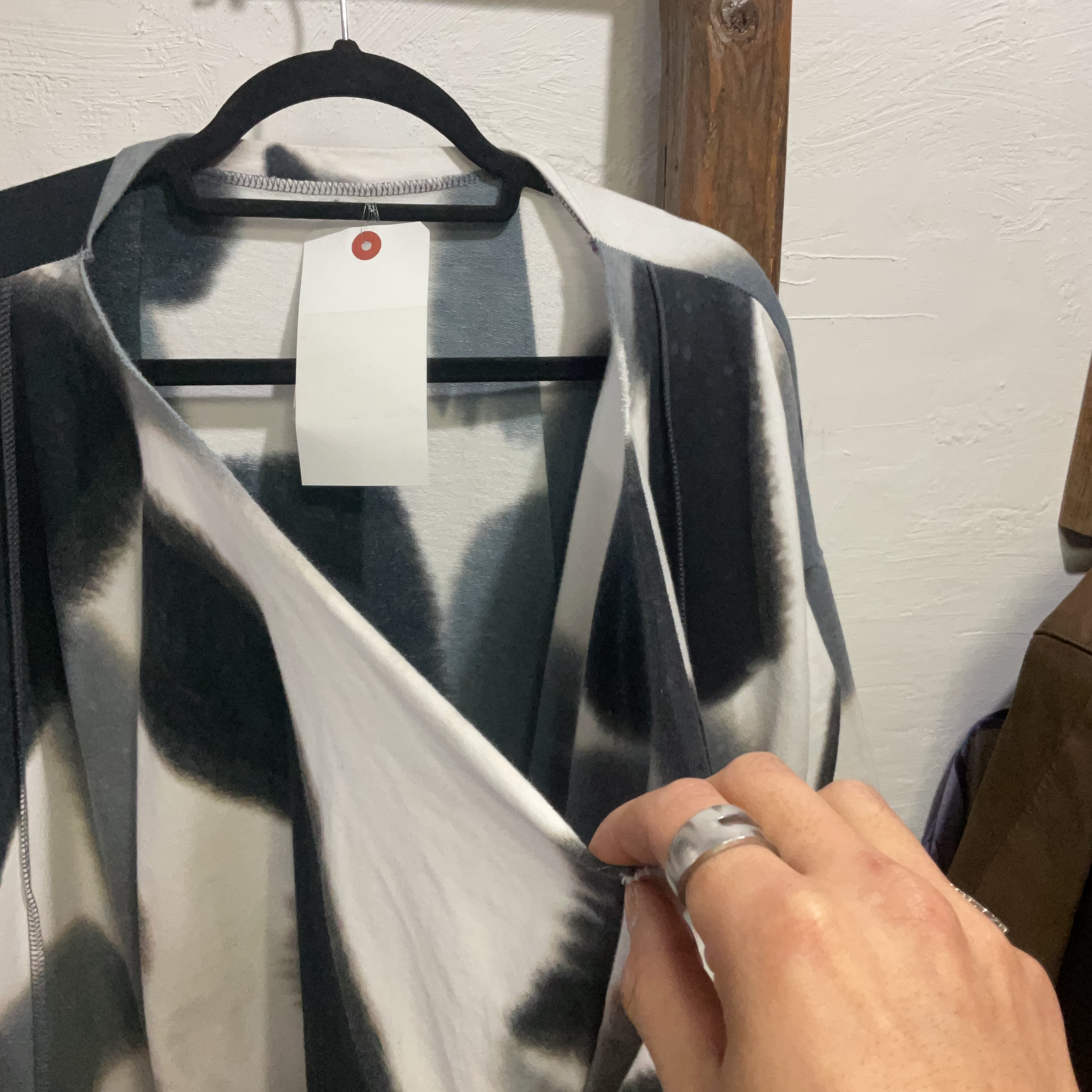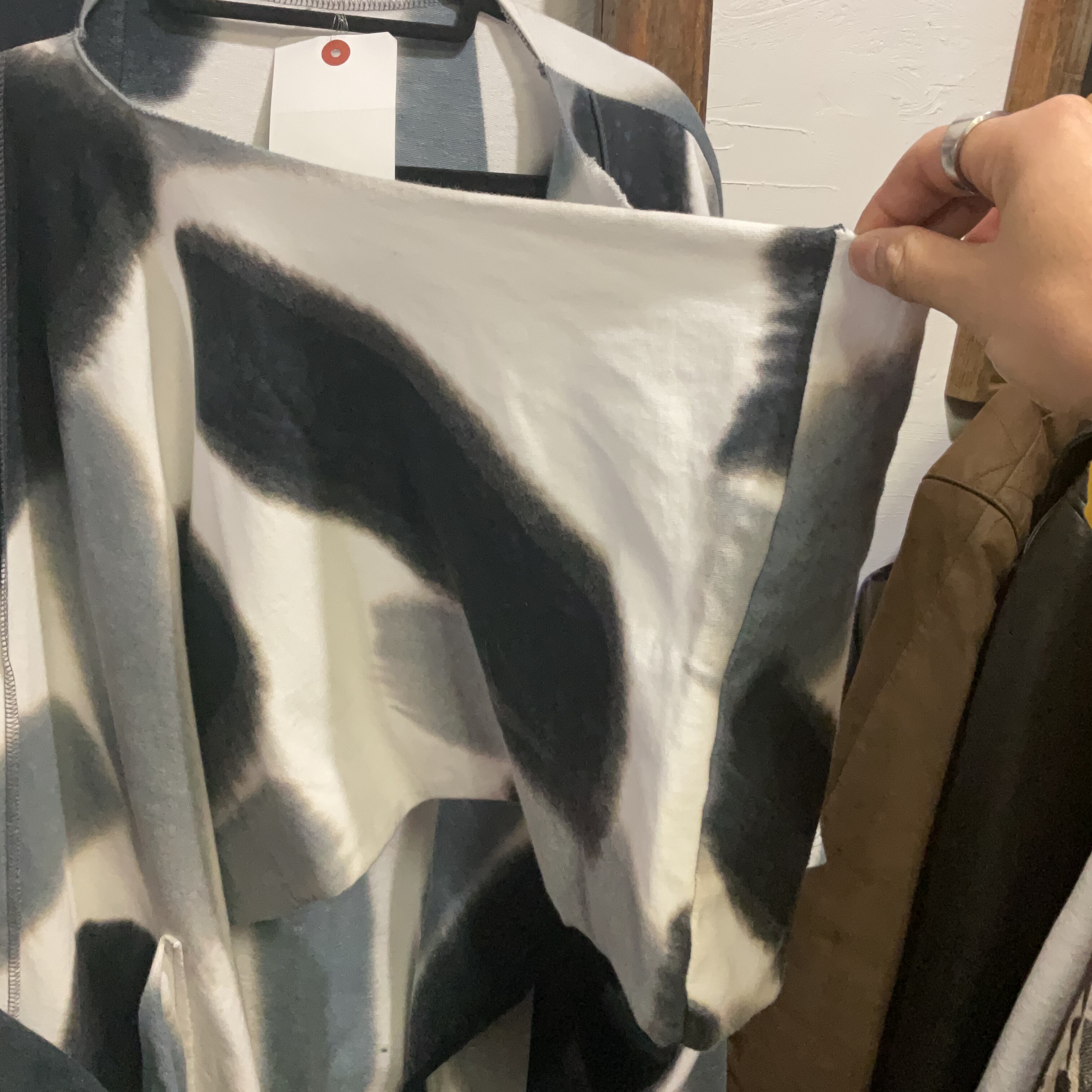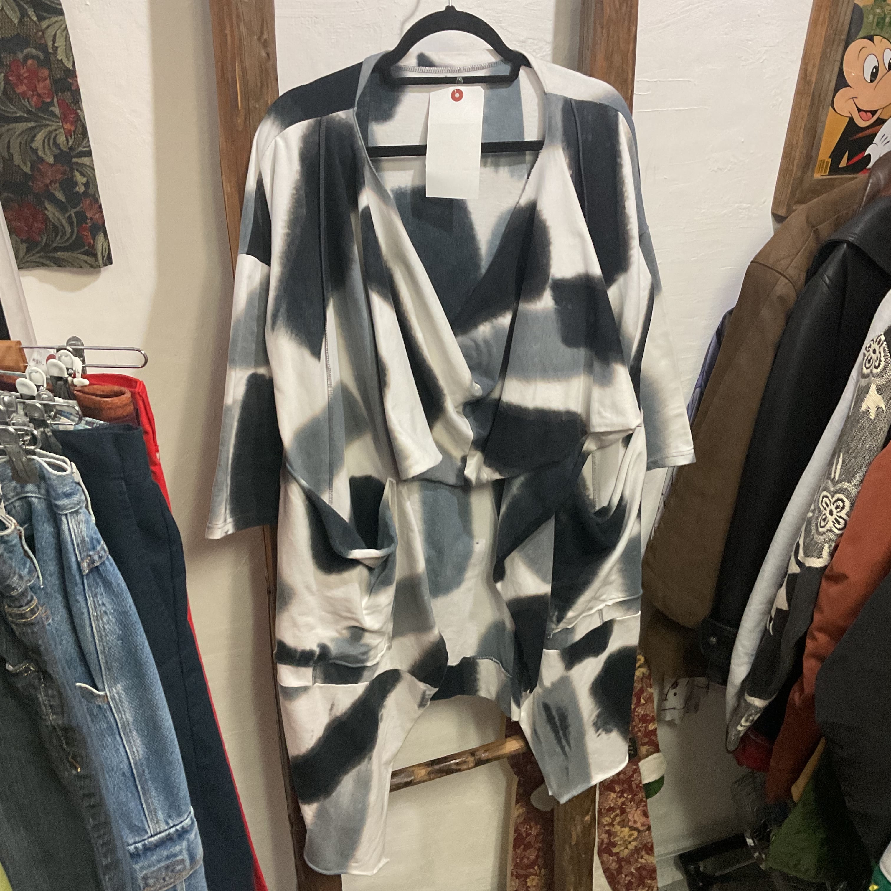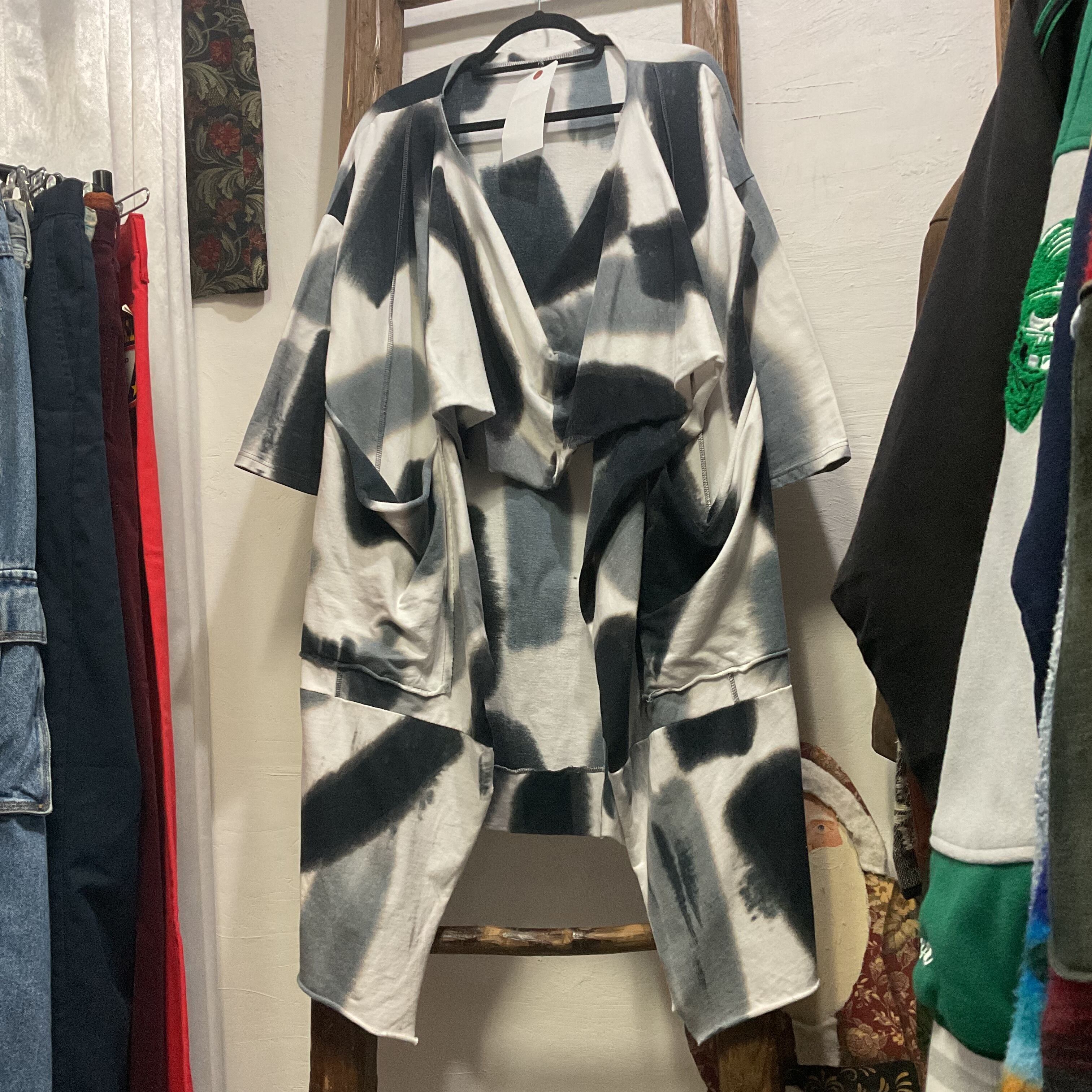 モノトーンの大胆なブラッシュ柄が目を惹く、デザイン性の高いオーバーシルエットカーディガン。