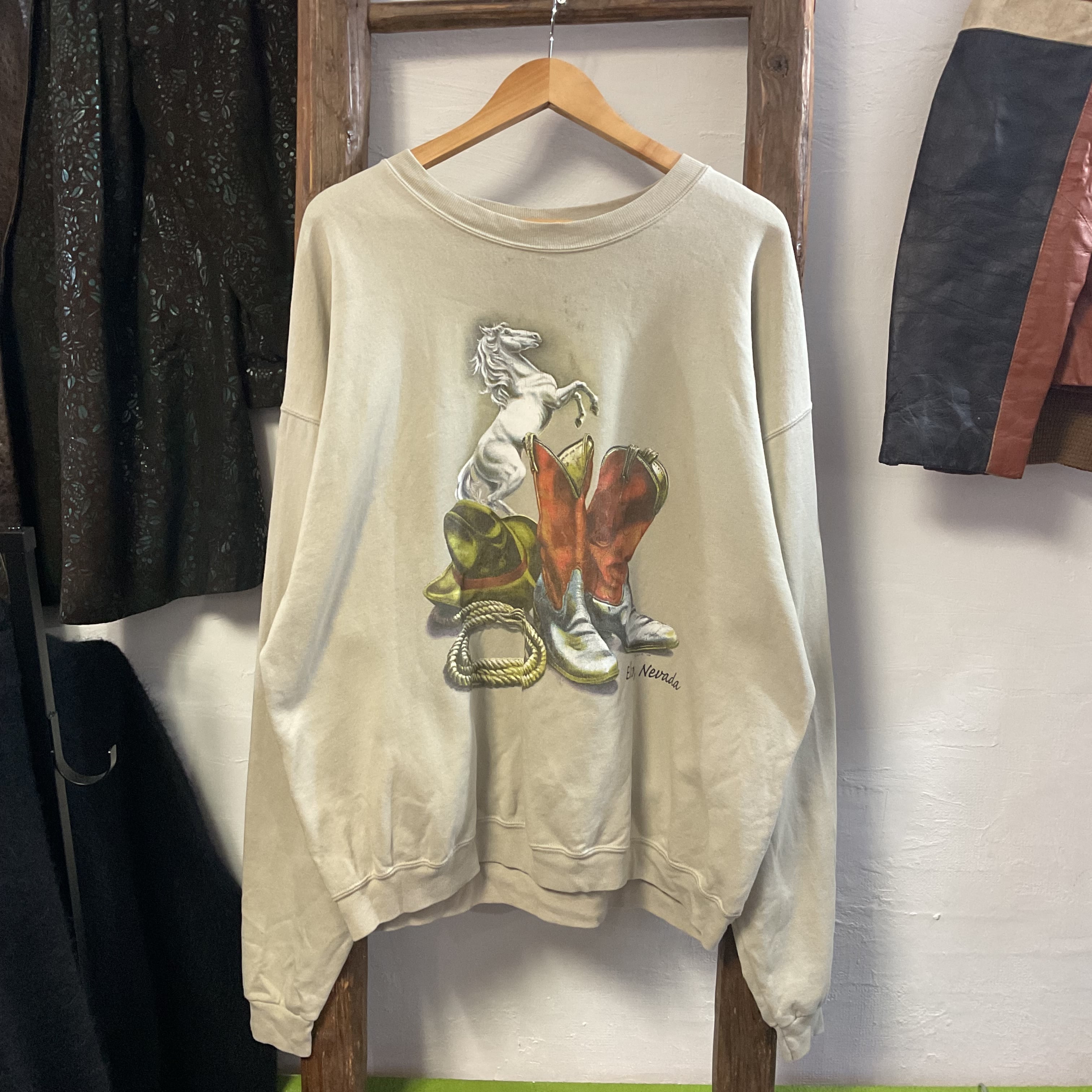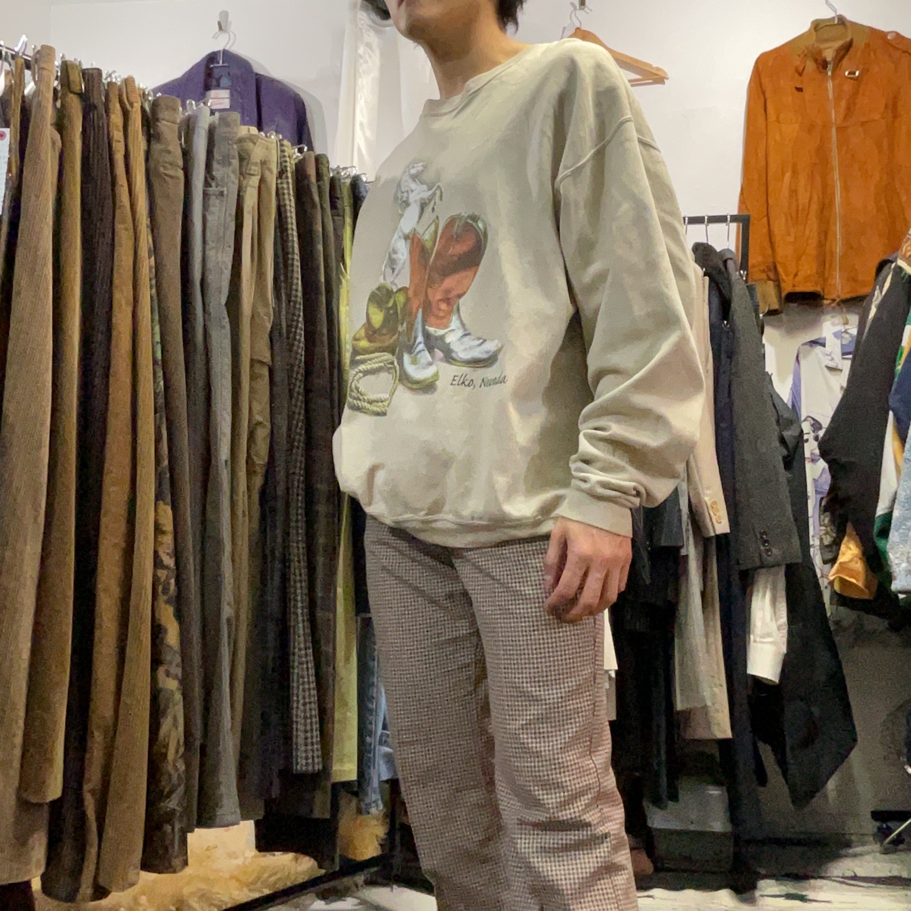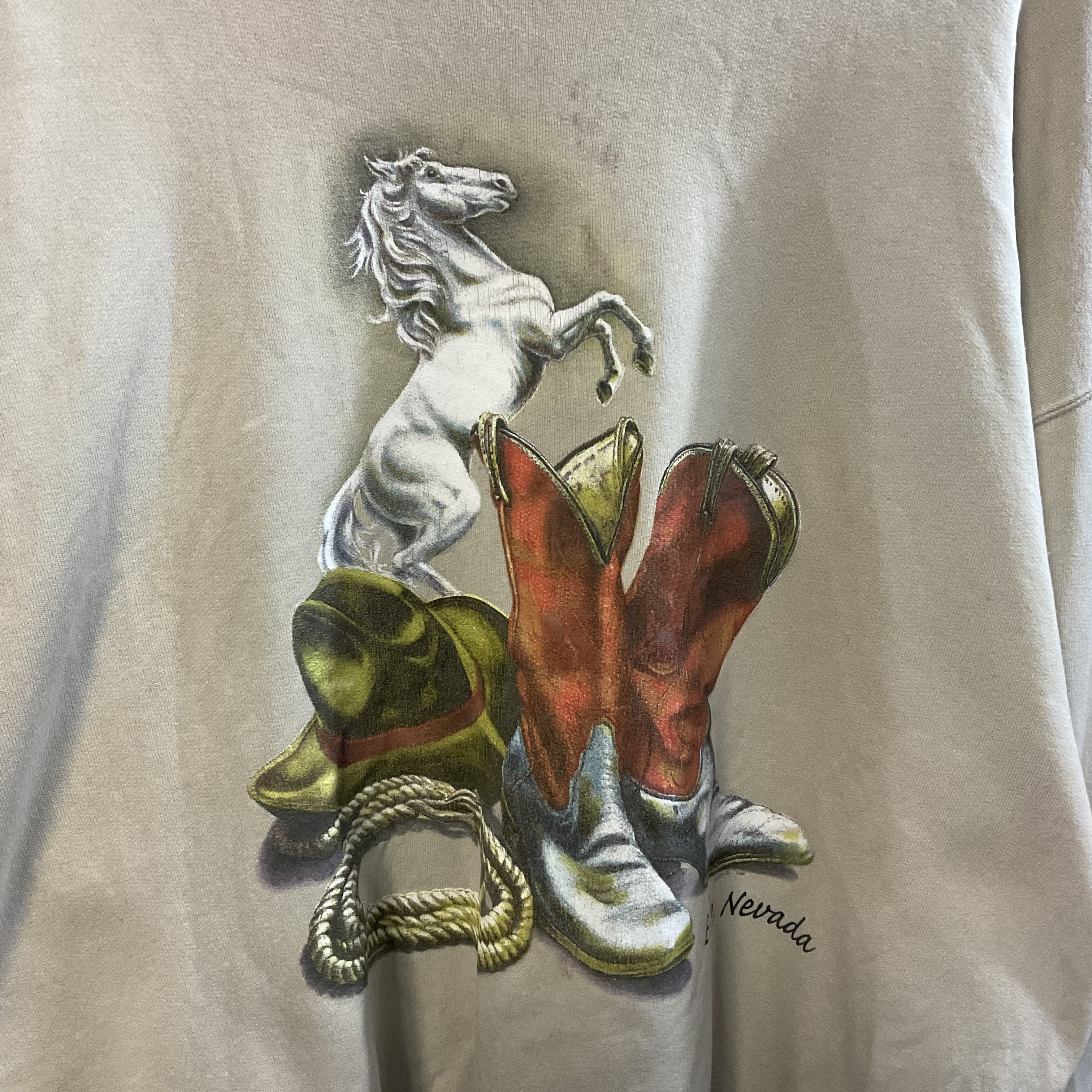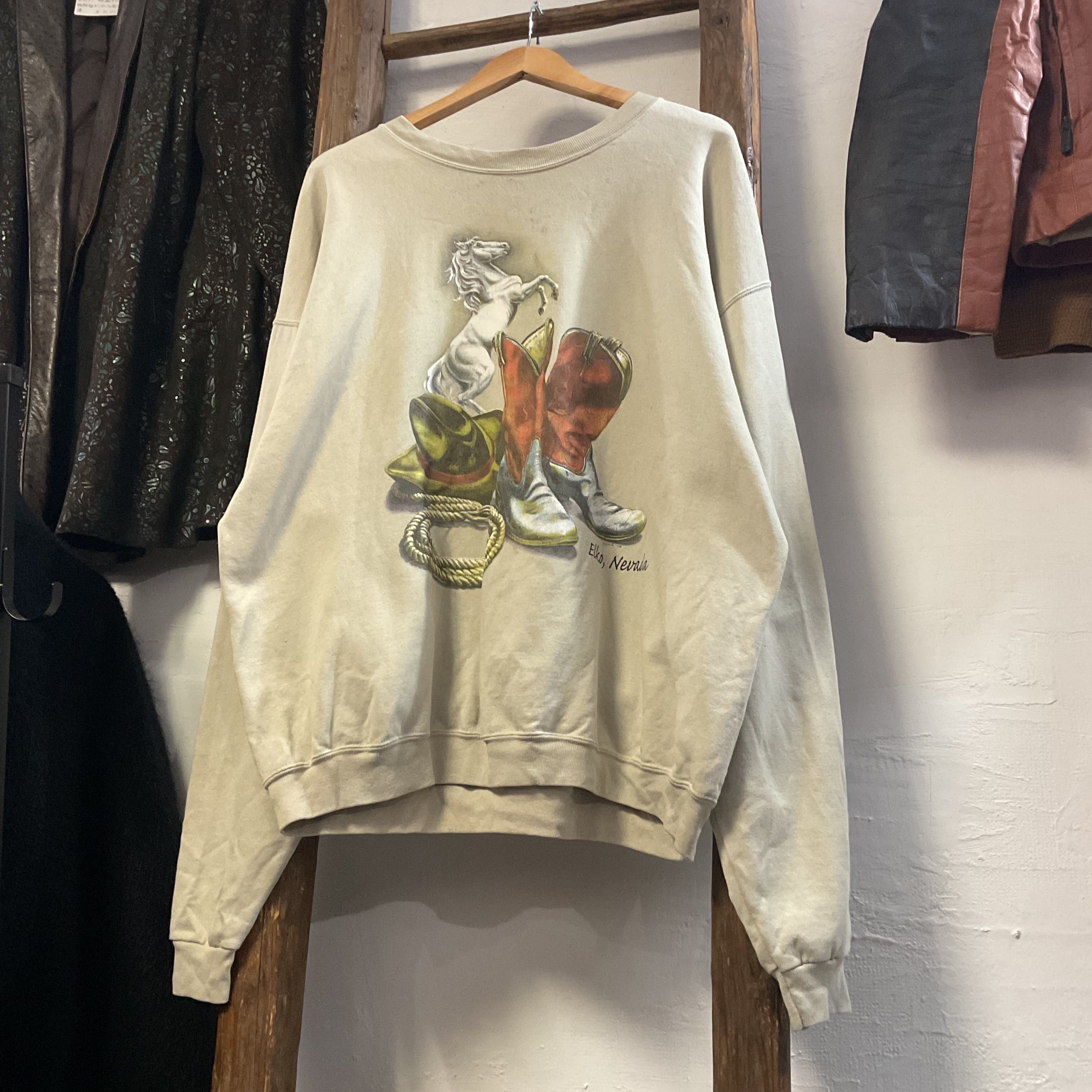 アメリカ製 プリントスウェット。フロントには、白馬・ブーツ・テンガロンハット・投げ縄を描いた、ウエスタンモチーフのイラストが大きく入り、足元に入る “Elko, Nevada” の文字が雰囲気を引き締めており、ご当地・旅物のような空気感も魅力。