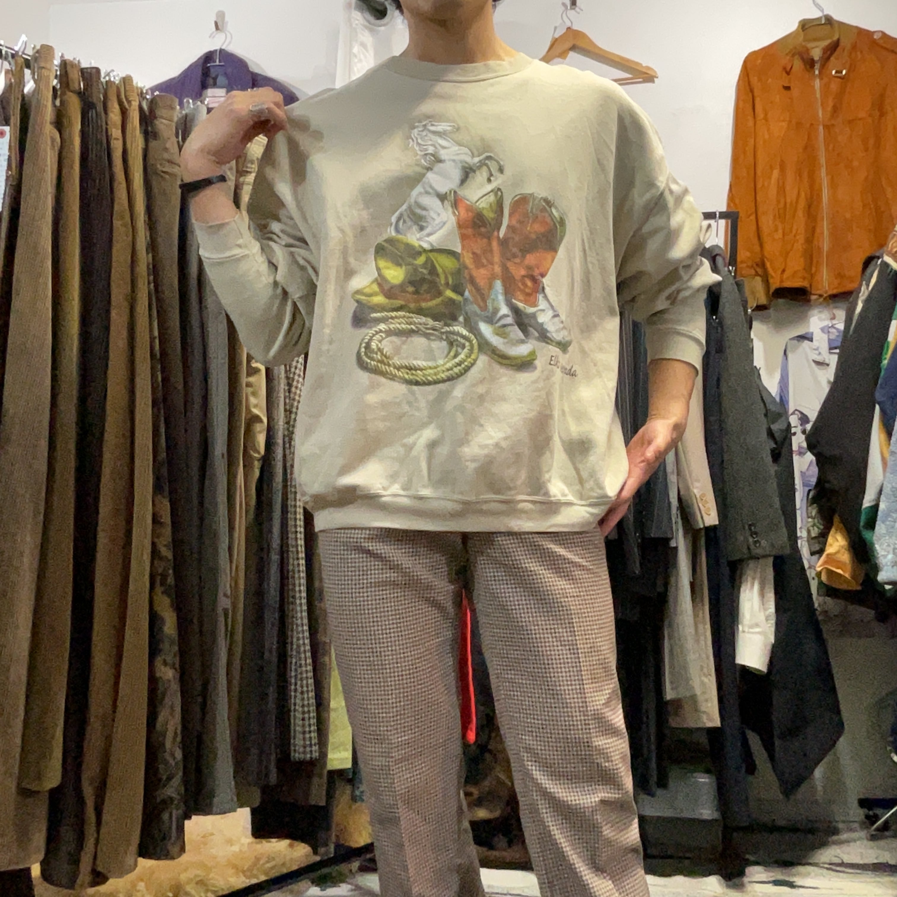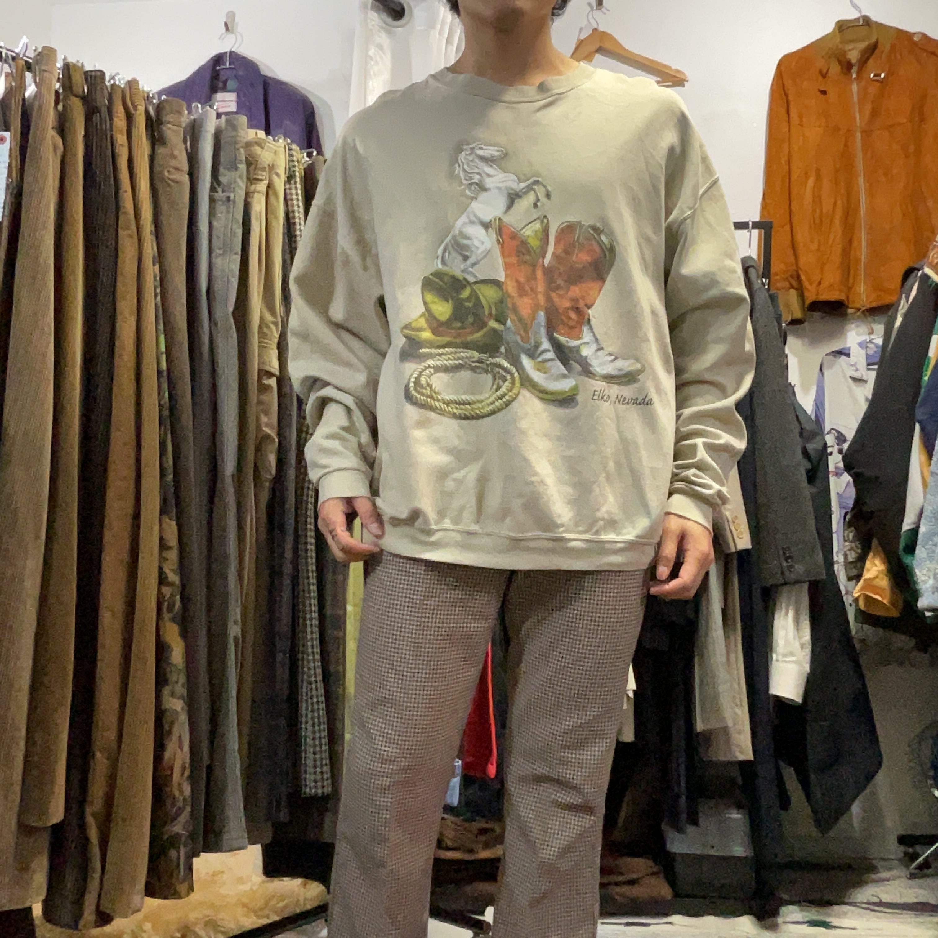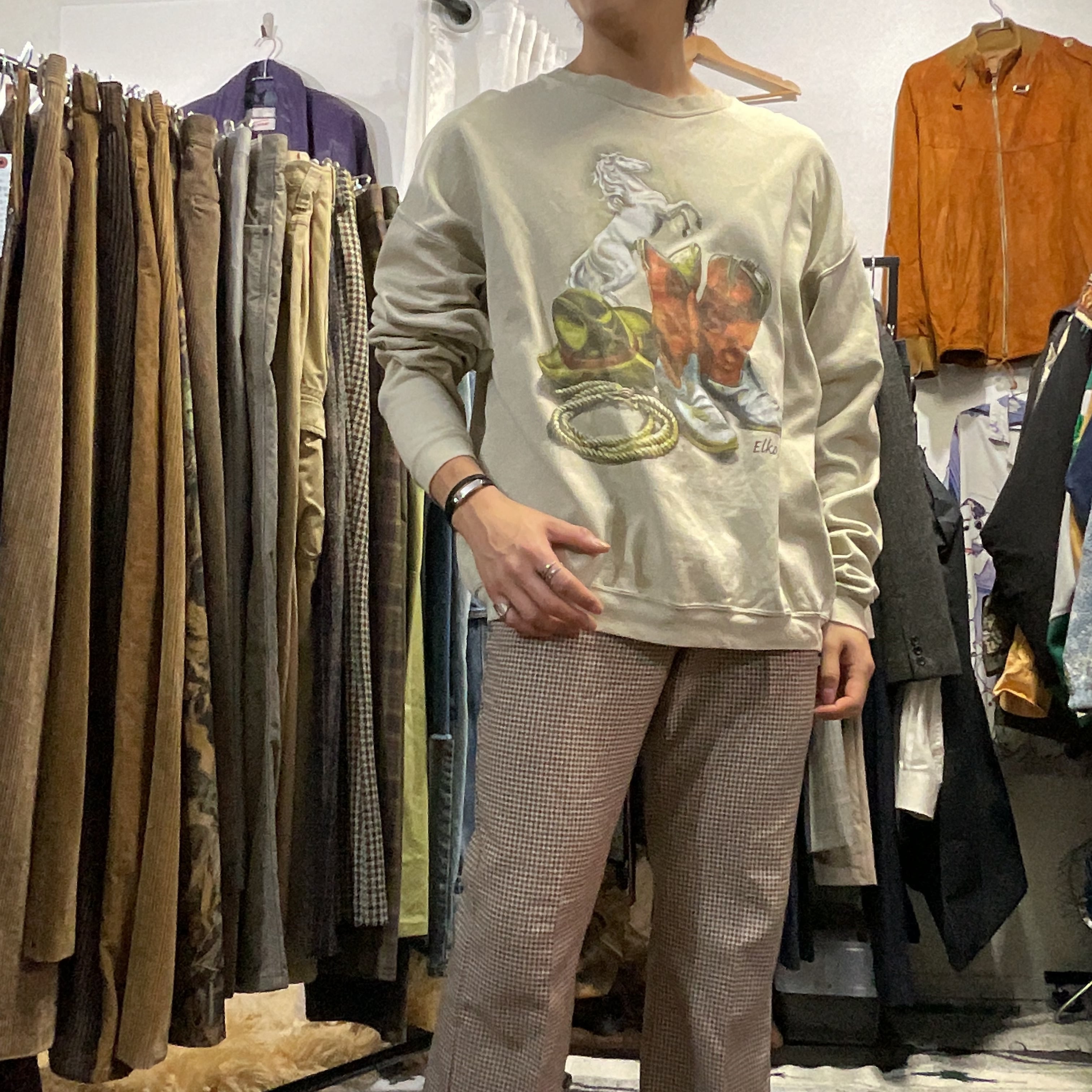 アメリカ製 プリントスウェット。フロントには、白馬・ブーツ・テンガロンハット・投げ縄を描いた、ウエスタンモチーフのイラストが大きく入り、足元に入る “Elko, Nevada” の文字が雰囲気を引き締めており、ご当地・旅物のような空気感も魅力。