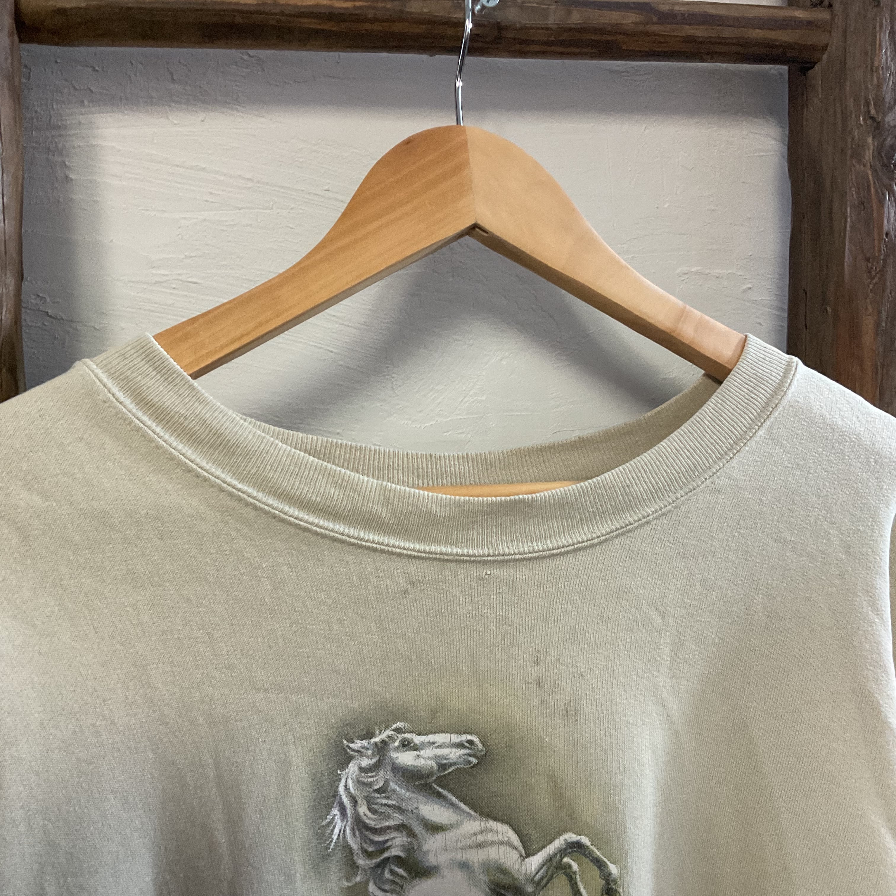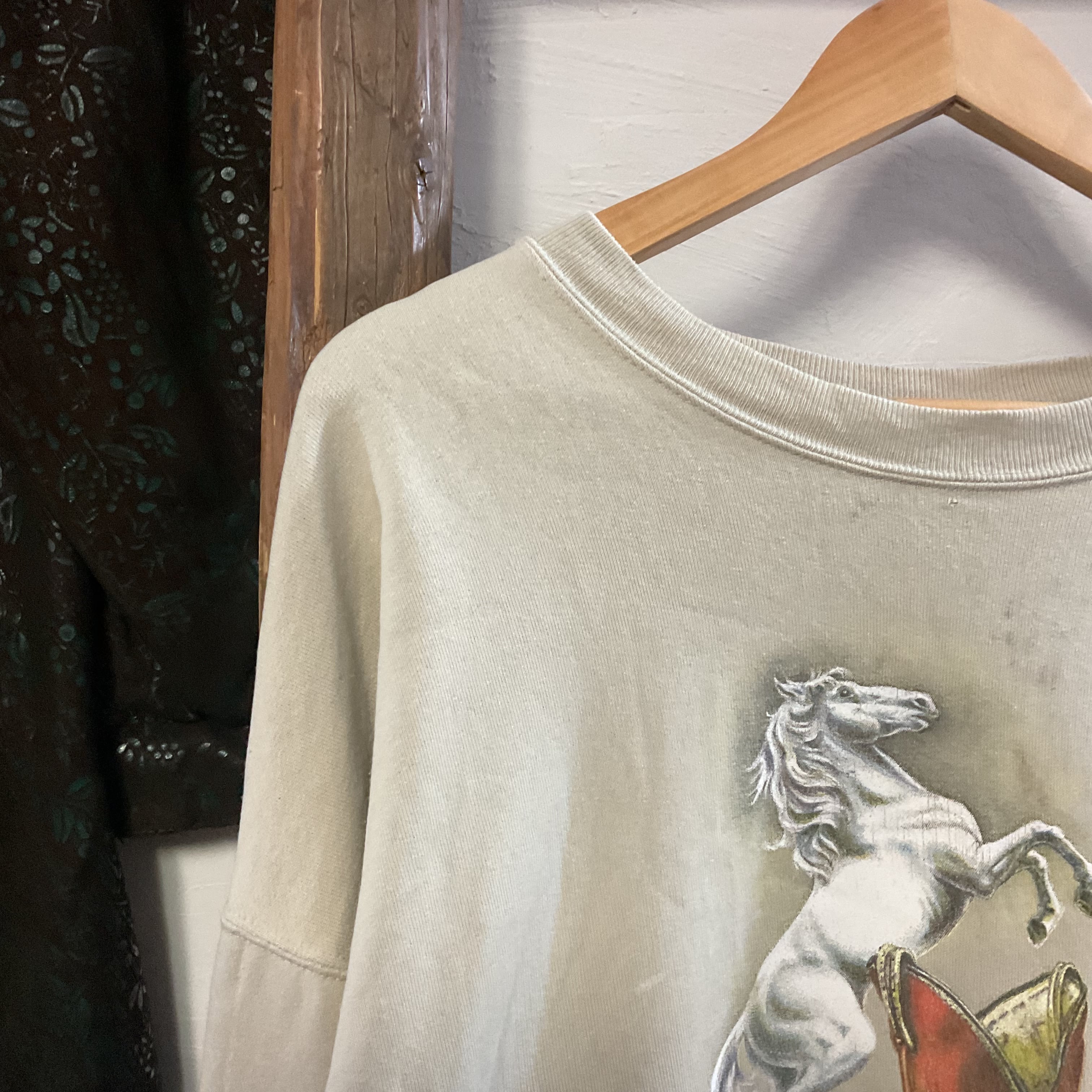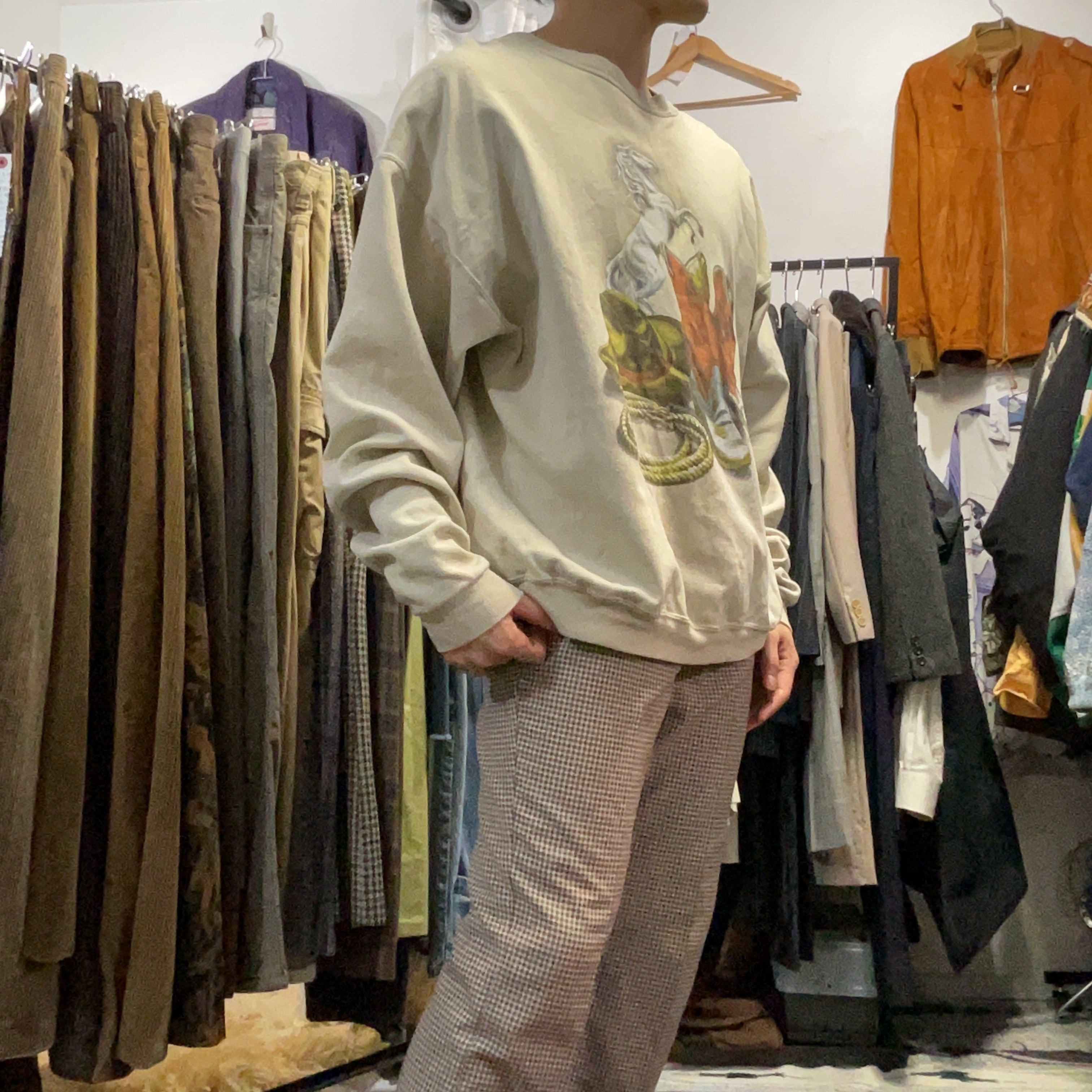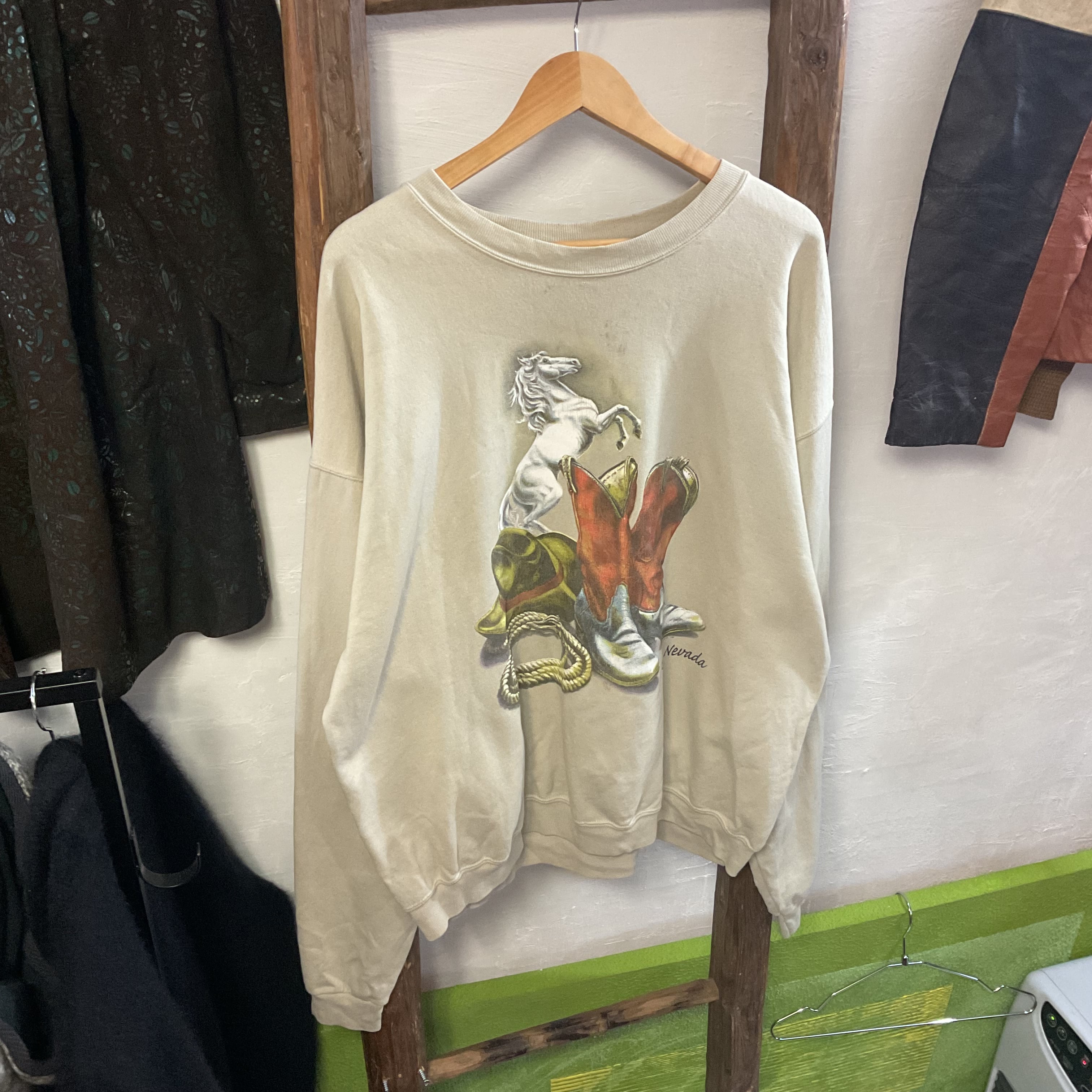 アメリカ製 プリントスウェット。フロントには、白馬・ブーツ・テンガロンハット・投げ縄を描いた、ウエスタンモチーフのイラストが大きく入り、足元に入る “Elko, Nevada” の文字が雰囲気を引き締めており、ご当地・旅物のような空気感も魅力。