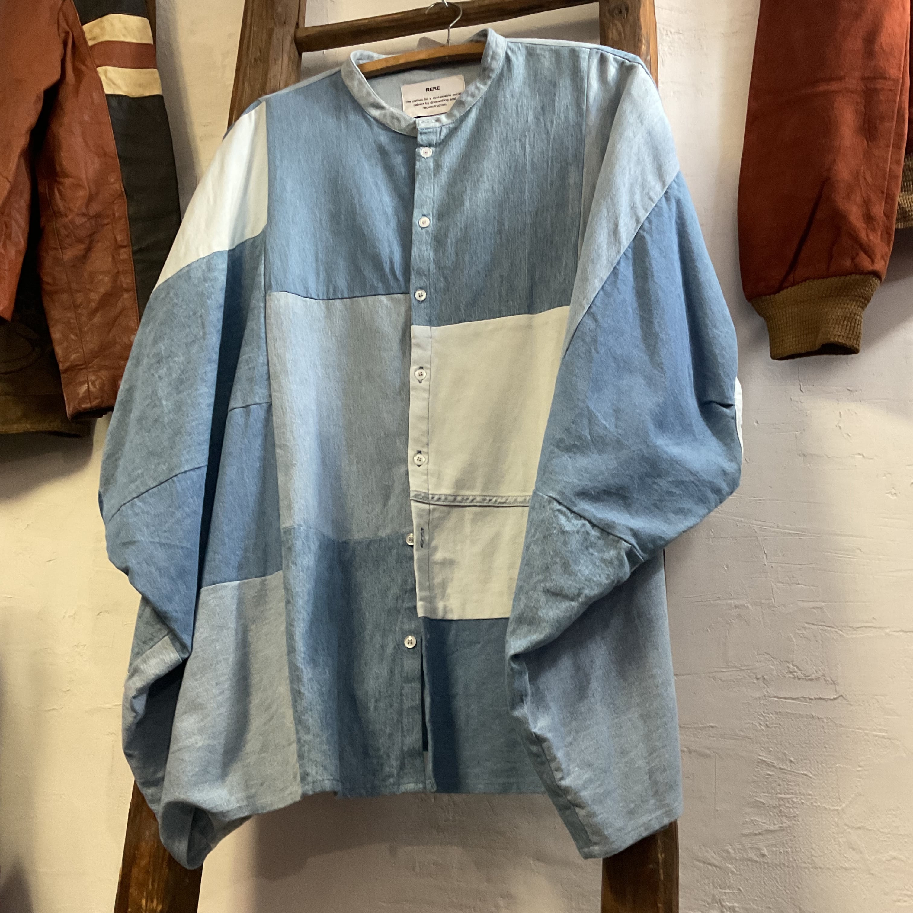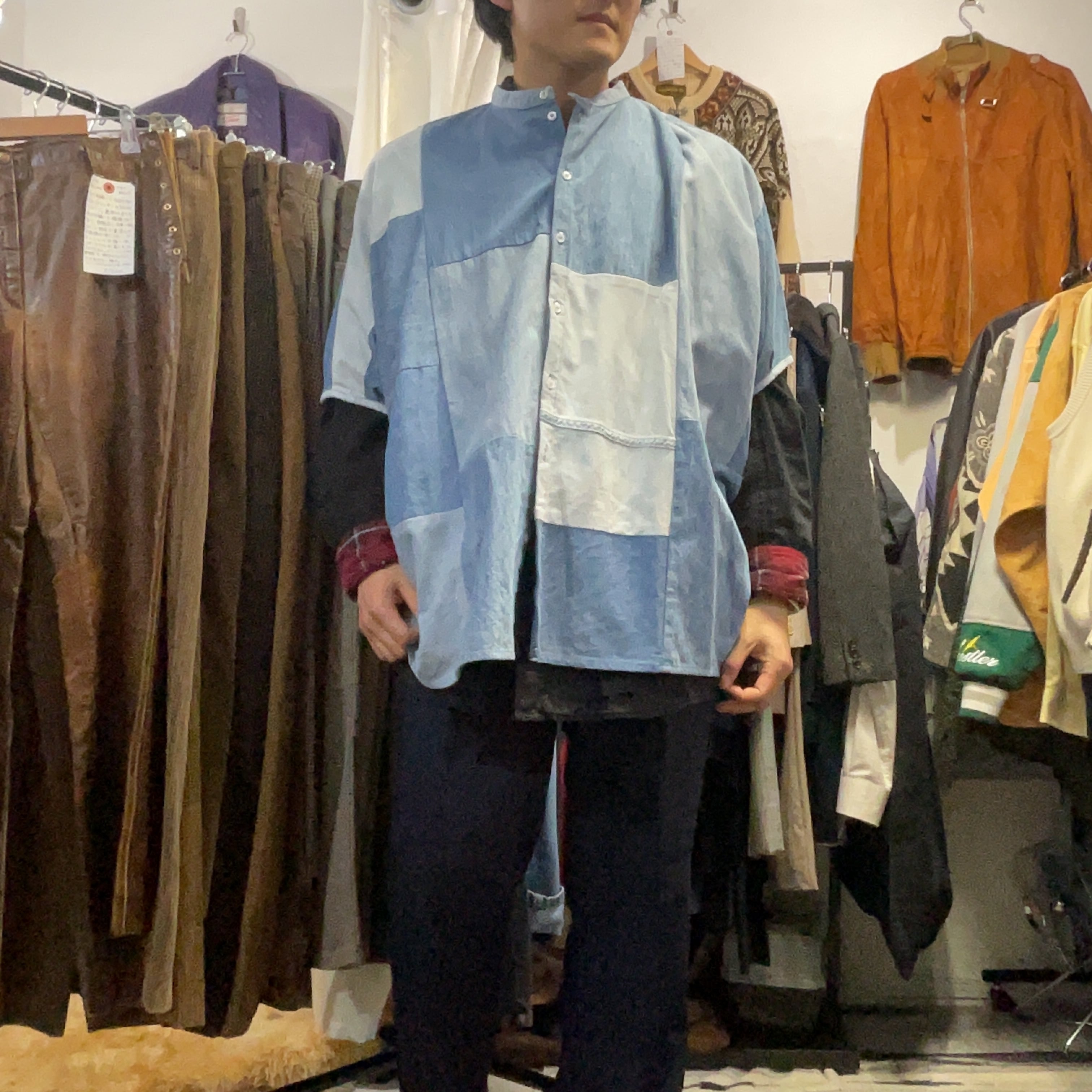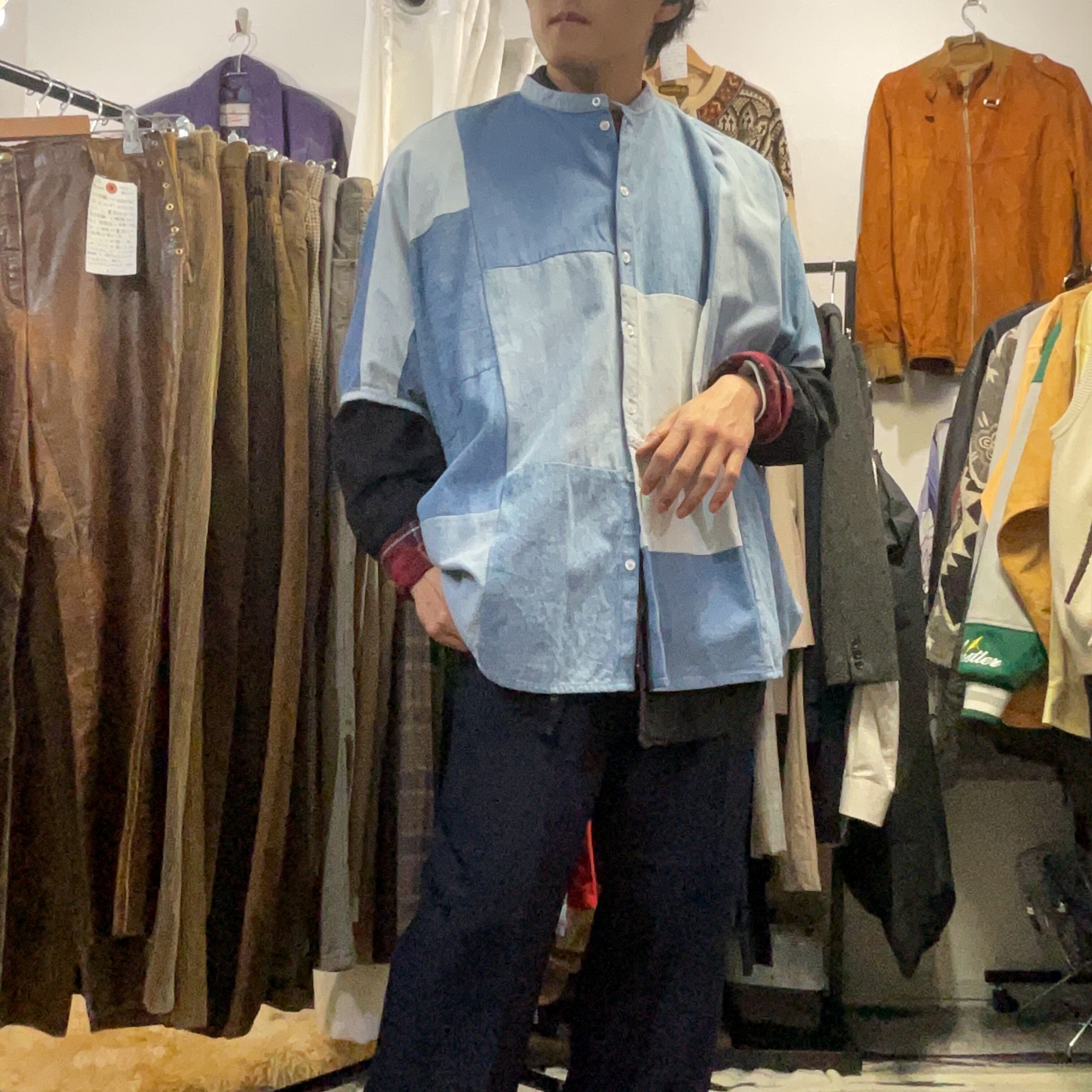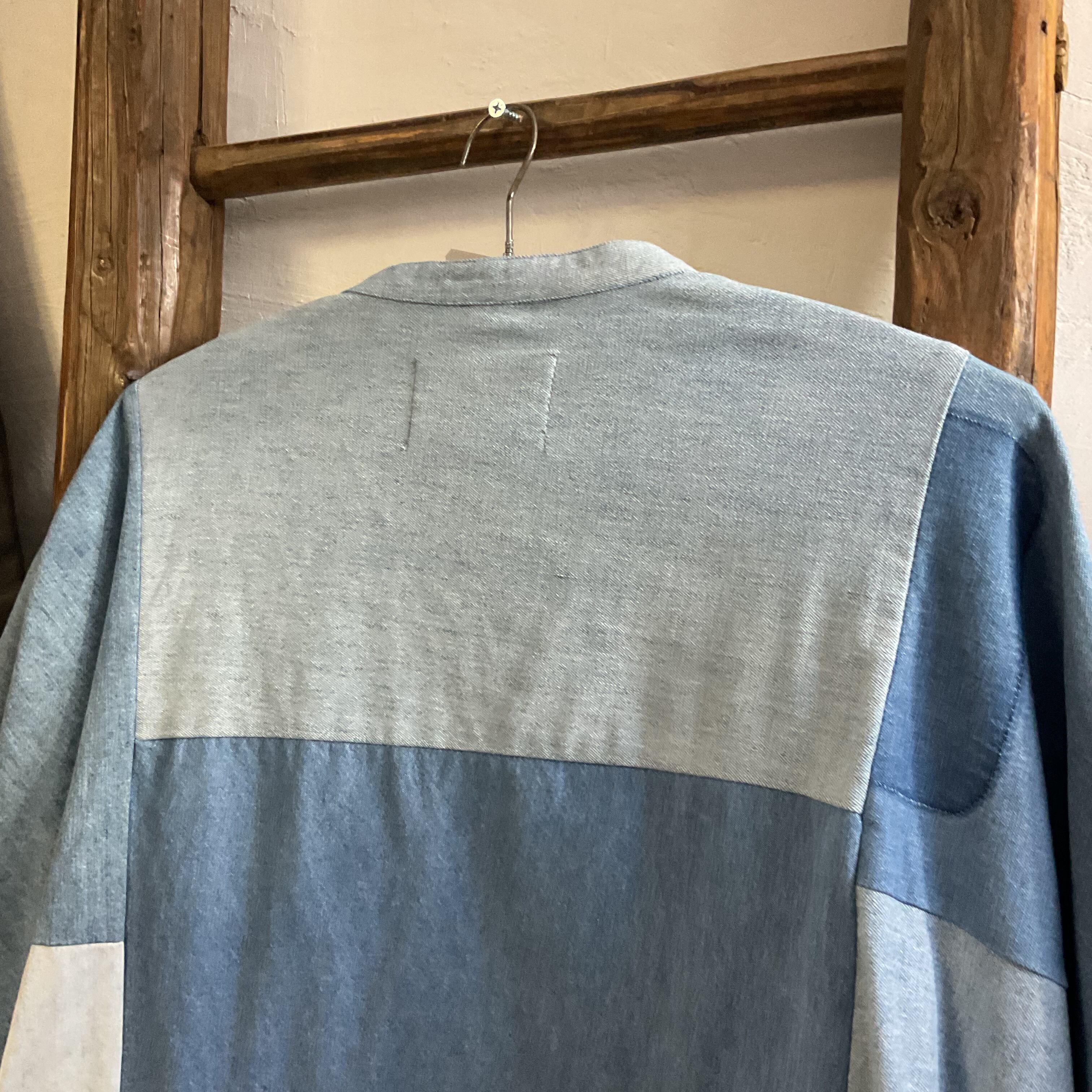 異なるトーンのデニム/シャンブレー生地をブロック状に組み合わせた、リメイクならではの表情が魅力の1着。首元はすっきりとしたバンドカラー仕様で、柄物ほど主張し過ぎず、無地には出せない奥行きがございます。
