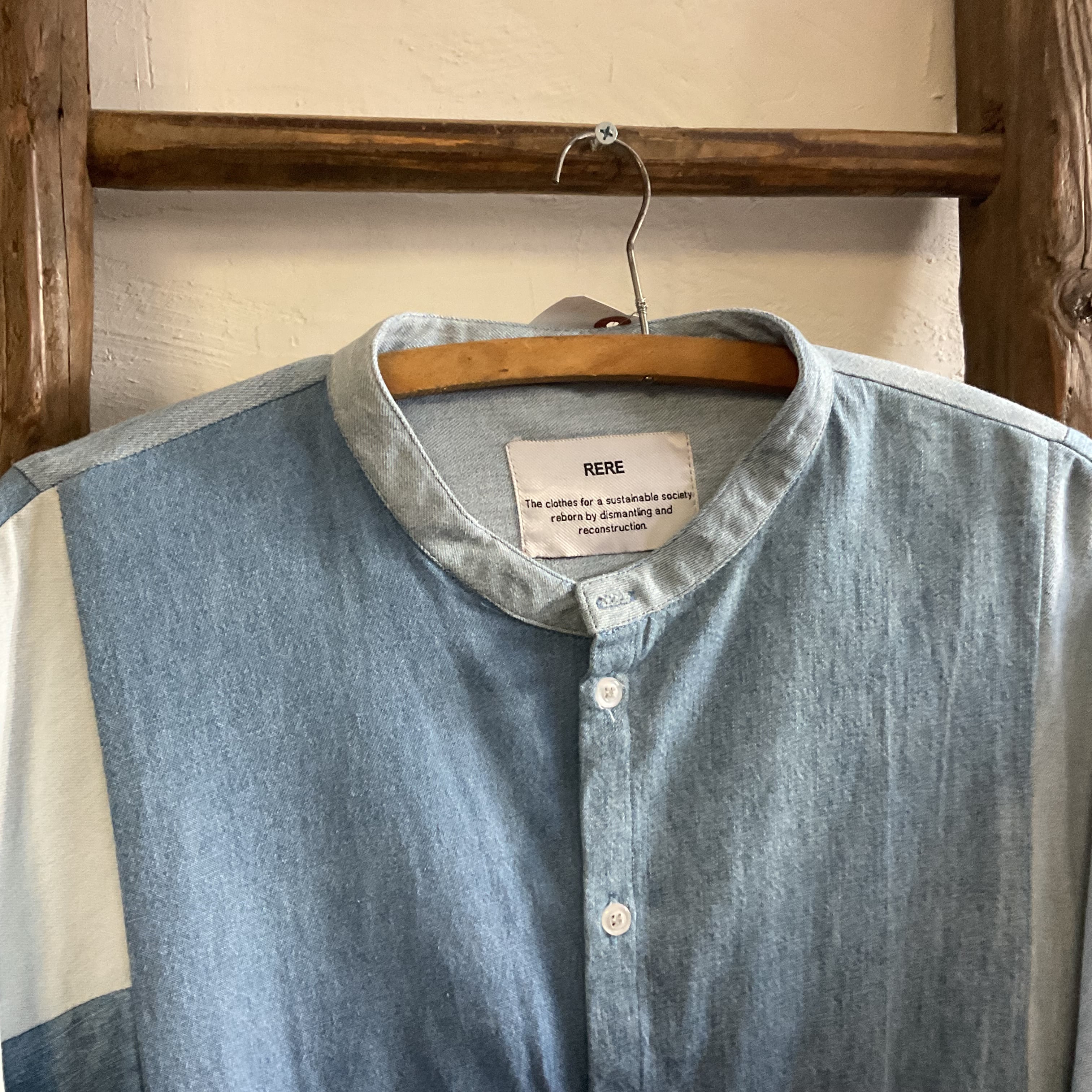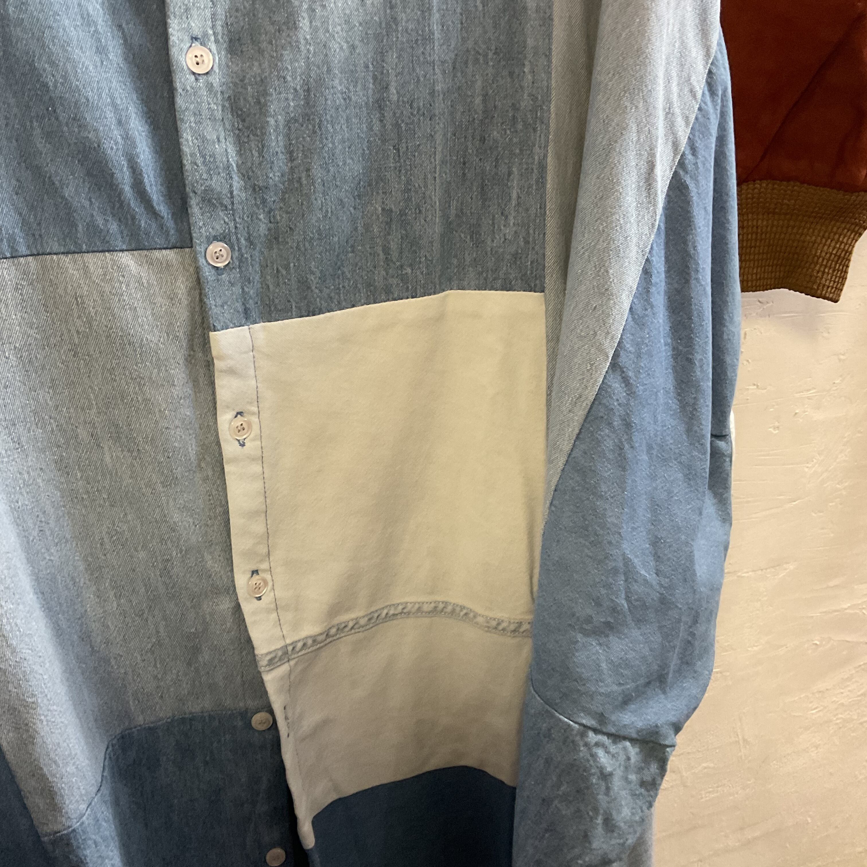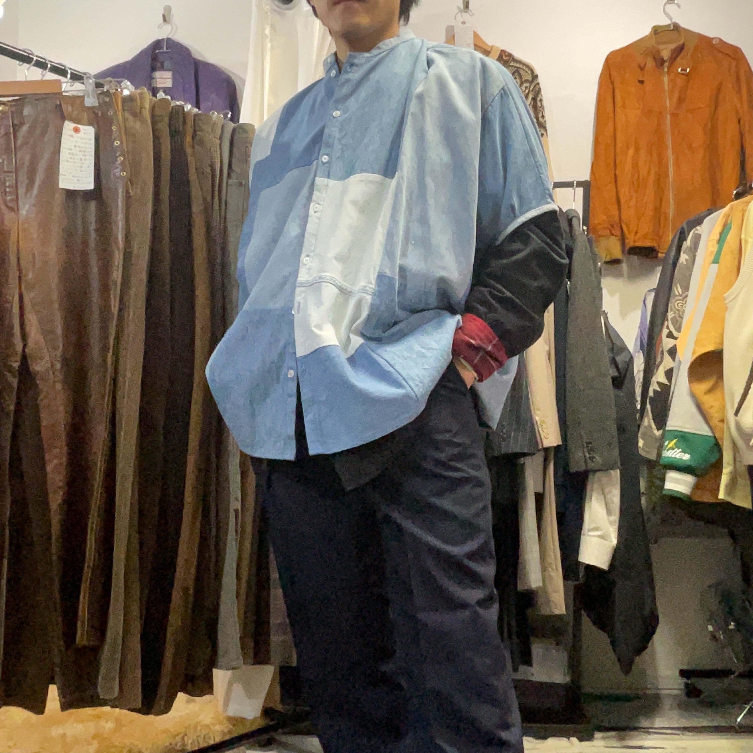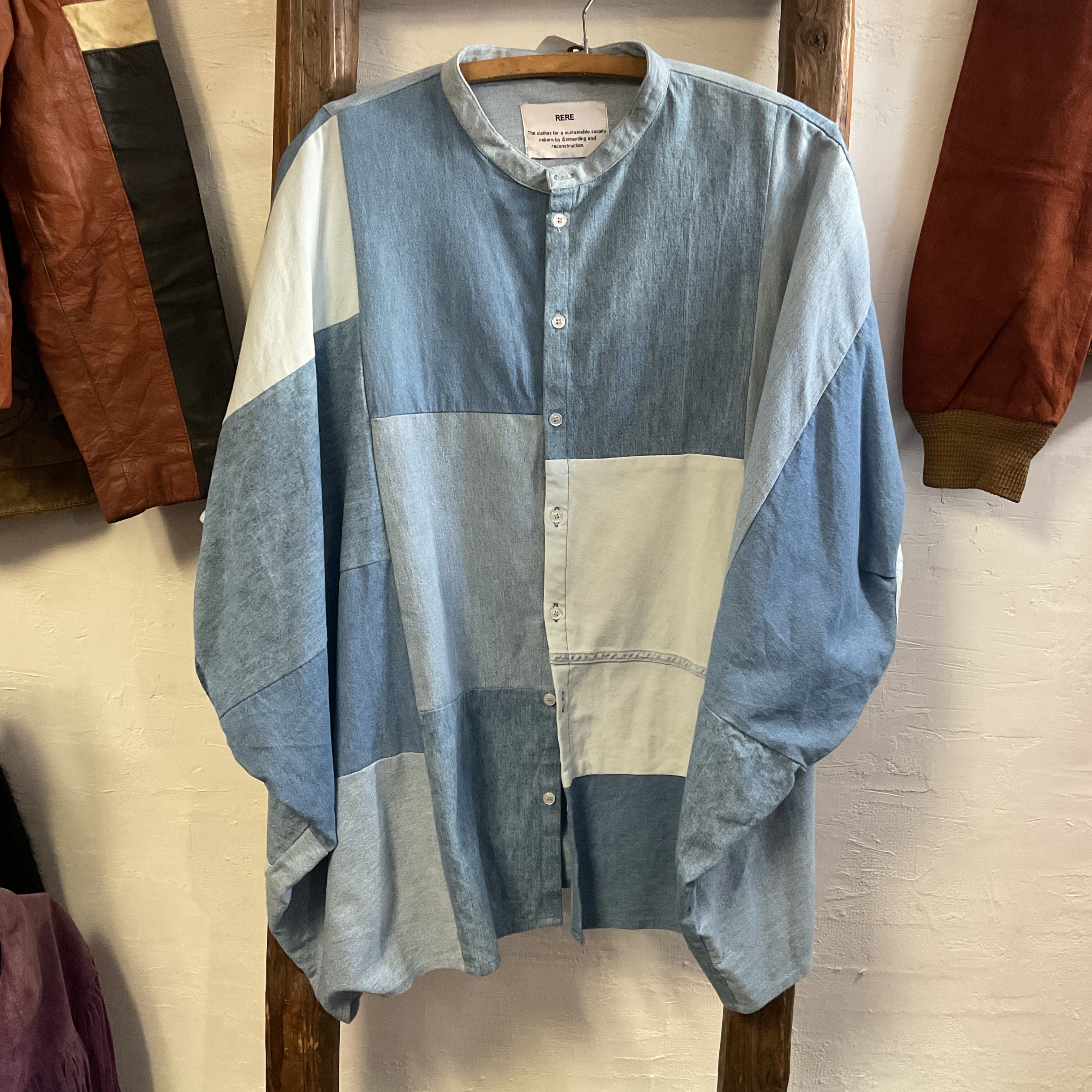 異なるトーンのデニム/シャンブレー生地をブロック状に組み合わせた、リメイクならではの表情が魅力の1着。首元はすっきりとしたバンドカラー仕様で、柄物ほど主張し過ぎず、無地には出せない奥行きがございます。