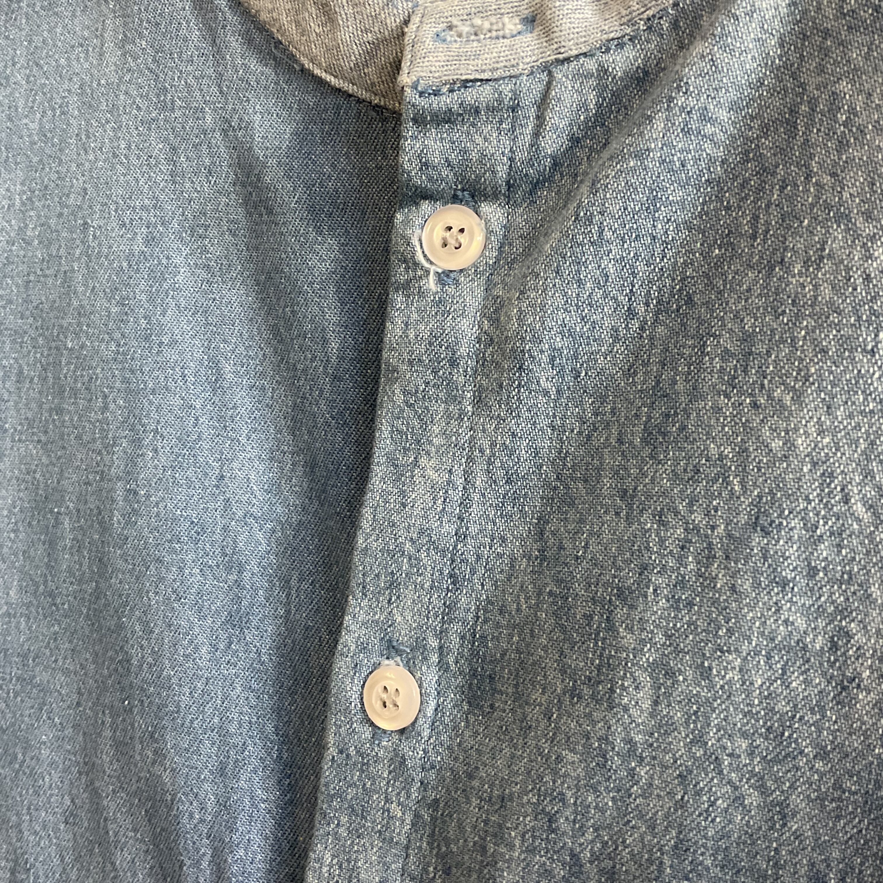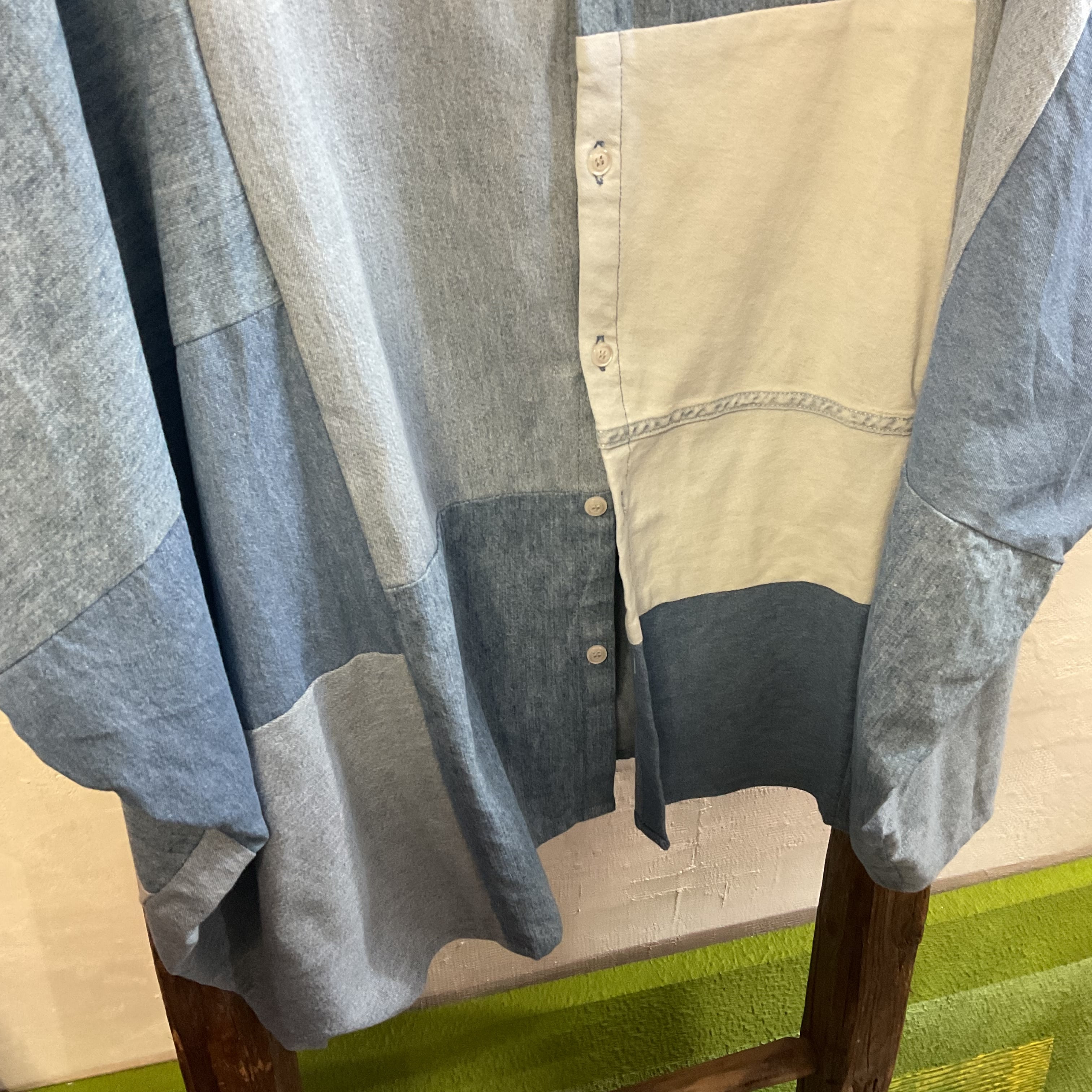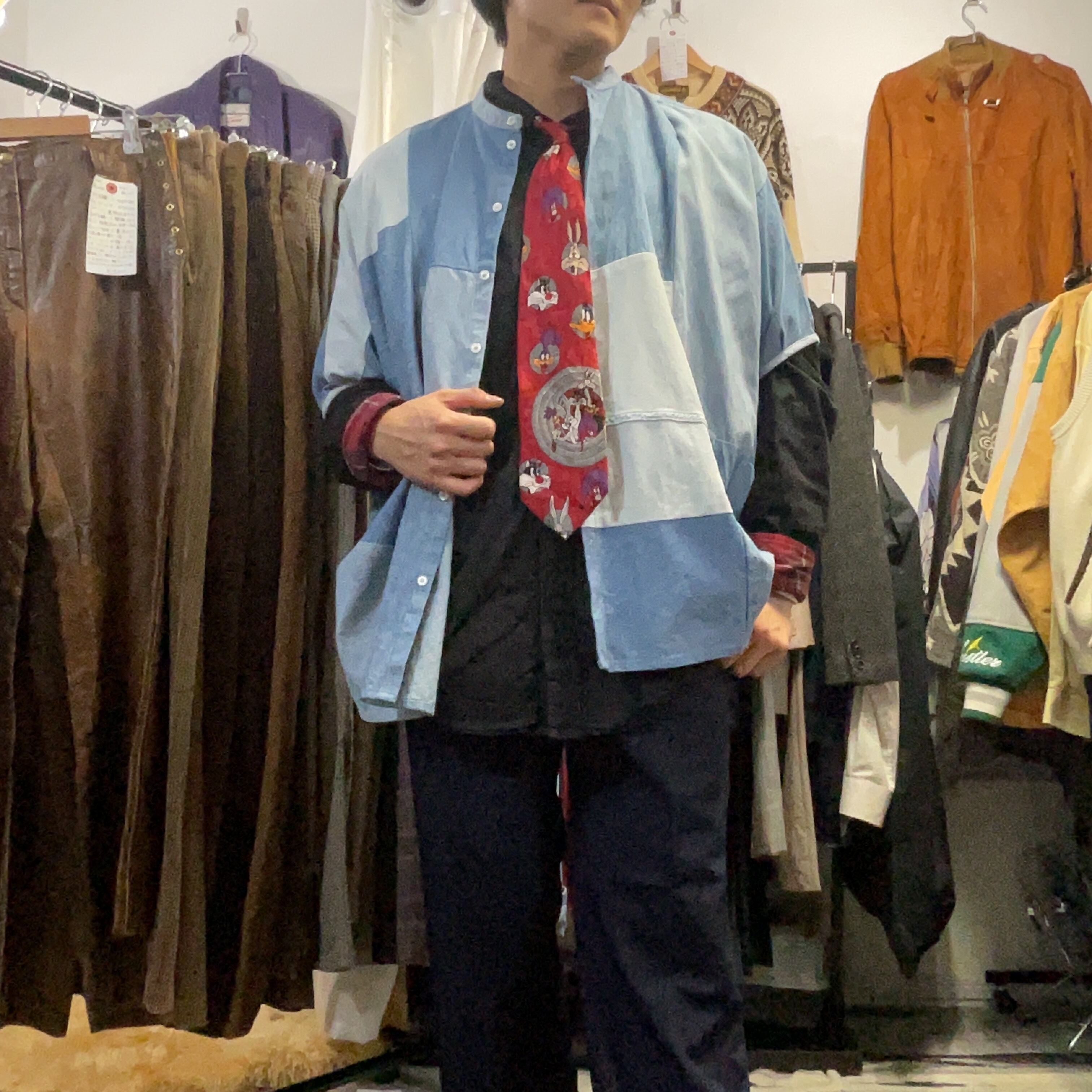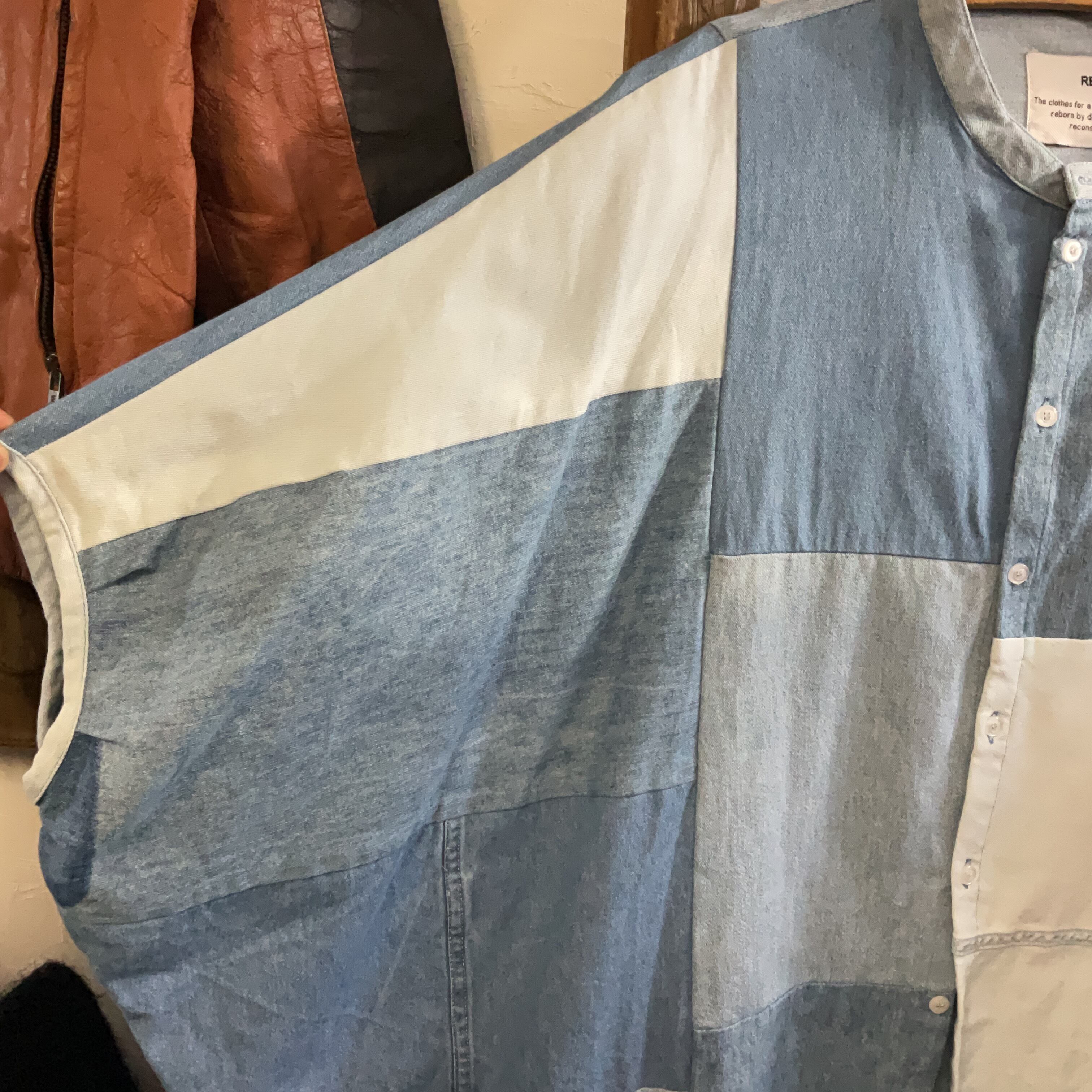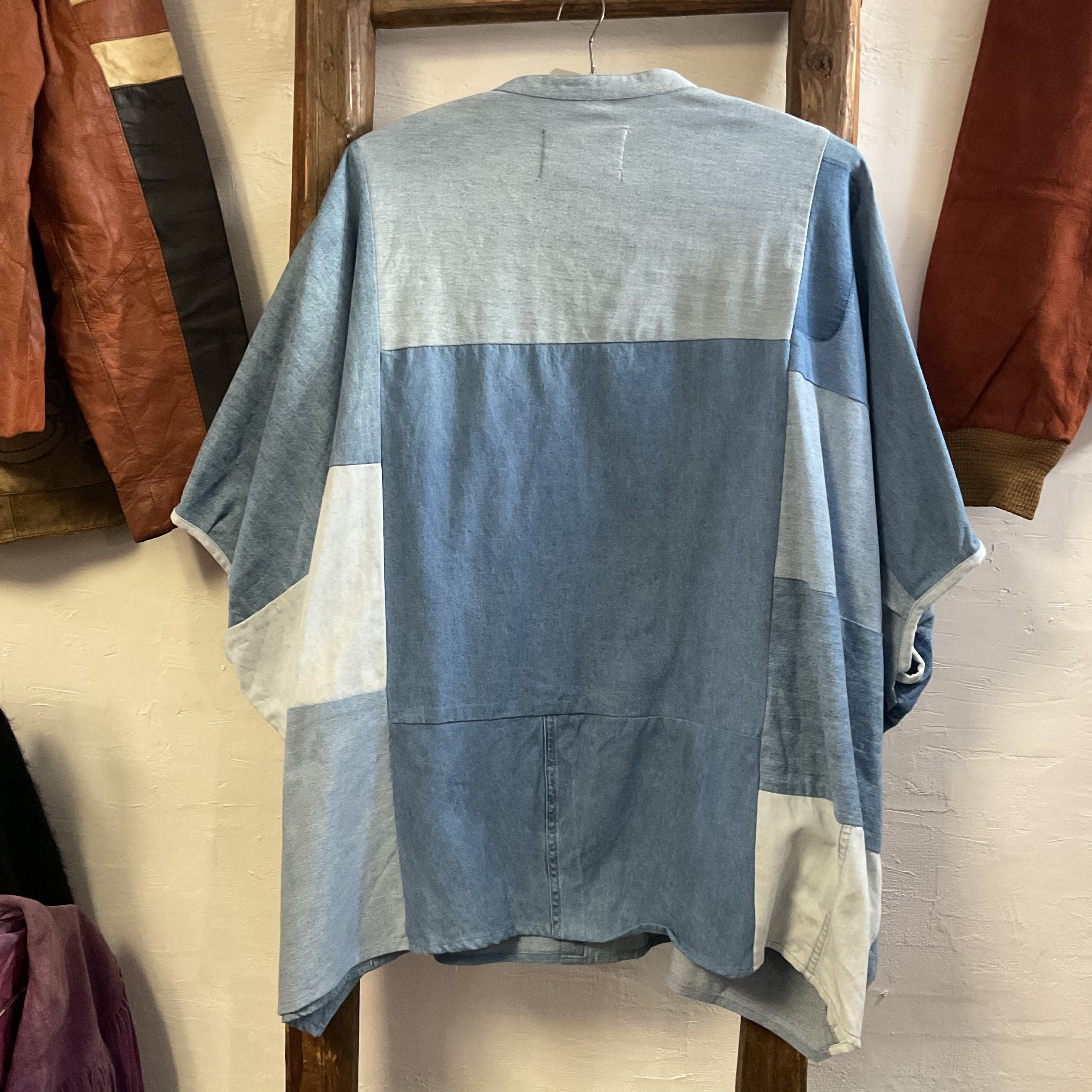 異なるトーンのデニム/シャンブレー生地をブロック状に組み合わせた、リメイクならではの表情が魅力の1着。首元はすっきりとしたバンドカラー仕様で、柄物ほど主張し過ぎず、無地には出せない奥行きがございます。