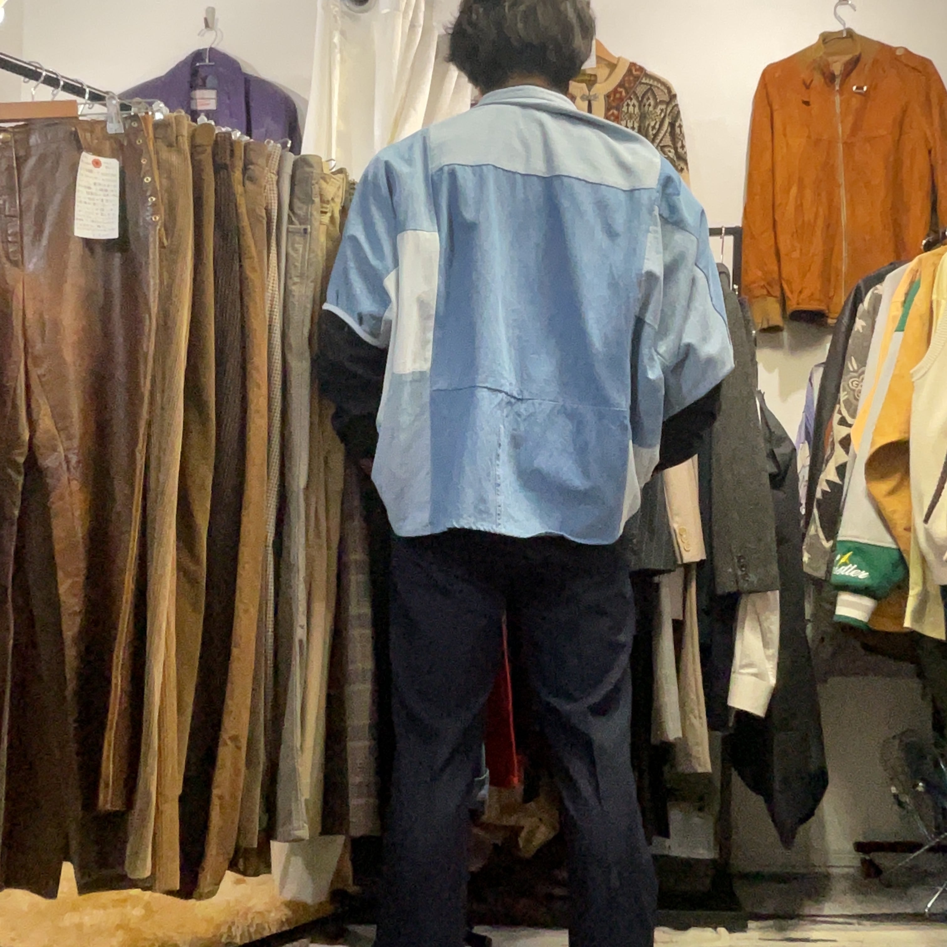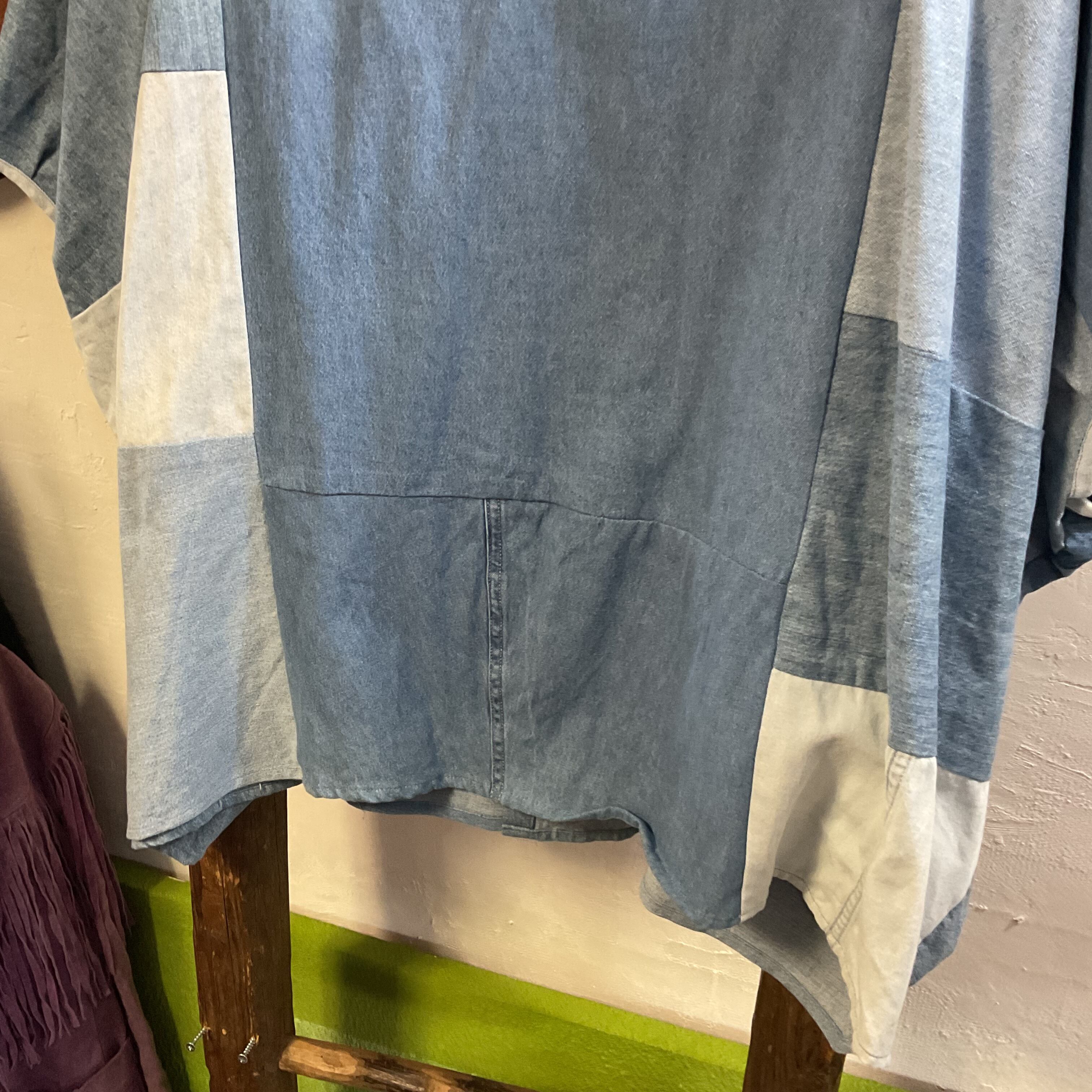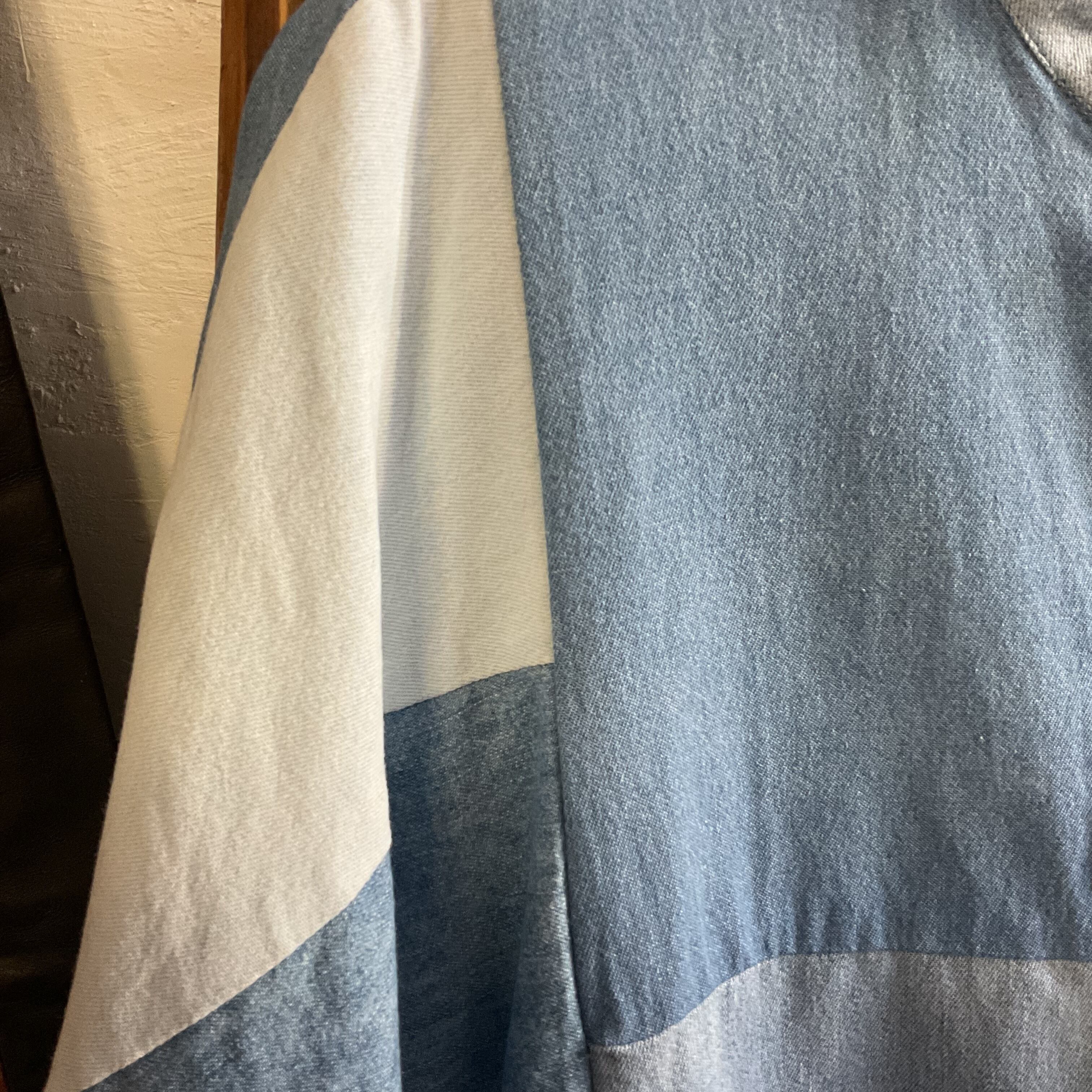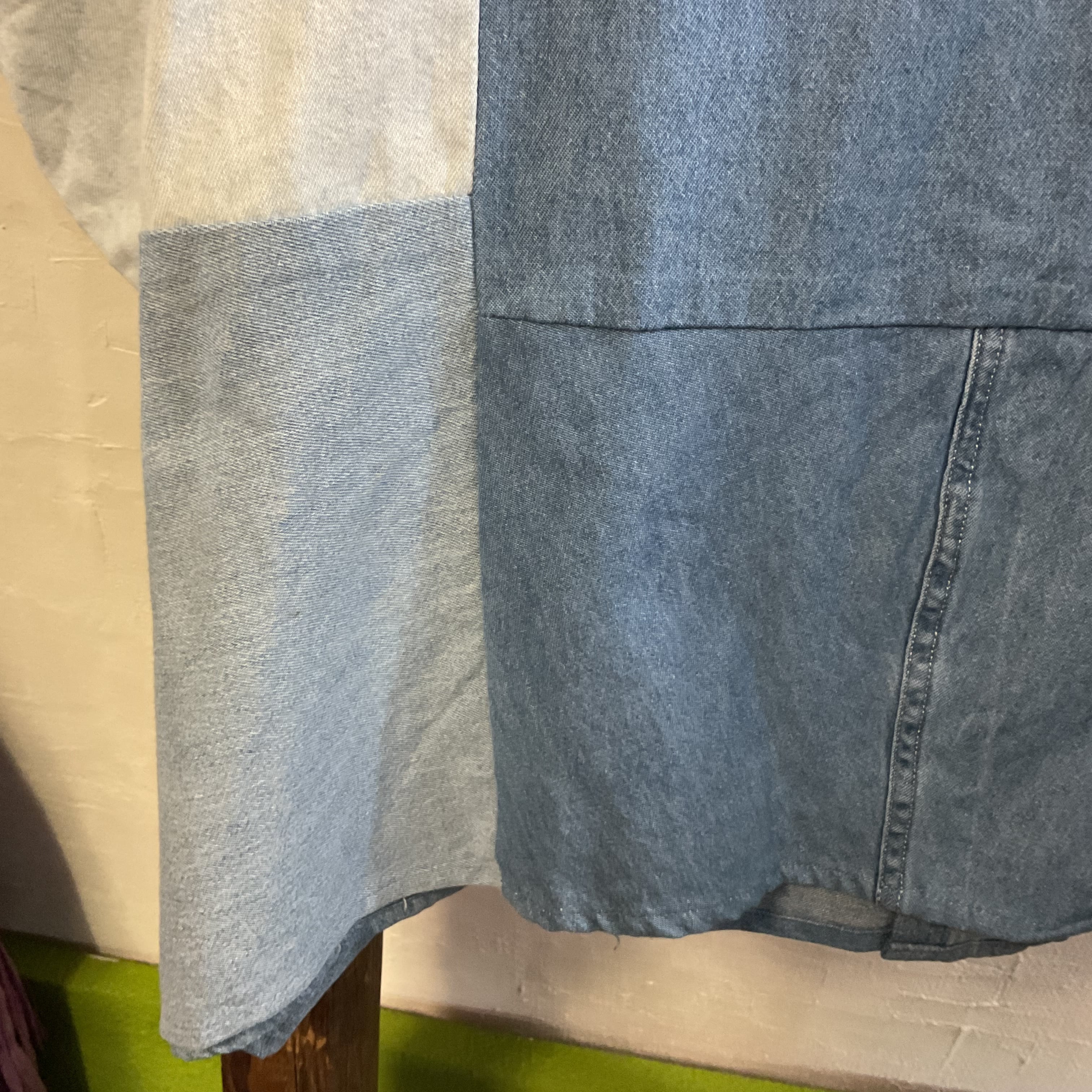 異なるトーンのデニム/シャンブレー生地をブロック状に組み合わせた、リメイクならではの表情が魅力の1着。首元はすっきりとしたバンドカラー仕様で、柄物ほど主張し過ぎず、無地には出せない奥行きがございます。