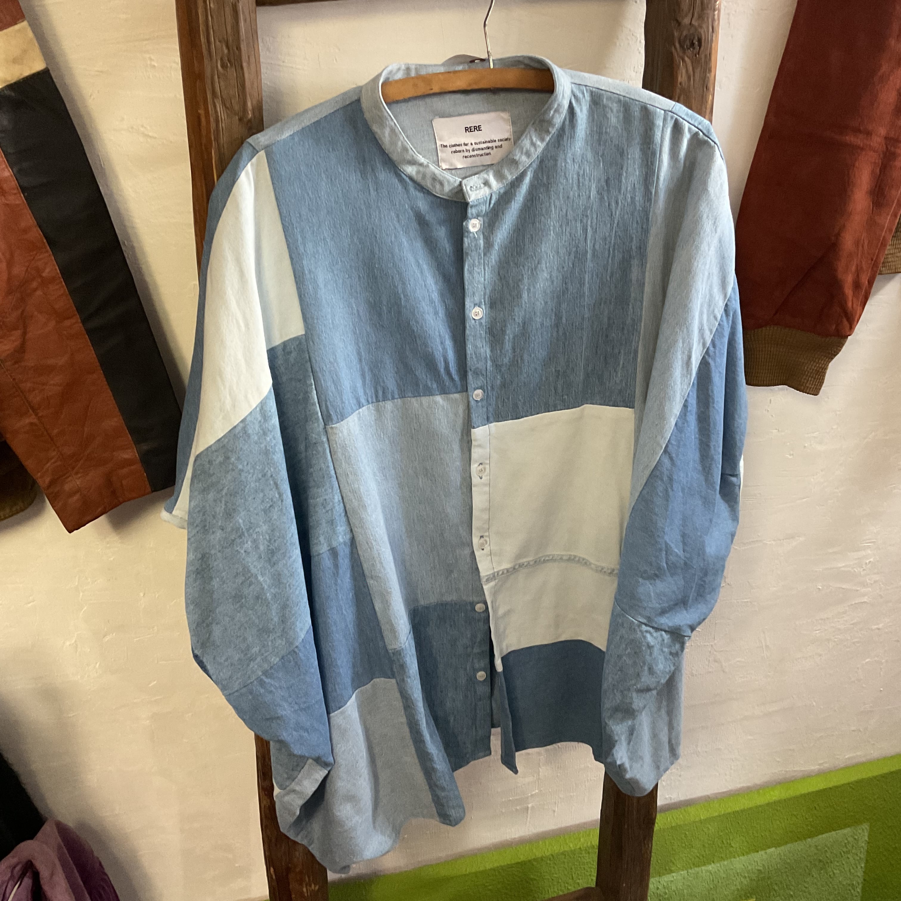 RERE France-made Upcycled Patchwork Denim Band-Collar Shirt or Vest