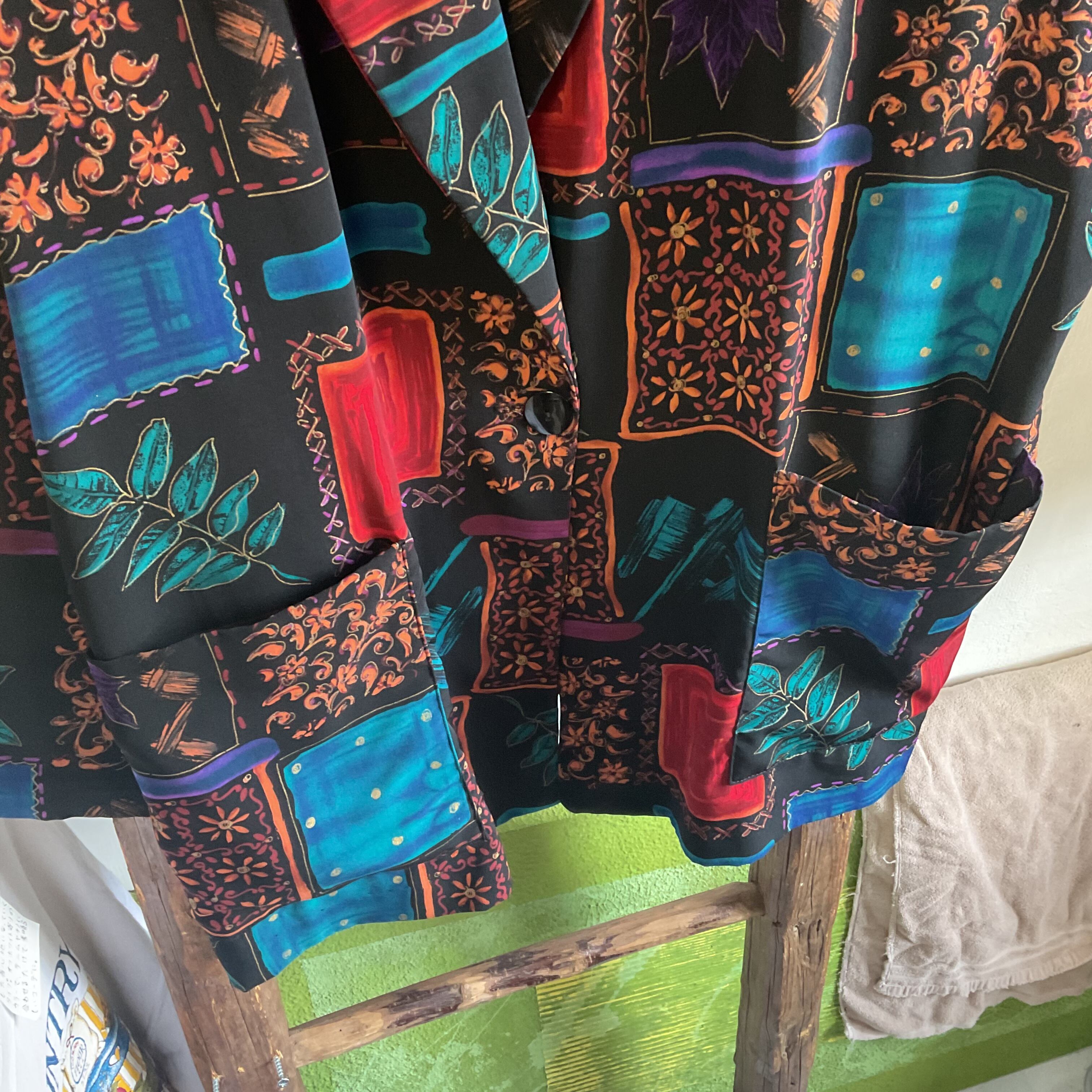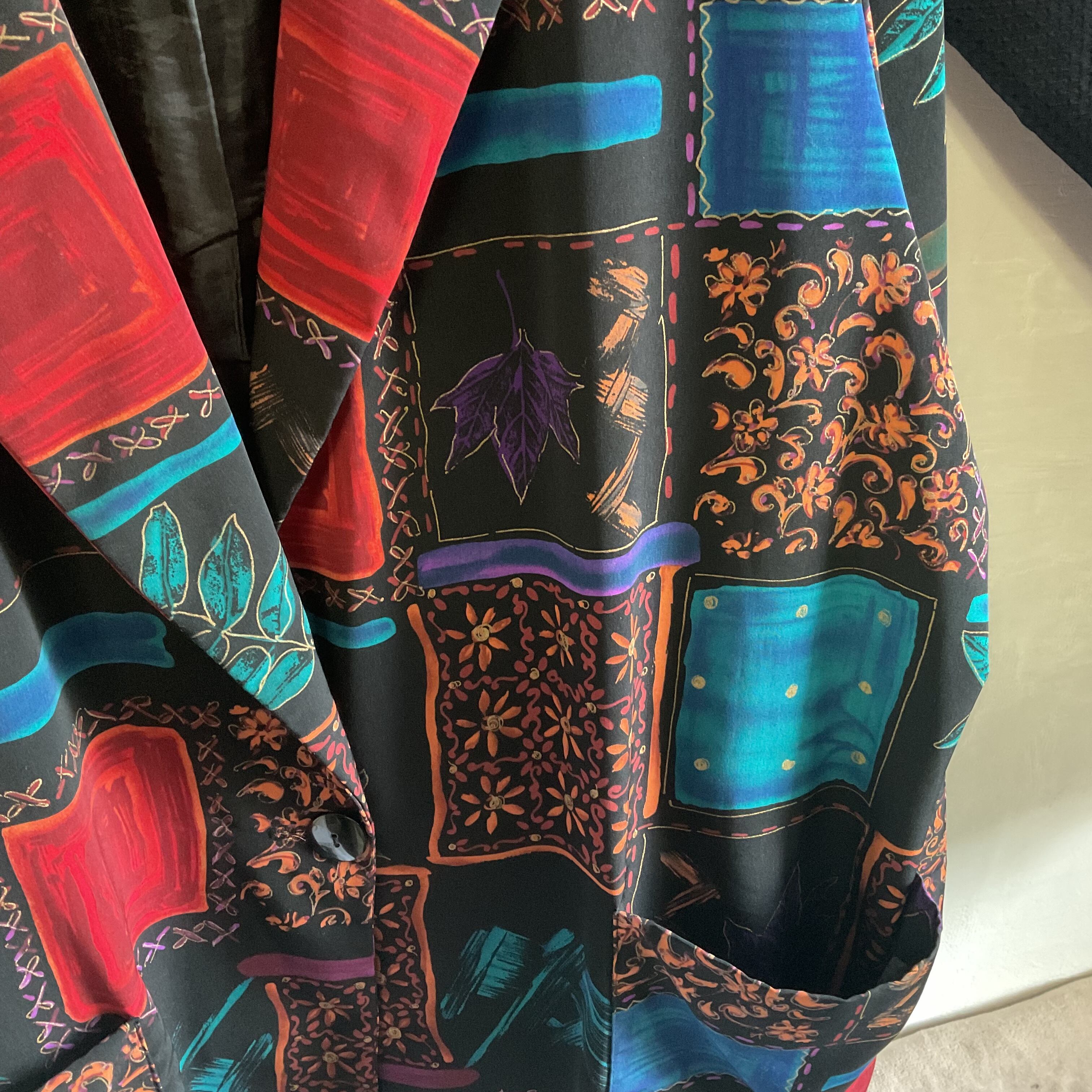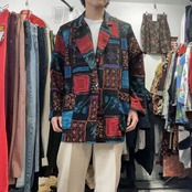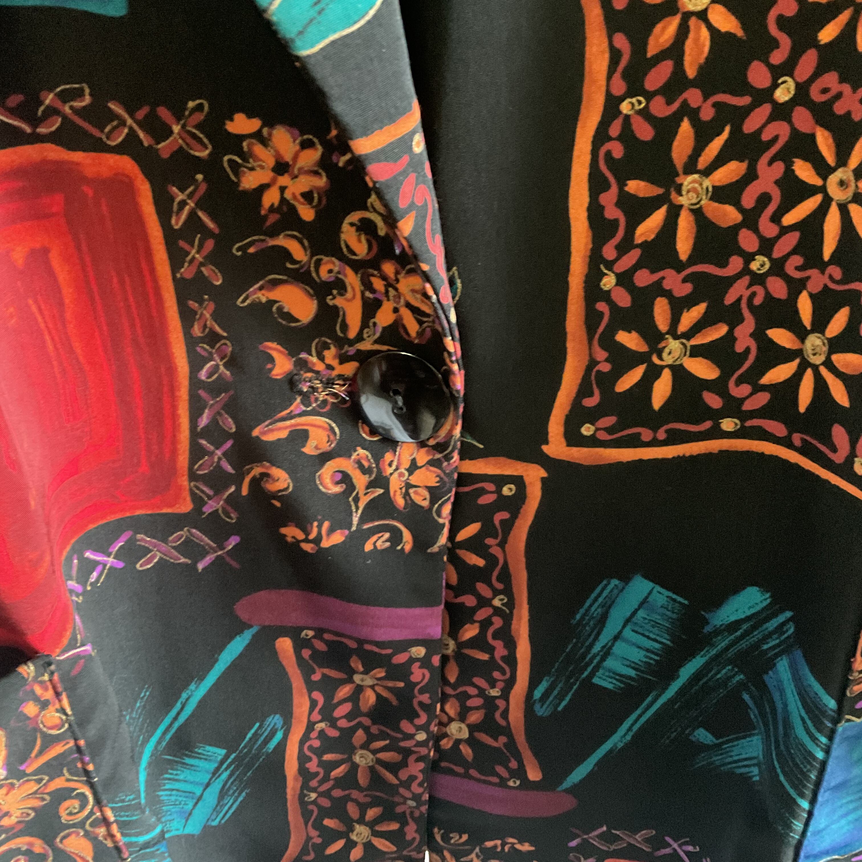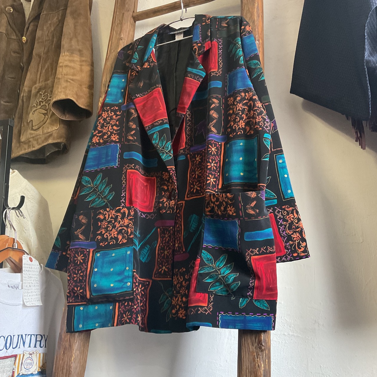 ブラックベースに、レッド・ブルー・パープル・オレンジの鮮やかな配色を効かせた、存在感のある総柄ジャケット。大きめのカラーブロックや植物モチーフ、装飾的なパターンが全体に散りばめられており、1990年代らしい華やかさと遊び心を感じられる1着。ベースが黒のため色数が多くてもまとまりがあり、派手すぎず、しっかりスタイリングの主役になります。