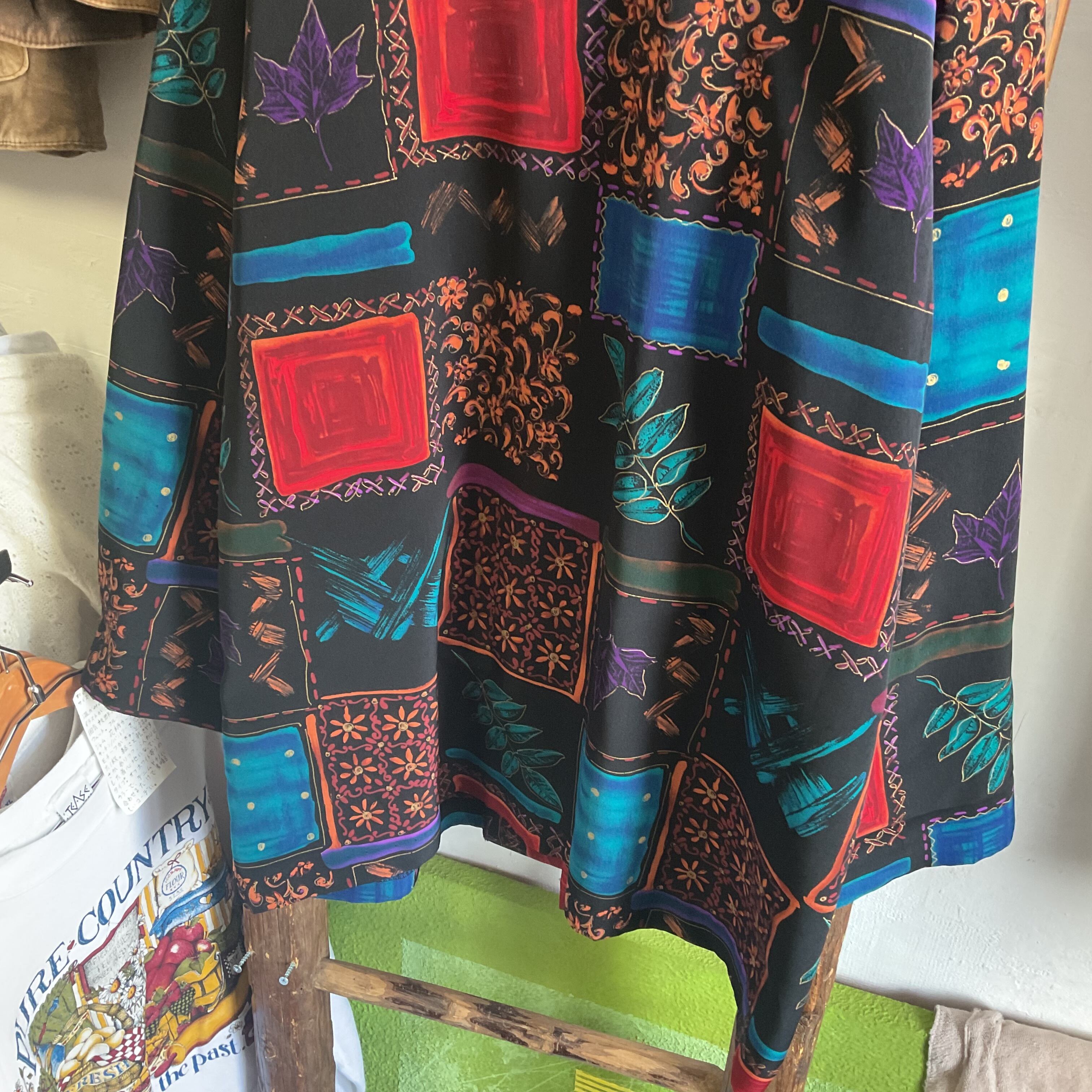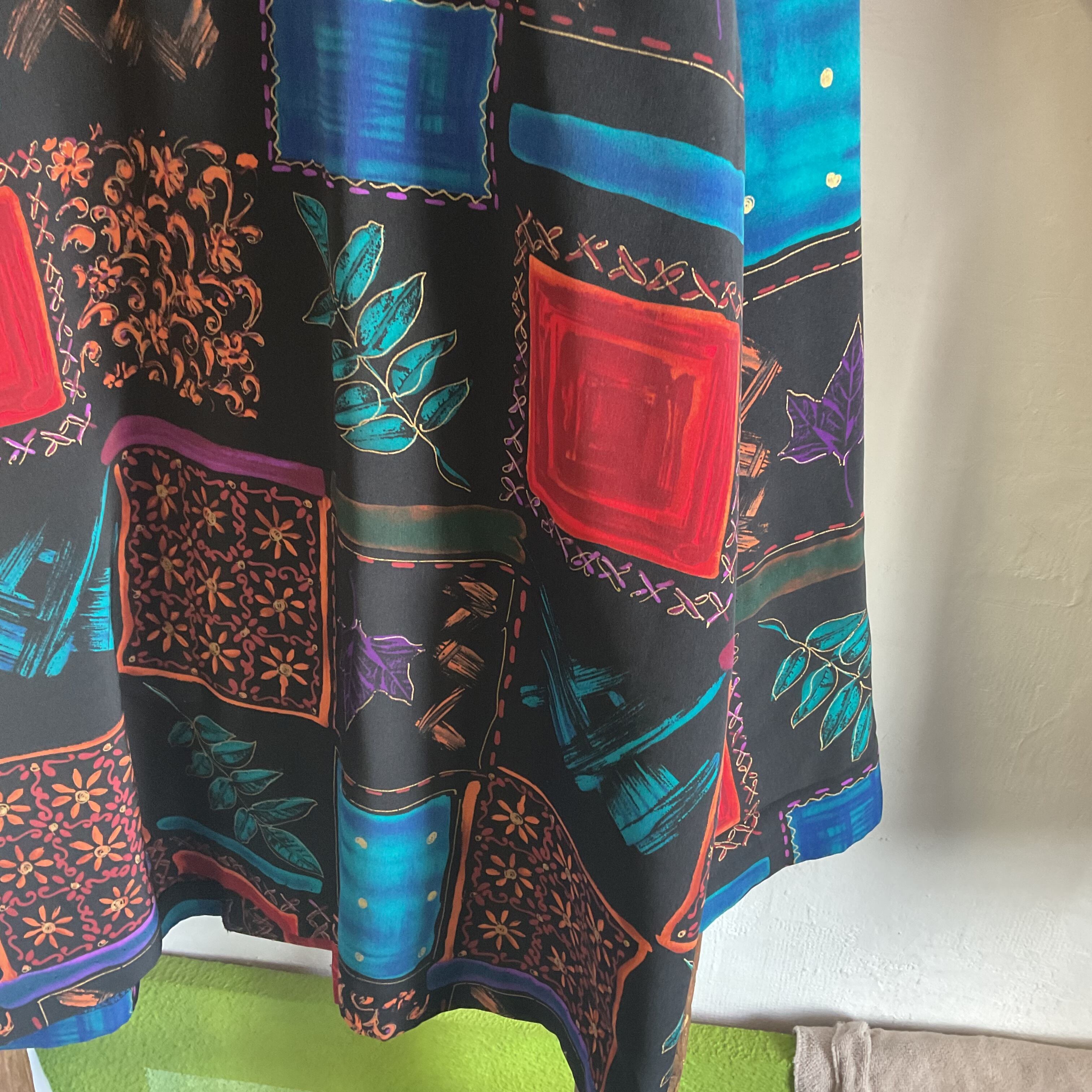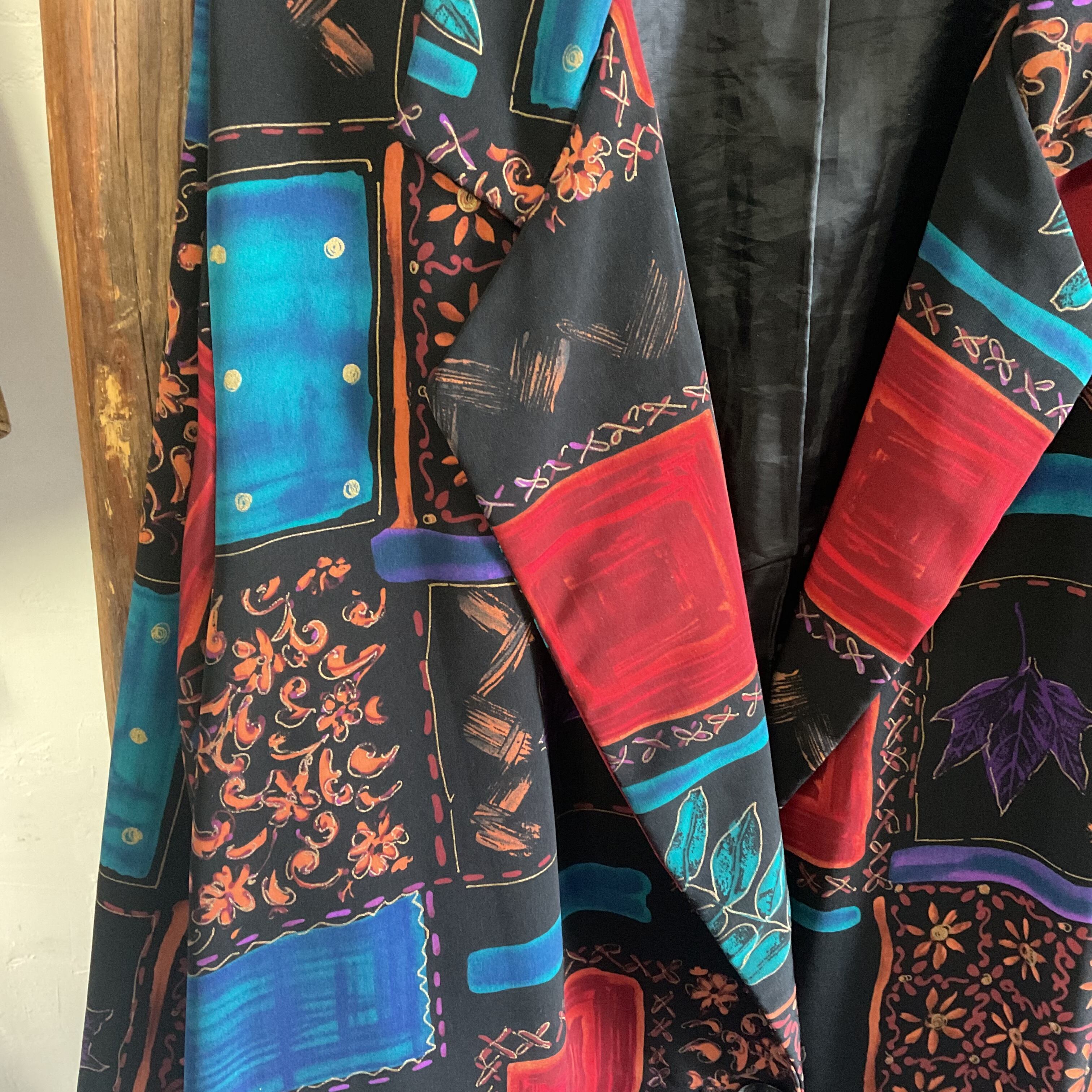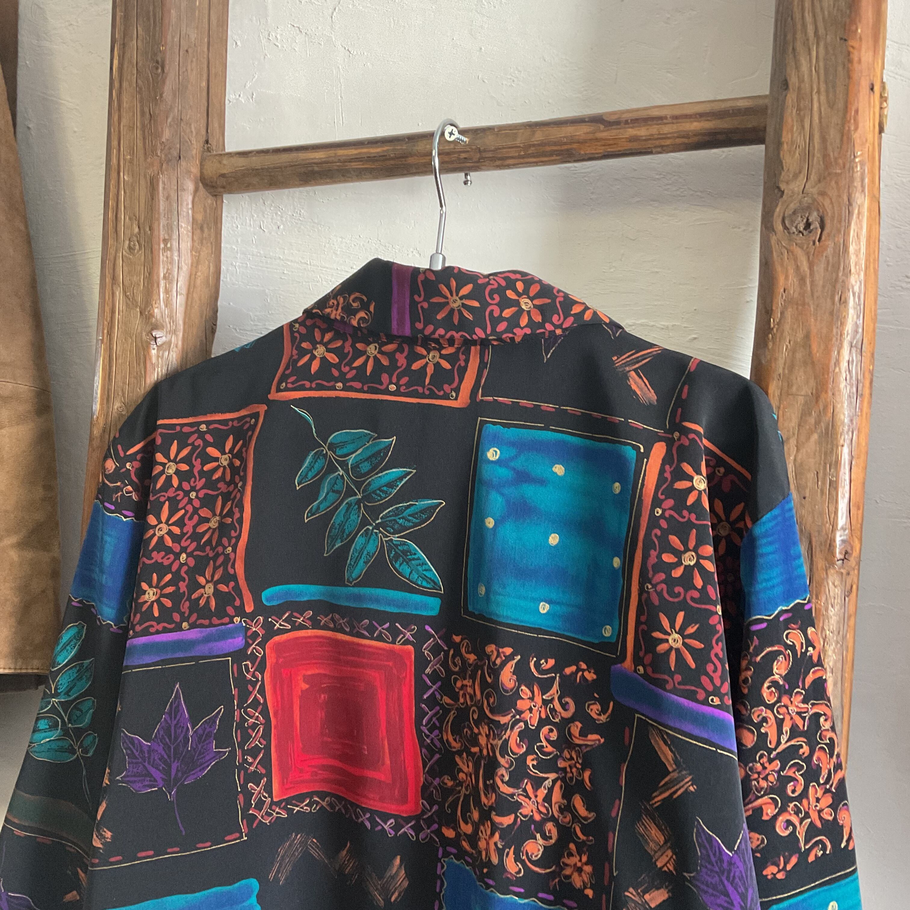 ブラックベースに、レッド・ブルー・パープル・オレンジの鮮やかな配色を効かせた、存在感のある総柄ジャケット。大きめのカラーブロックや植物モチーフ、装飾的なパターンが全体に散りばめられており、1990年代らしい華やかさと遊び心を感じられる1着。ベースが黒のため色数が多くてもまとまりがあり、派手すぎず、しっかりスタイリングの主役になります。