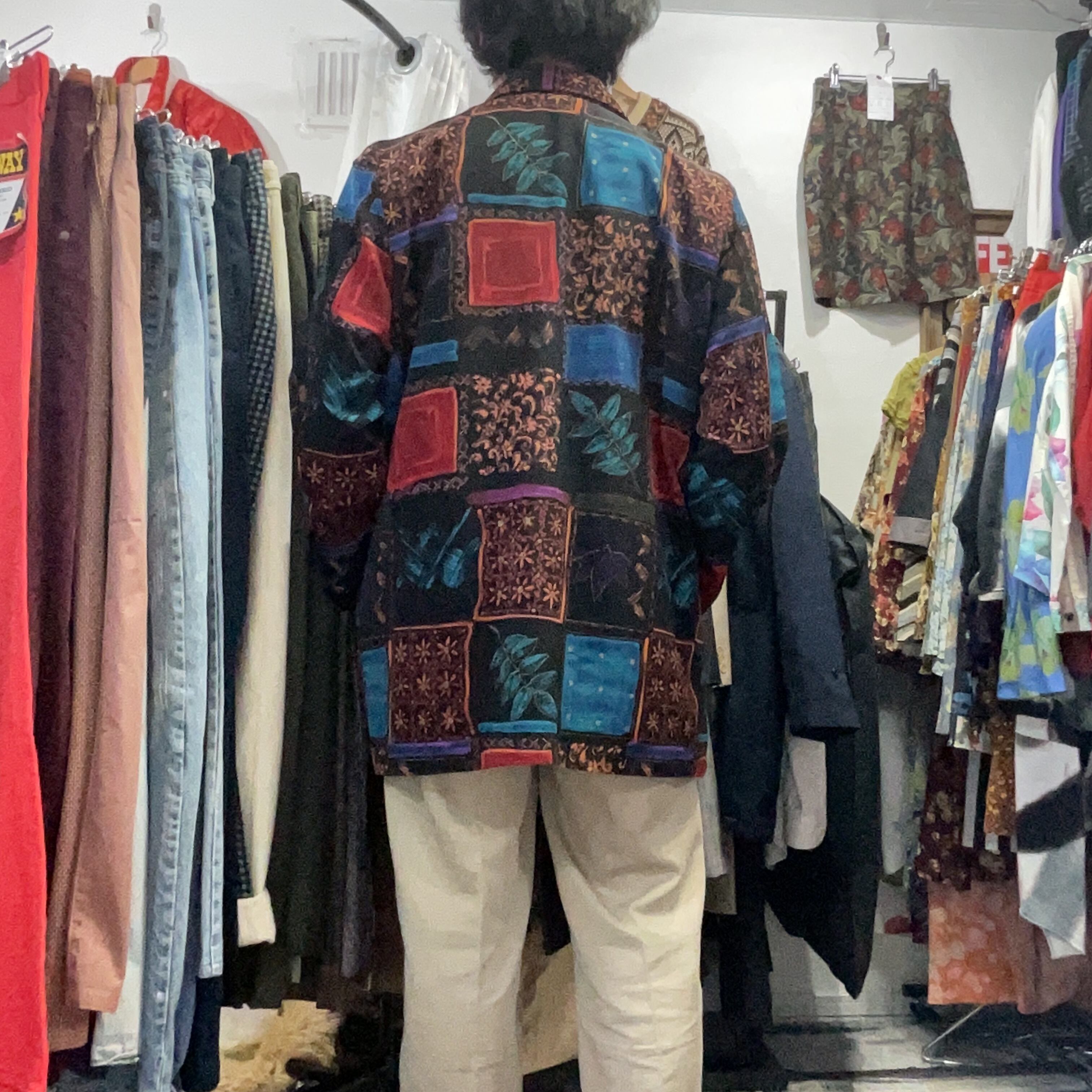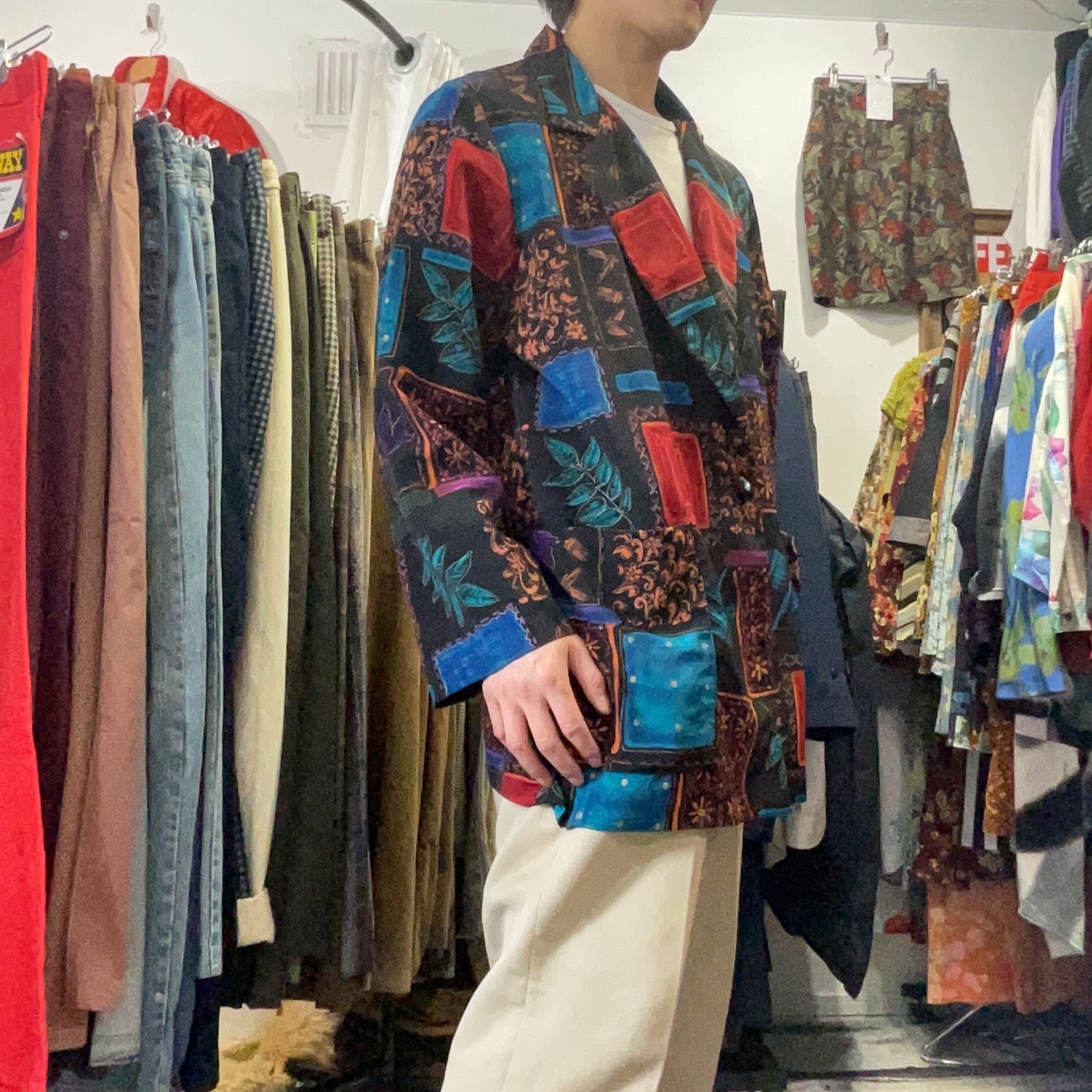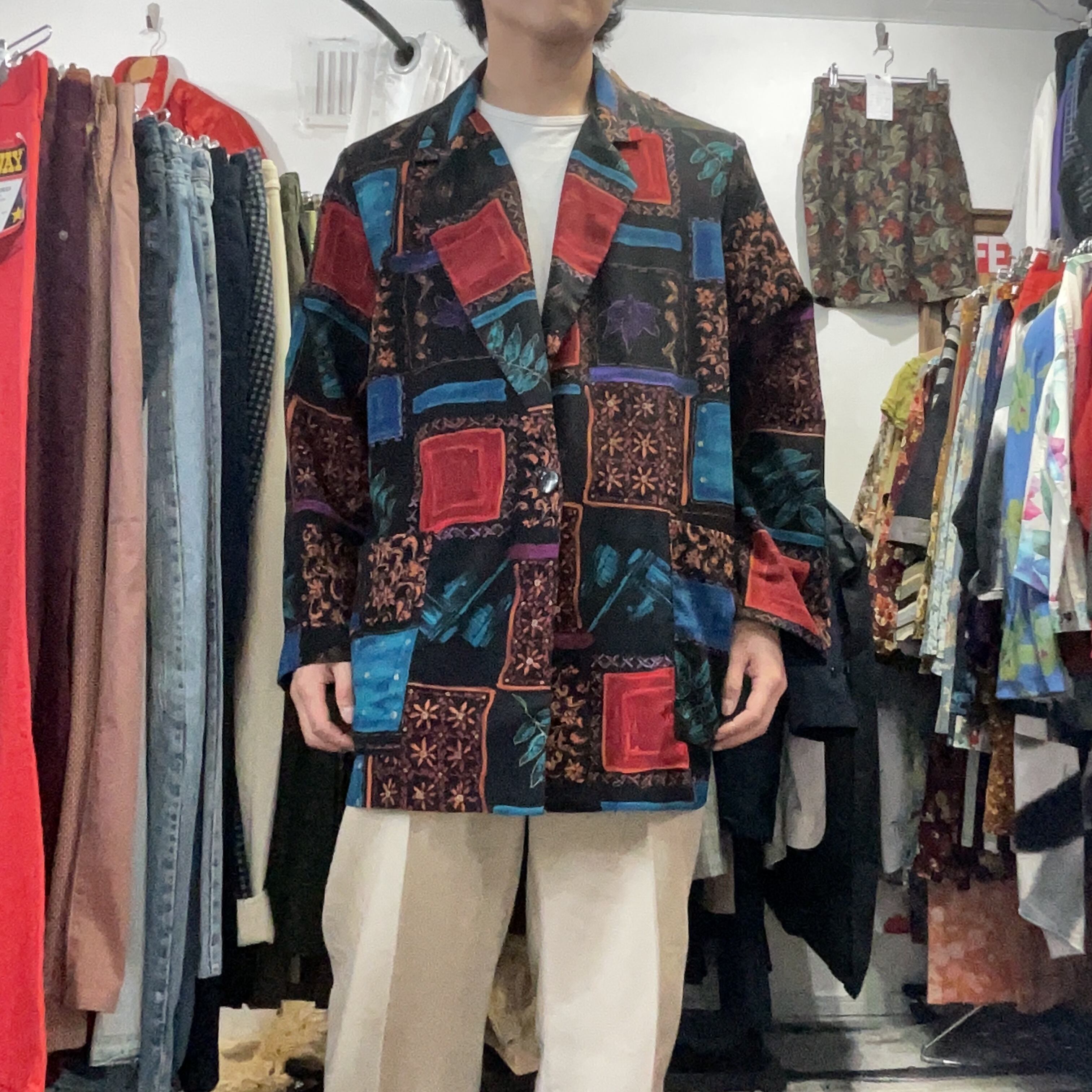 アートピースのような配色と、90sらしい大胆な総柄使いが魅力で、古着ならではの1点物感を楽しんでいただけるアイテム。無地のジャケットでは物足りない方や、コーディネートにしっかり個性を出したい方にオススメ。