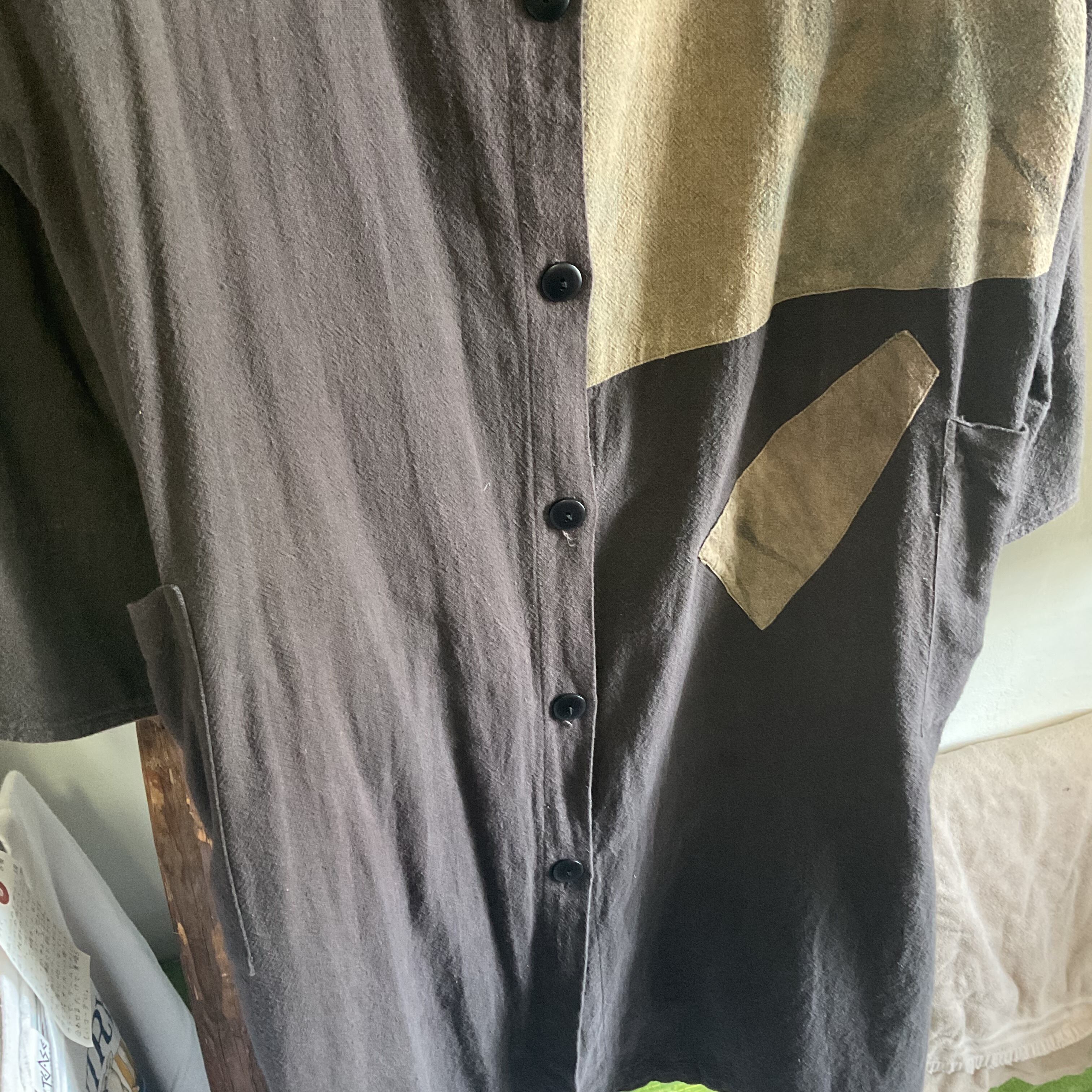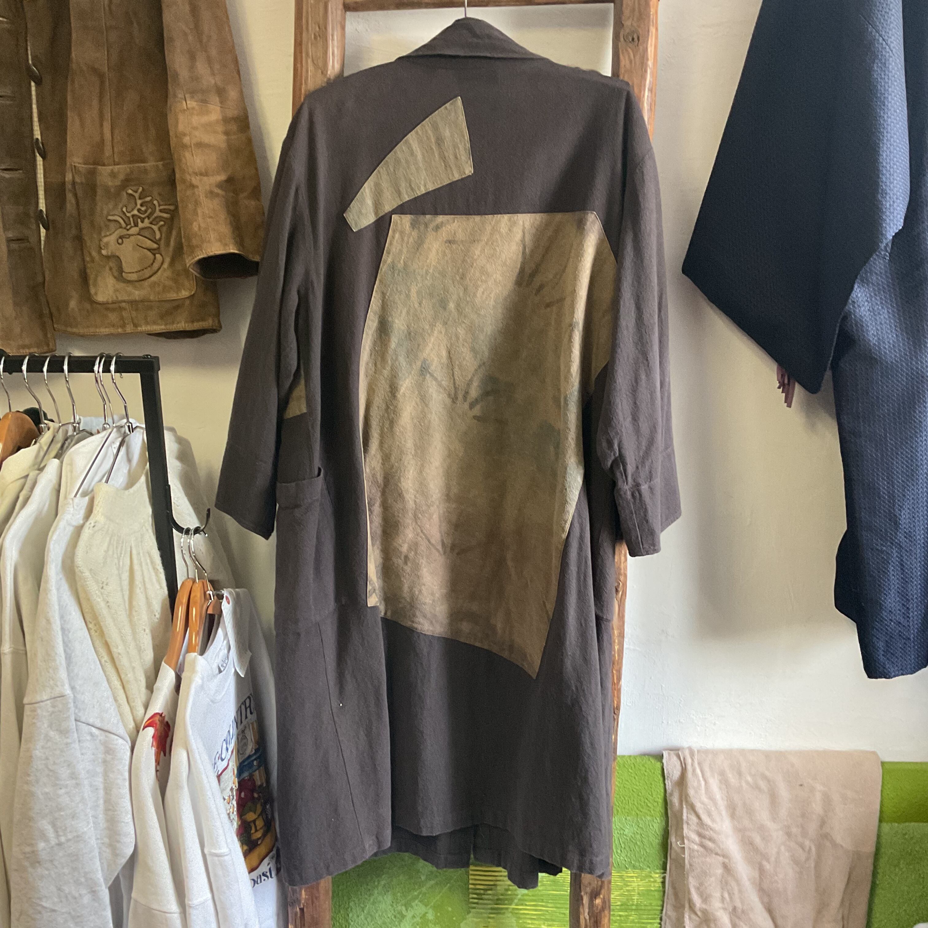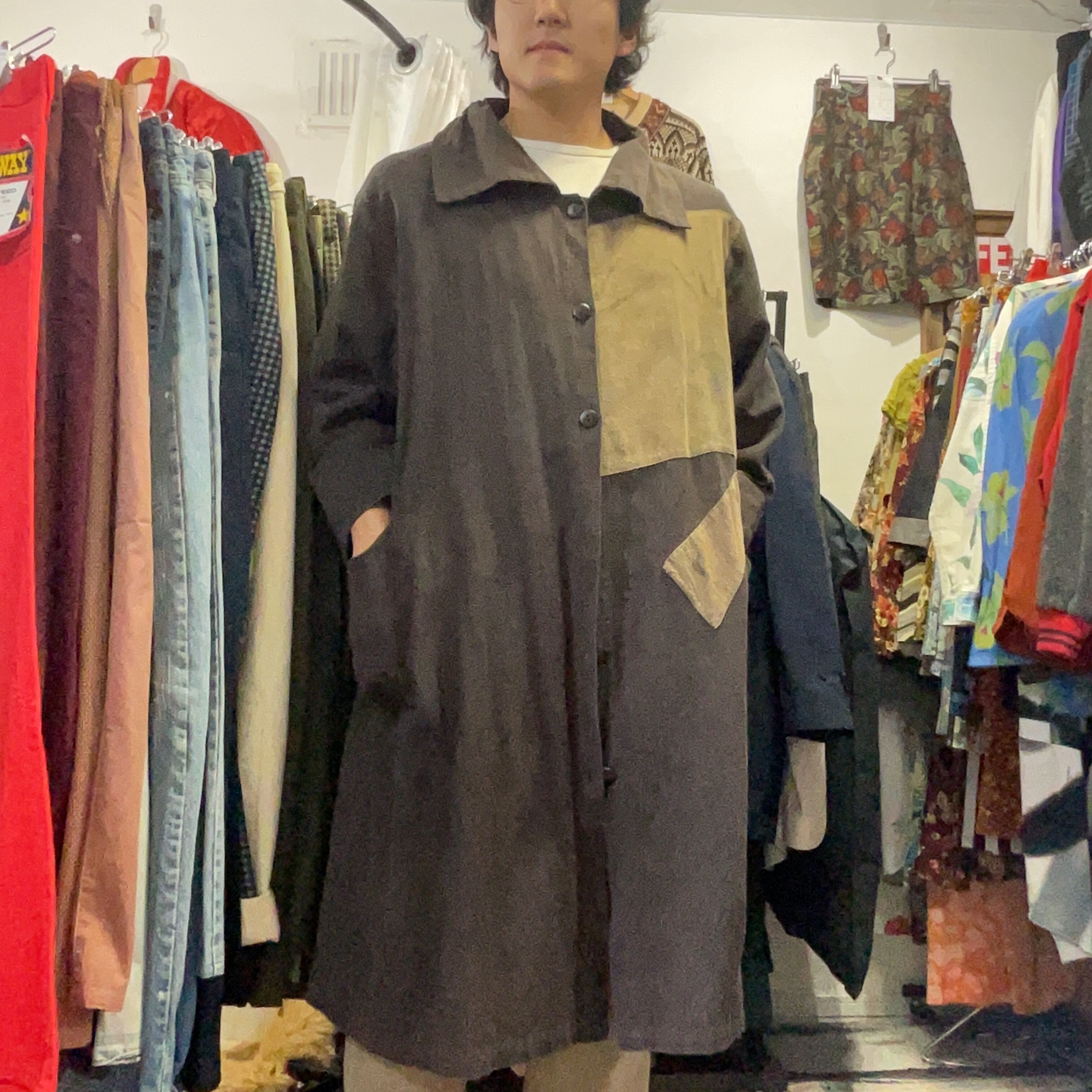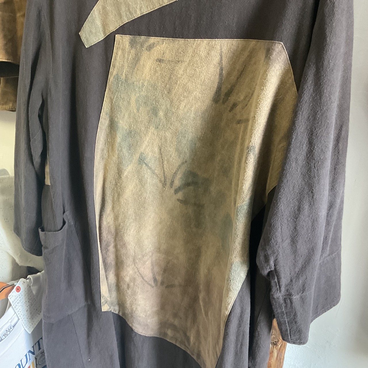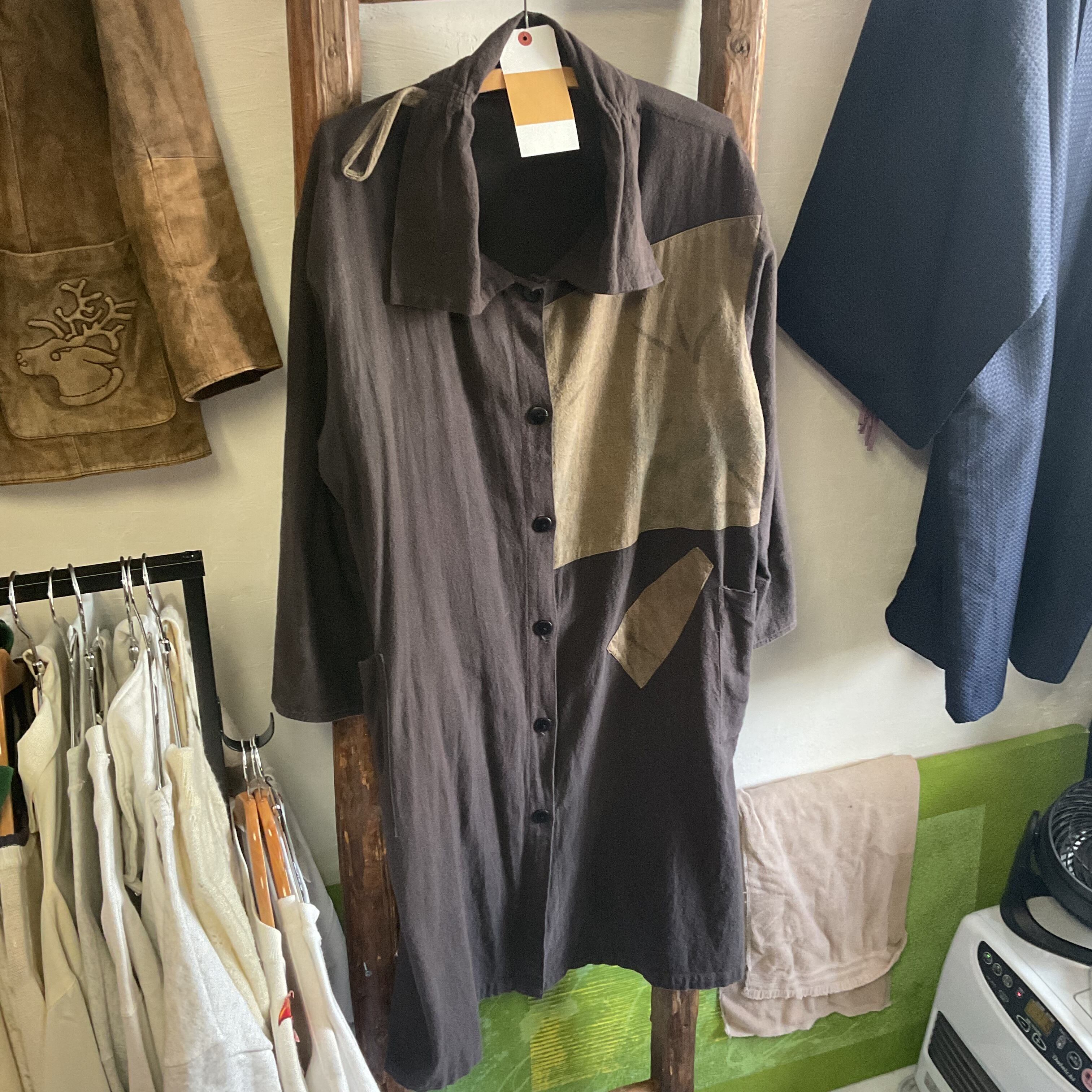 落ち着いたダークブラウンをベースに、ベージュ系の大きな切替パネルを組み合わせた、雰囲気のあるロング丈のデザインアイテム。前身頃と後ろ身頃に入った抽象的なアート調の切替が印象的で、派手すぎないのにしっかり個性が出る1着。色味を抑えた配色のため、デザイン性がありながらも日常のコーディネートに取り入れやすく、ナチュラル・モード・アート系の着こなしと相性よくまとまります。