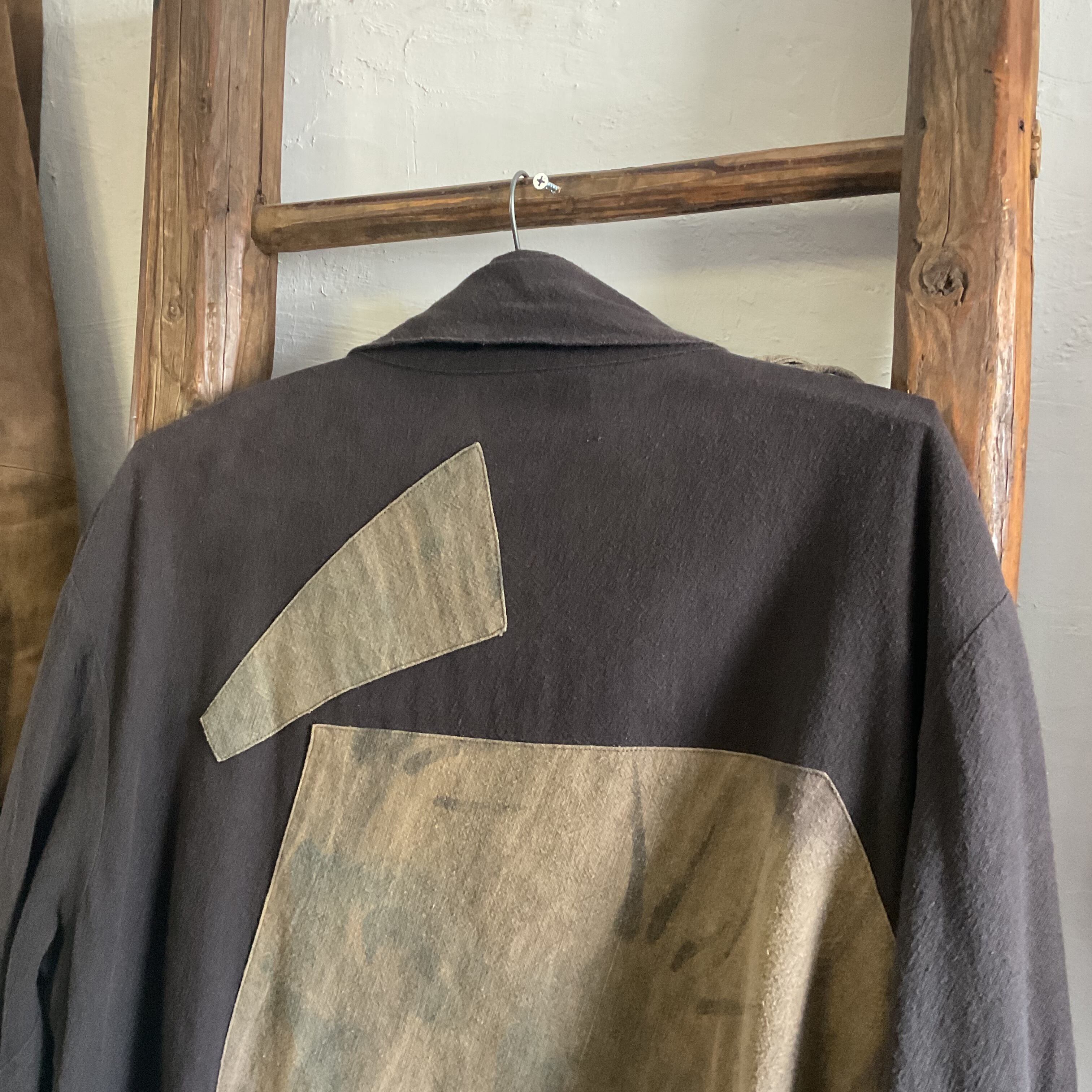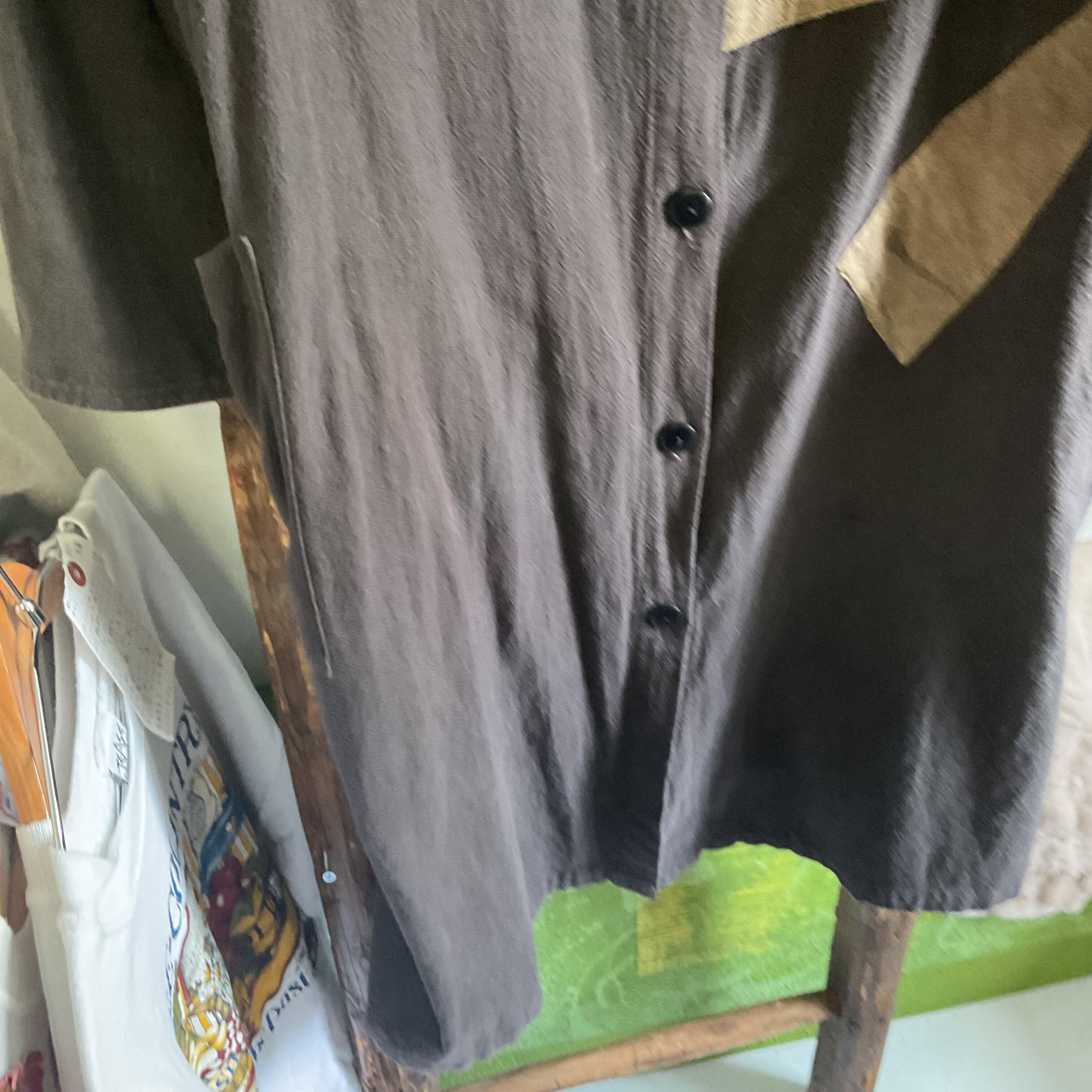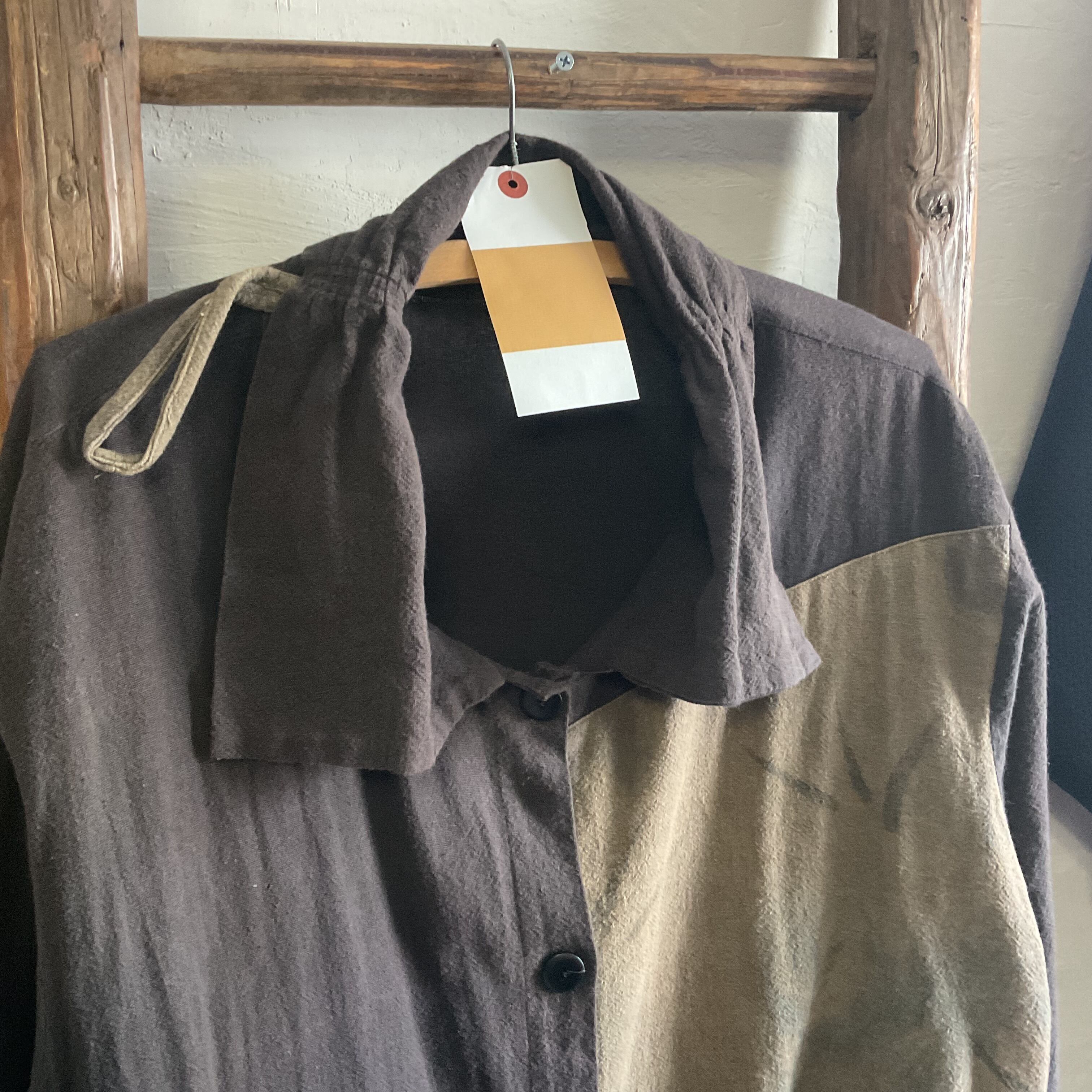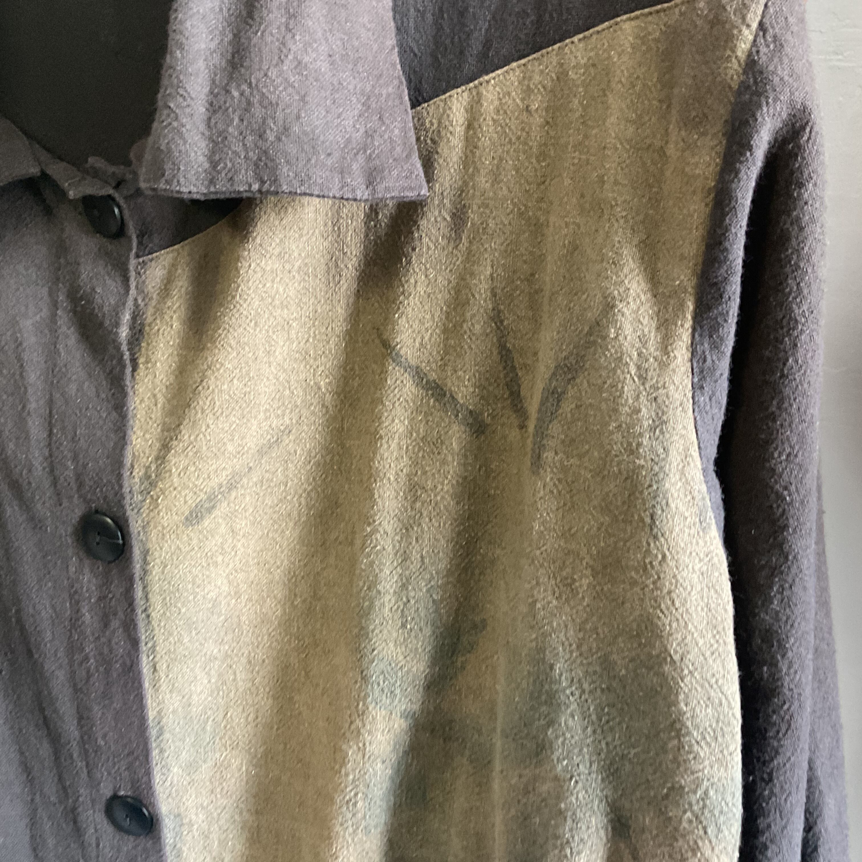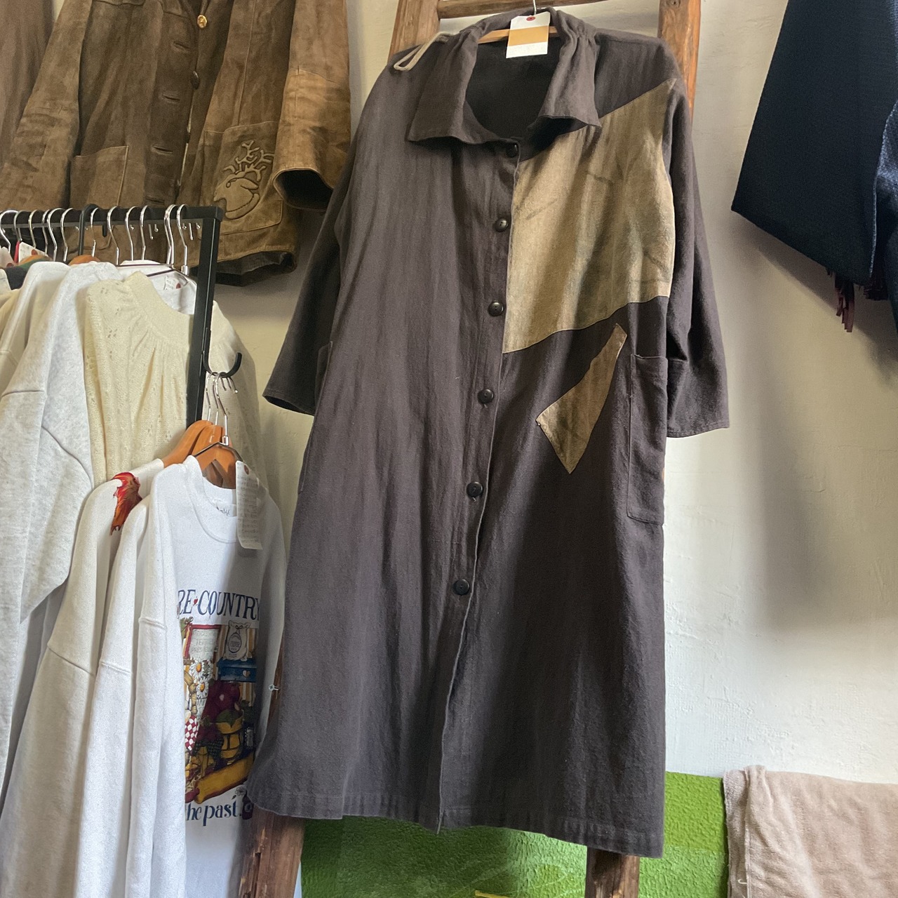 落ち着いたダークブラウンをベースに、ベージュ系の大きな切替パネルを組み合わせた、雰囲気のあるロング丈のデザインアイテム。前身頃と後ろ身頃に入った抽象的なアート調の切替が印象的で、派手すぎないのにしっかり個性が出る1着。色味を抑えた配色のため、デザイン性がありながらも日常のコーディネートに取り入れやすく、ナチュラル・モード・アート系の着こなしと相性よくまとまります。