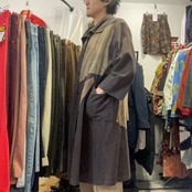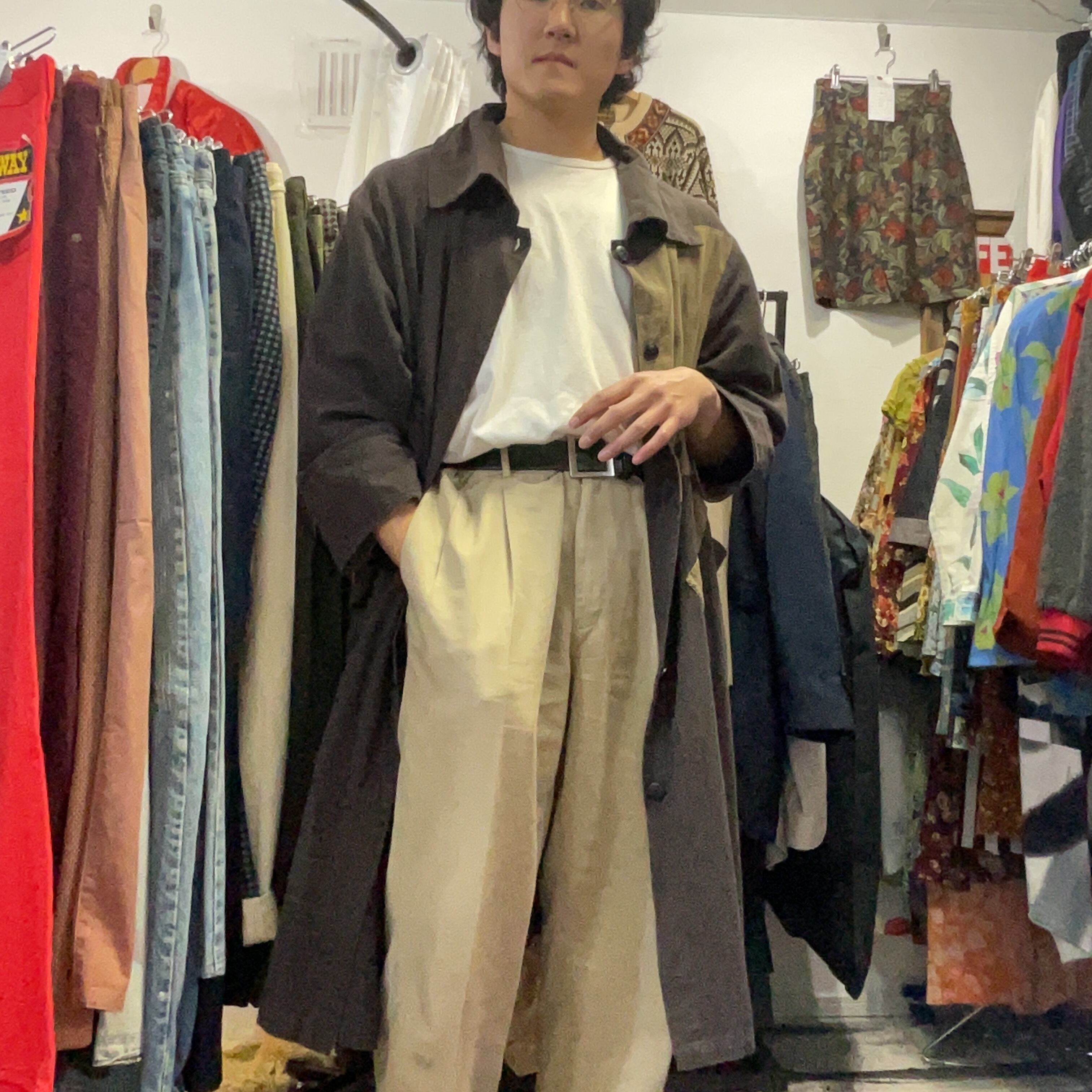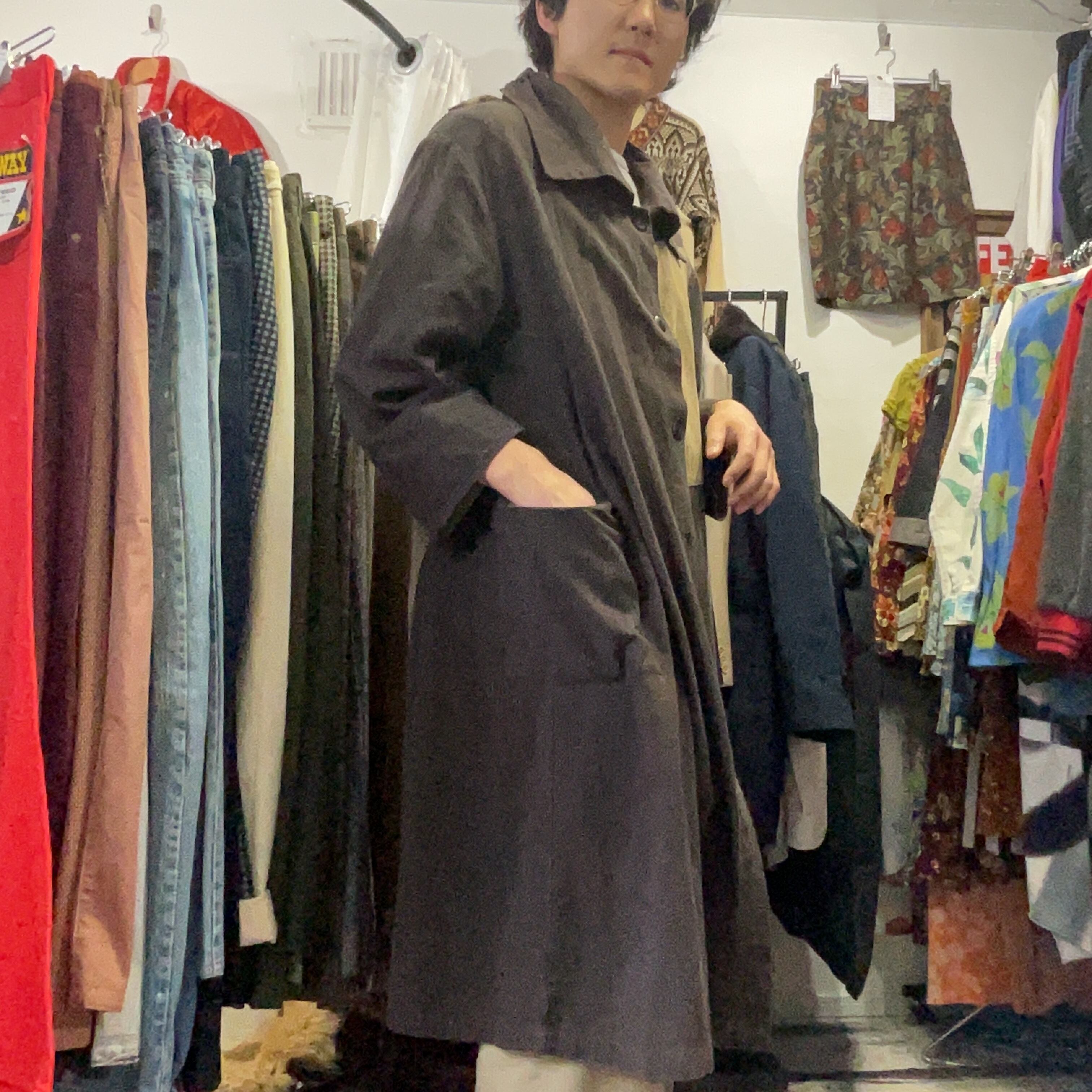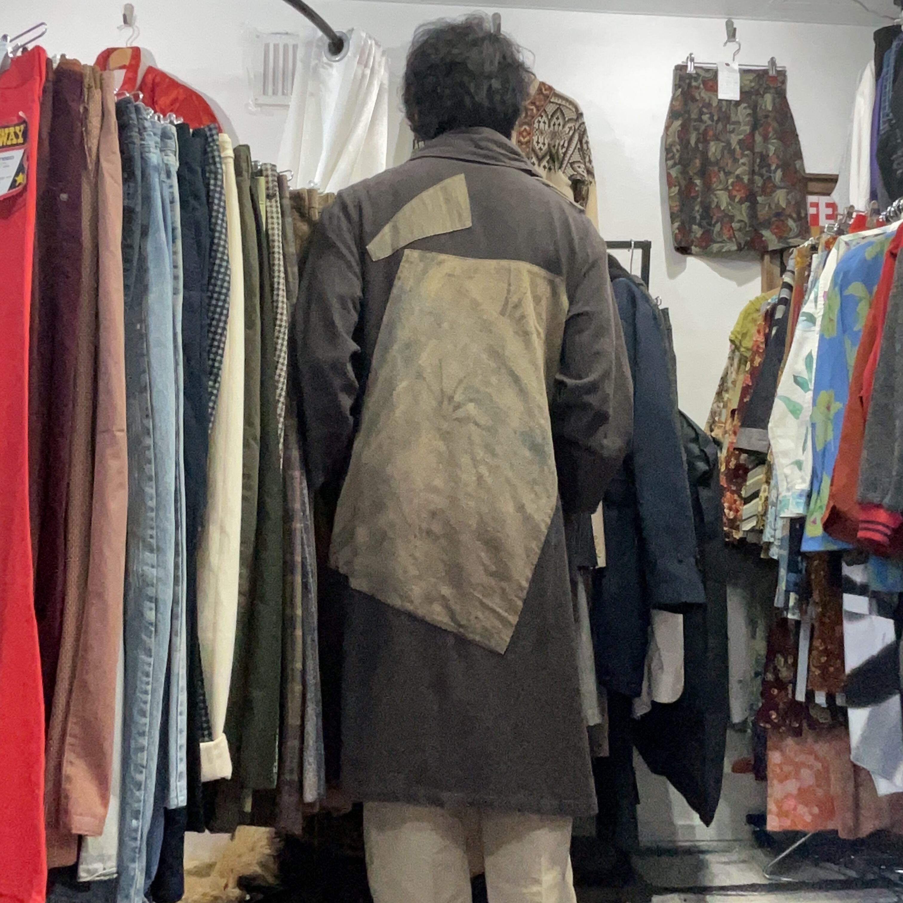 襟元は大きめでやわらかい印象があり、フロントはボタン開き仕様。ワンピース感覚で1枚で着ても、前を開けて軽い羽織りとして使っても雰囲気良く決まります。両サイドには大きめのポケットが付き、実用性もありつつデザインのアクセントにもなっています。袖はやや広がりのあるシルエットで、全体にリラックス感のあるバランス。総柄ほど強すぎないものをお探しの方にもおすすめしやすい1着です。古着らしい1点物感があり、静かな存在感。