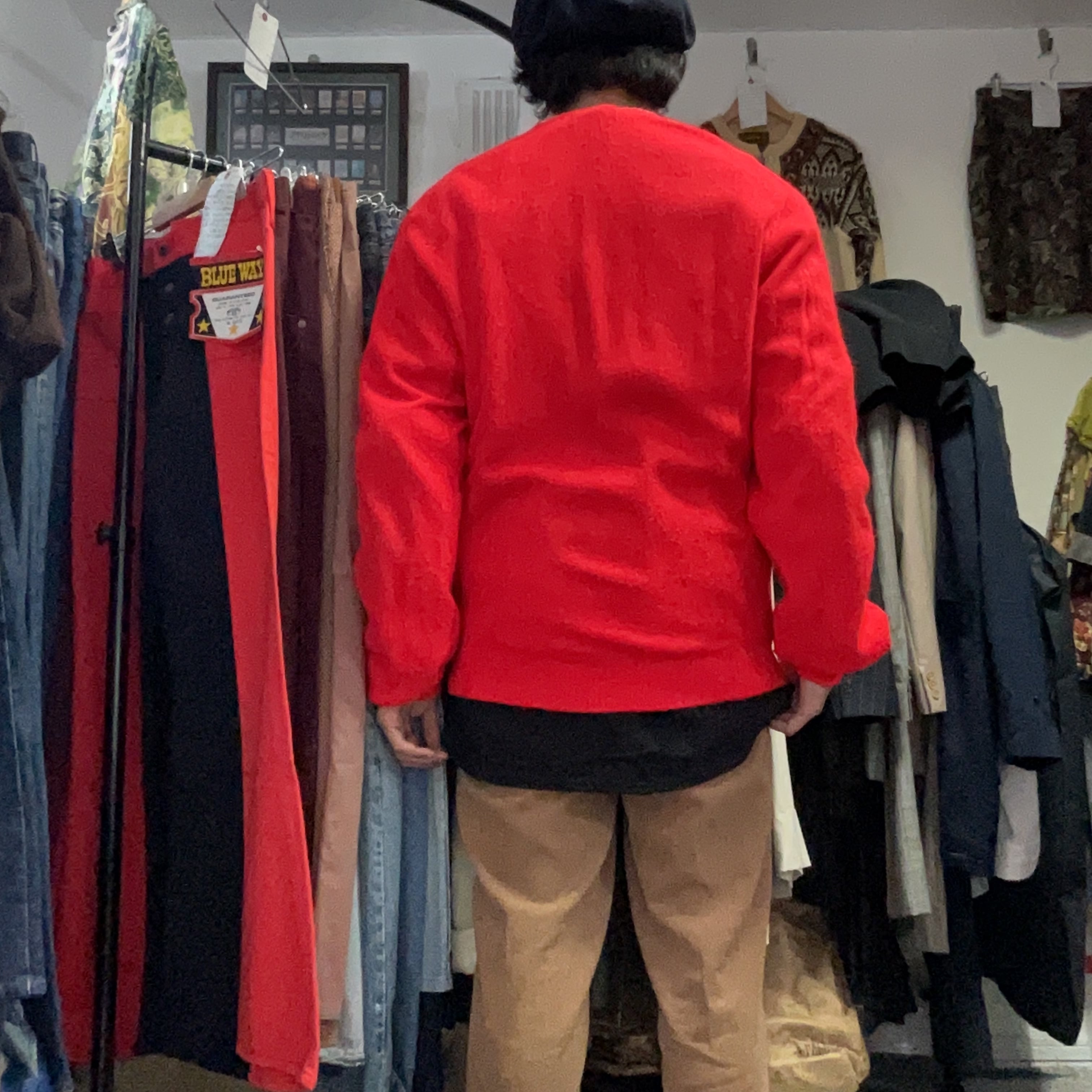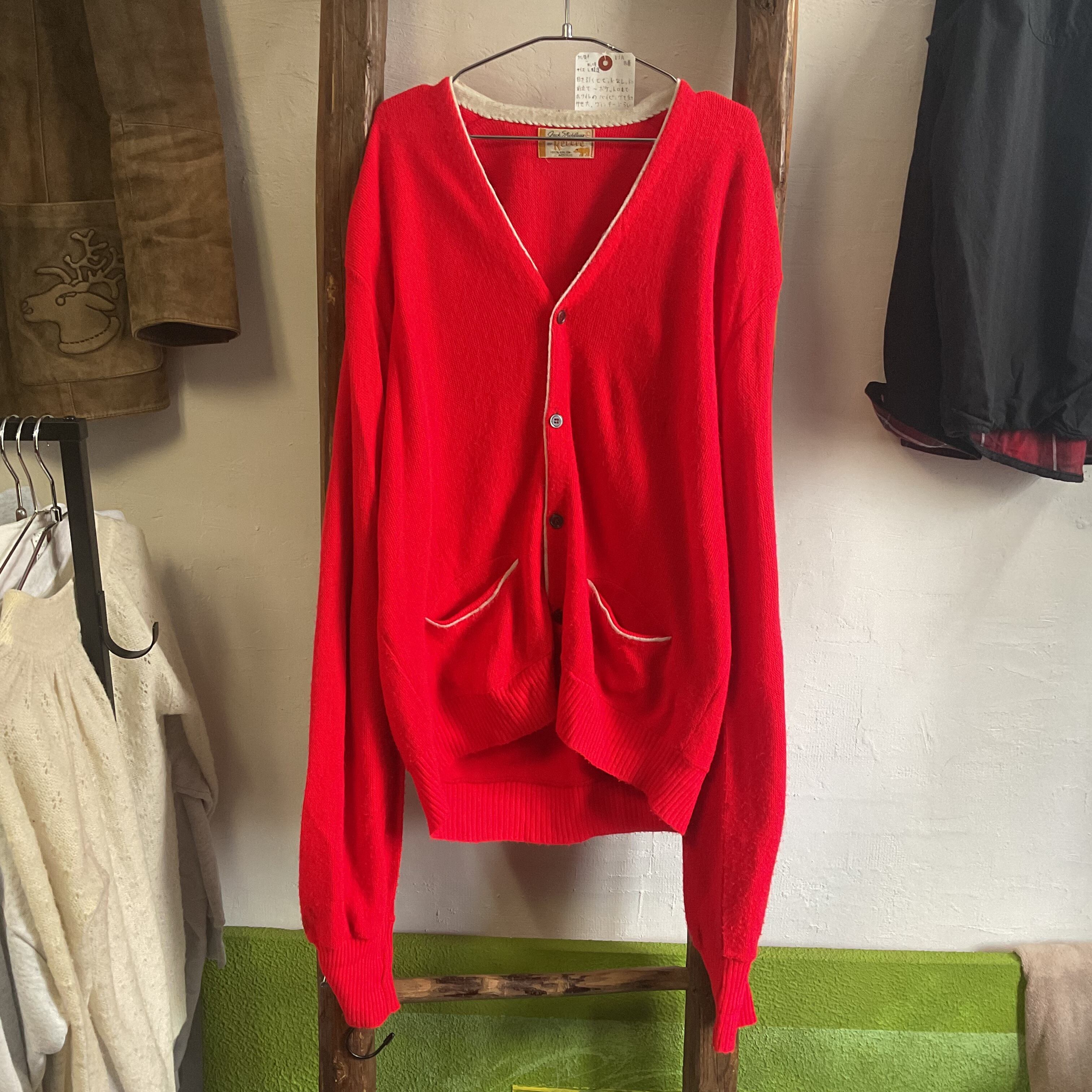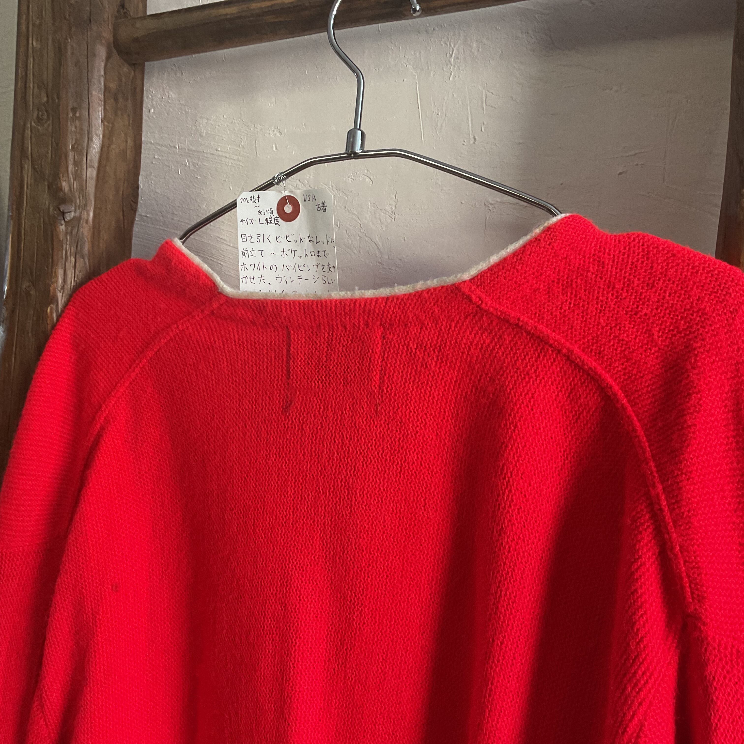状態としては、全体に多少の着用感と毛羽立ちが見られ、袖先や裾付近などにやや使用感。ただ、古着としての雰囲気を損なうほどではなく、ヴィンテージニットらしい表情として楽しんでいただけるコンディション。派手すぎないクラシックな赤で、年齢や性別を問わず取り入れやすい、雰囲気の良いヴィンテージカーディガン。