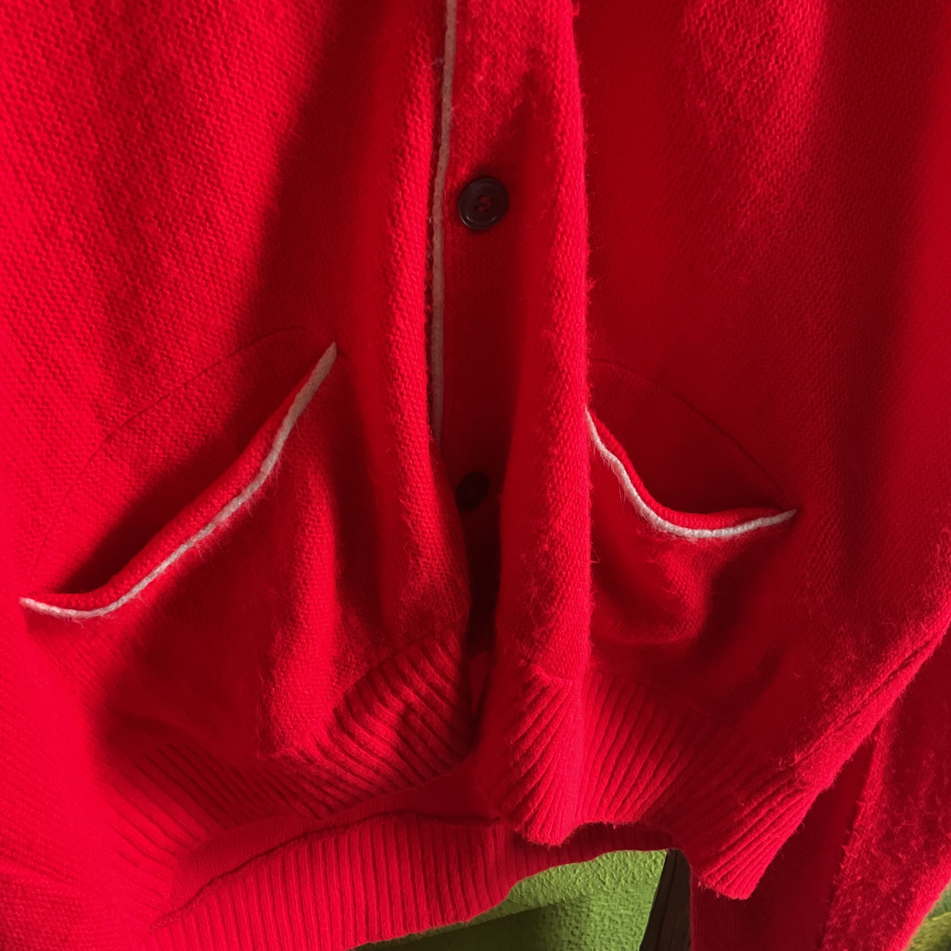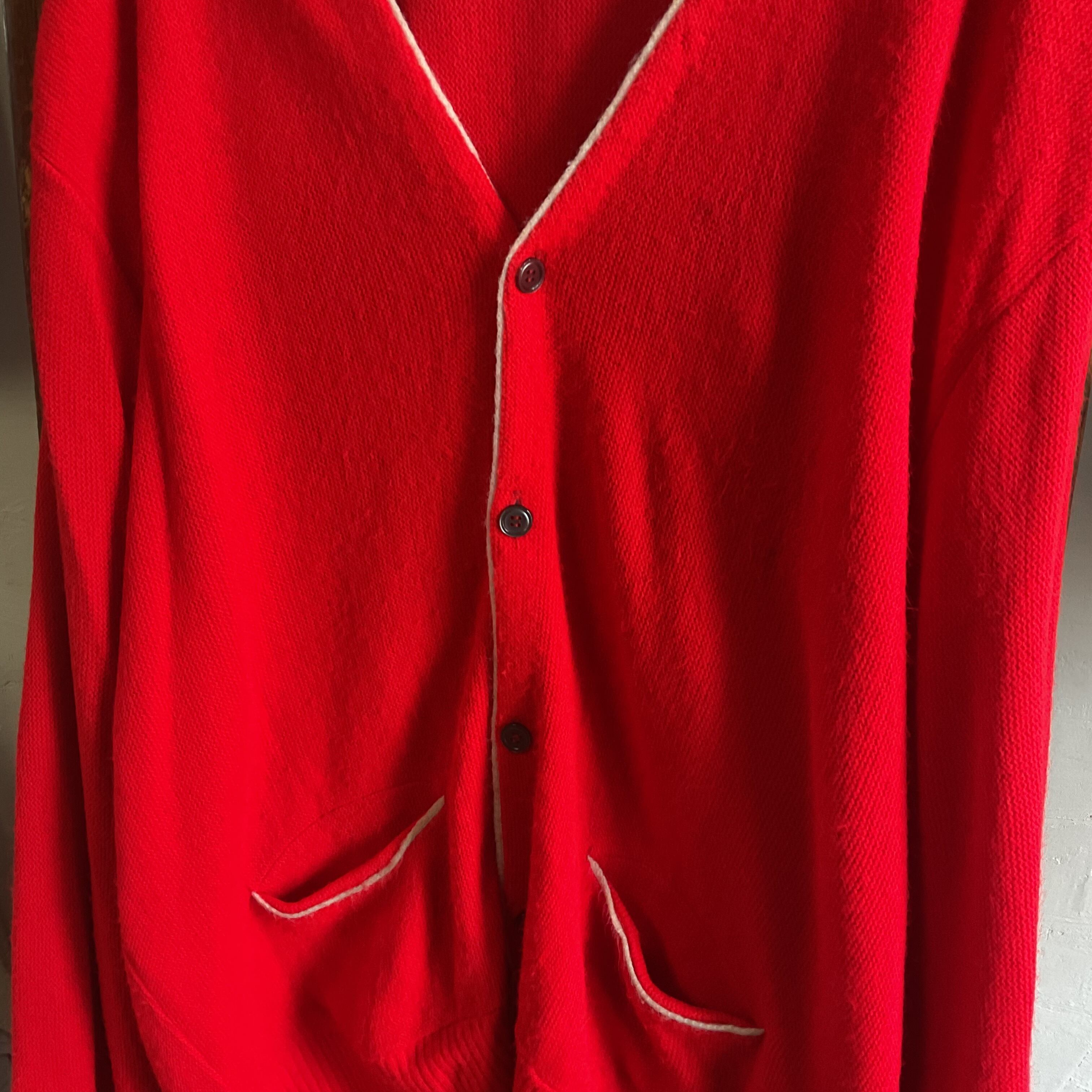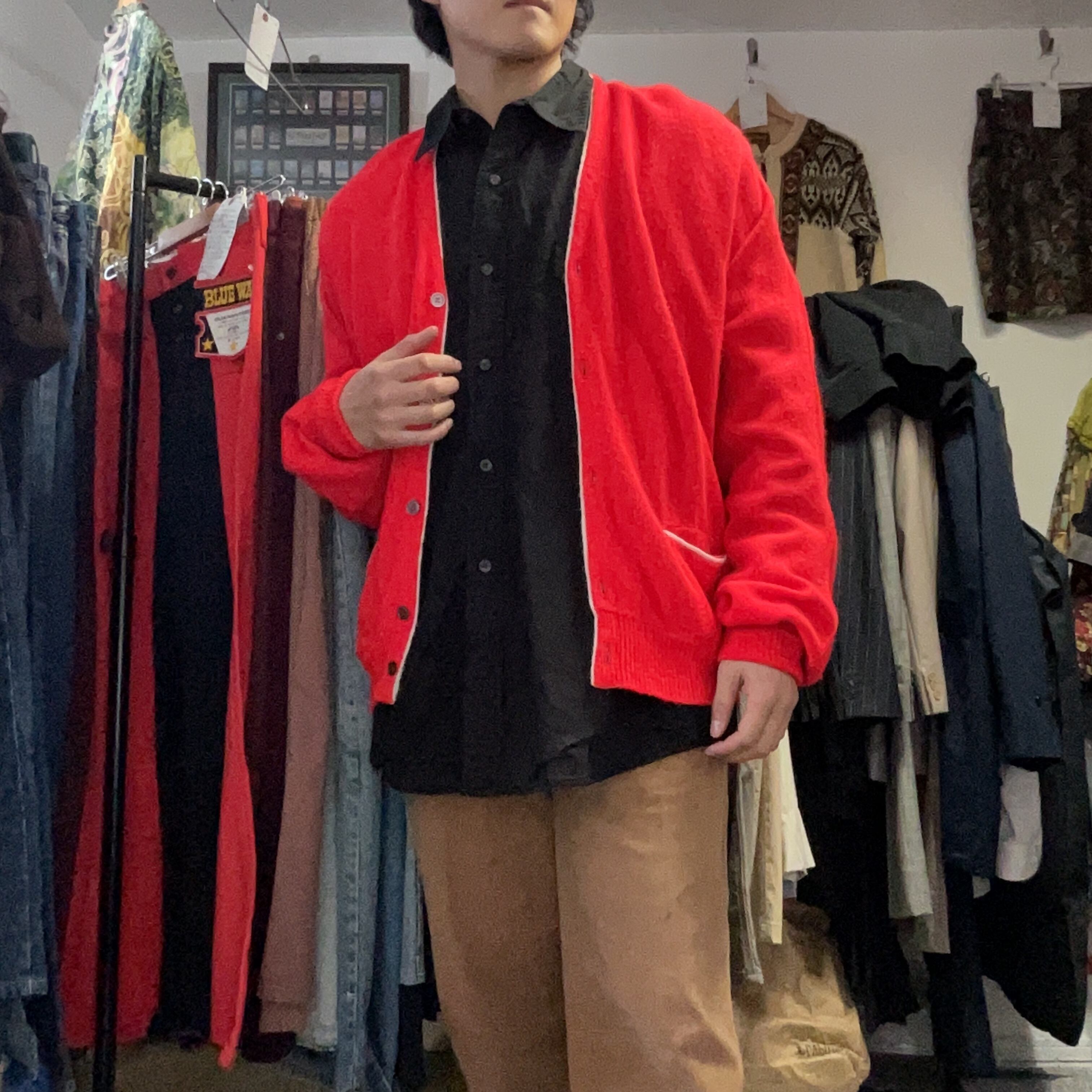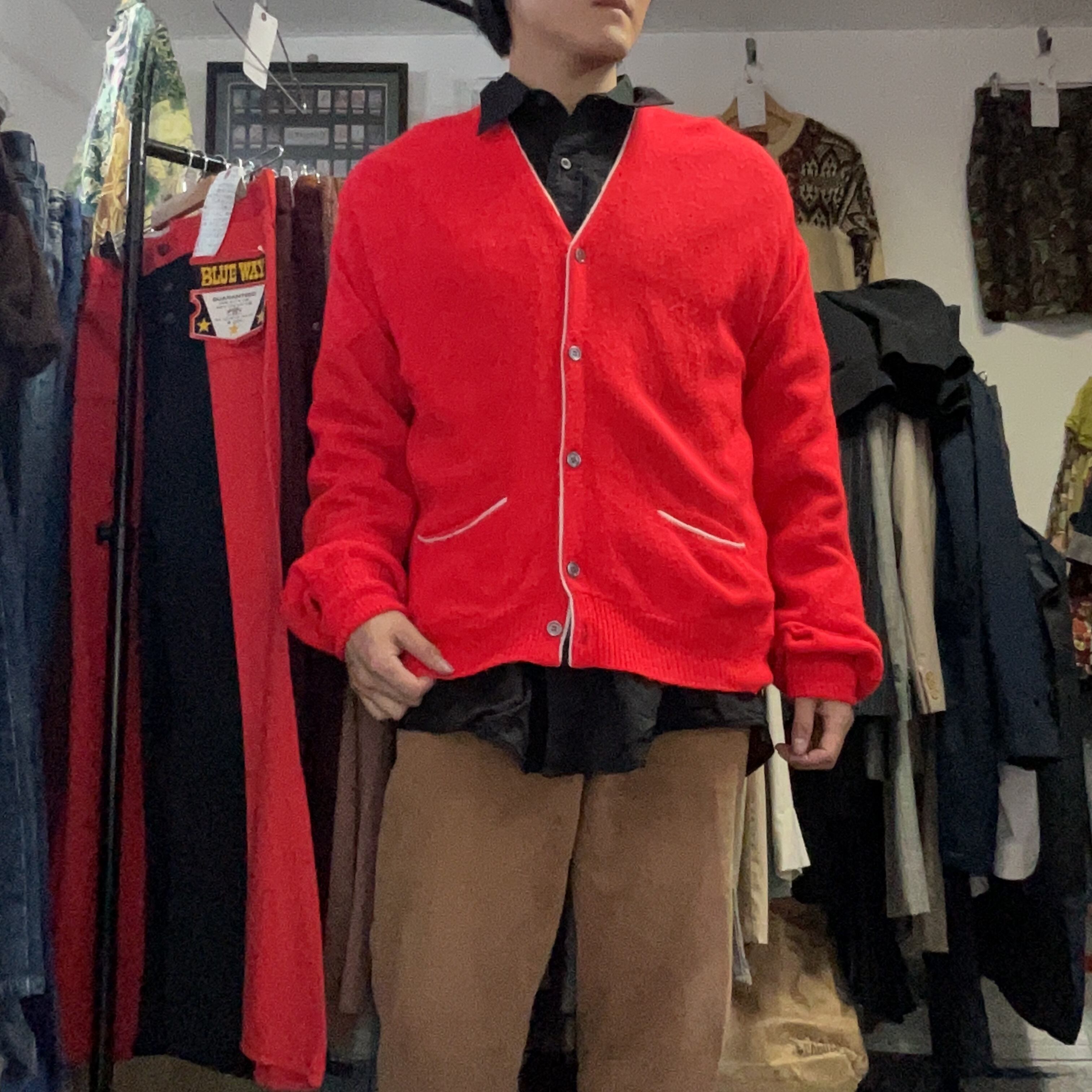 状態としては、全体に多少の着用感と毛羽立ちが見られ、袖先や裾付近などにやや使用感。ただ、古着としての雰囲気を損なうほどではなく、ヴィンテージニットらしい表情として楽しんでいただけるコンディション。派手すぎないクラシックな赤で、年齢や性別を問わず取り入れやすい、雰囲気の良いヴィンテージカーディガン。