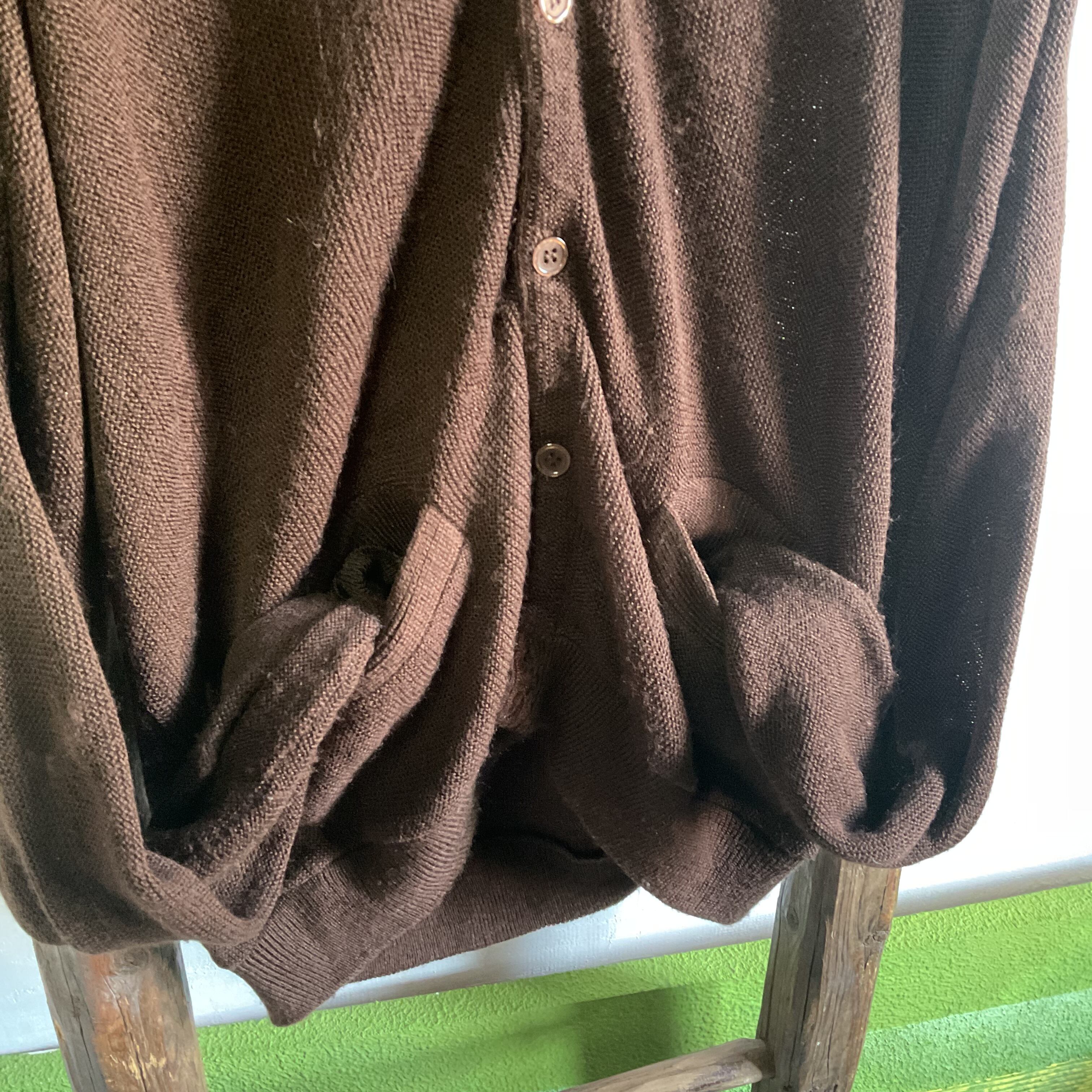 落ち着いたブラウンをベースに、ほんのりブラックが混ざったような深みのある色合いが魅力のヴィンテージニットカーディガン。一見すると無地でベーシックな印象ですが、近くで見ると糸色が単一ではなく、杢感のあるような奥行きある表情になっており、シンプルすぎず、さりげなく雰囲気のある1着。