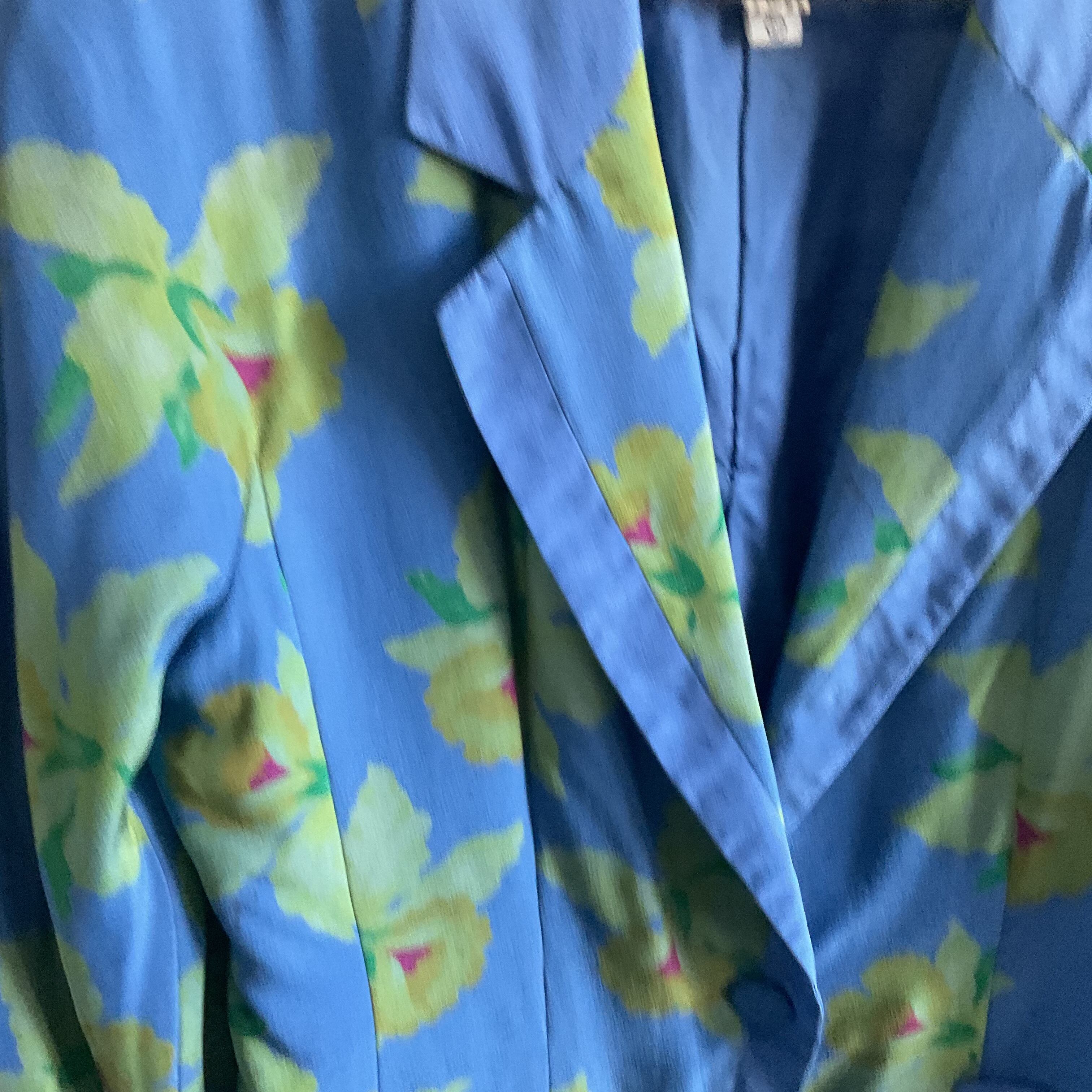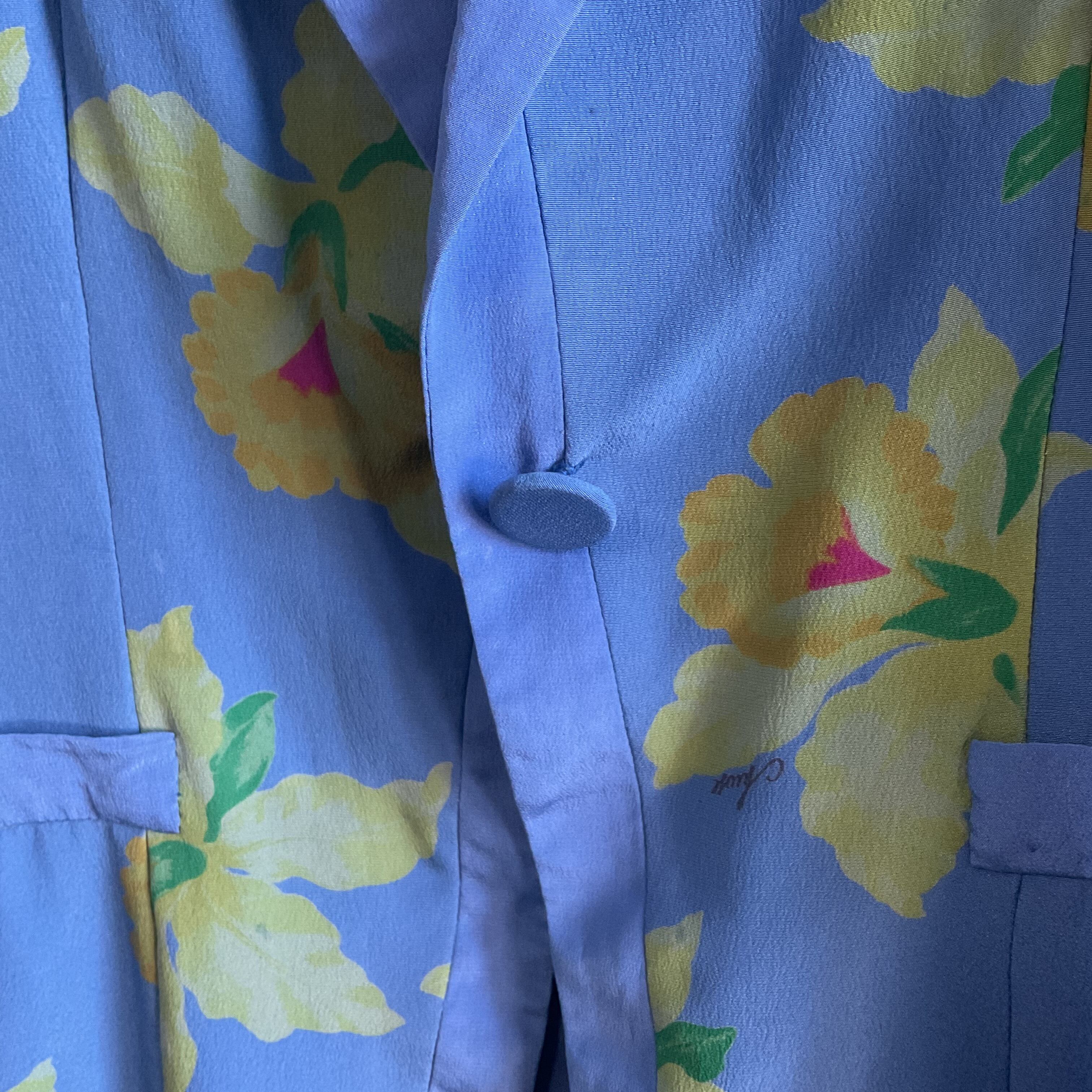 鮮やかでありながらやわらかさも感じるブルーのボディに、淡いグリーンとほんのりピンクを含んだ大ぶりのフラワープリントが映える、存在感たっぷりのテーラードジャケット。パッと目を引く華やかな配色ながら、プリントのタッチはどこか上品で、派手になりすぎず、しっかりと大人っぽさを残してくれるバランスの良い1着。イタリアらしい色彩感覚が感じられ、シンプルな装いにさらっと羽織るだけでコーディネートの主役に。