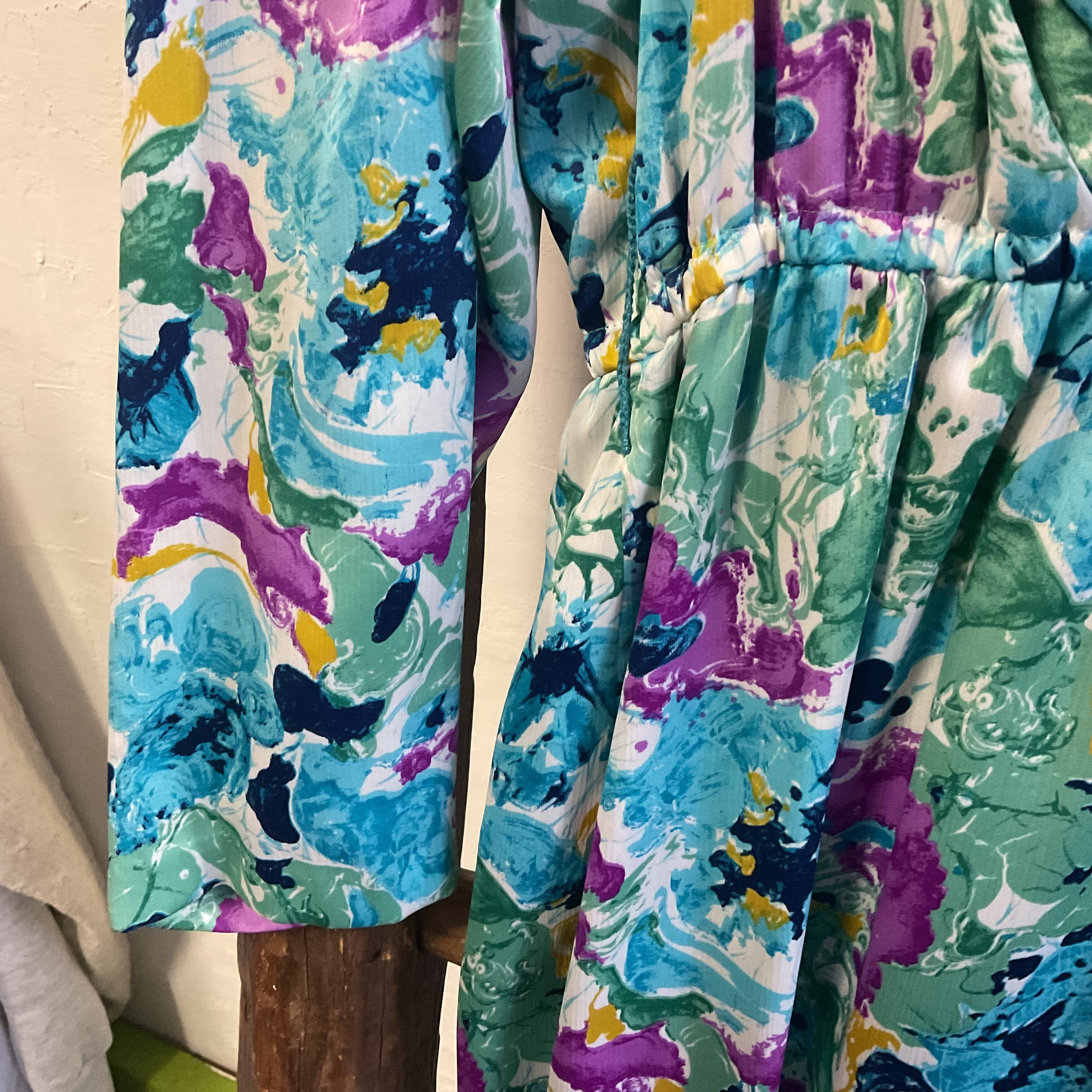 生地は軽やかで滑らかな質感で、動きに合わせて自然なドレープが生まれるのも魅力。春夏は1枚でさらりと、秋口にはジャケットやカーディガンと合わせて長くお楽しみいただけます。ヴィンテージならではの1点物の魅力をぜひお楽しみください。