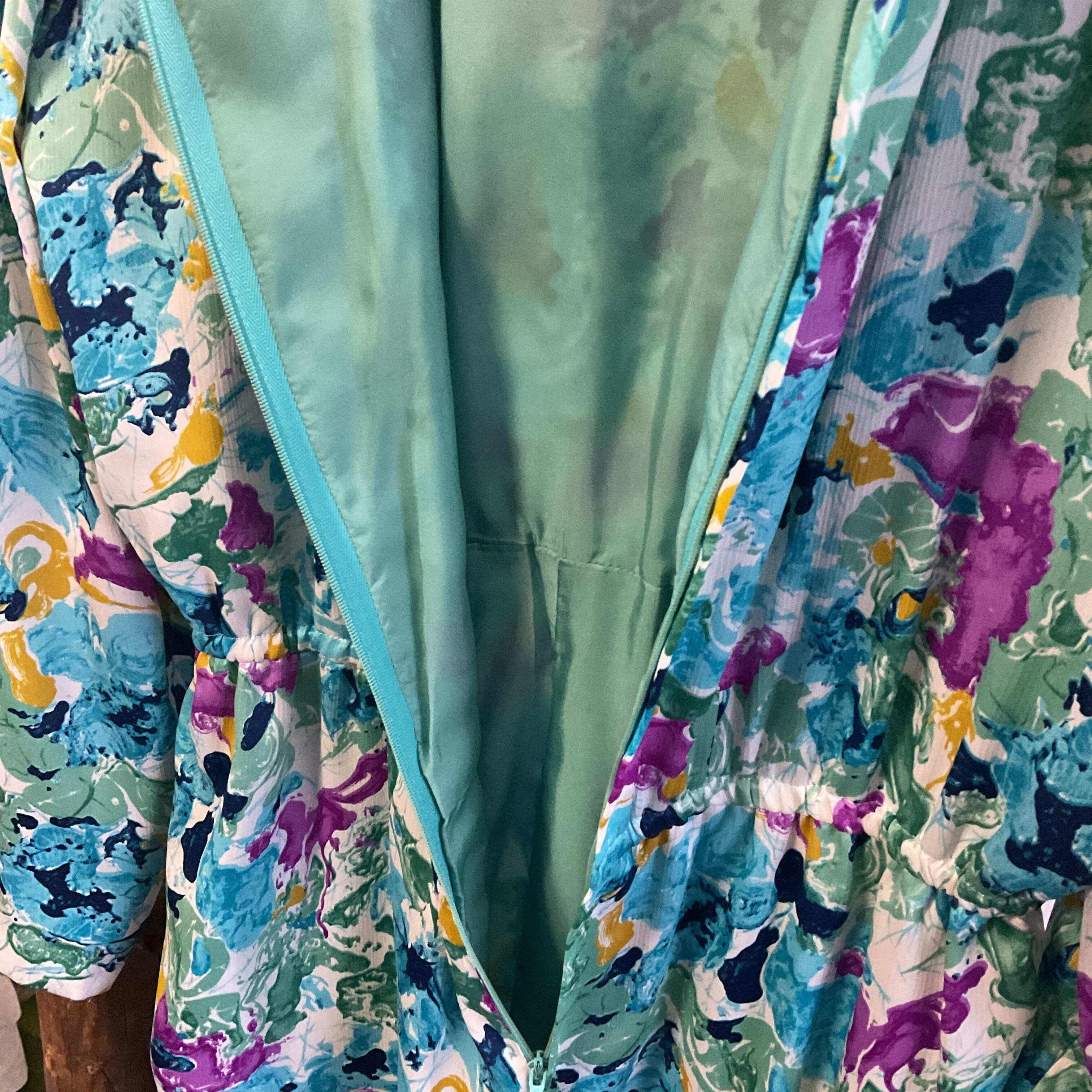 英国を代表するブランド「HARDY AMIES」による、ブティックラインのヴィンテージワンピース。こちらは1980年代頃の一着で、当時らしい華やかでアーティスティックな総柄が印象的なデザイン。ブルーやグリーンを基調に、パープルやイエローがアクセントとして散りばめられた抽象的なプリントは、まるで絵画のような美しさがあり、コーディネートの主役になる存在感。