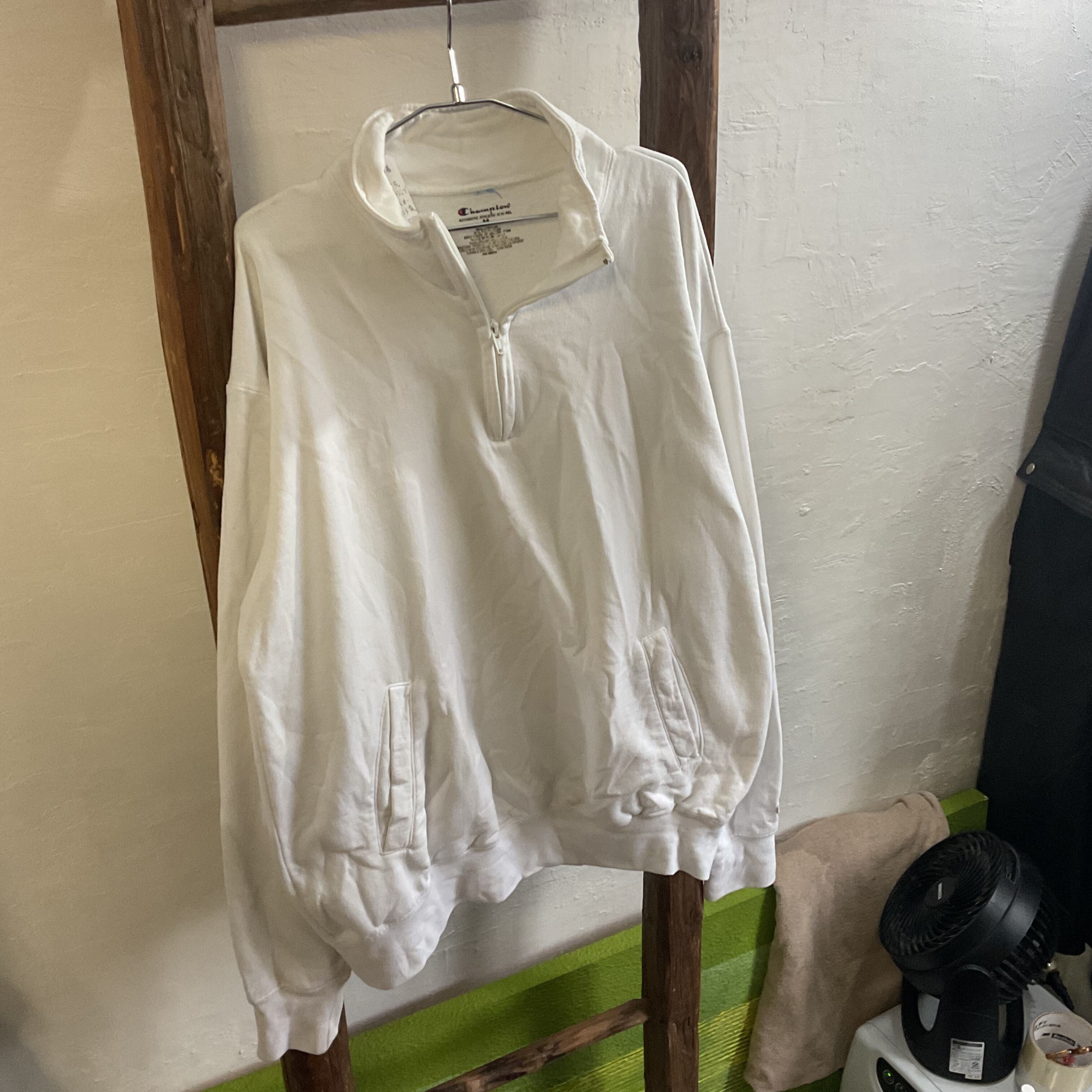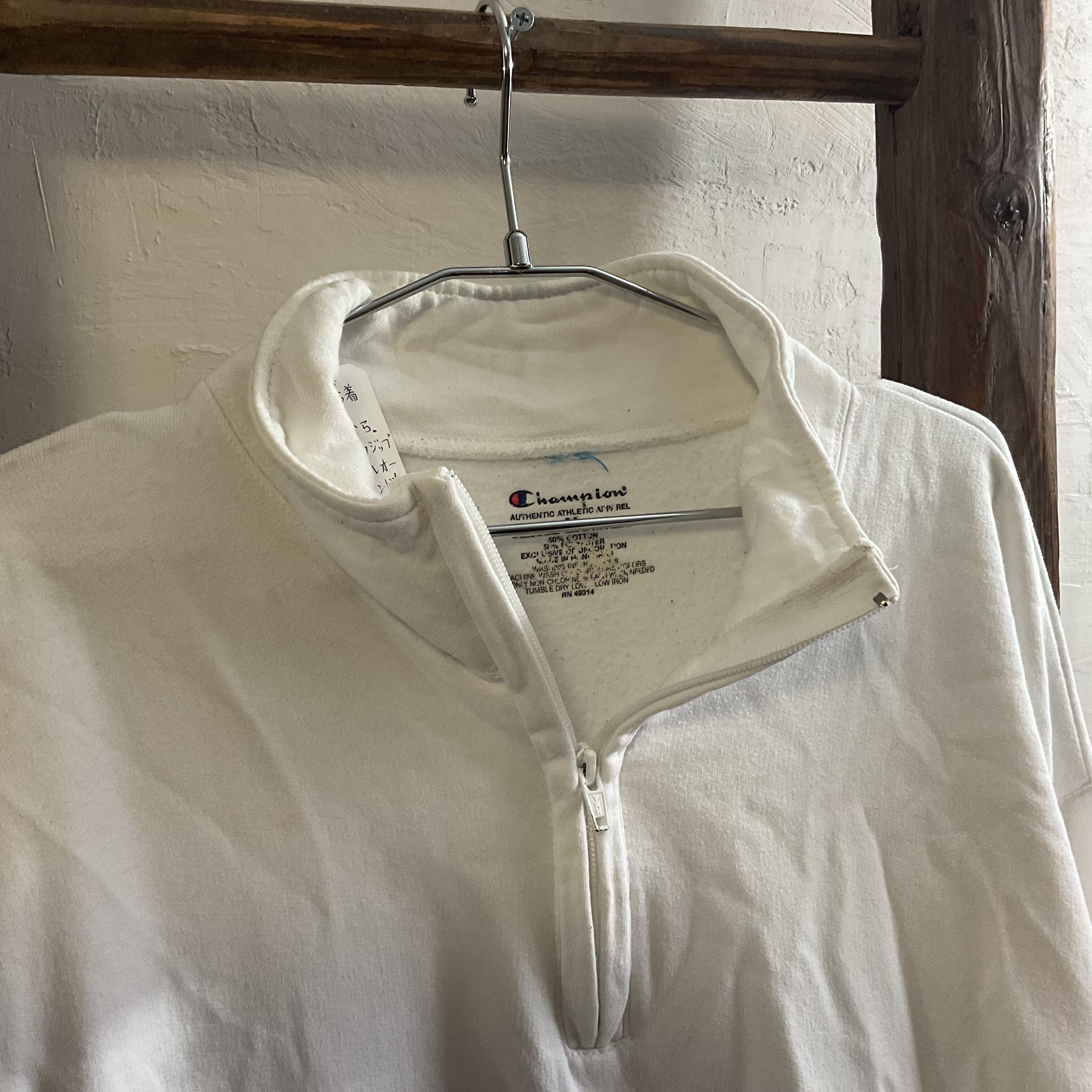 This is a Champion half-zip sweatshirt in a clean white colorway. It has a sporty character, yet the simple design also gives it a refined and easy-to-style appeal. The front half-zip detail allows for versatile styling: worn fully zipped, it creates a neat stand-collar look, while slightly unzipped it gives a more relaxed and effortless feel. Side pockets add practical functionality as well.