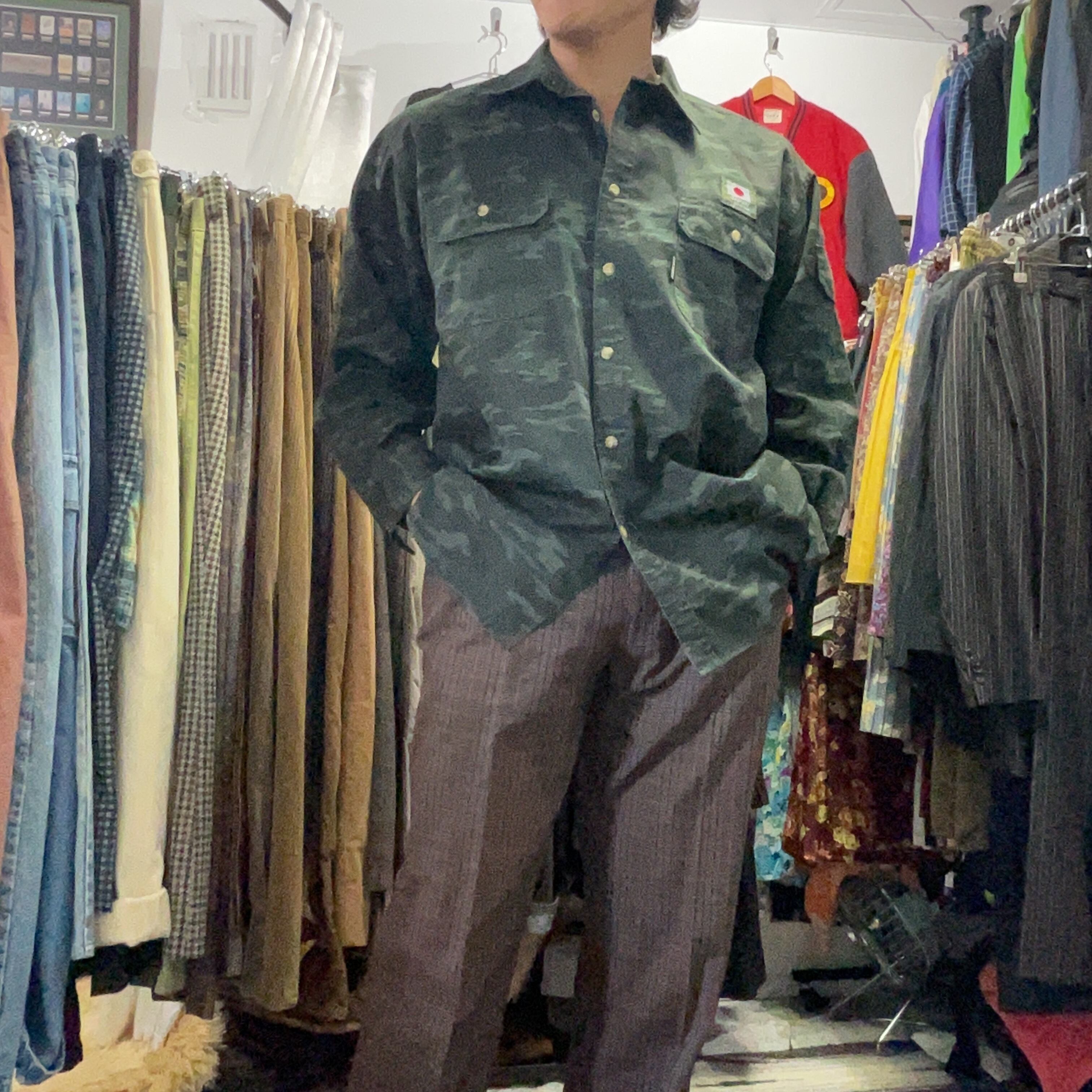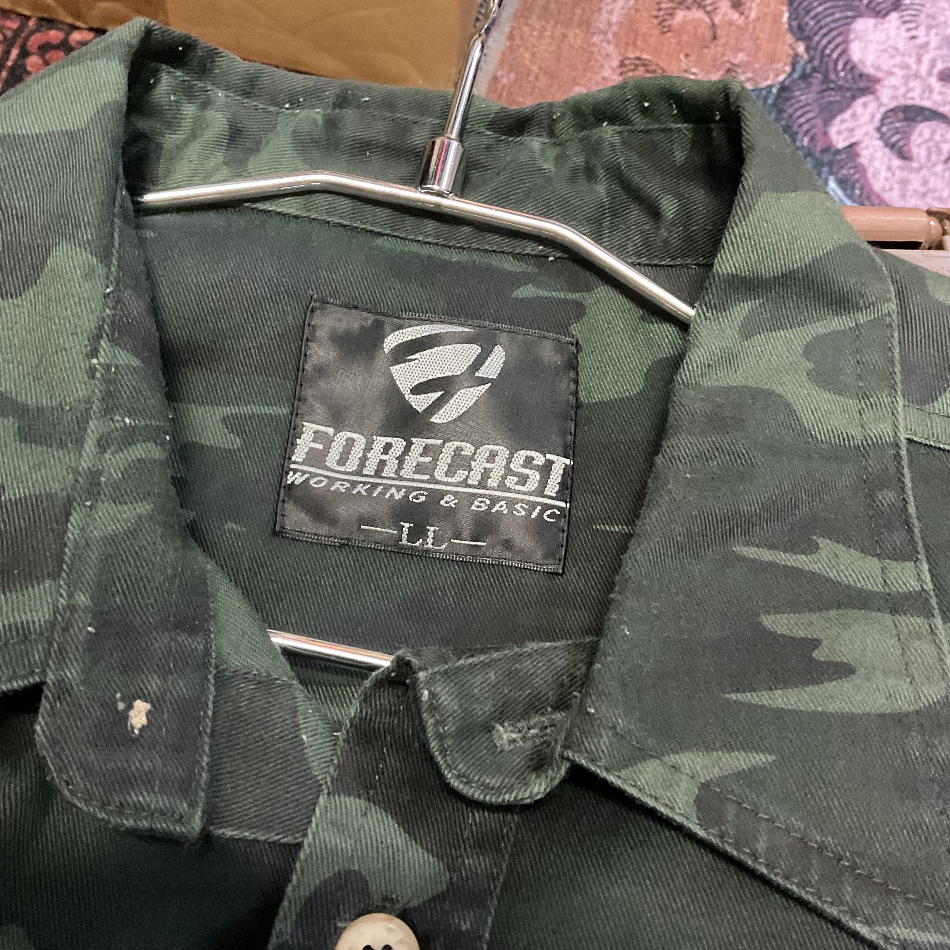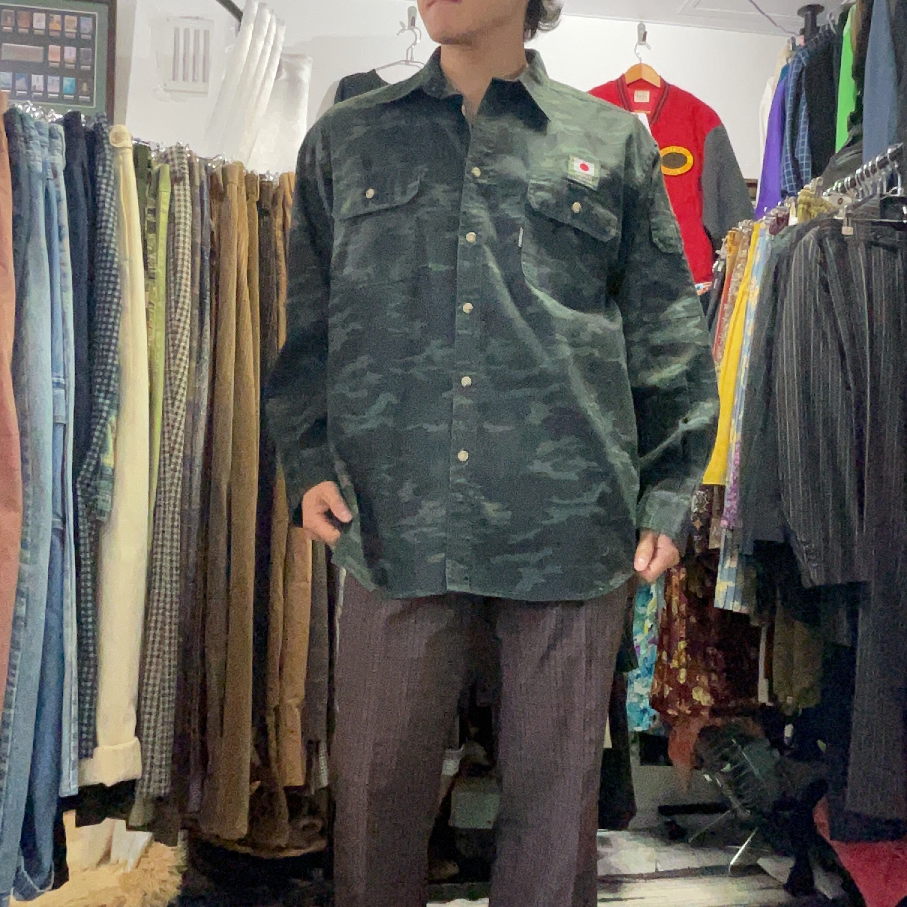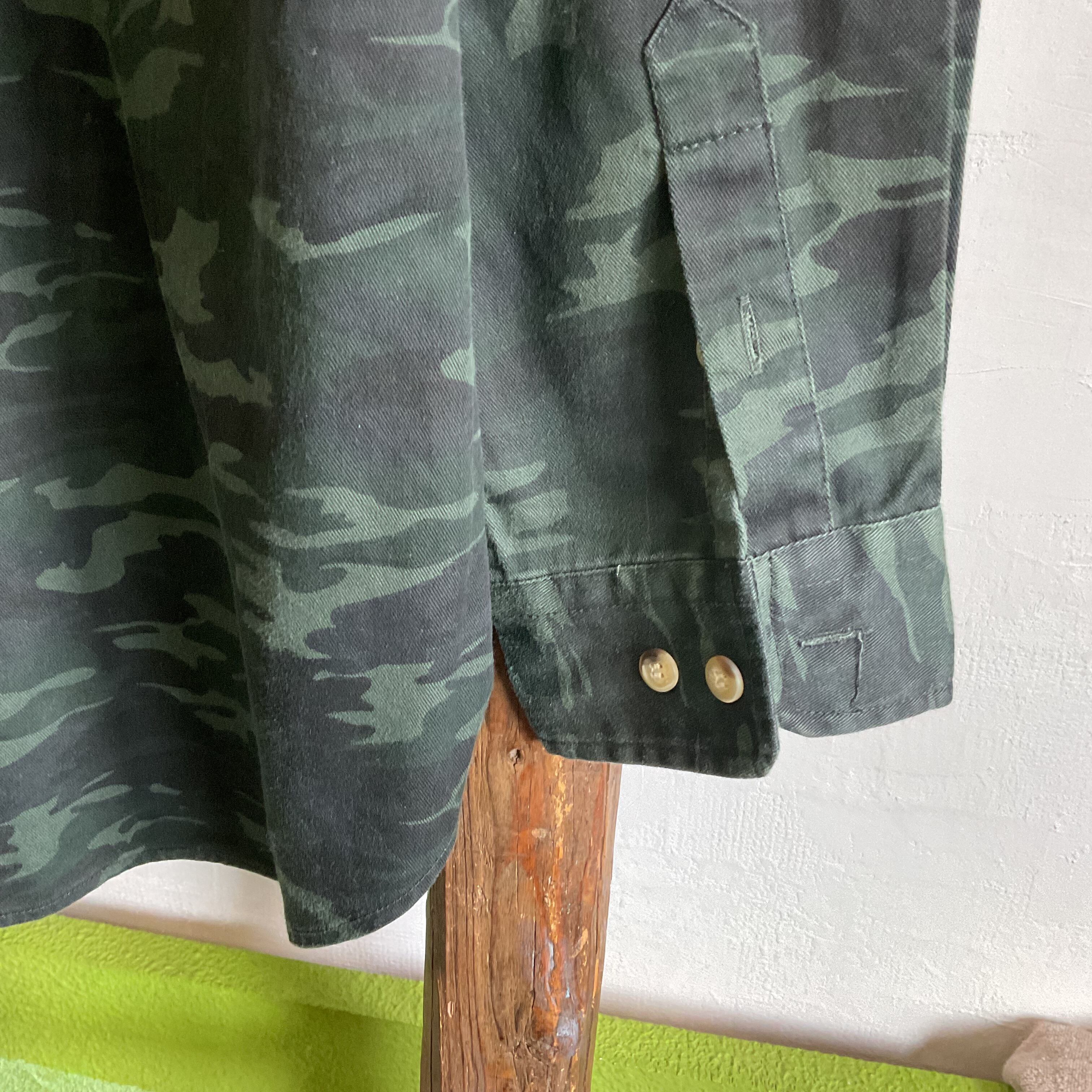 This FORECAST camouflage work shirt features a dark, subdued camo pattern that gives it a rugged military-inspired look while still remaining easy to style for everyday wear. Unlike brighter or more aggressive camouflage pieces, this one has a deeper green-and-black tone that feels more mature and versatile. The shirt is designed with two flap chest pockets, giving it a classic workwear and utility feel, while the patch-style detail reading “JAPAN Ground-Self Defense-Force” adds a distinctive visual accent.