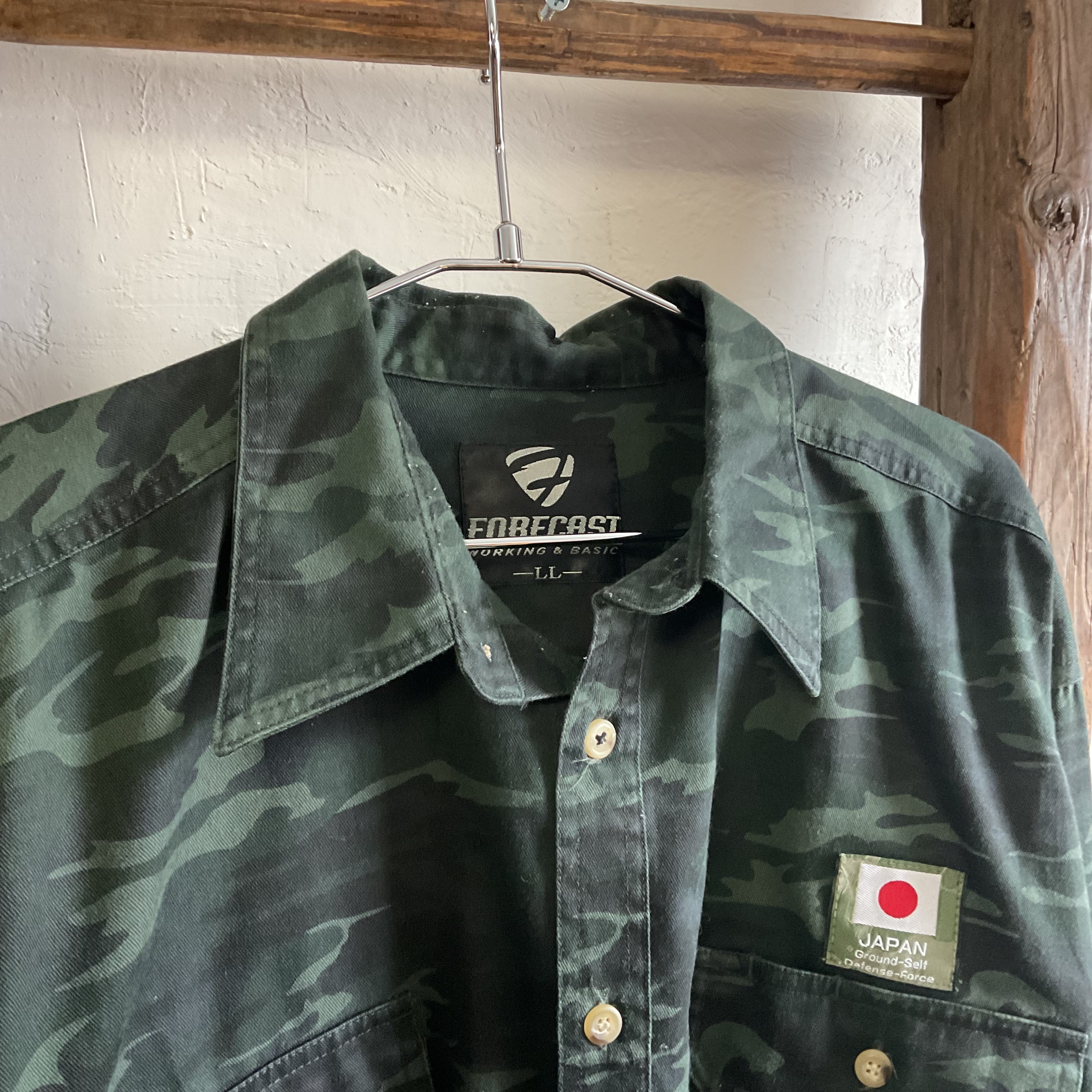落ち着いたダークトーンの迷彩柄が印象的な、FORECASTのワークシャツ。一般的なミリタリーシャツのような無骨さを持ちながらも、全体の配色が深みのあるグリーンとブラック寄りでまとまっているため、強すぎる印象にならず、普段のコーディネートにも取り入れやすい1着。フロントにはフラップ付きの胸ポケットが2つ配されており、ワークやミリタリー由来の実用的なデザインがしっかりと感じられます。さらに胸元には“JAPAN Ground-Self Defense-Force”のワッペン風ディテールが付いており、さりげないアクセントとして個性を添えております。
