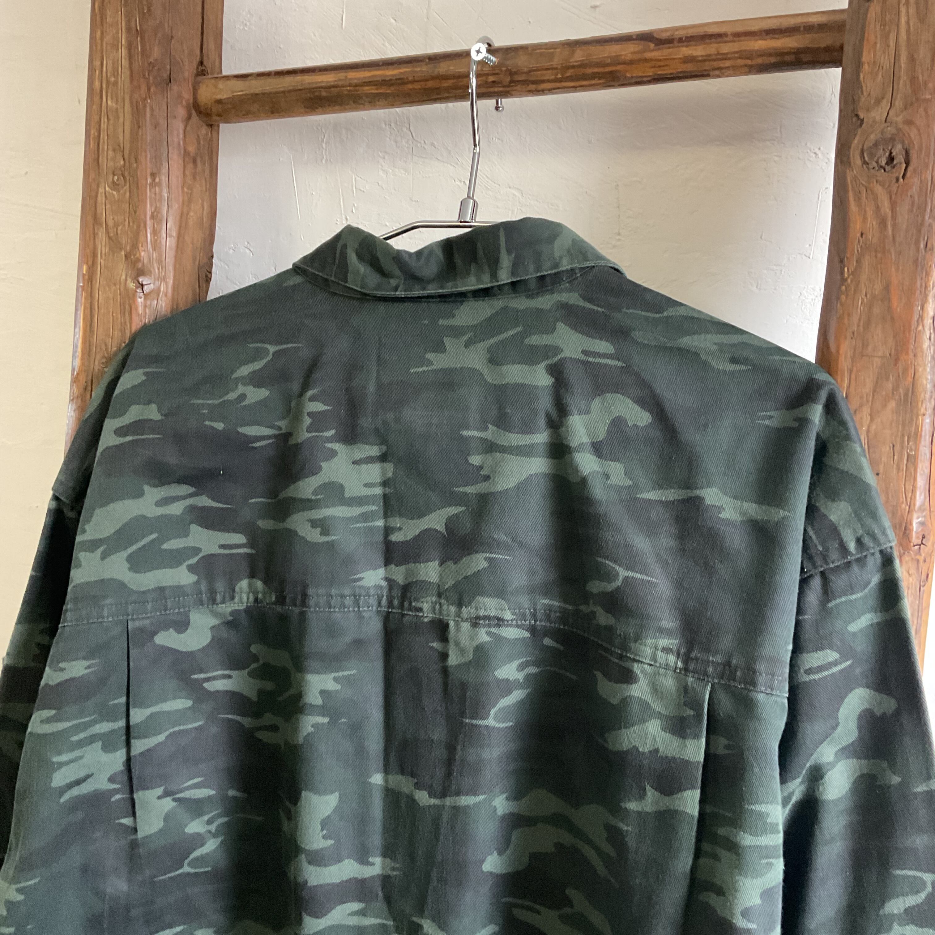 The fabric is a practical blend of 65% polyester and 35% cotton, offering a balance of durability, structure, and comfort. Compared to heavier all-cotton military shirts, this piece feels easier to wear and more suitable for layering. It keeps the sturdy atmosphere of workwear while remaining light enough to be used as an overshirt. With its tagged LL size and relaxed silhouette, it creates an effortless, loose fit that works well in casual styling.